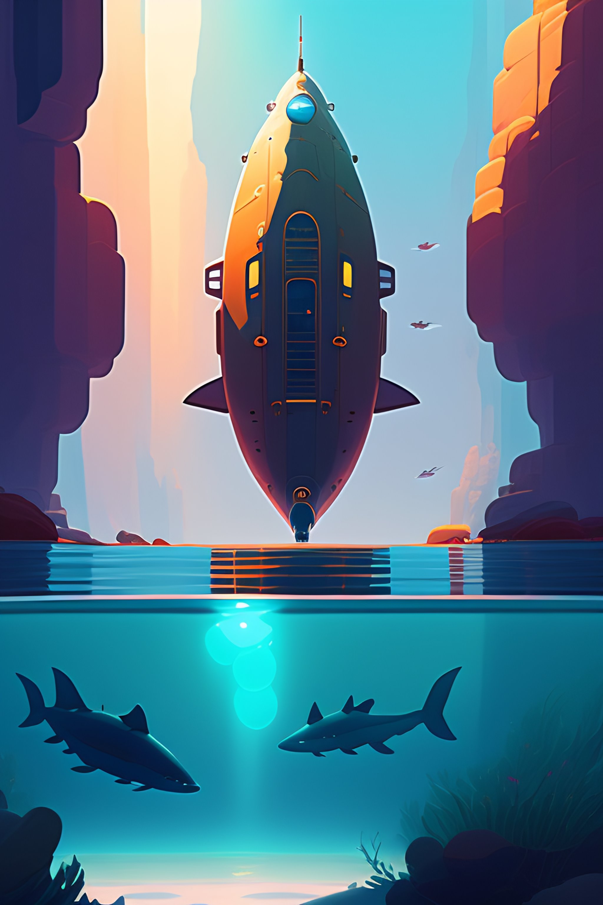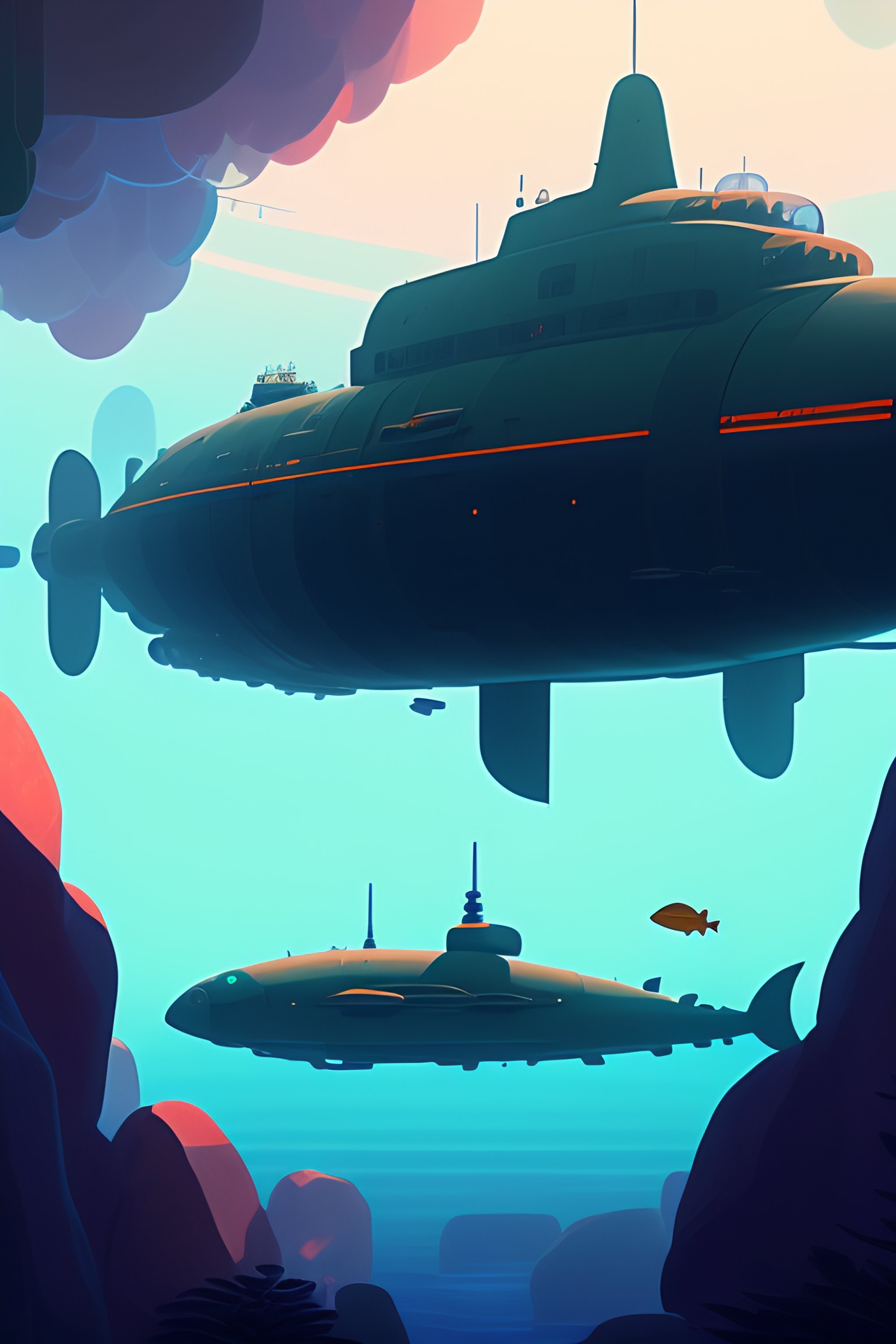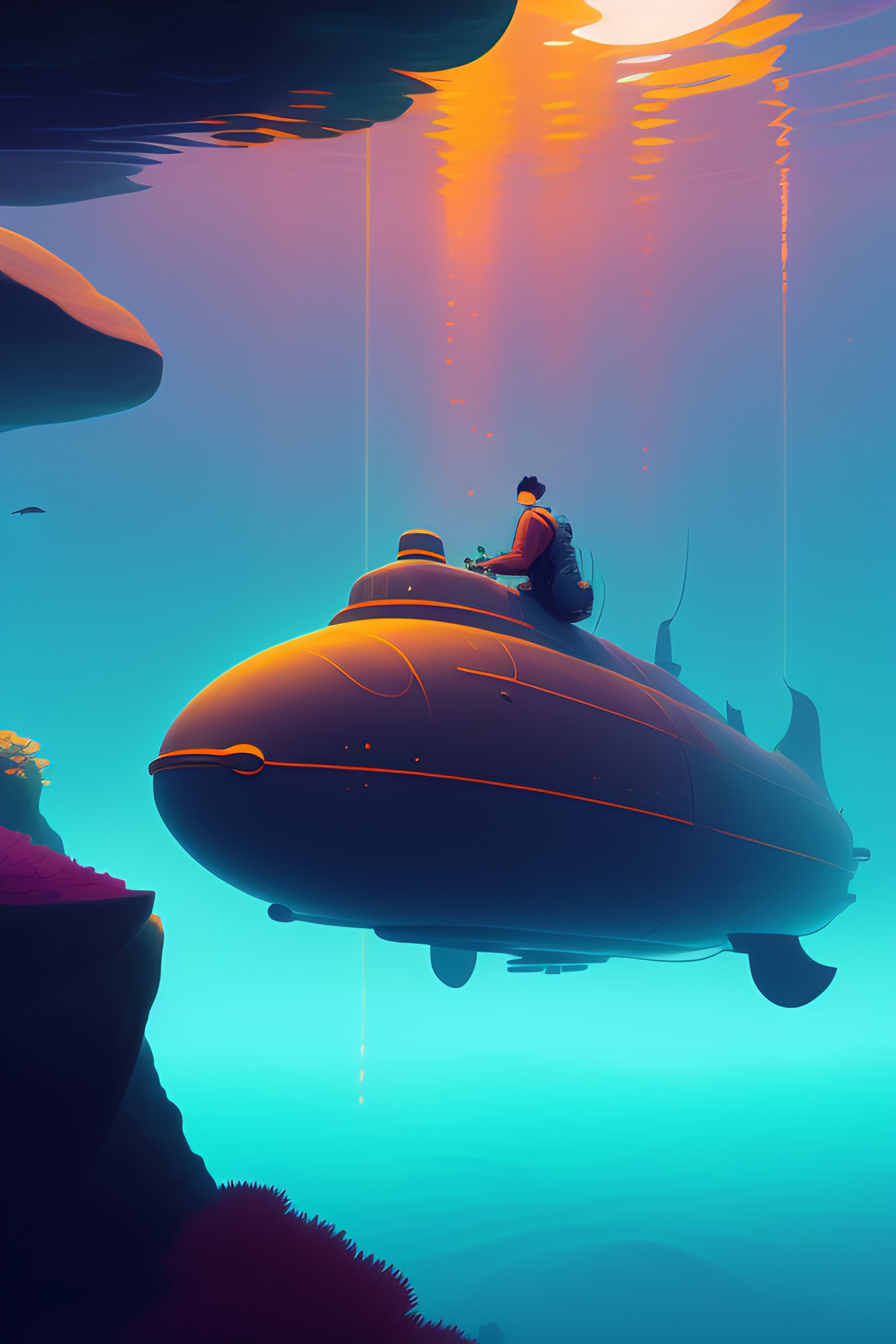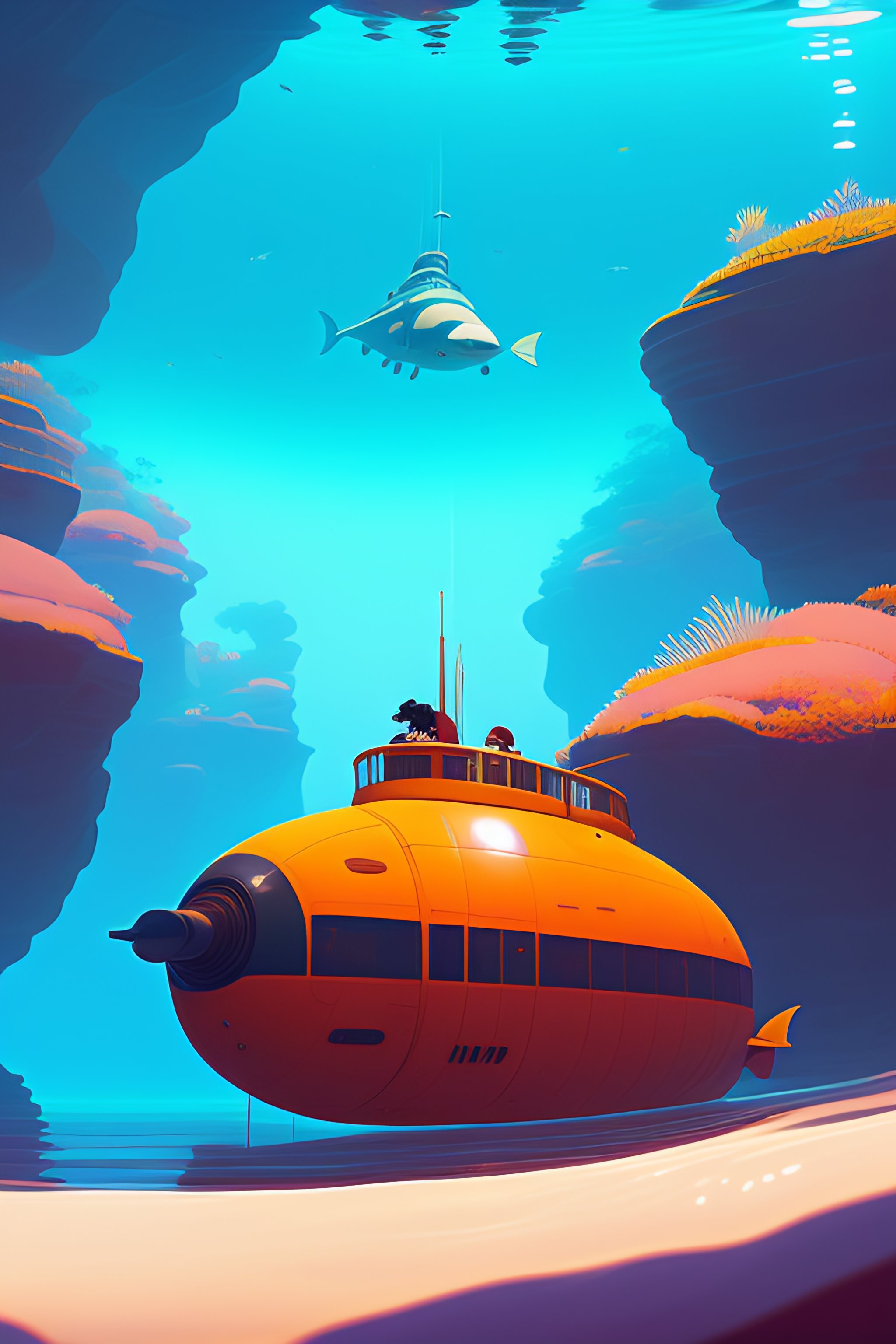 A submarine made of brown wood, deep water, seaweeds, lush underwater vegetation cory loftis, james gilleard, atey ghailan, makoto shinkai, goro fujita, studio ghibli, rim light, exquisite lighting, clear focus, very coherent, plain background, soft painting