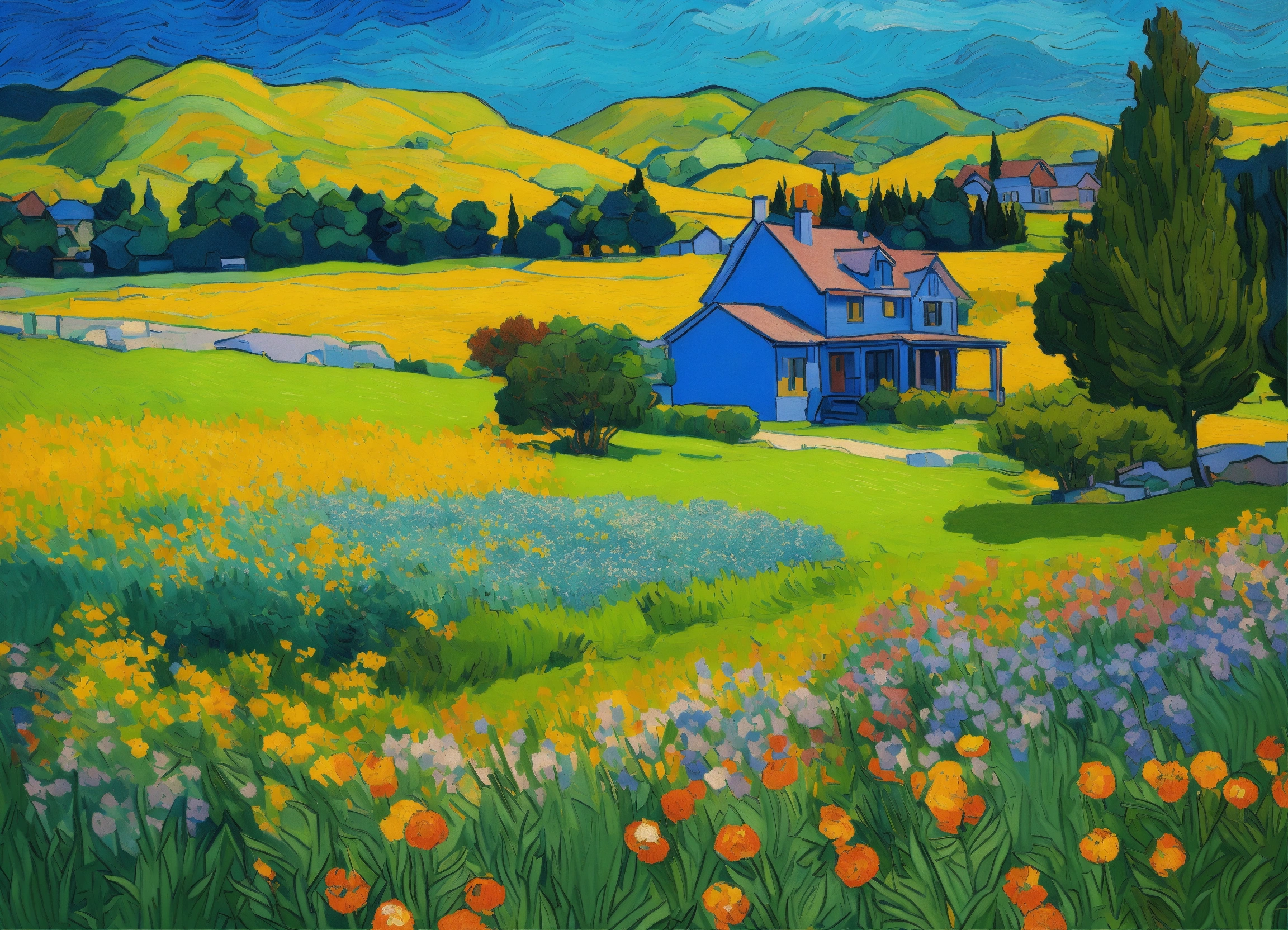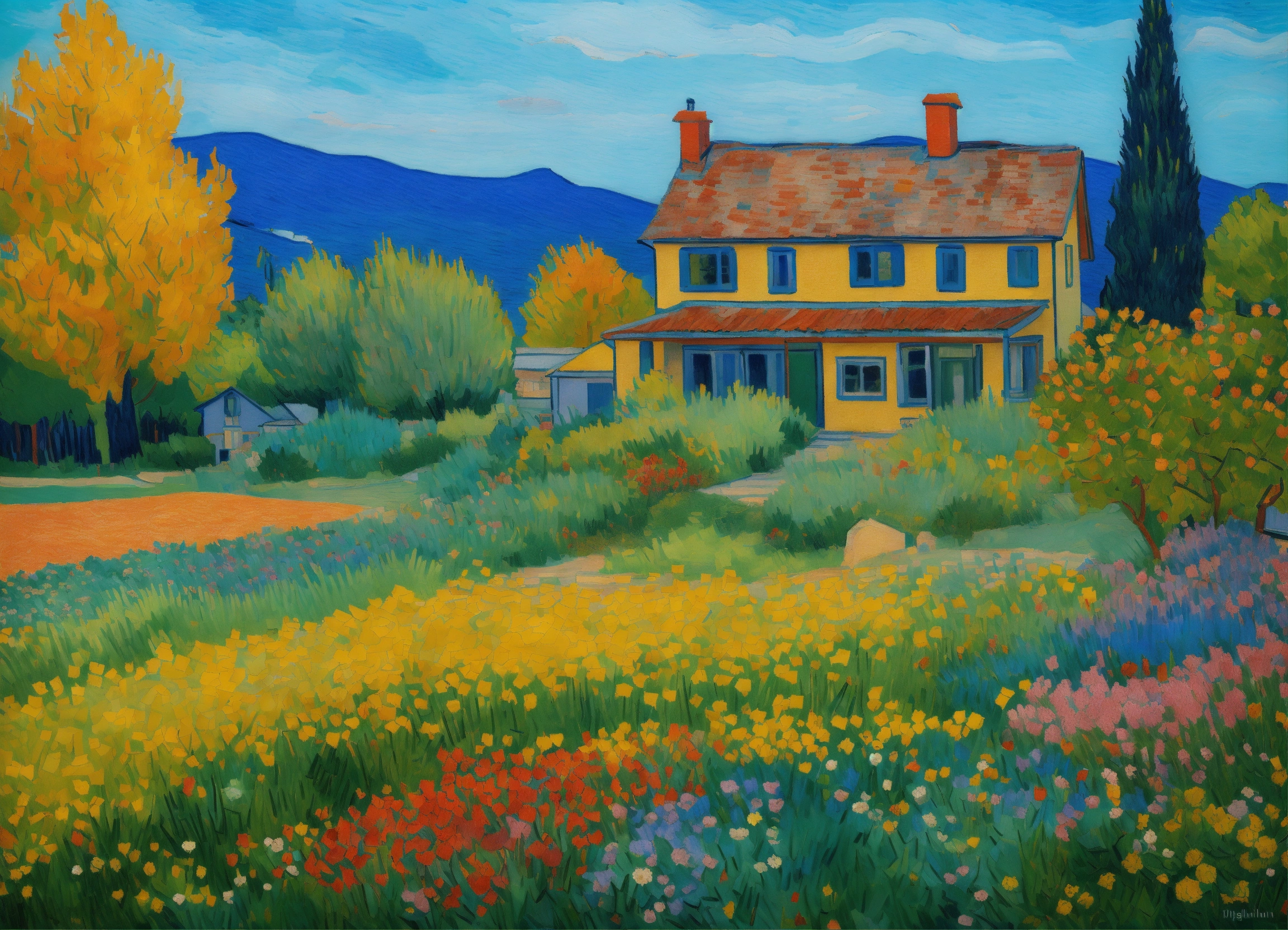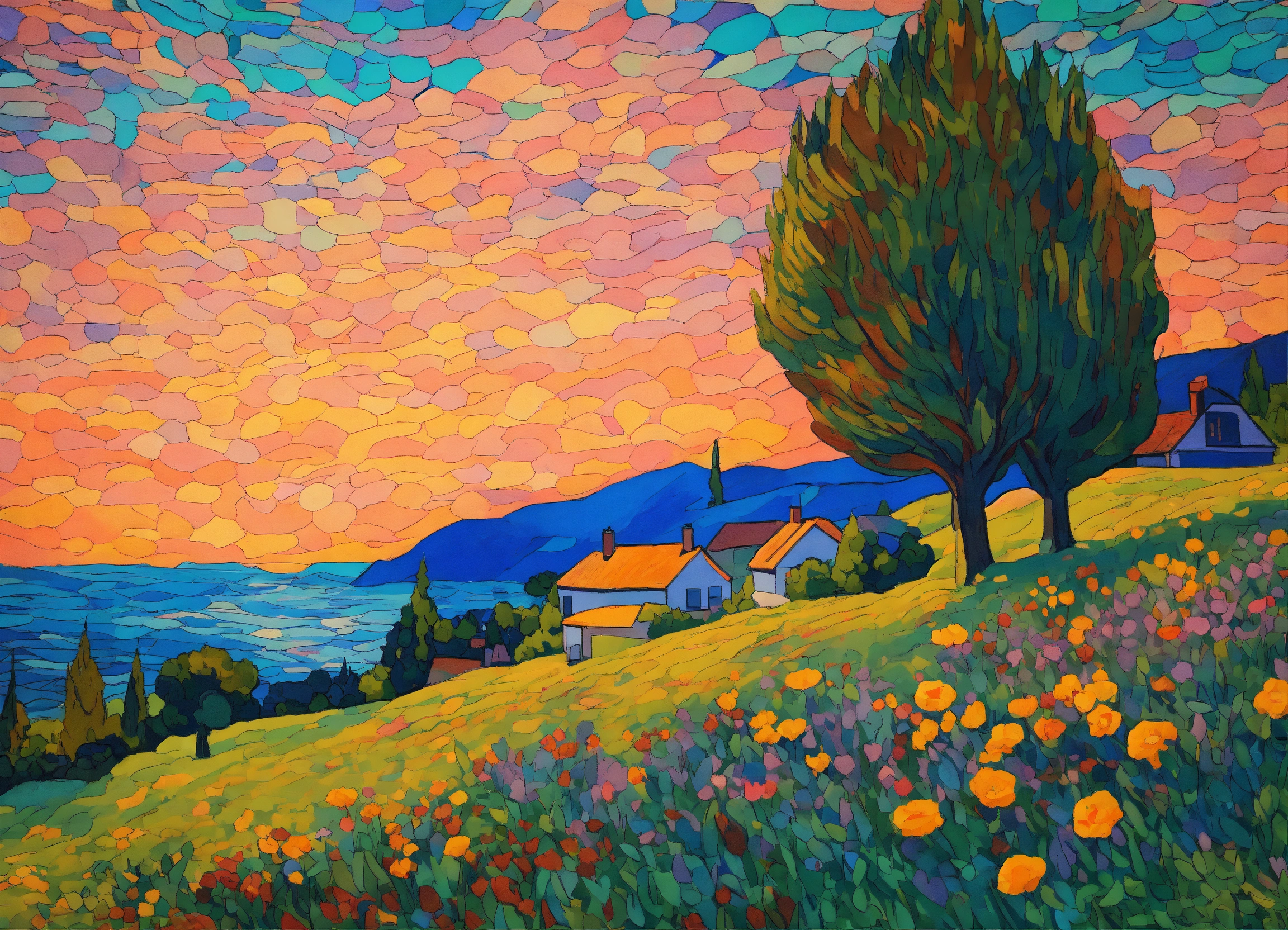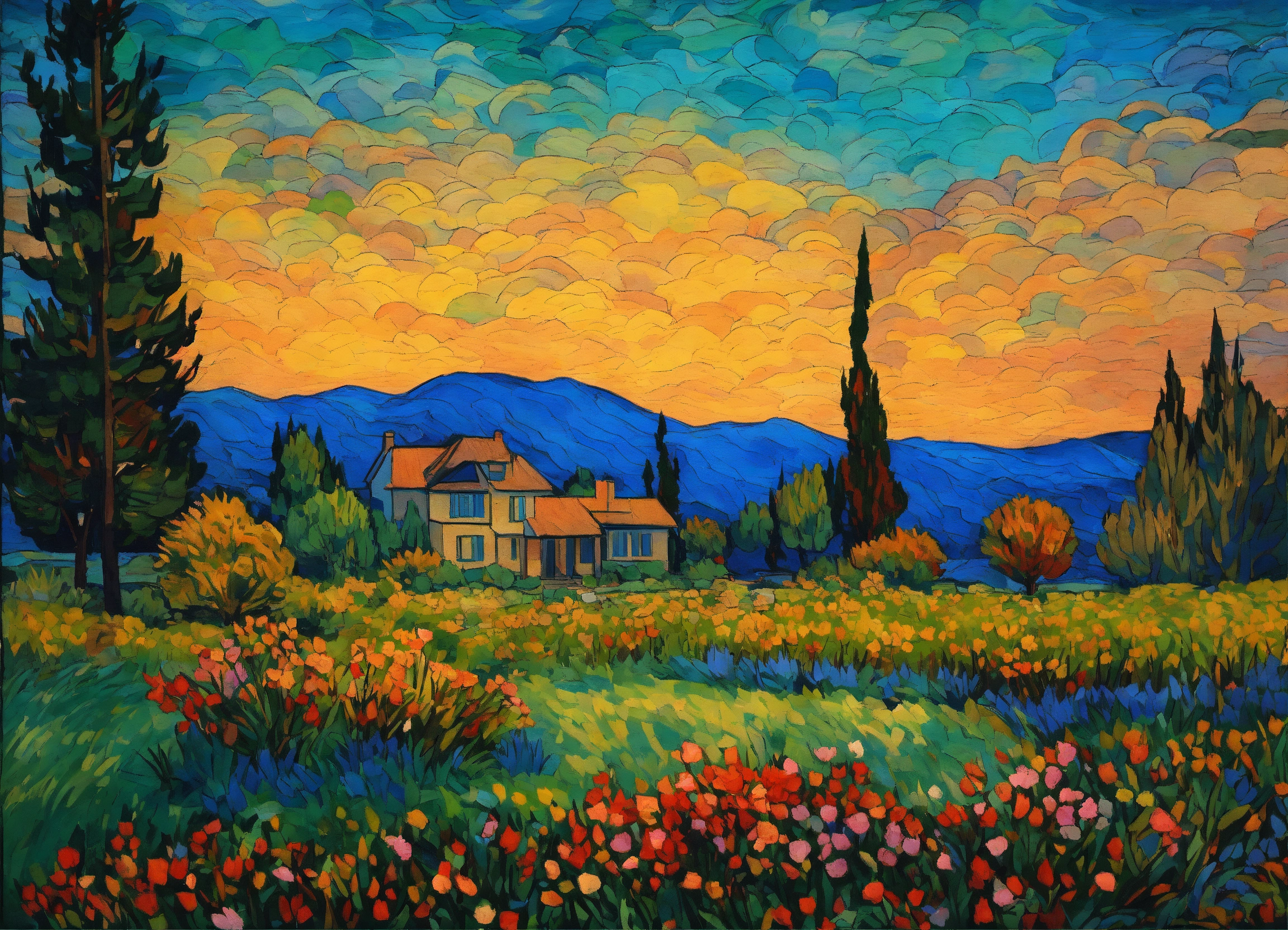 Drawing of lawn full of flowers of all colors, van gogh style, modigliani, seurat, old style american house, trees, spruces, gaspé ocean, some far little mountains, cinematic lighting