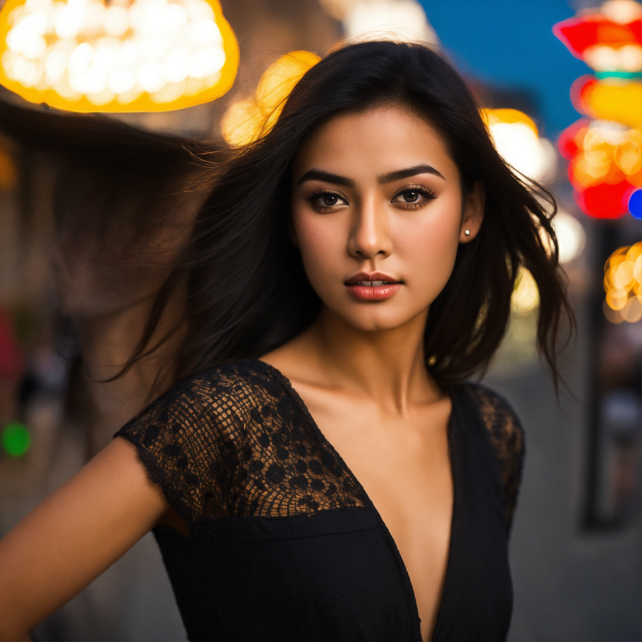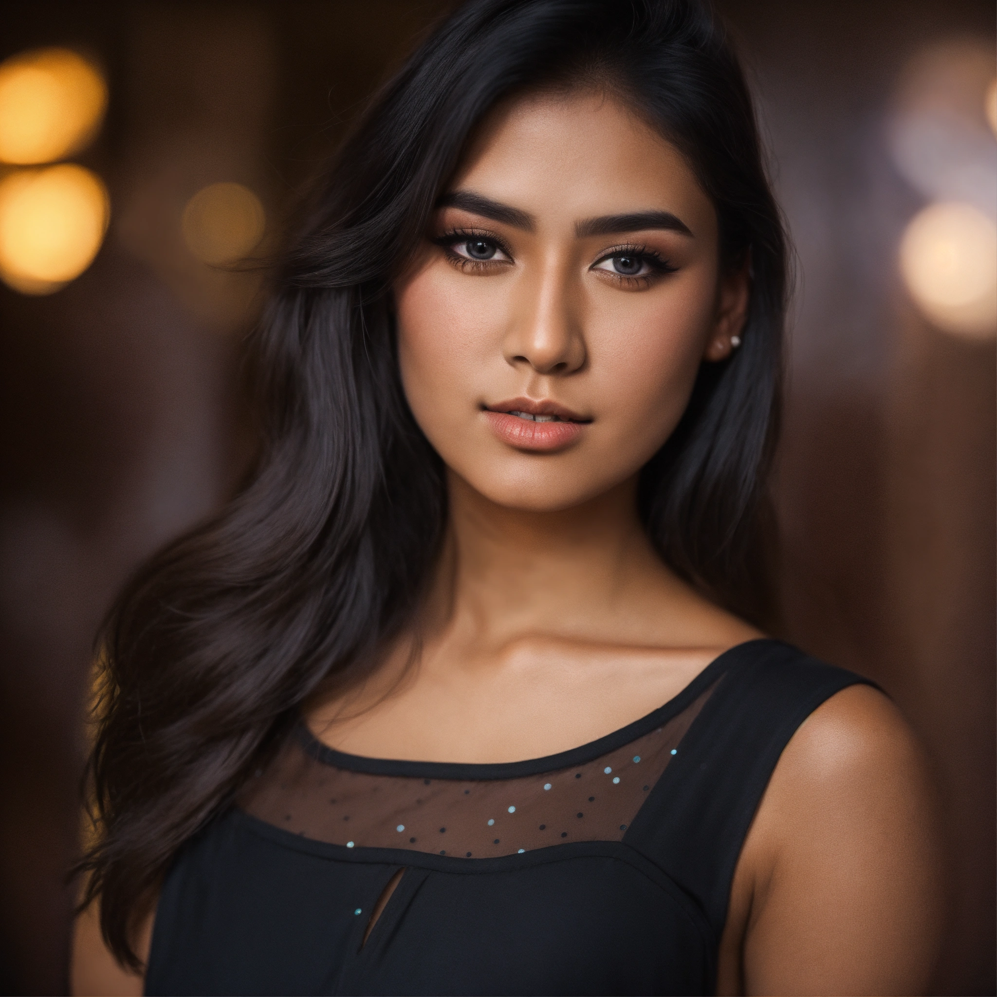 Create a photograph of a beautiful female model of mixed and asian pakistani race in a tiny black dress no dot on forehead, zoomed out, like a cruise photo