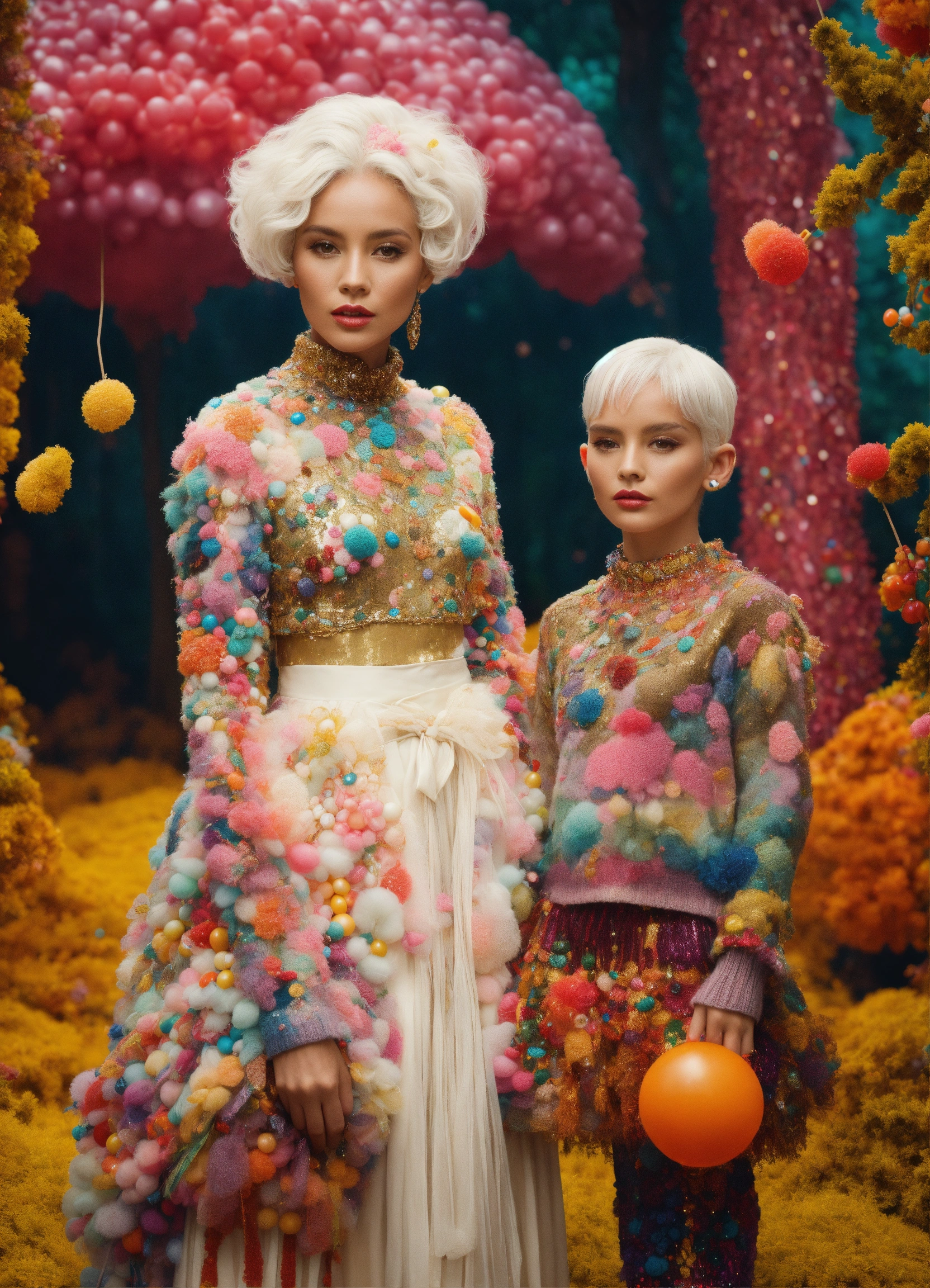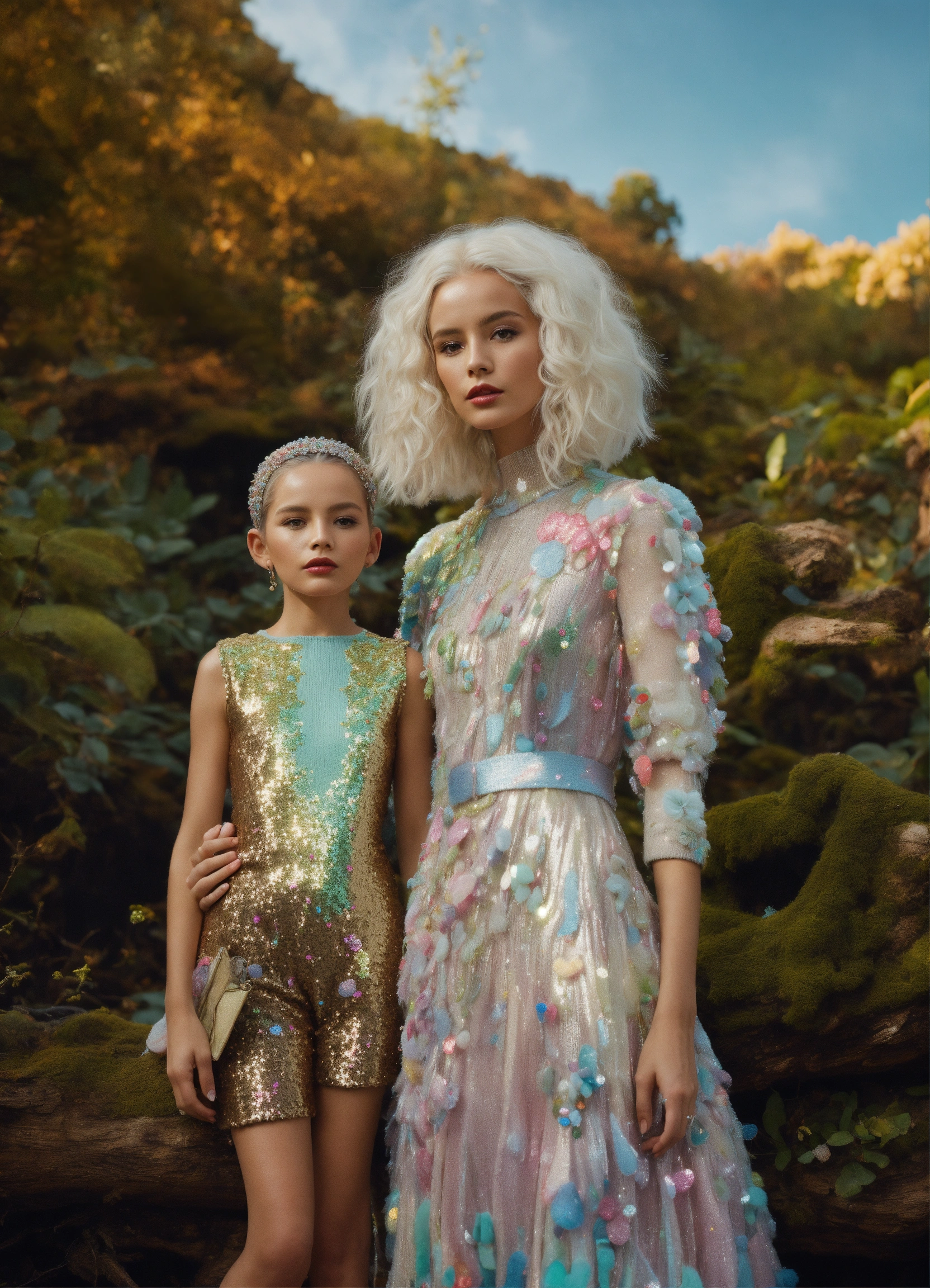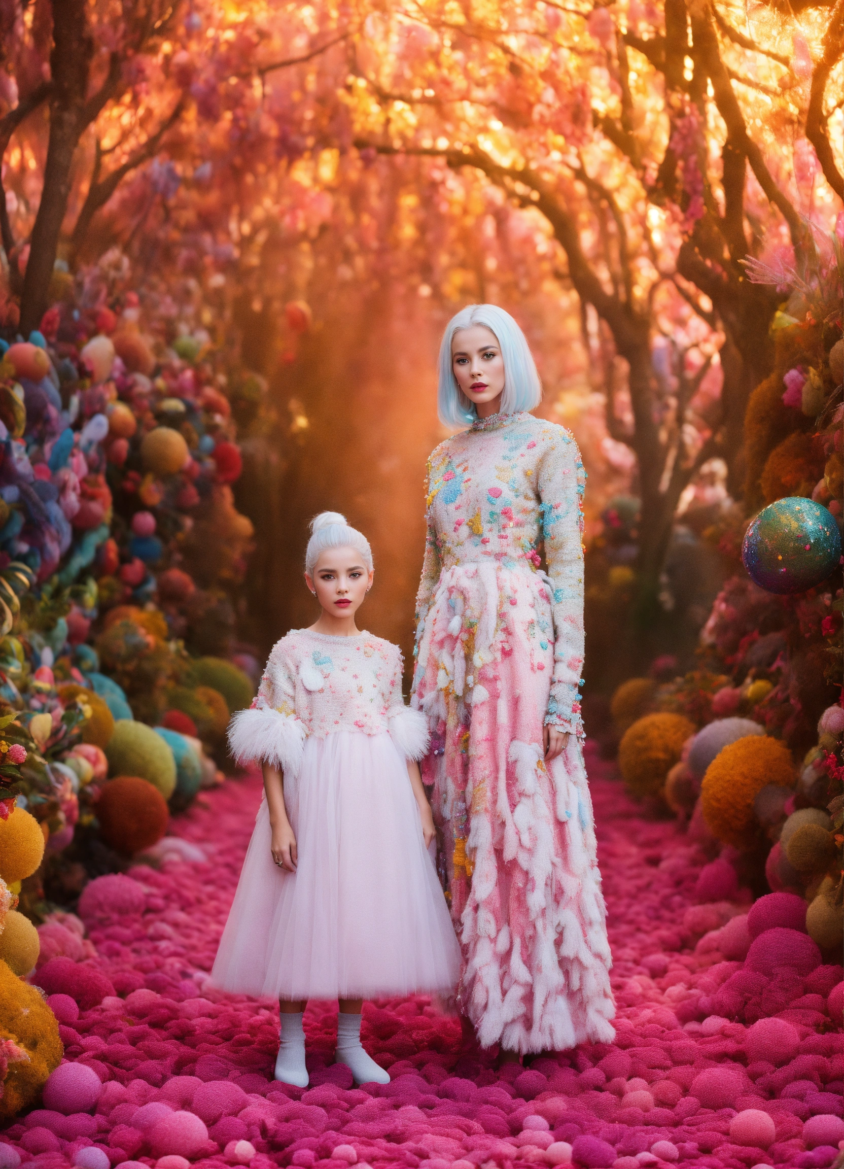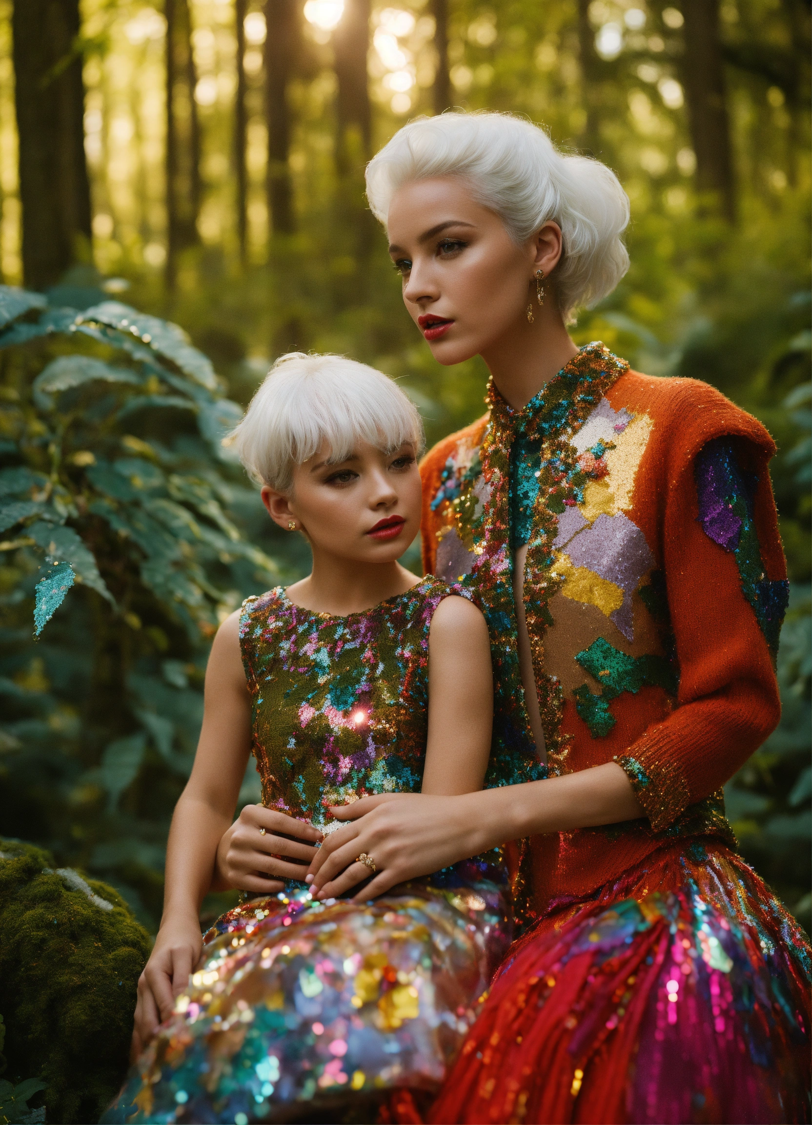 An editorial image of a woman with white hair and a young child wearing couture clothing, folklore accents, surrealistic, a play on large to small elements, vibrant candy pop and sparkle color tones, editorial, high fashion, intricate knitwear designs, highly detailed, organic inspiration, organic texture, ultra hd, 4k, realistic, surrealistic background, forest background, intricate patterned clothing with sequin detail, annihilation movie as inspiration for the background and patterns