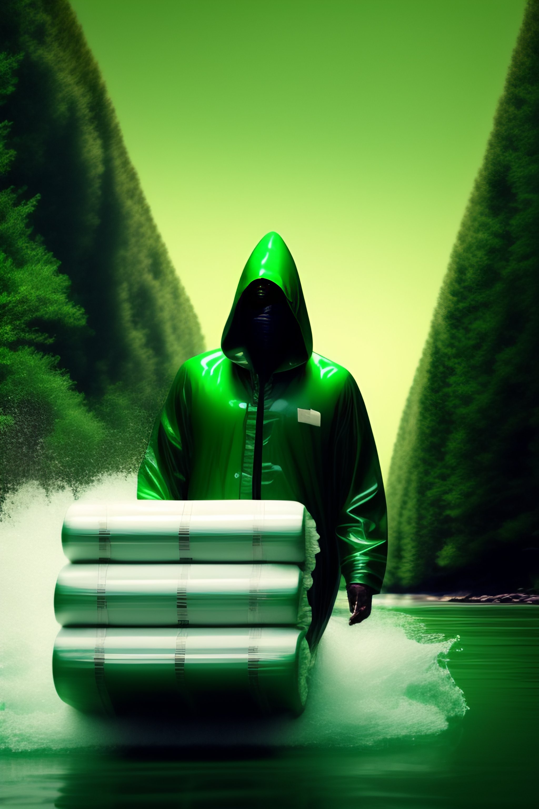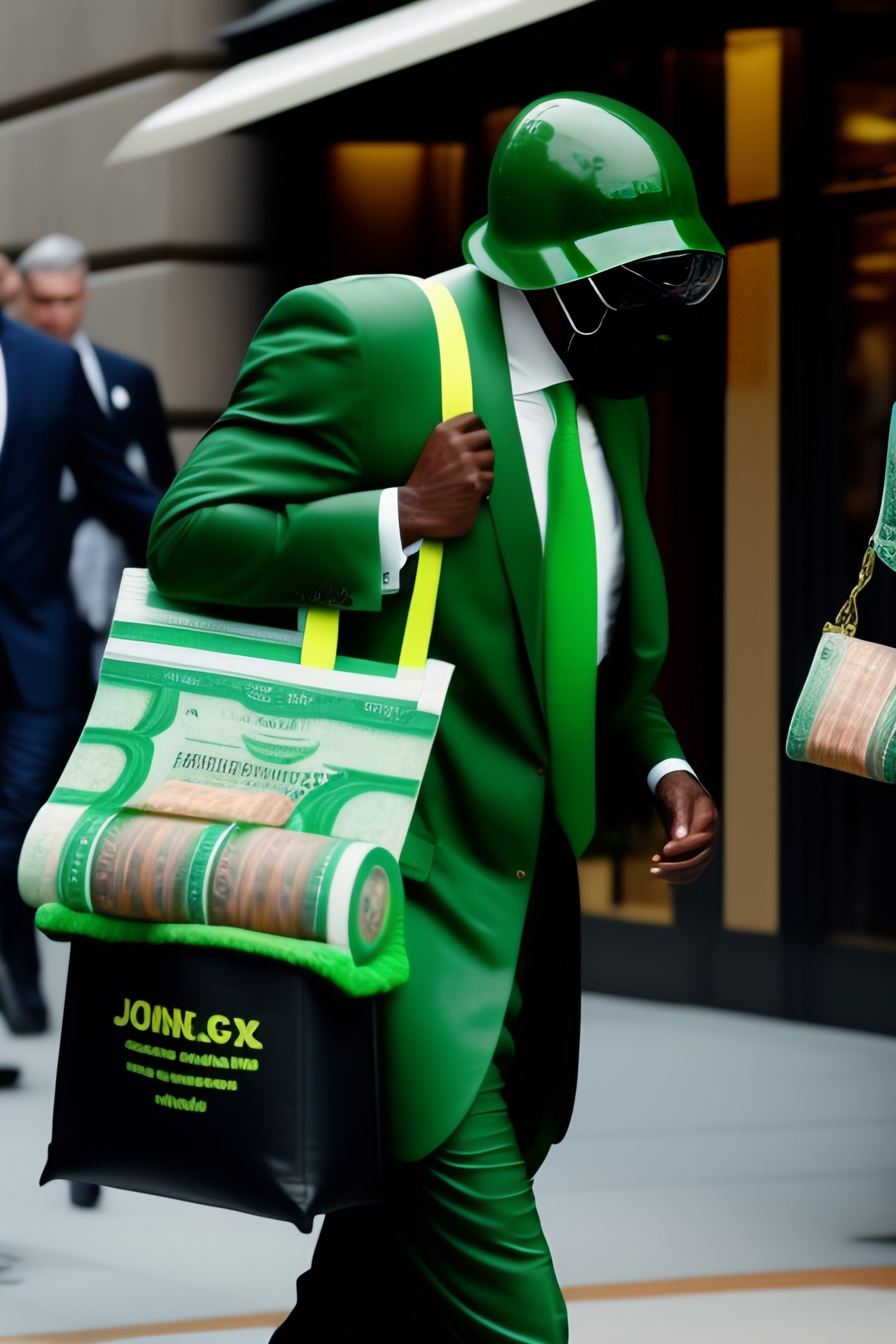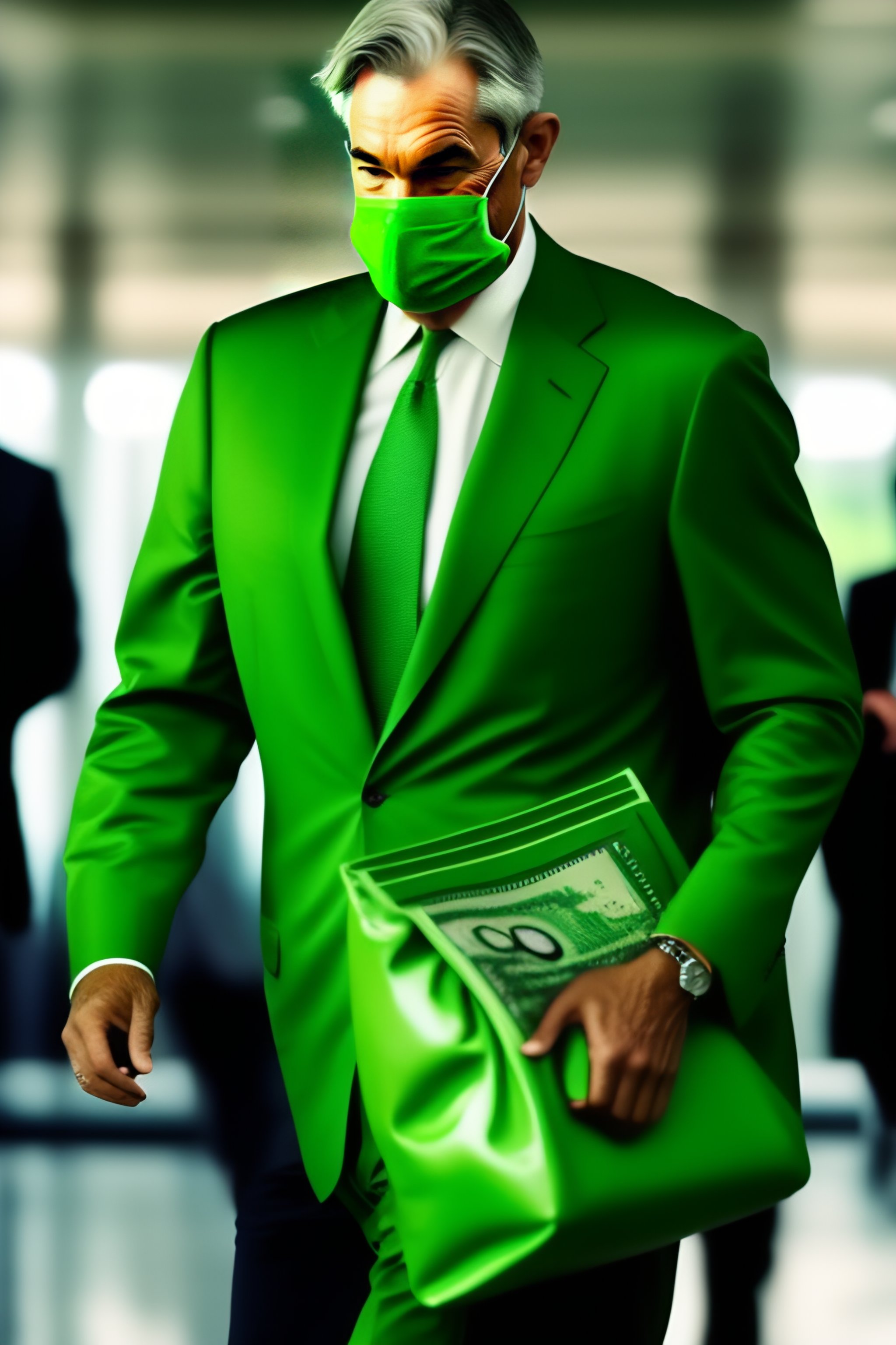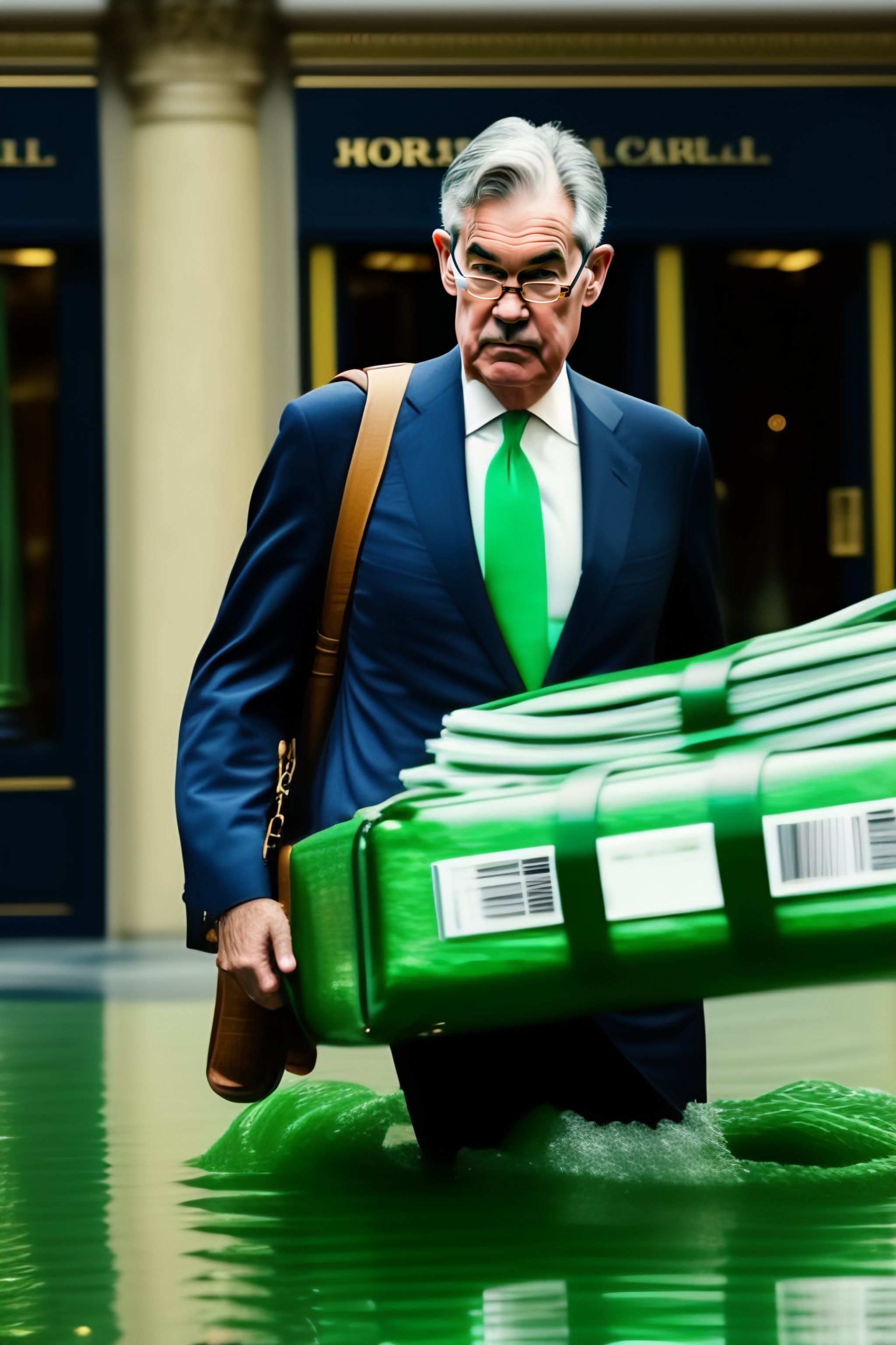 Jerome powell in bank robber outfit carrying sack of dollar bills in thick green slime river