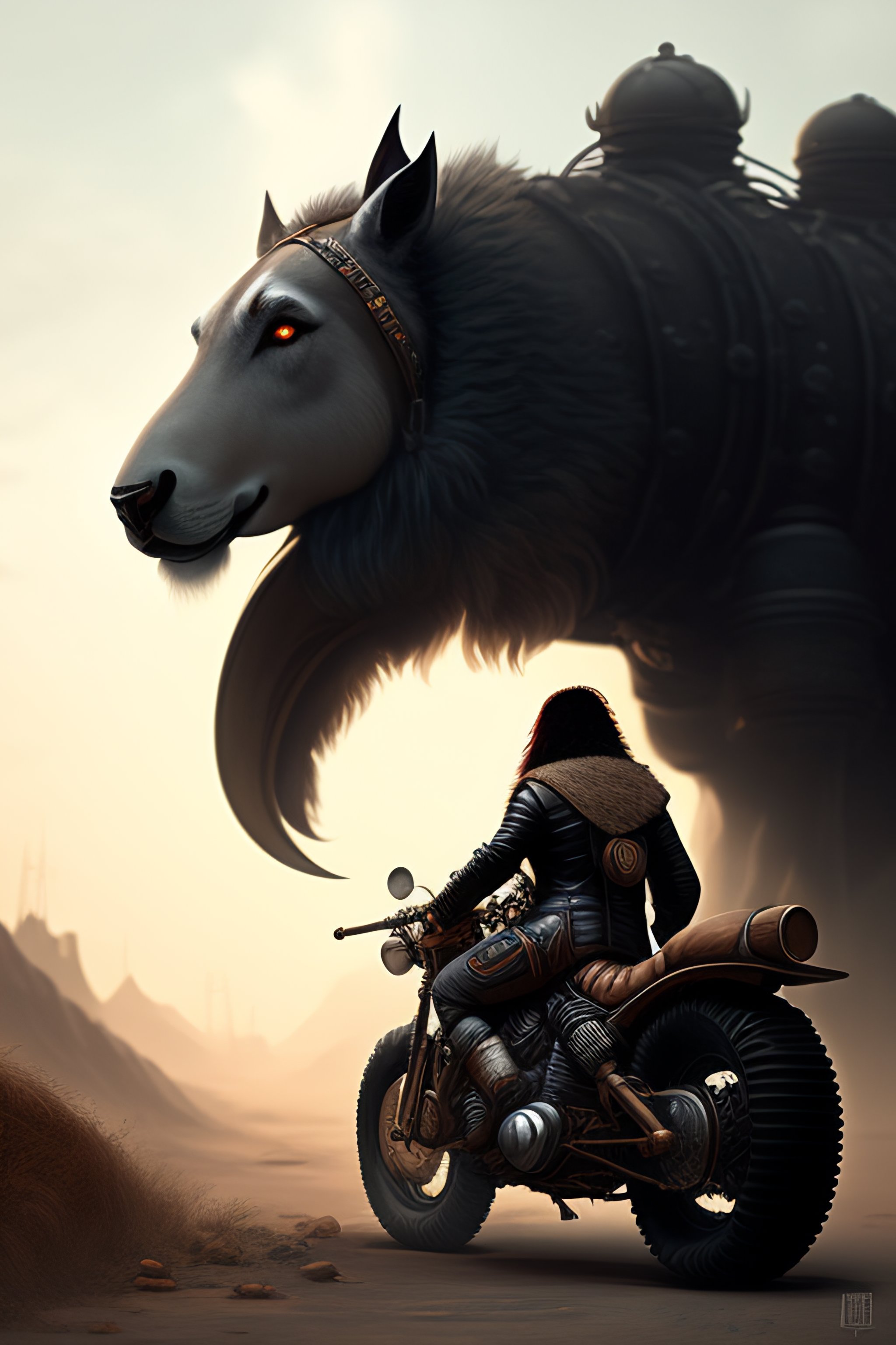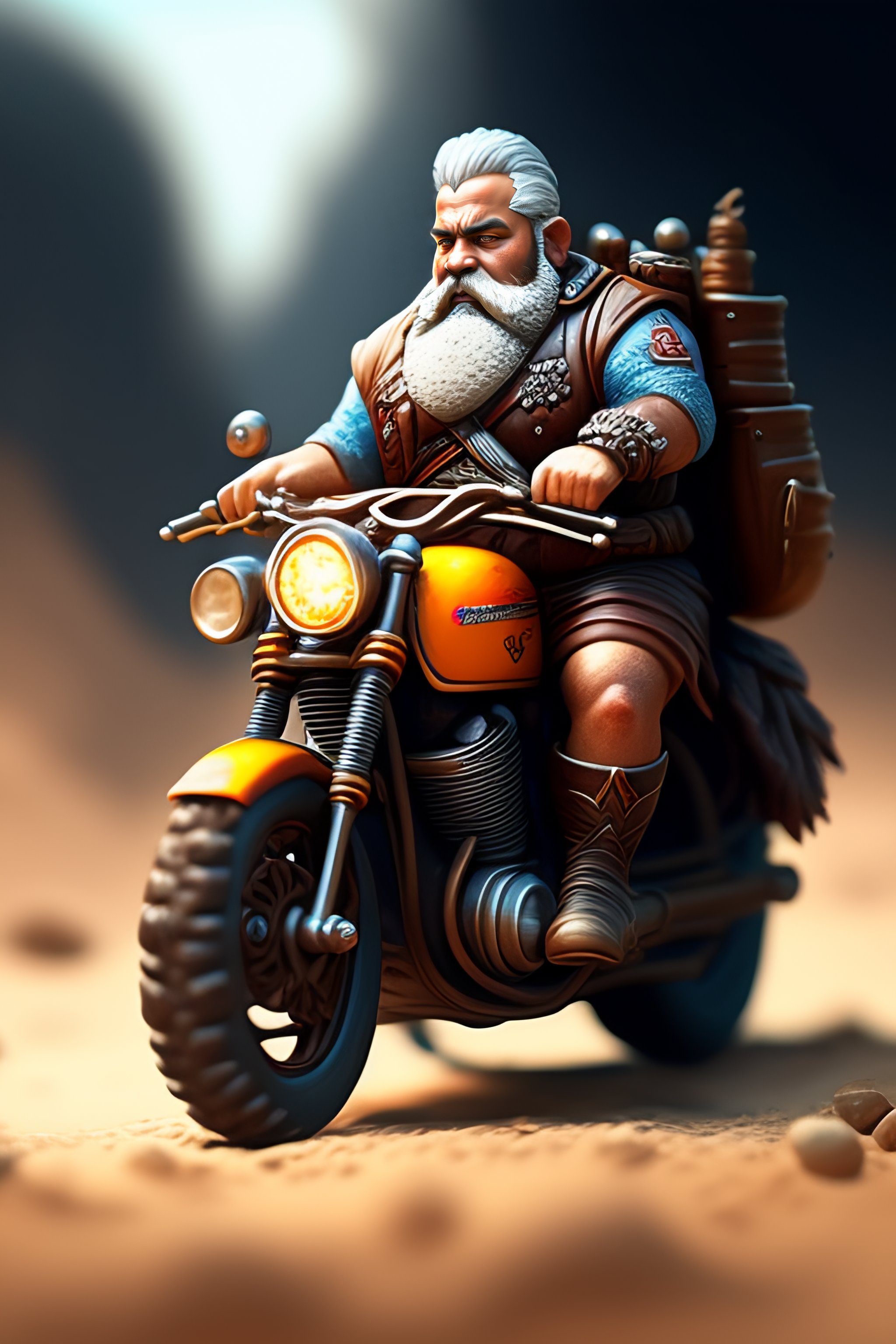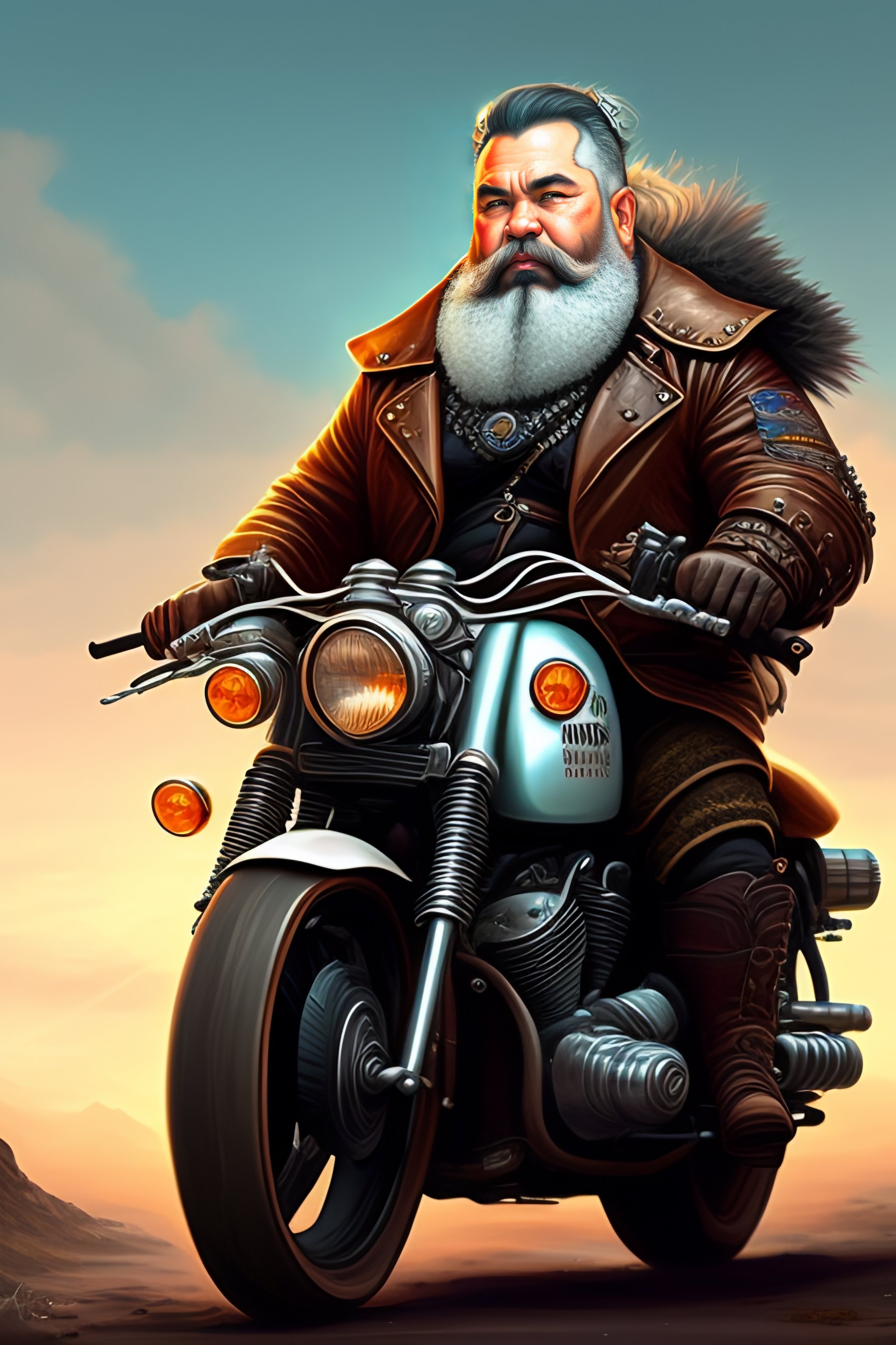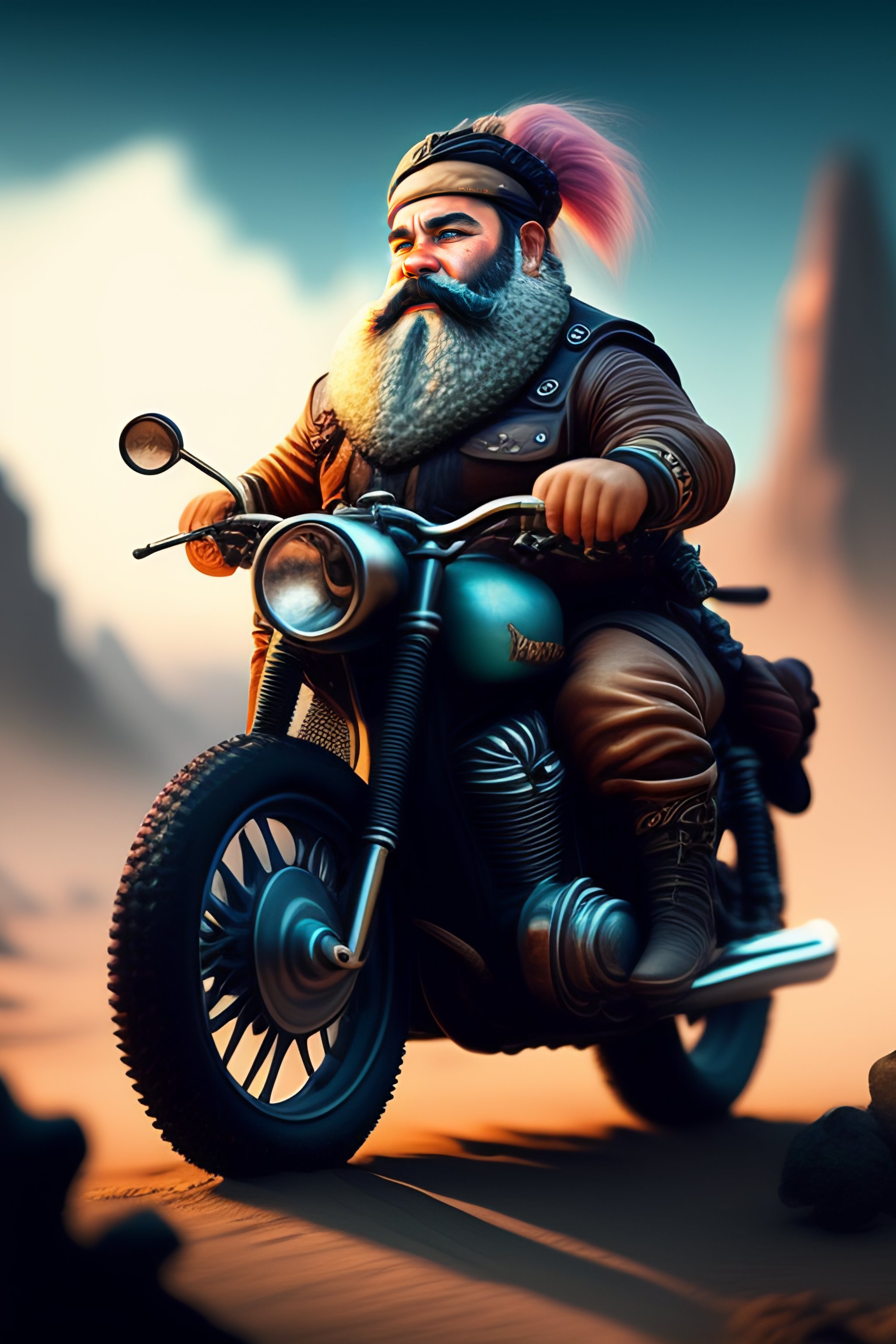 Fantasy art of a post apocalyptic dwarf on a motorcycle