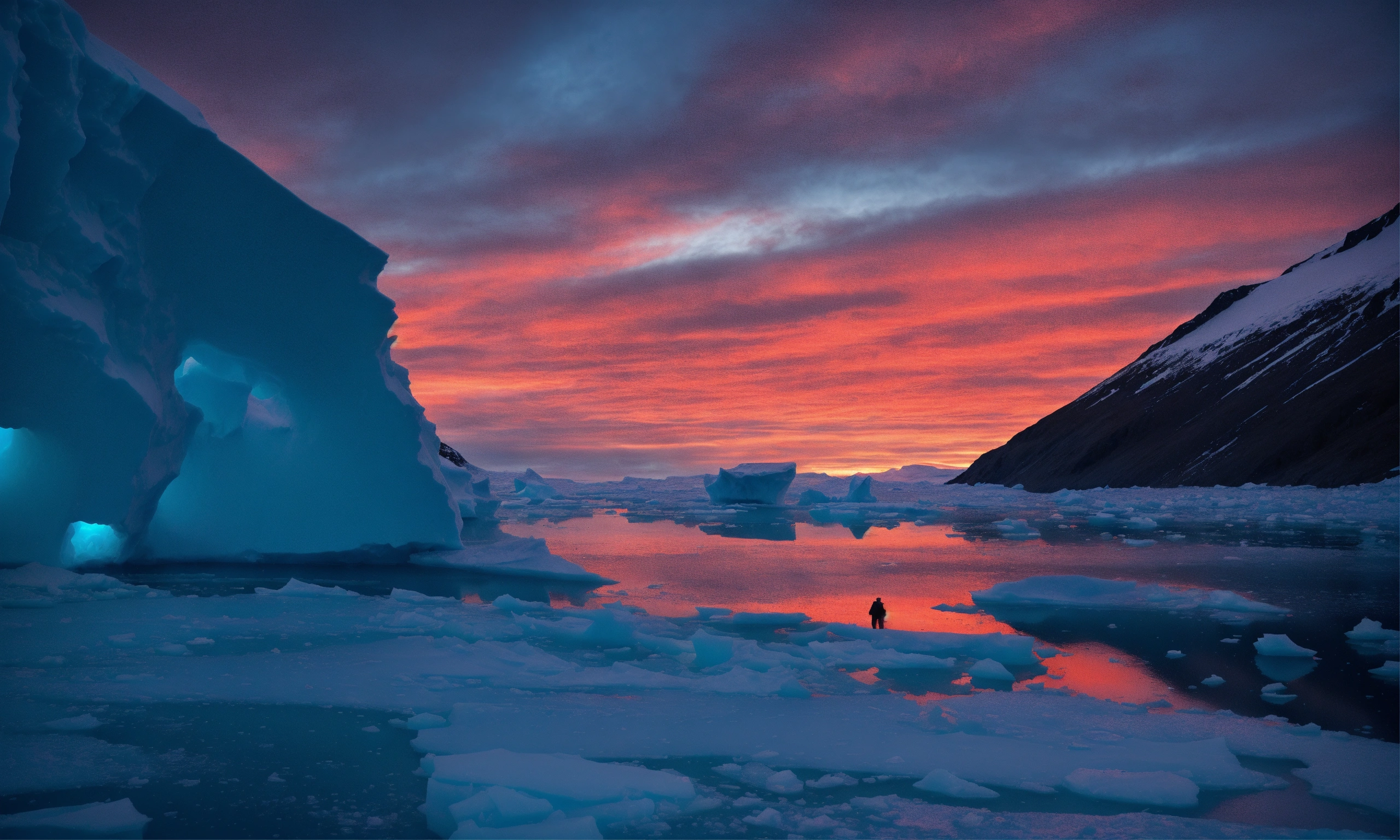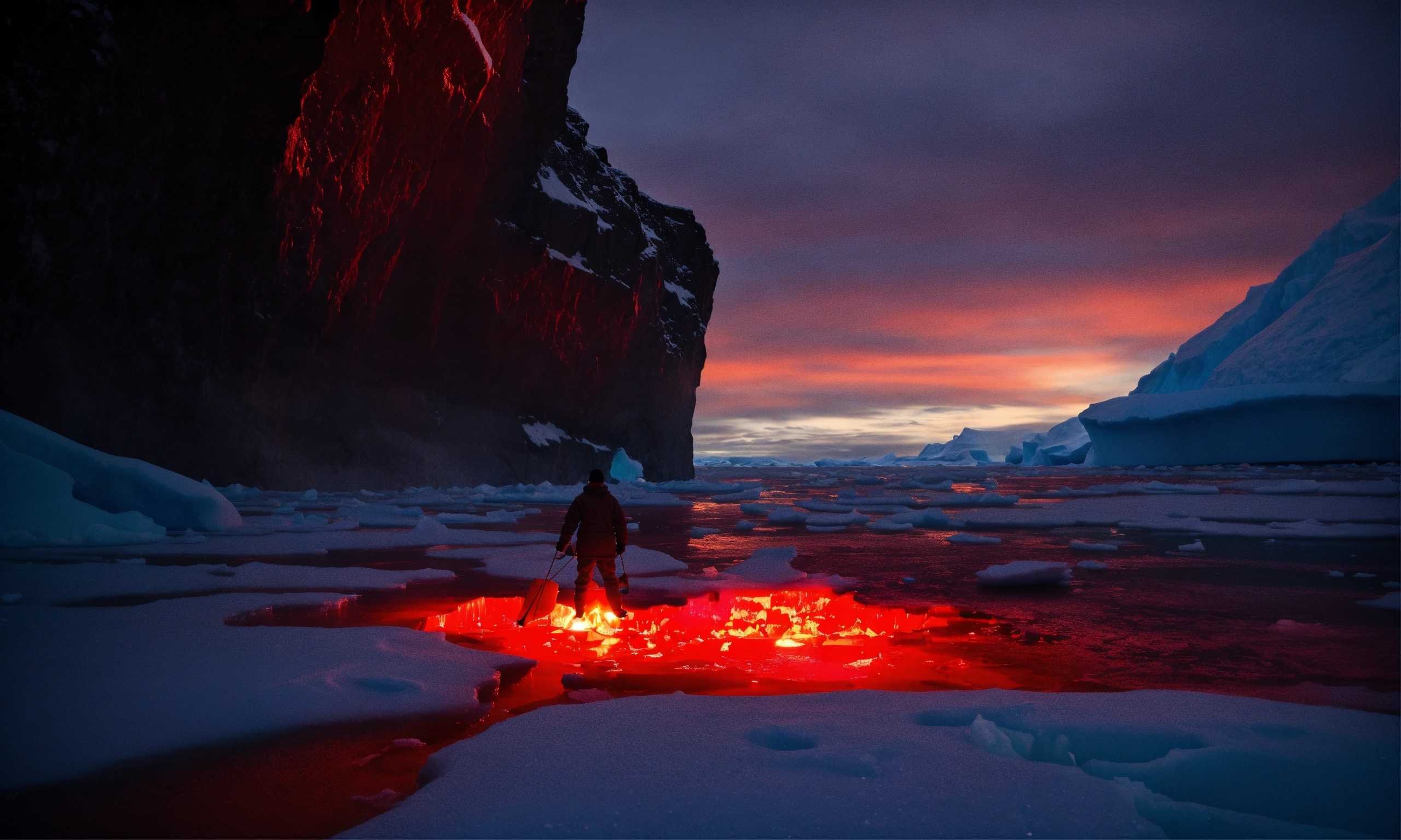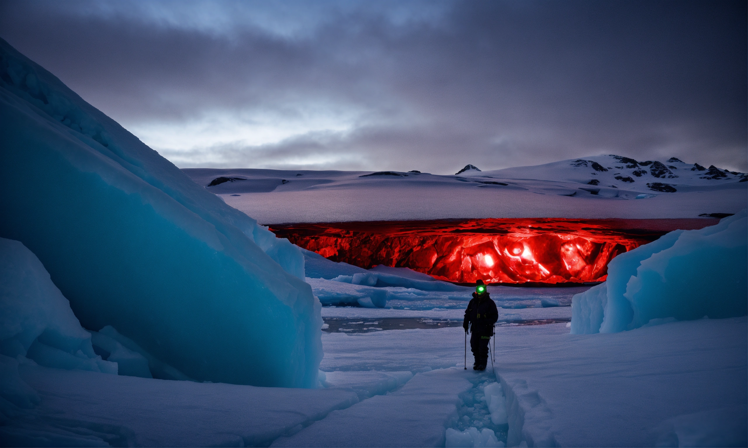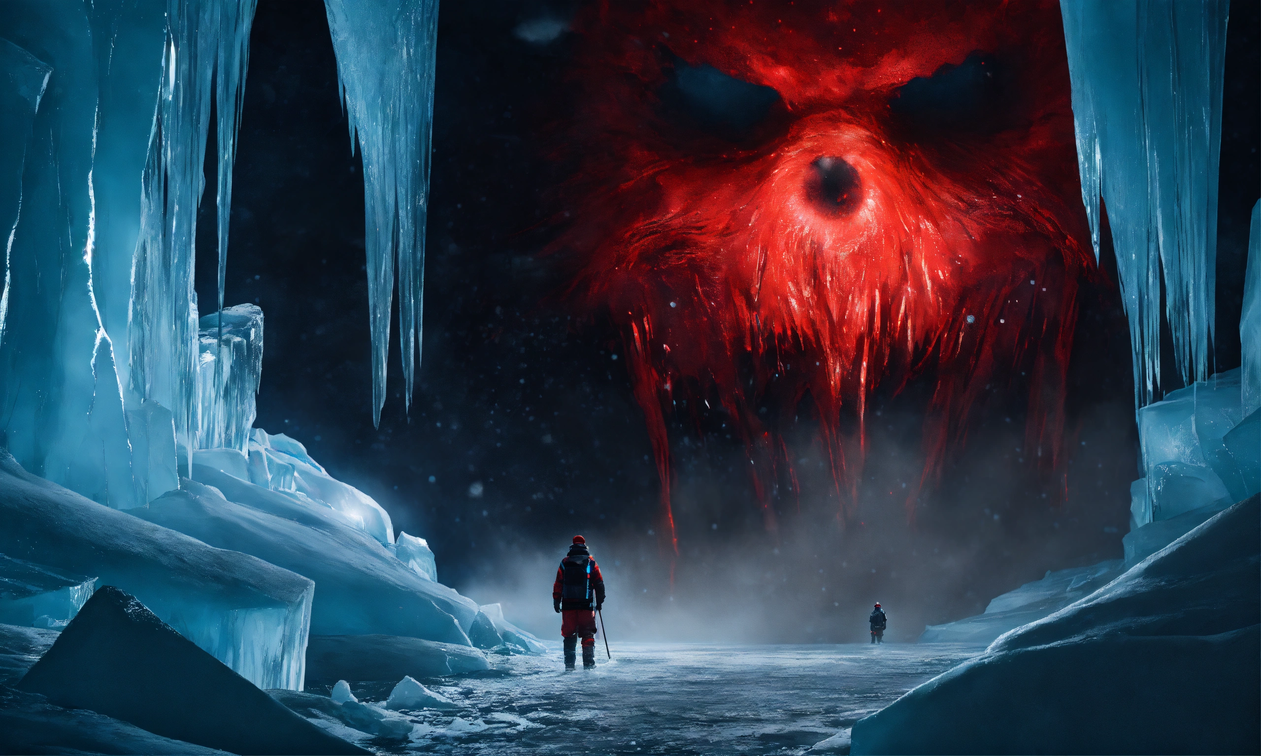 A man in deep crack in the ice below see a glowing red eyes of monster