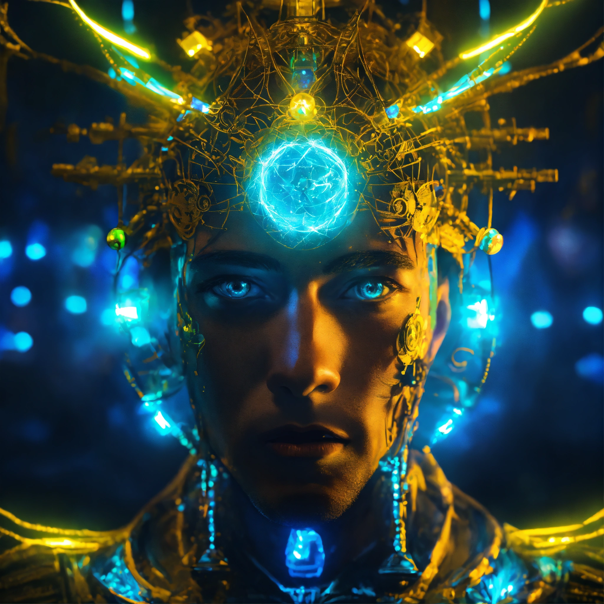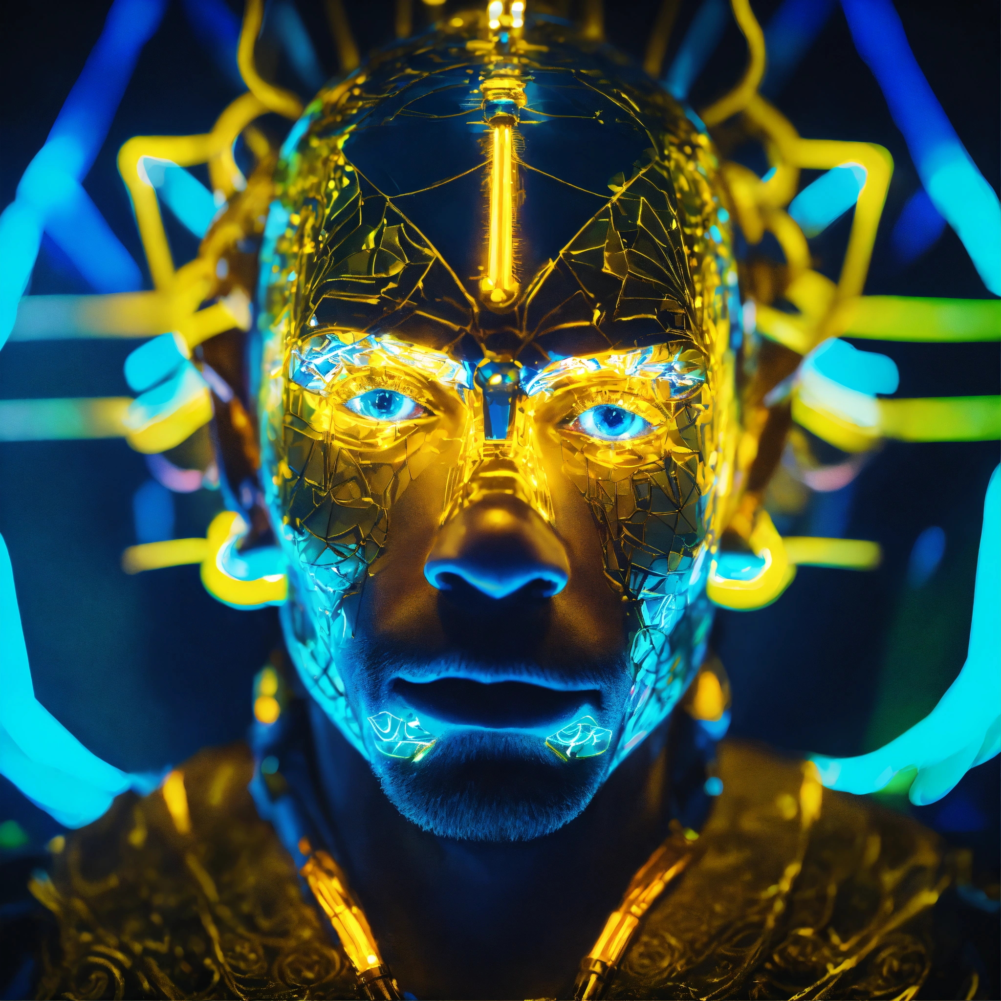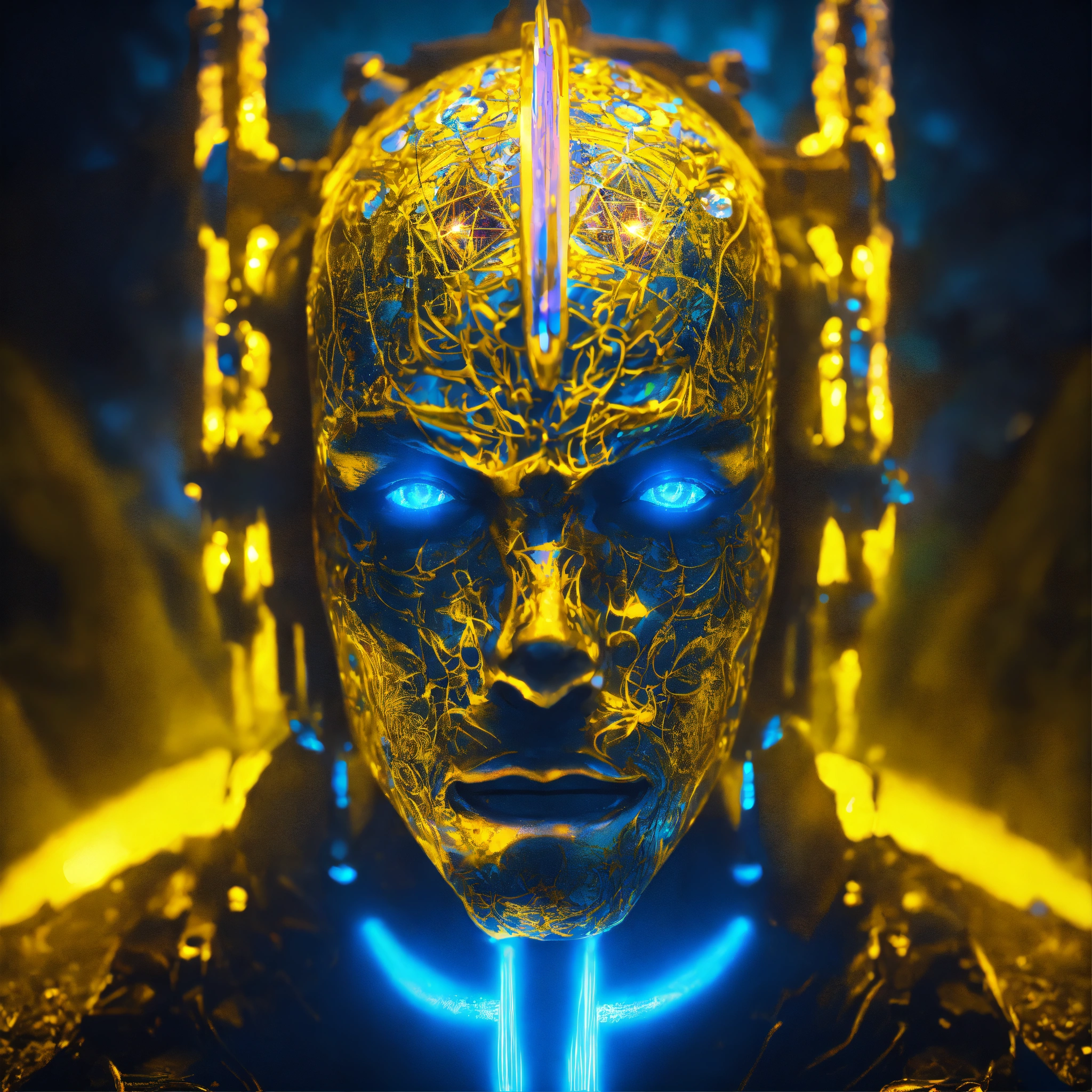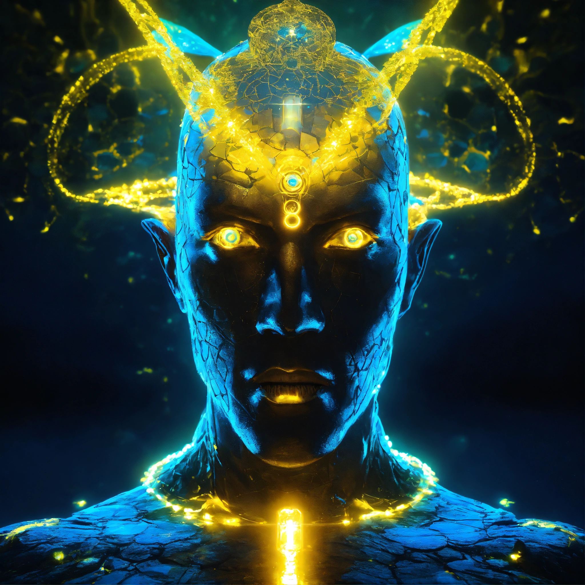 Underwater portrait photography, long exposure, powerful mystic man face portrait facing front, blue eyes. front view. front portrait, no angle. backlit. yellow neon glow. angelic transformer robotic face. sacred geometry patterns on the face, in the style of disney, pixar, tim burton, chronicles of narnia, beauty and the beast, and peter pan. enchanting glowing orb aura. fractal, volumetric lighting, backlit. the power of the god. god-like, spirit-like.