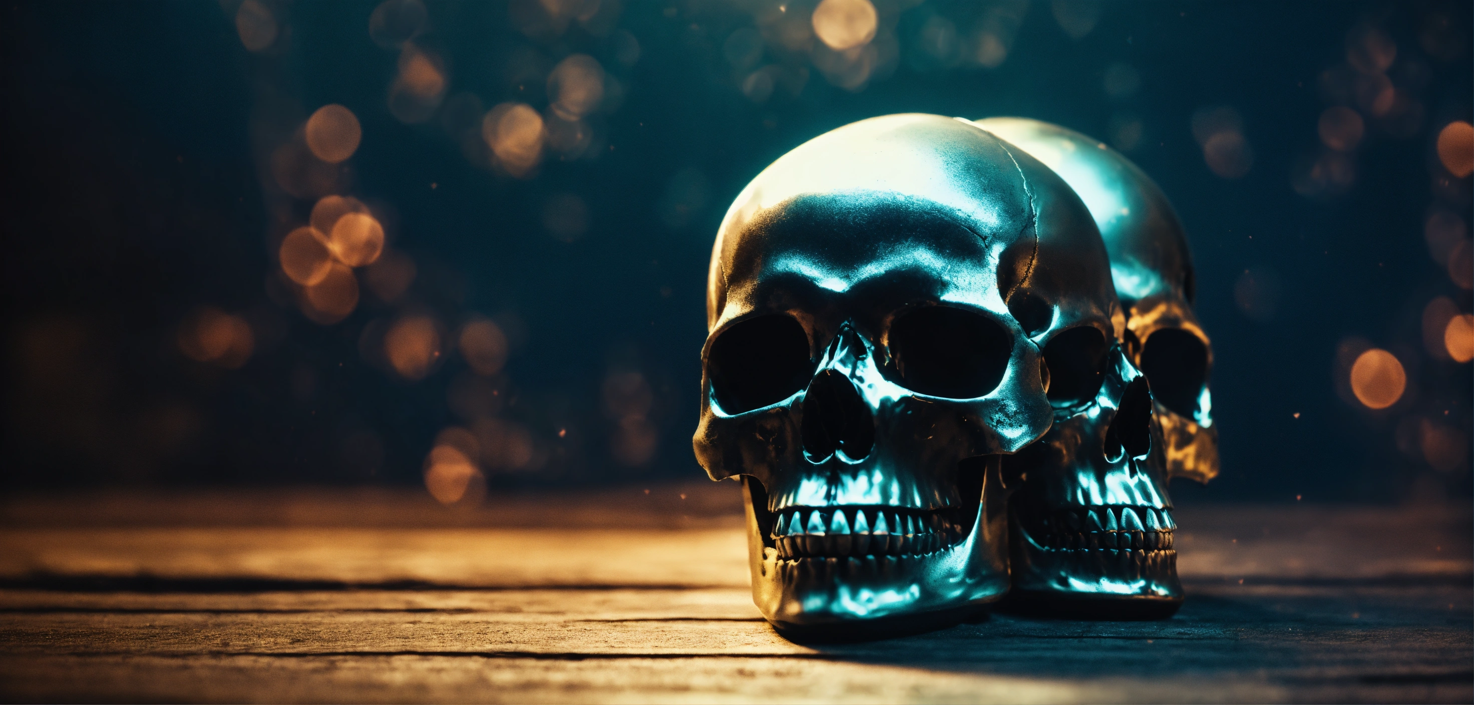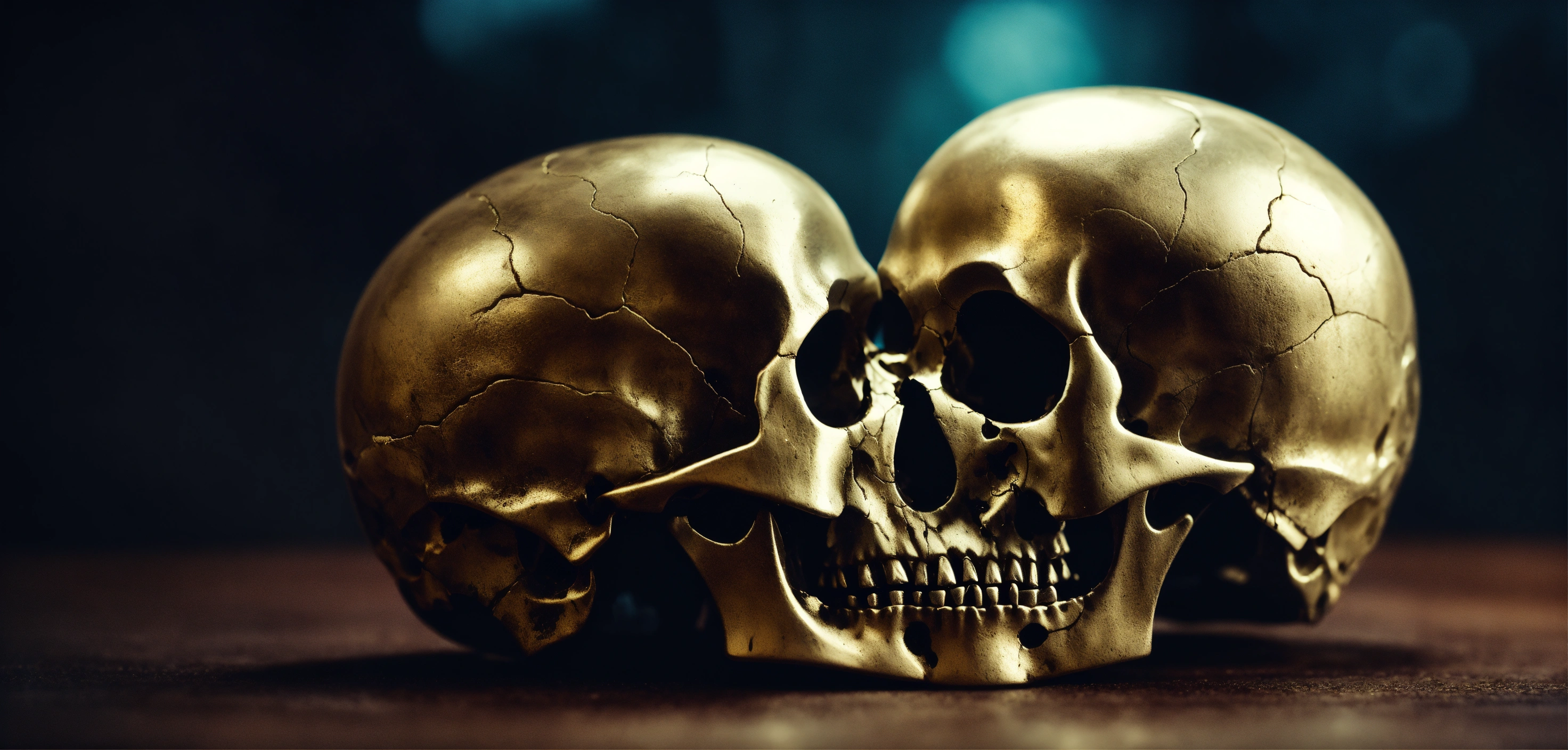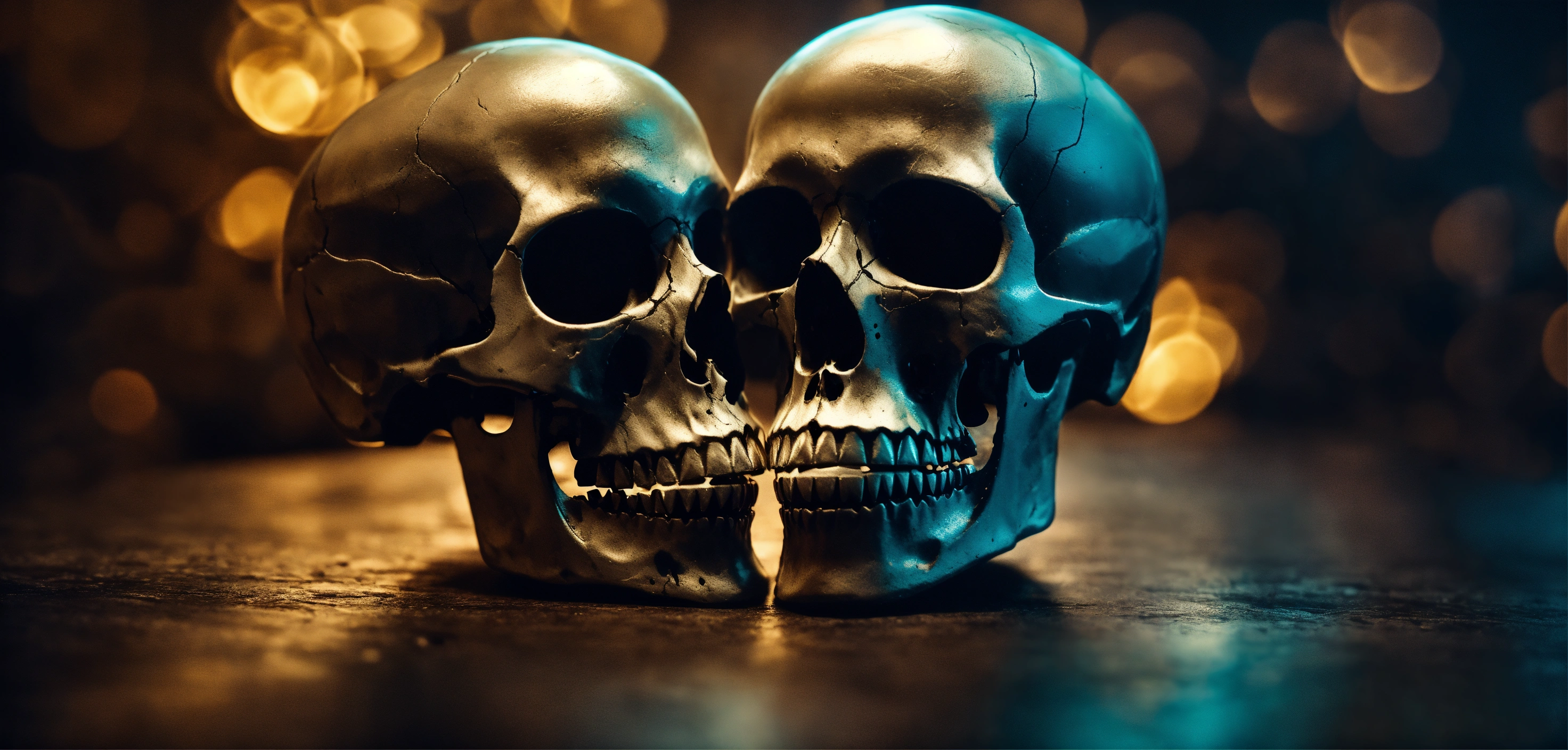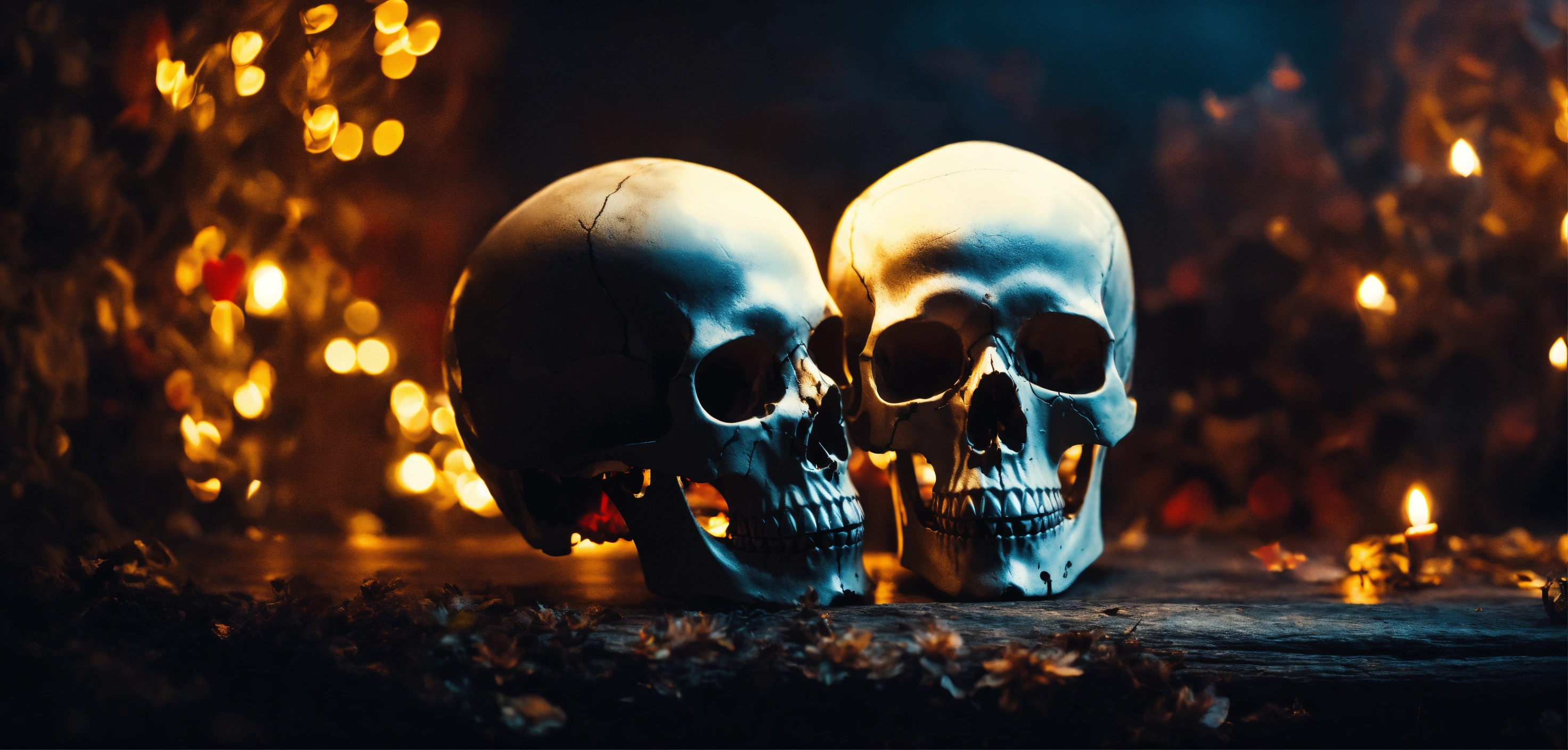 Two skulls in heart shape kissing on dark atmosphere background. minimal love concept., cinematic shot, cinematic, realistic, film grain, volumetric light, imax, photorealistic, hyperdetailed textures, sharp focus, vintage photo filter