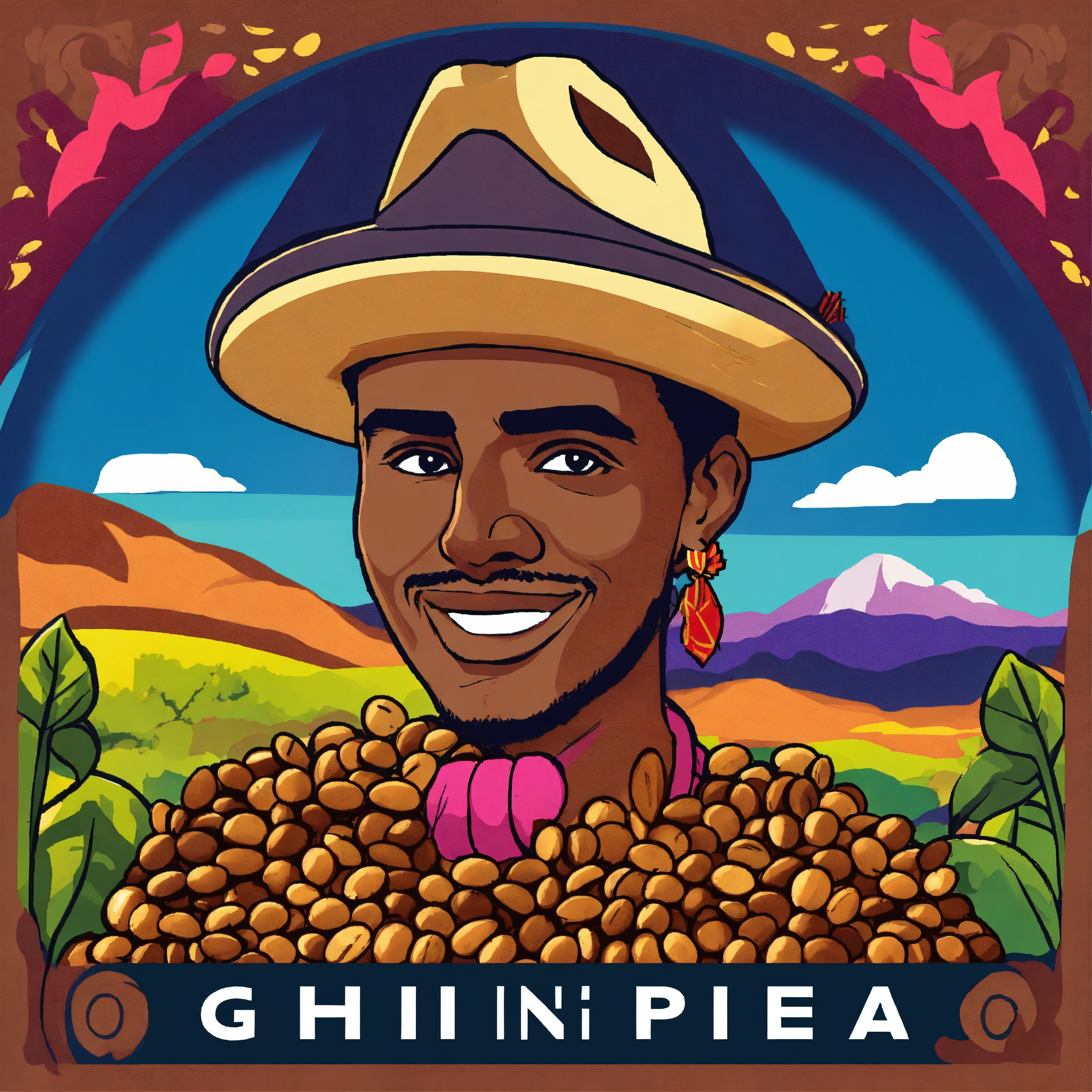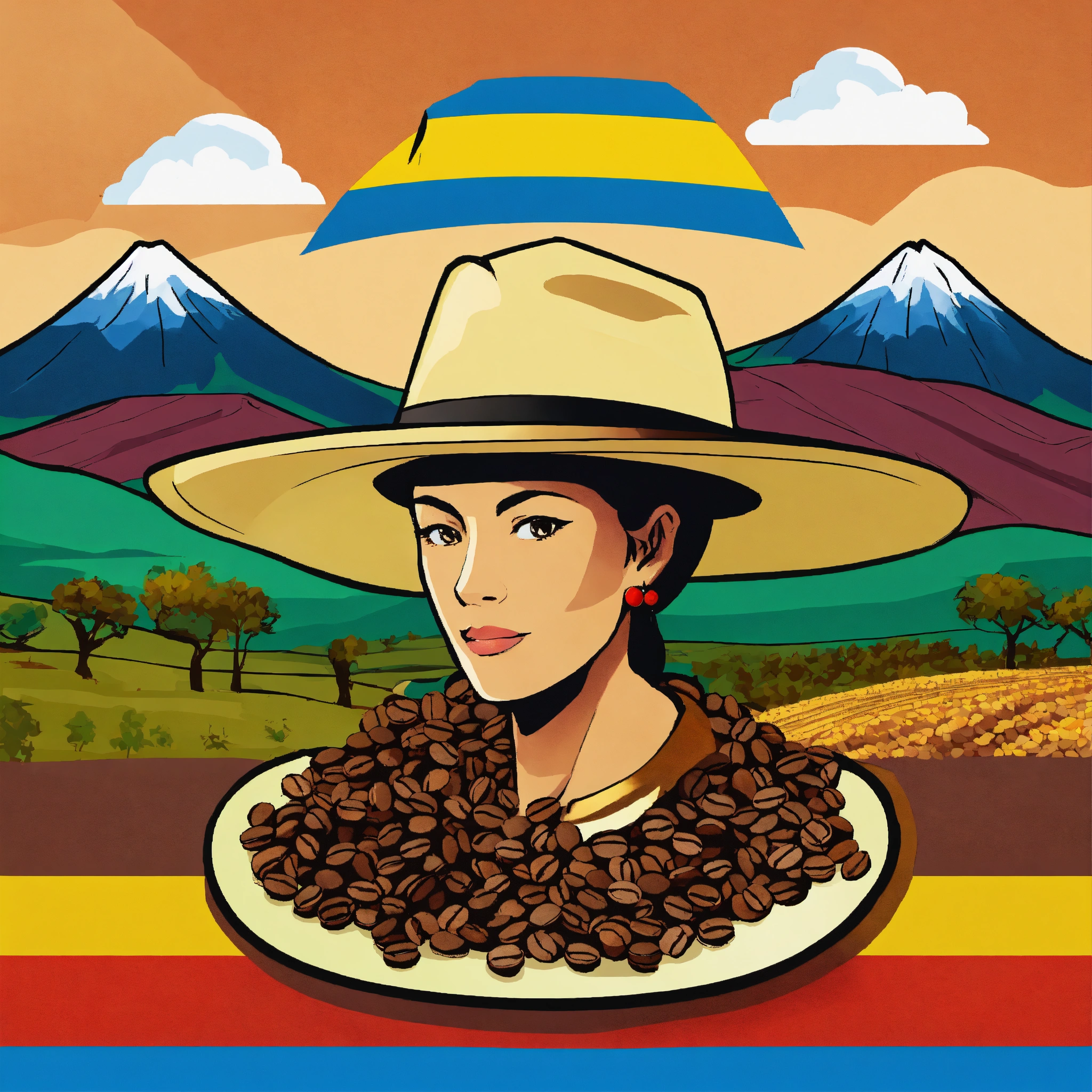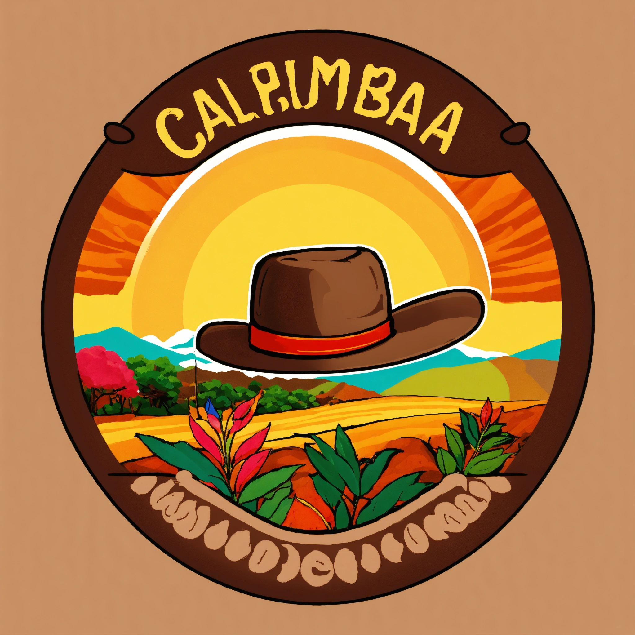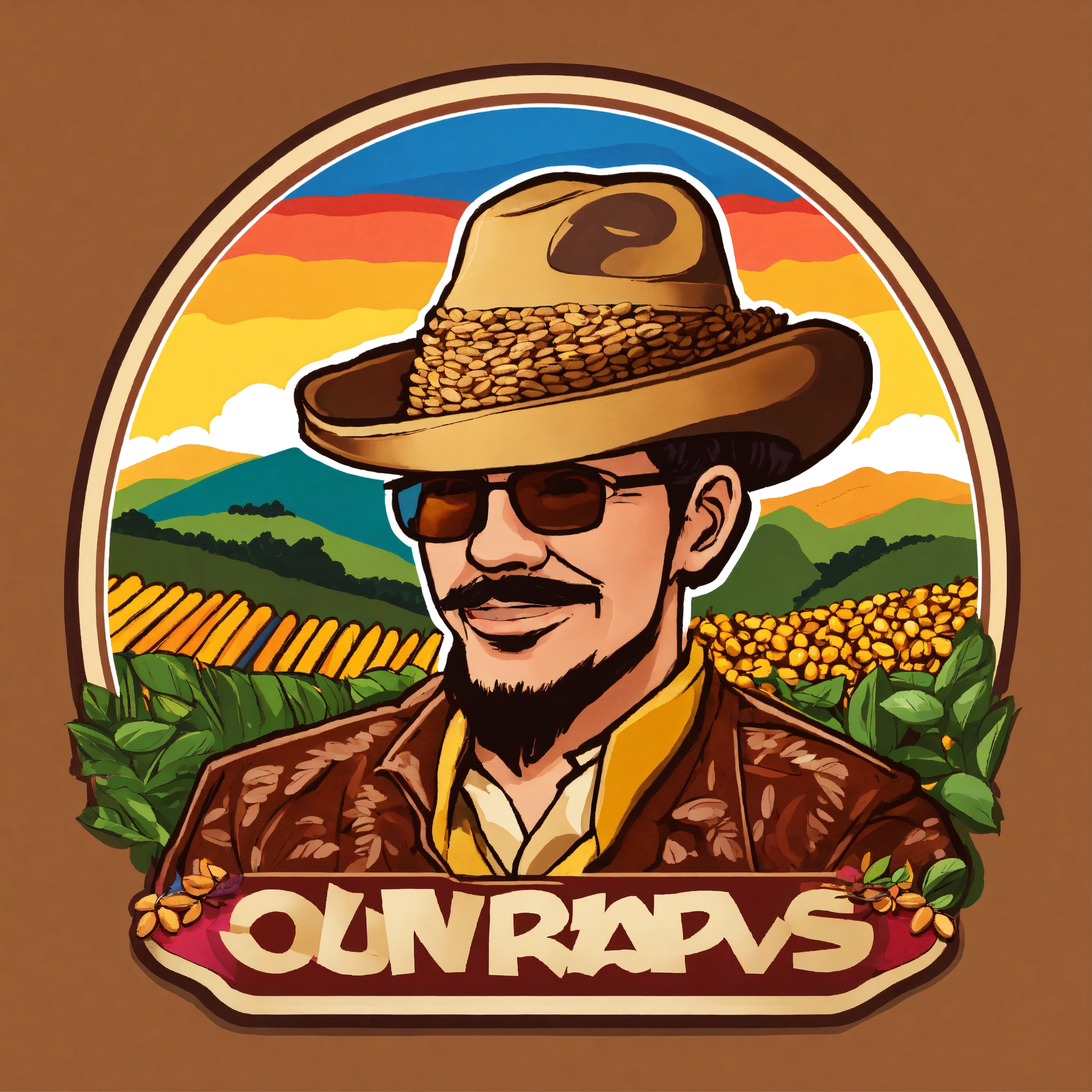Generates a logo with colombian coffee seeds, that has a huilense hat and in the background a colorful landscape, cartoon version