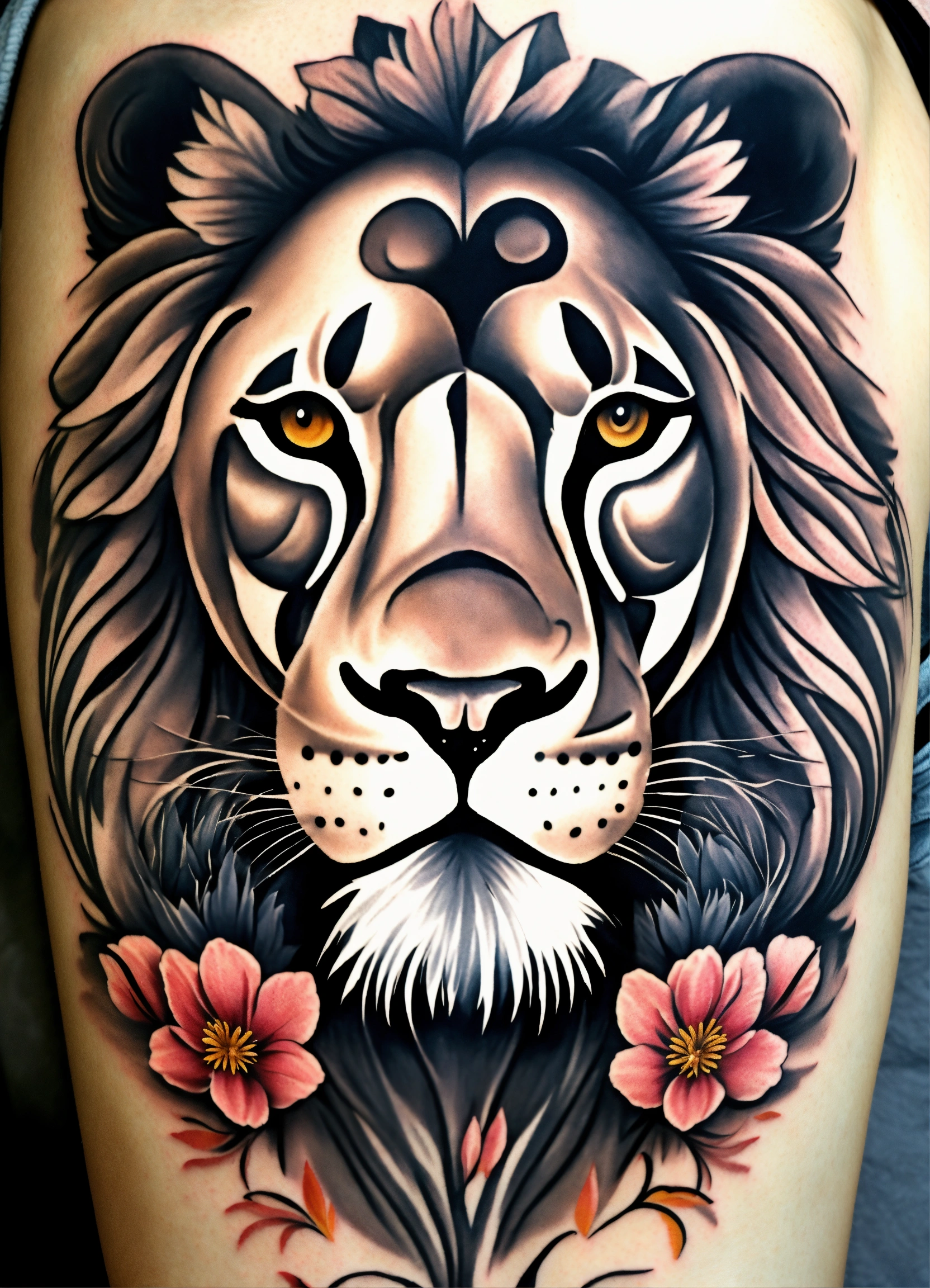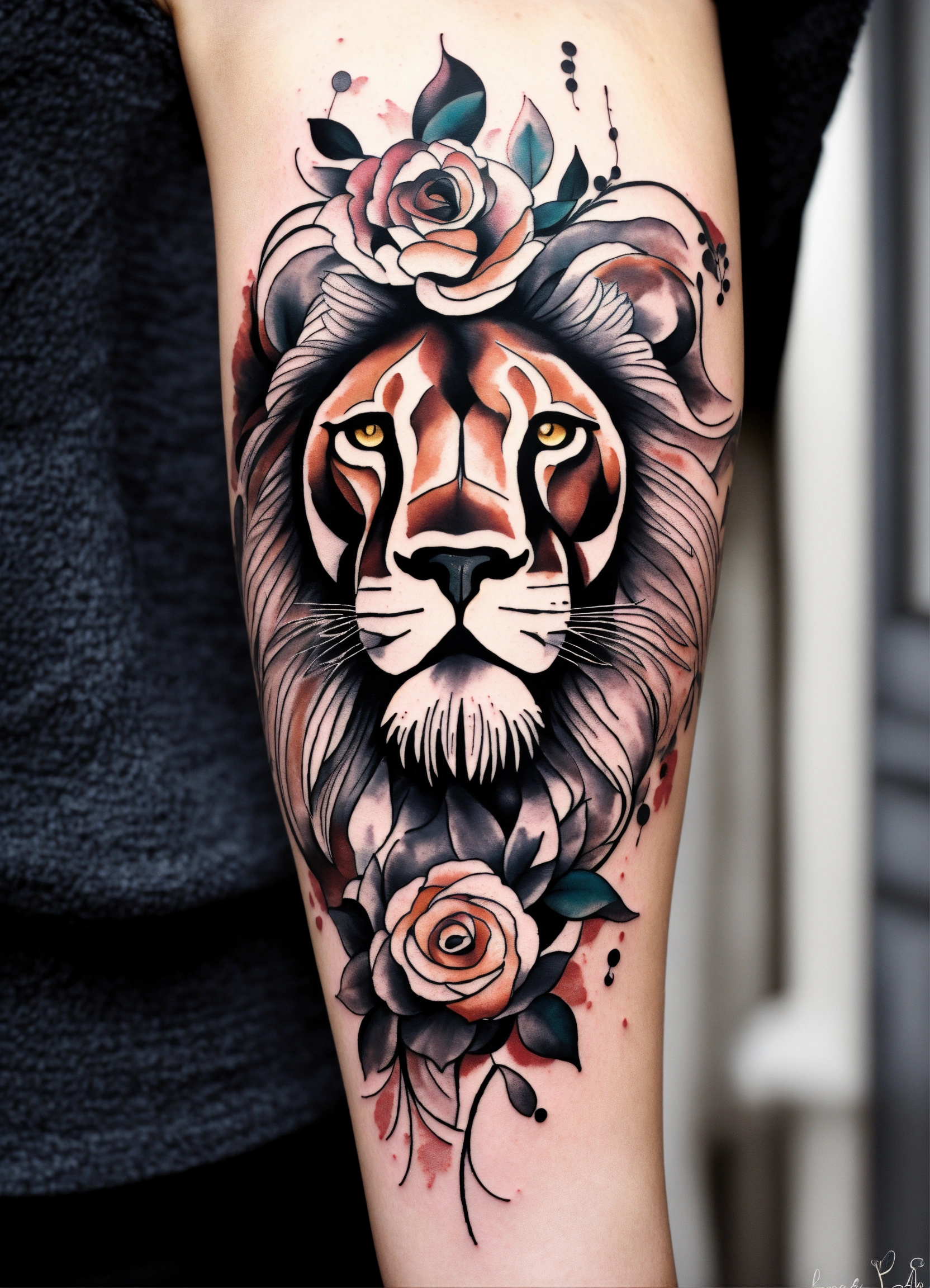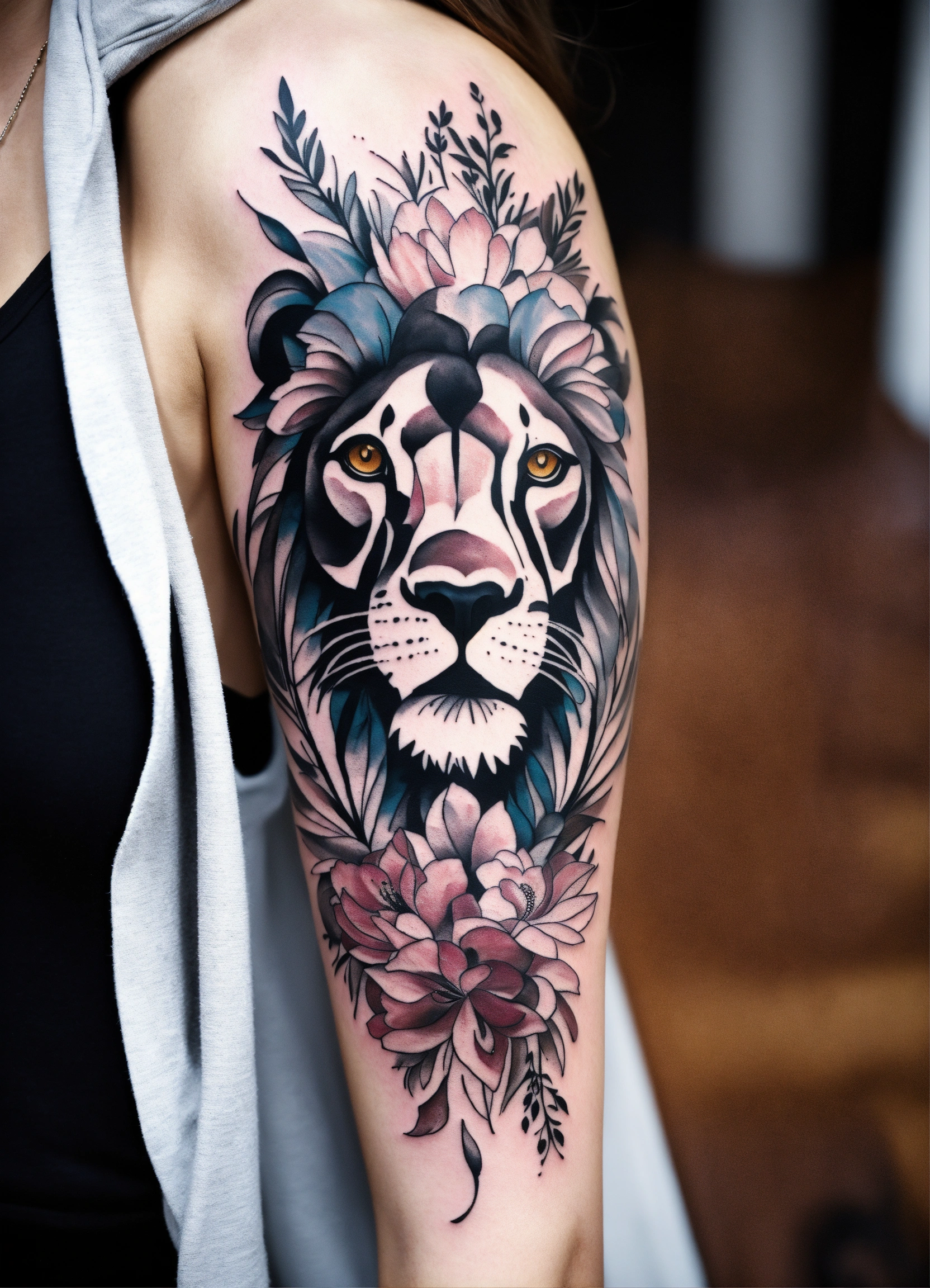 Noir gris lionne lionceaux fleurs abstract arm tattoo