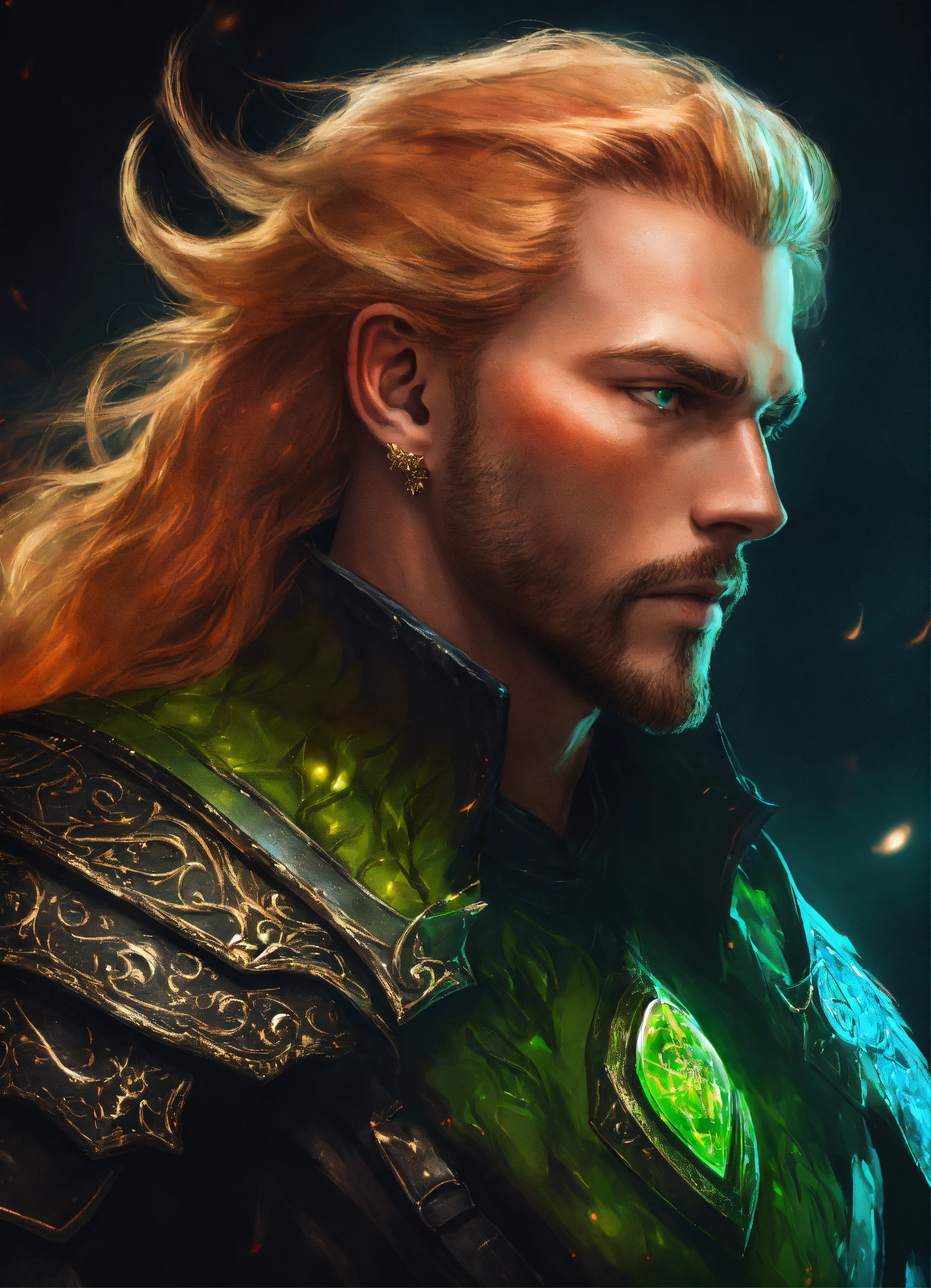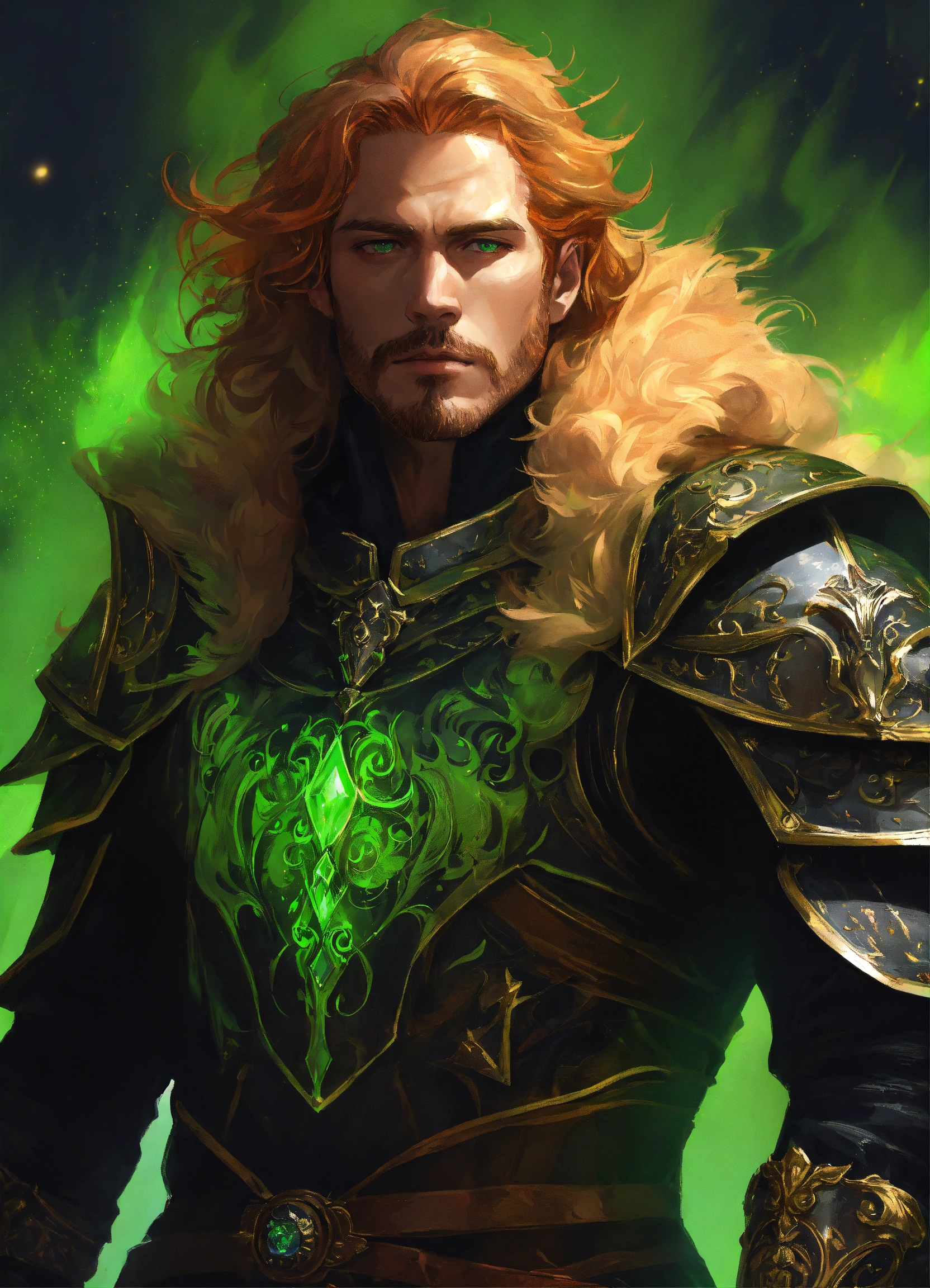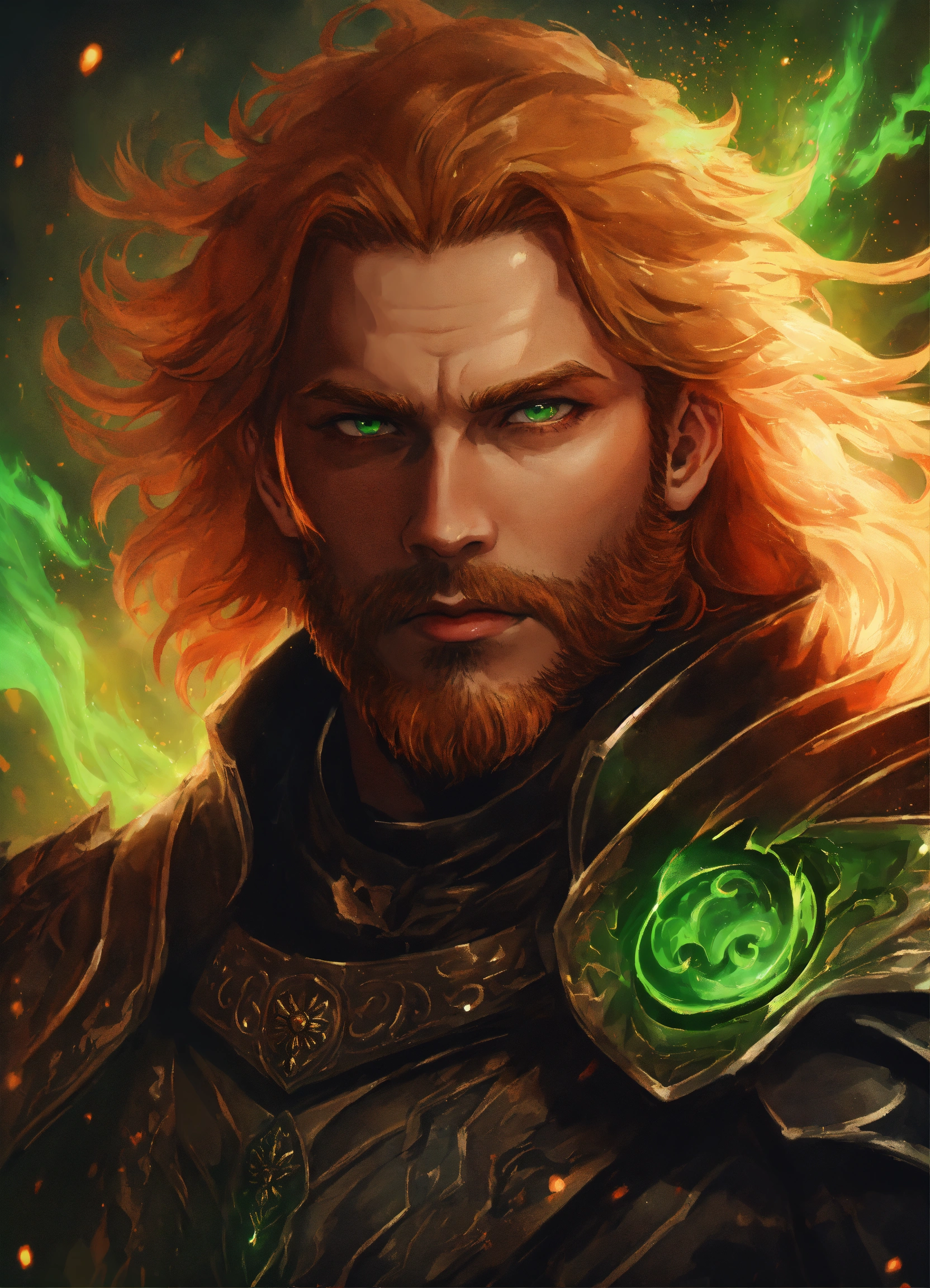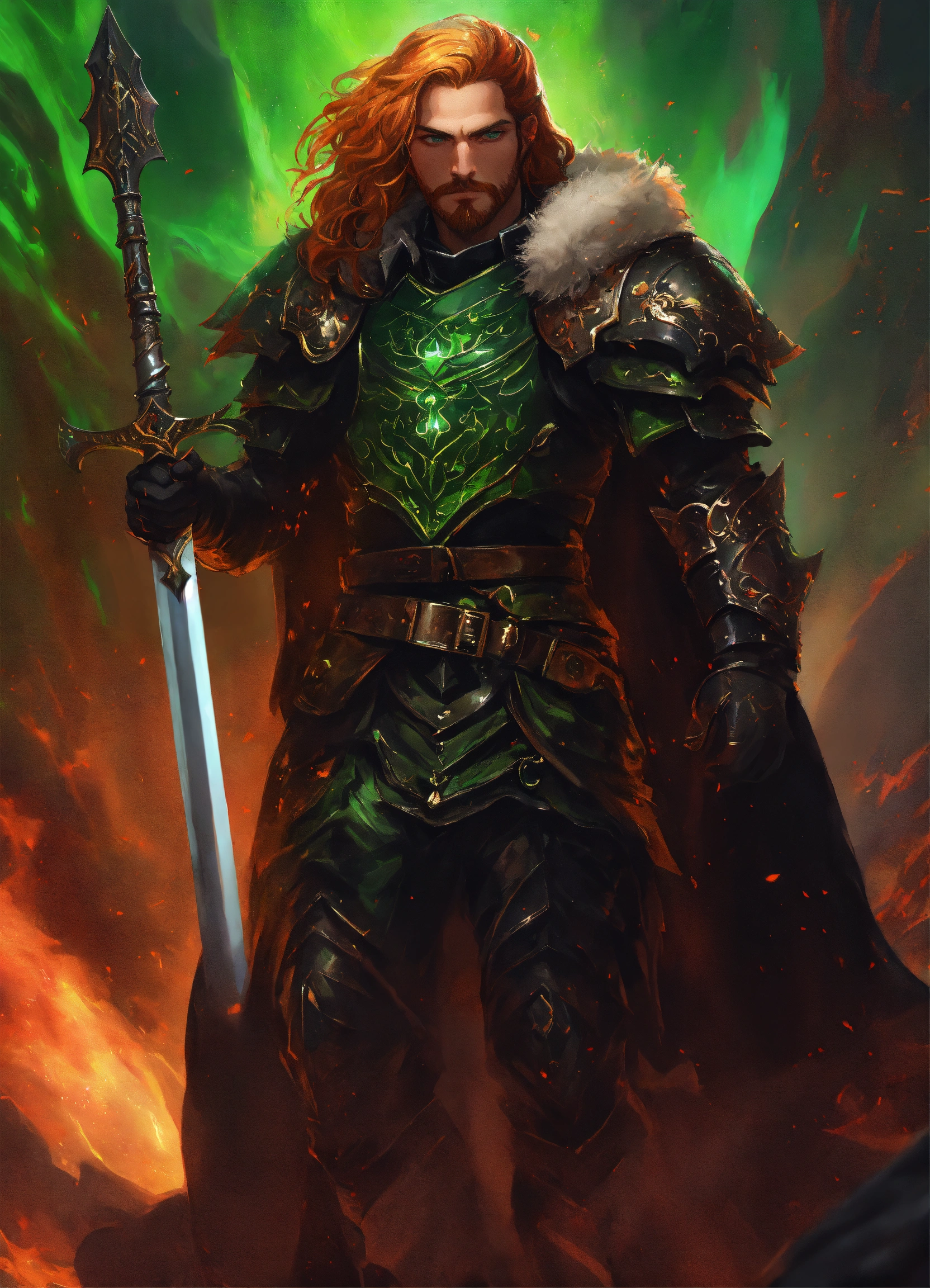 The king of hell wearing black leather armor with a fur collar. male with a rounded jawline, bright green eyes, and long wavy strawberry-blonde hair that flows down past his shoulders. he is in his 40s with stubble facial hair. he stands in hell with a cosmic swirl around him. d&d, fantasy, cinematic.