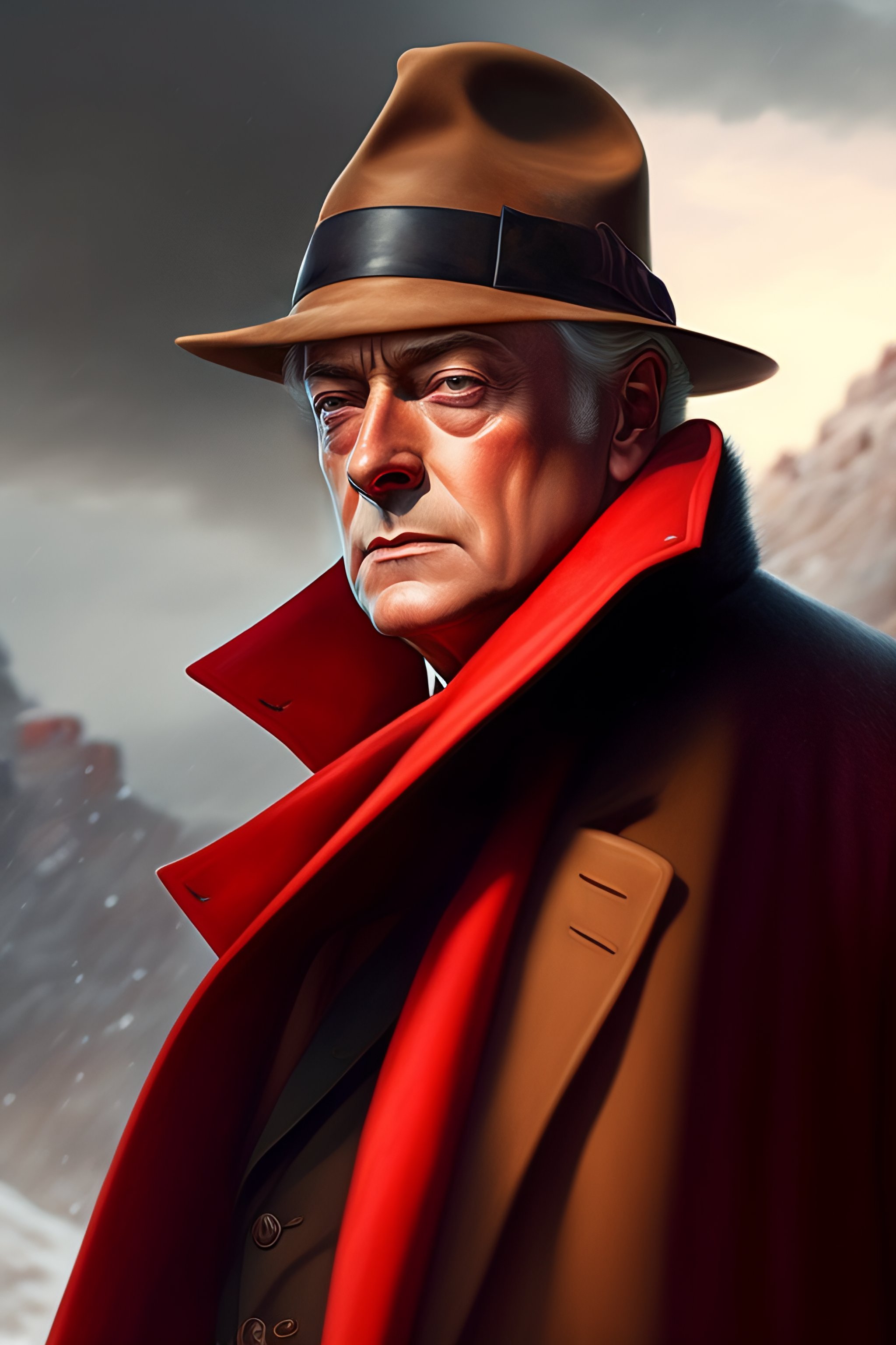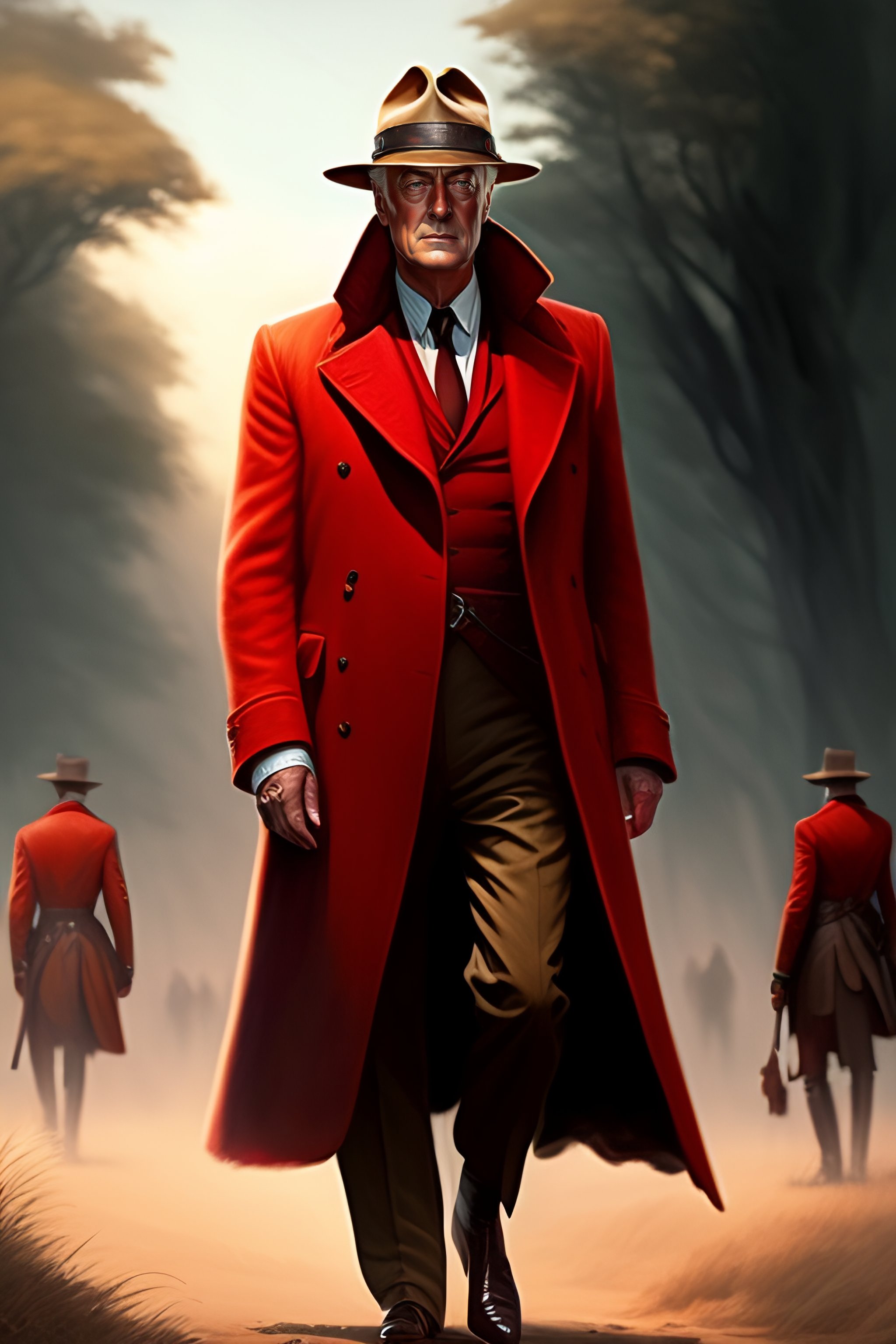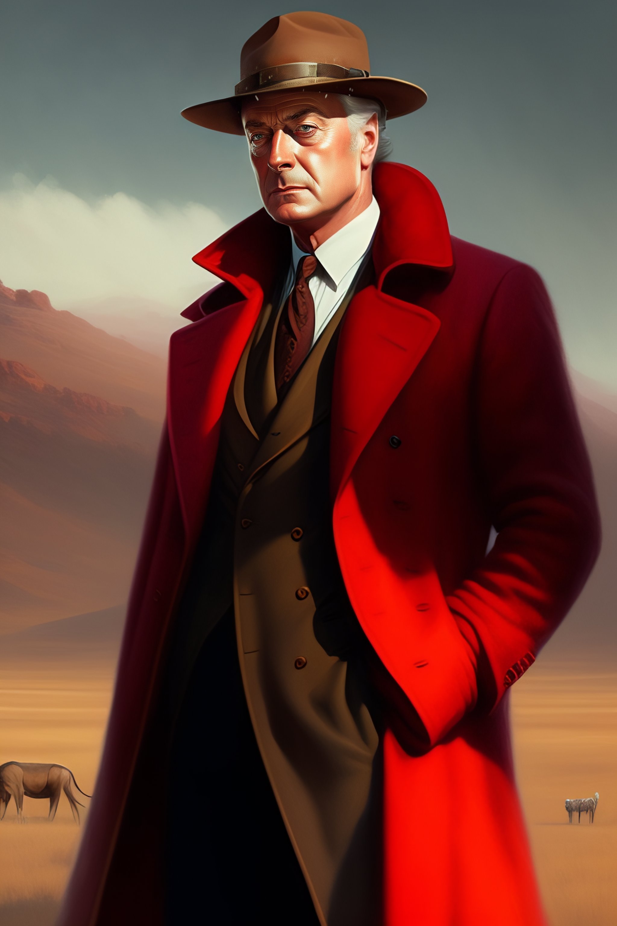 30s michael caine with red coat and a safari hat drawn by greg rutkowski