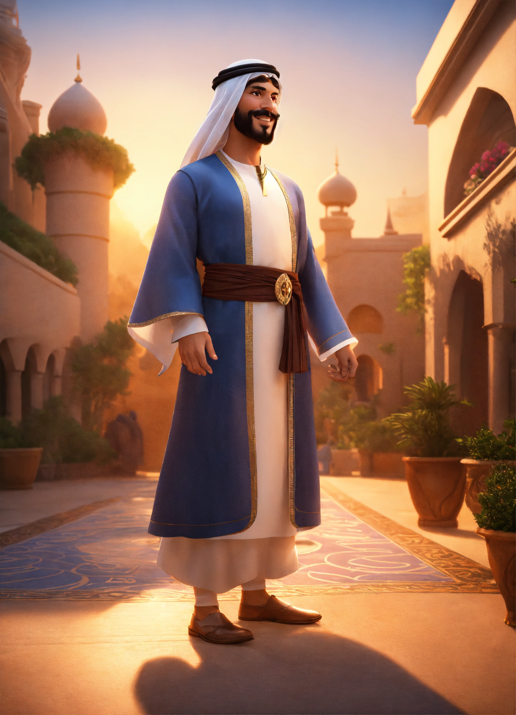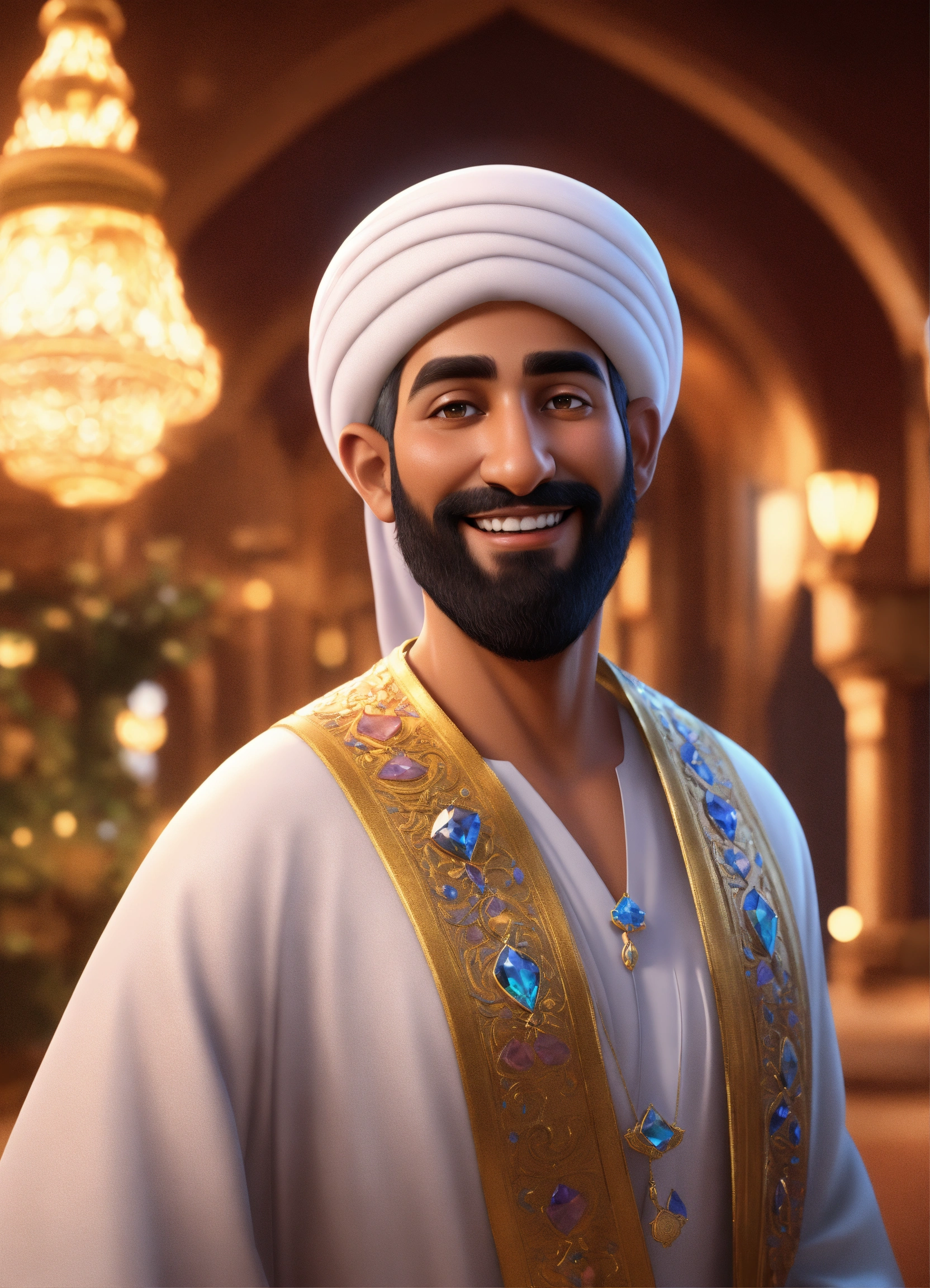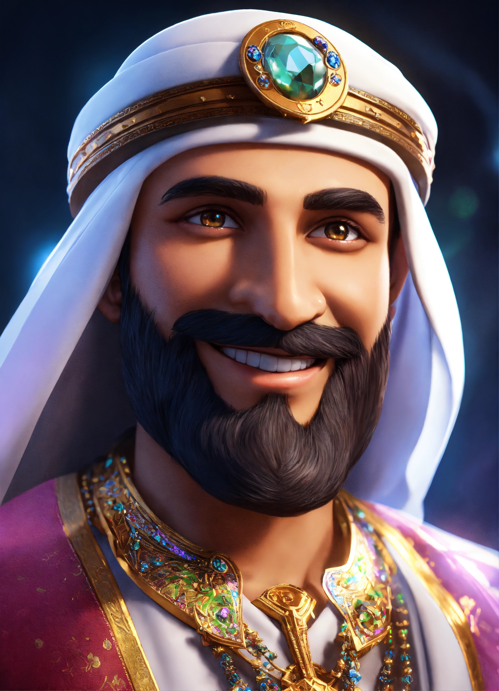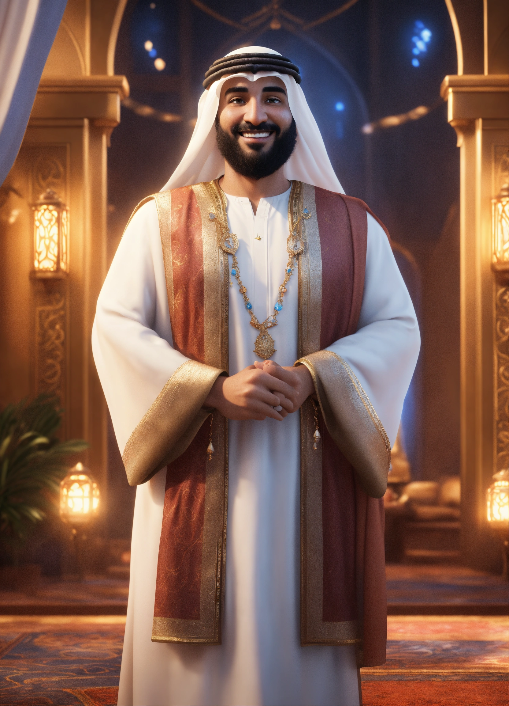 Create a 3d rendering of a wealthy arab sheikh from dubai, inspired by the disney animation style. the sheikh must have a smile and a playful but wise character, he is triumphant. place your character in an atmosphere of wealth and luxury. the image must be in high resolution format. thumbs up - he shows like (pixar art style)++ highly detailed digital painting, art stations, concept art, soft focus, hard focus, illustrations. cinematic, visual effects, hdr, unreal engine 5, ray tracing, soft light, 8k, high detail, sparkling backlighting, luxury gem, game art, 3d, cartoon, colorful, magical, mysterious