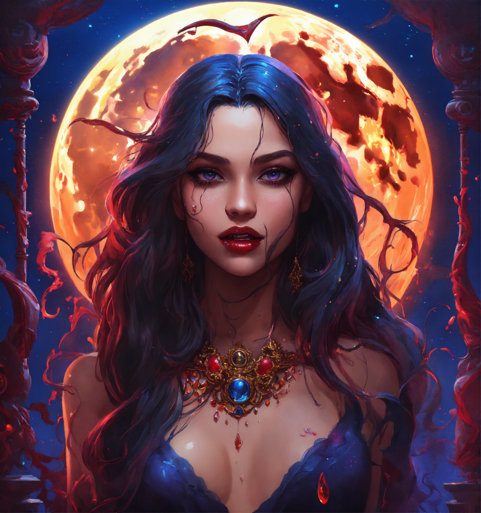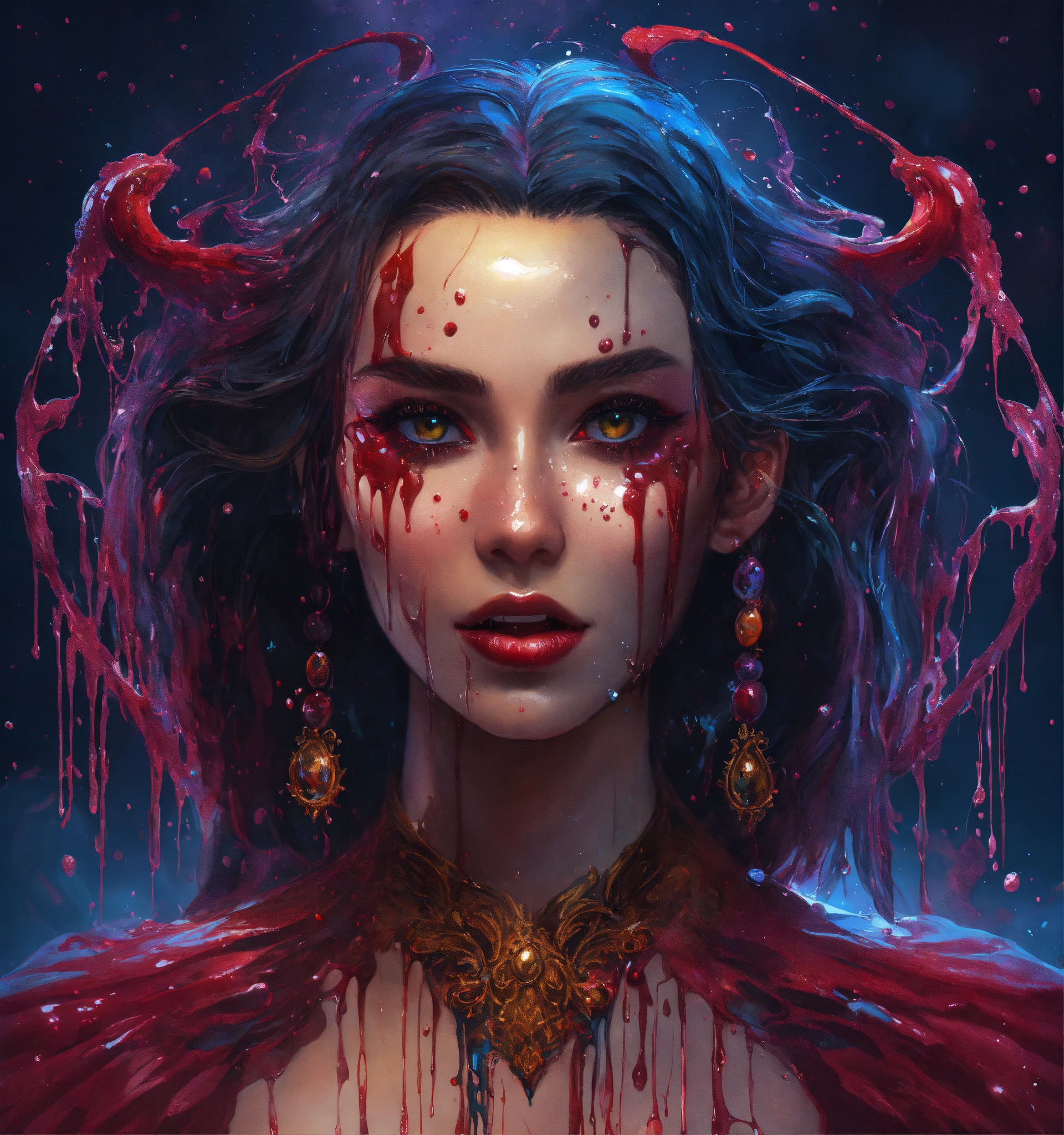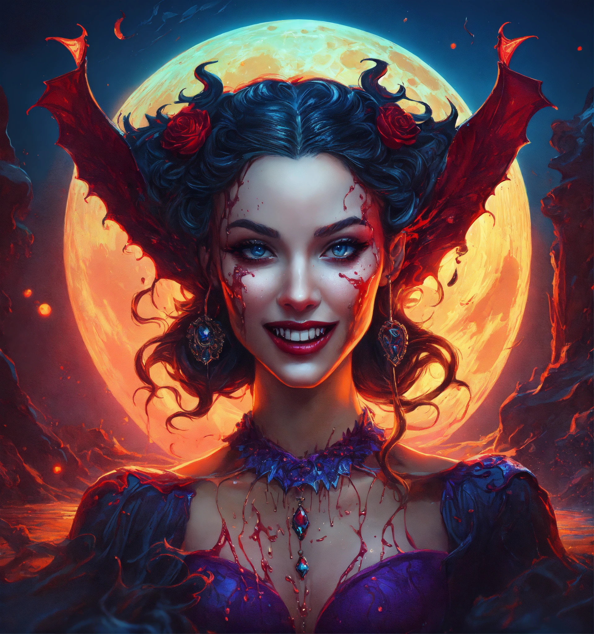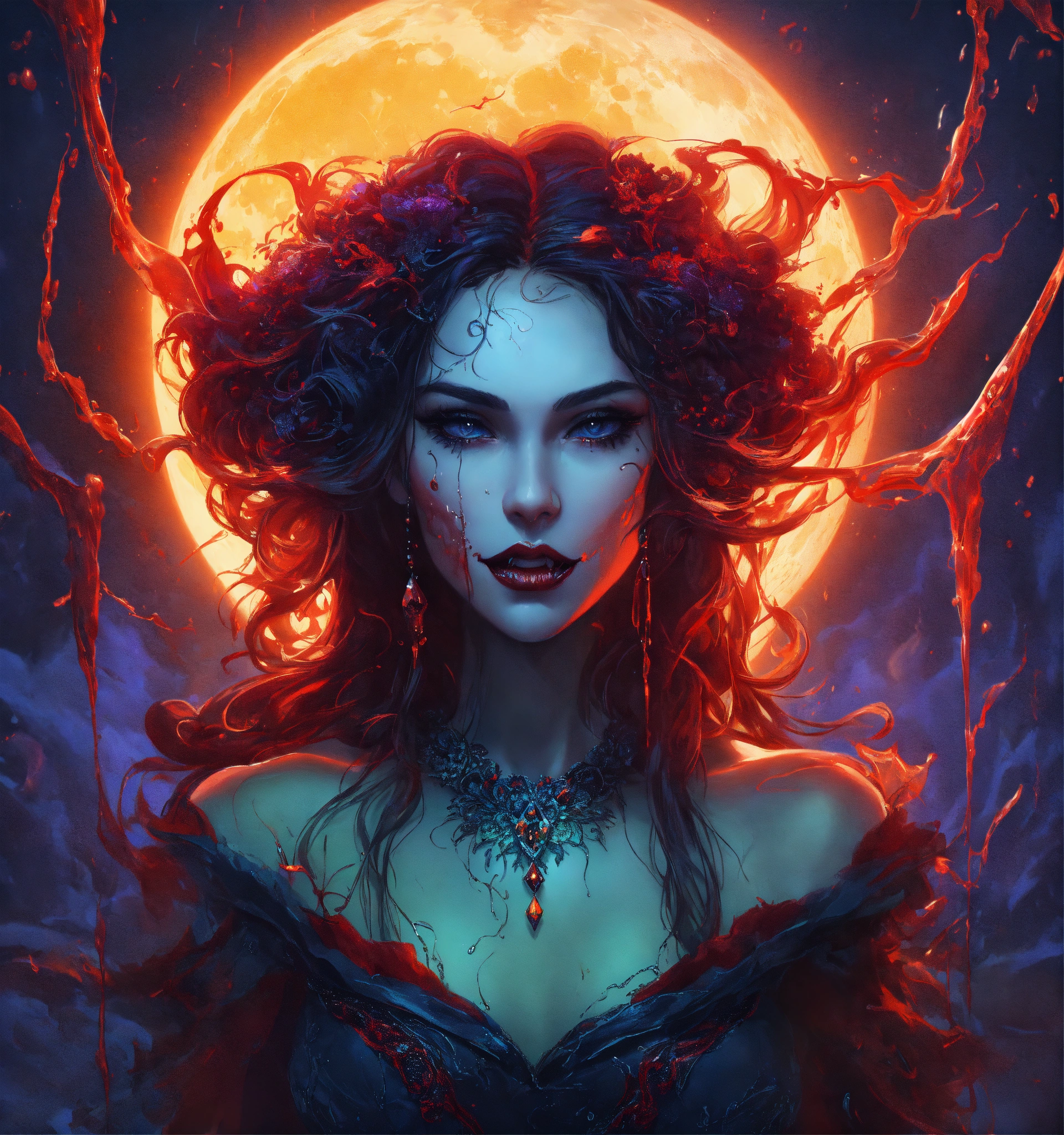 Splash art, a quirky liquid portrait of a hauntingly beautiful vampire woman with fangs, splash style of paint, pixar style, halloween colors, hyper detailed intricately detailed, fantastical, intricate detail, splash screen, liquid, gooey, slime, splashy, fantasy, concept art, 8k resolution, masterpiece, melting, complex background, intricate detailed, dark colors, fantasy, concept art, digital art, intricate, oil on canvas, masterpiece, expert, insanely detailed, 8k resolution. full moon background at night