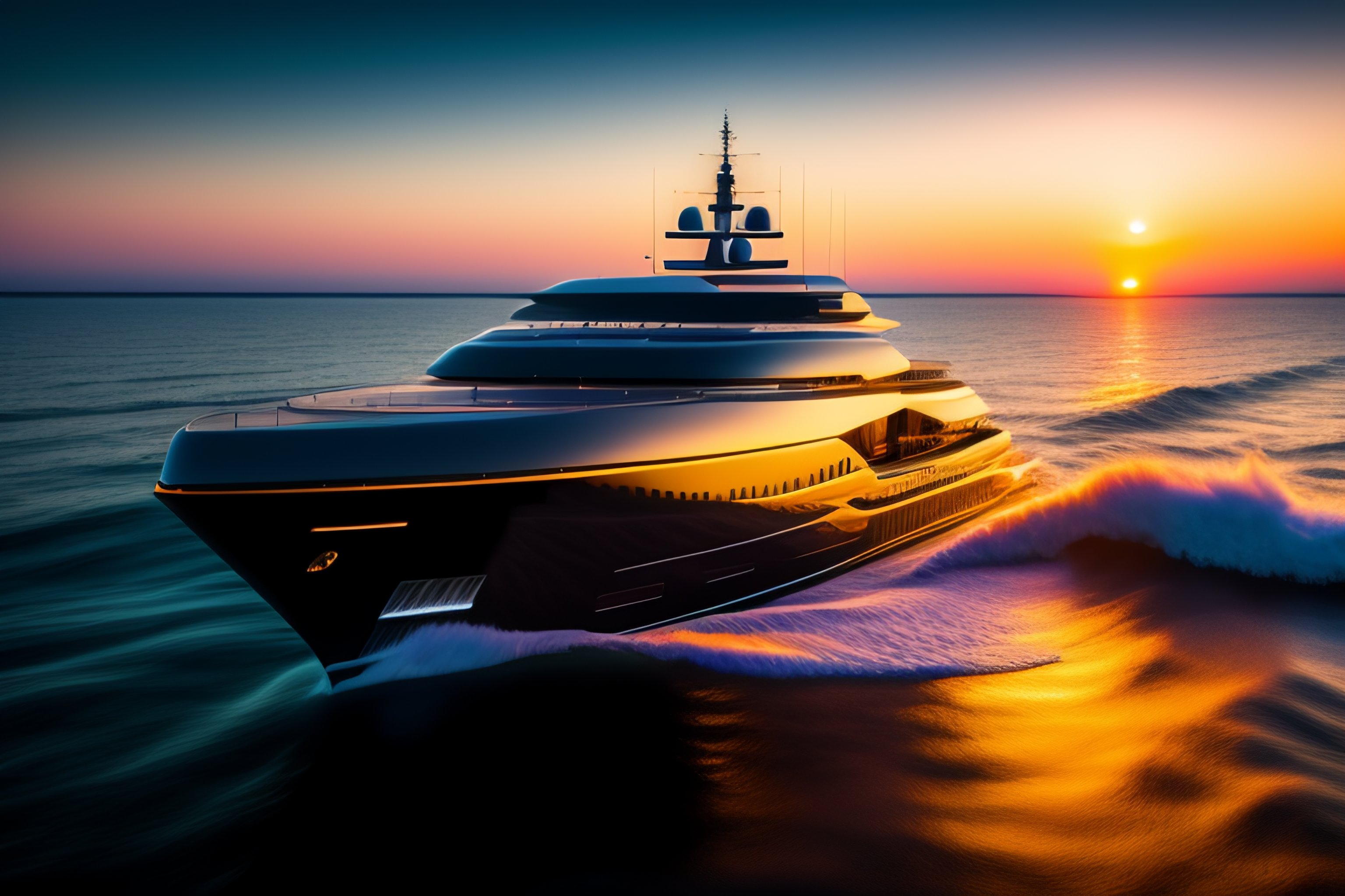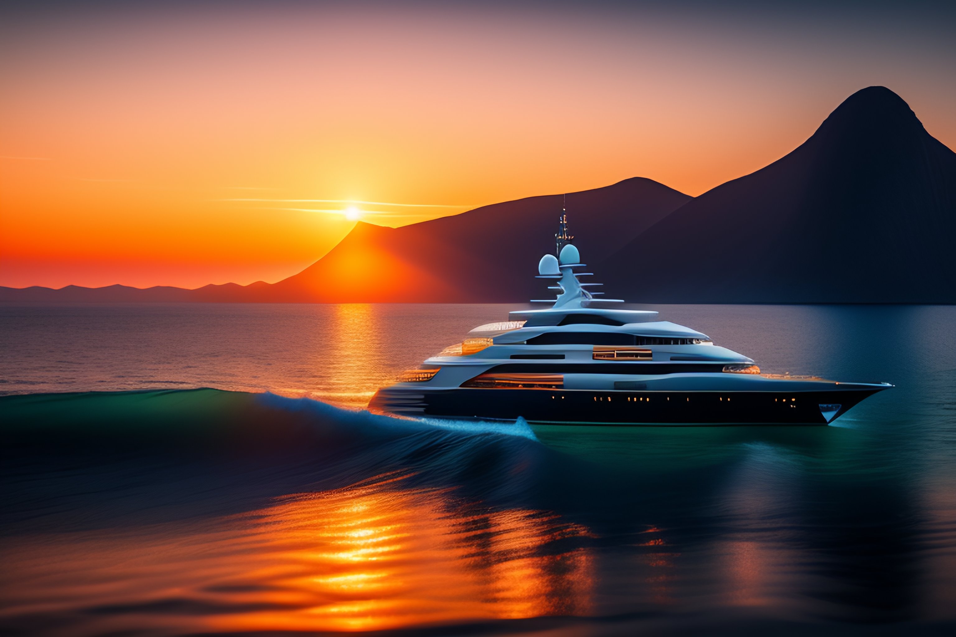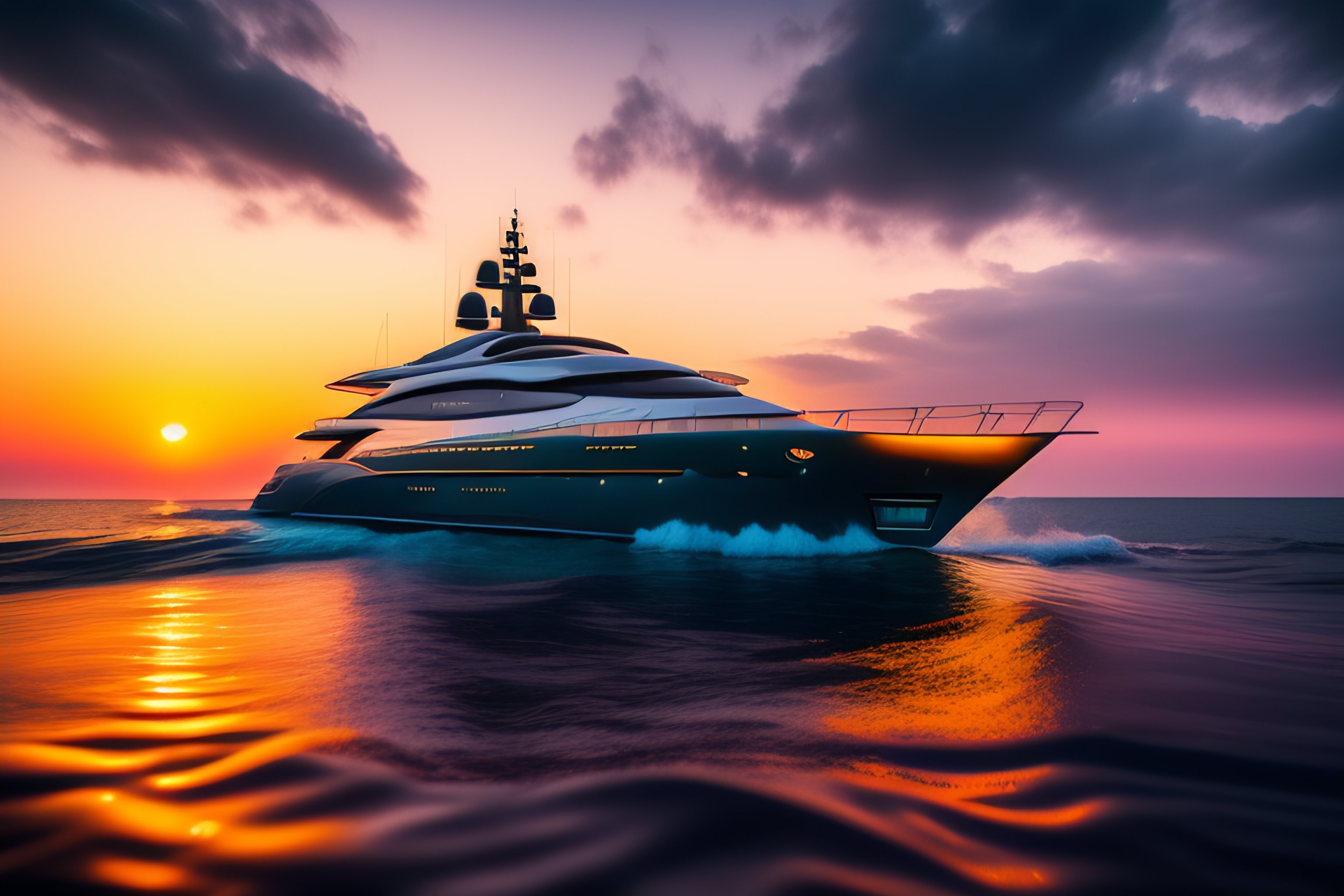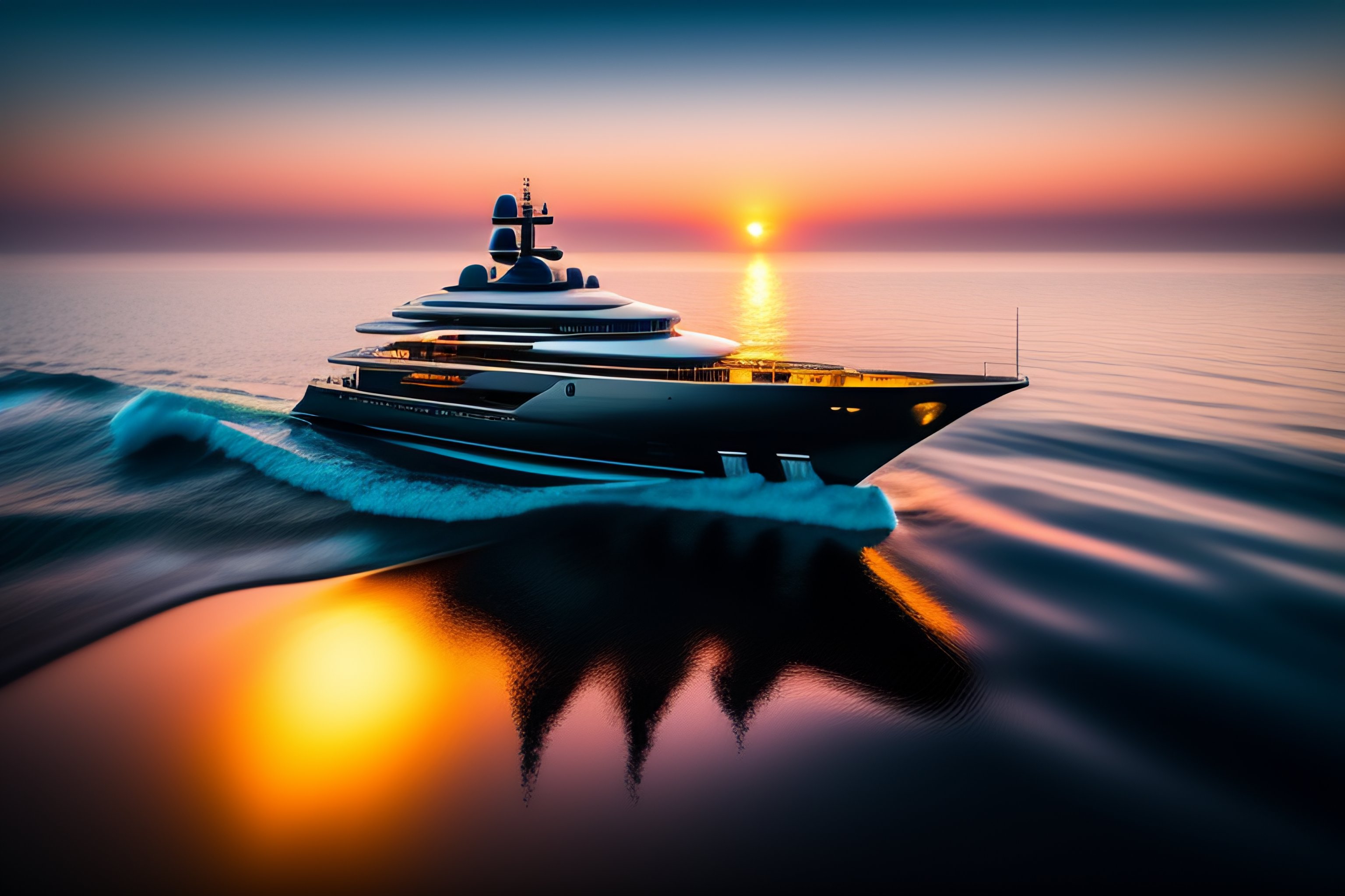 4 k hd, high detail photograph of a luxury yacht in the sea at sunrise, shot with sigma f / 4. 2, 2 5 0 mm sharp lens, wide shot, isometric view, volumetric lighting, reflection, high level texture render, professional photography