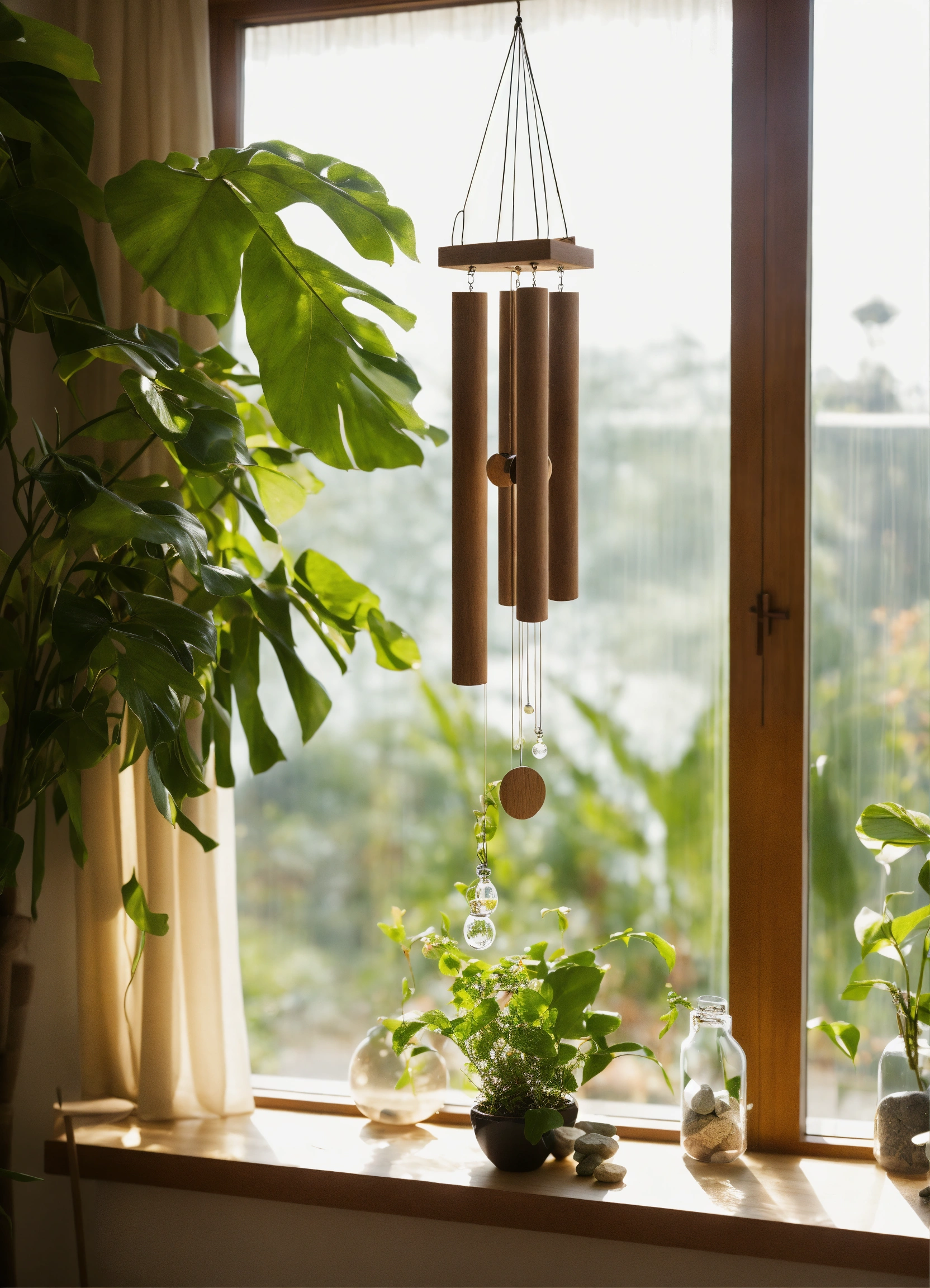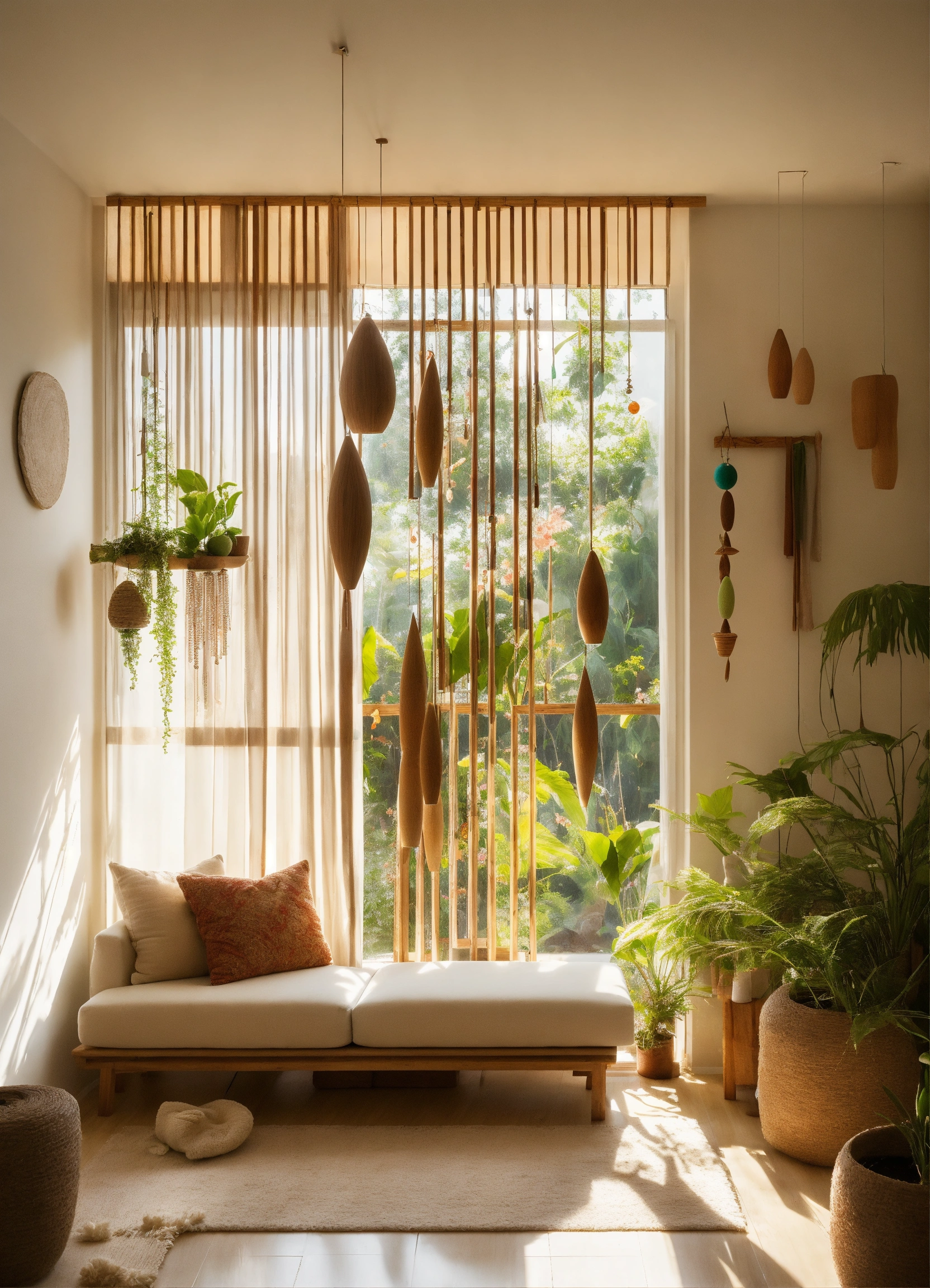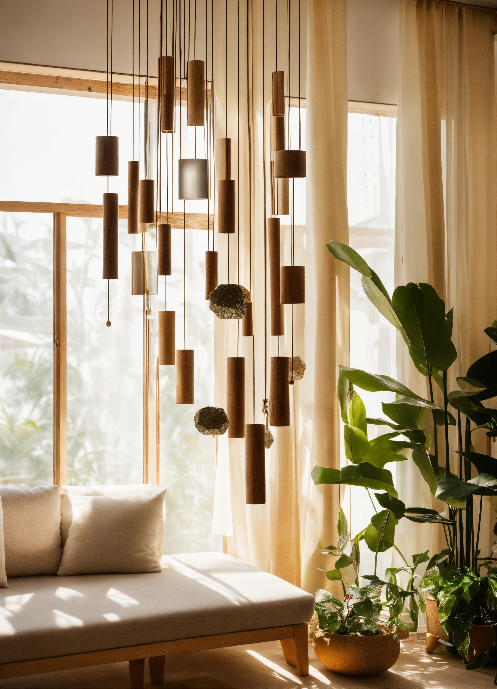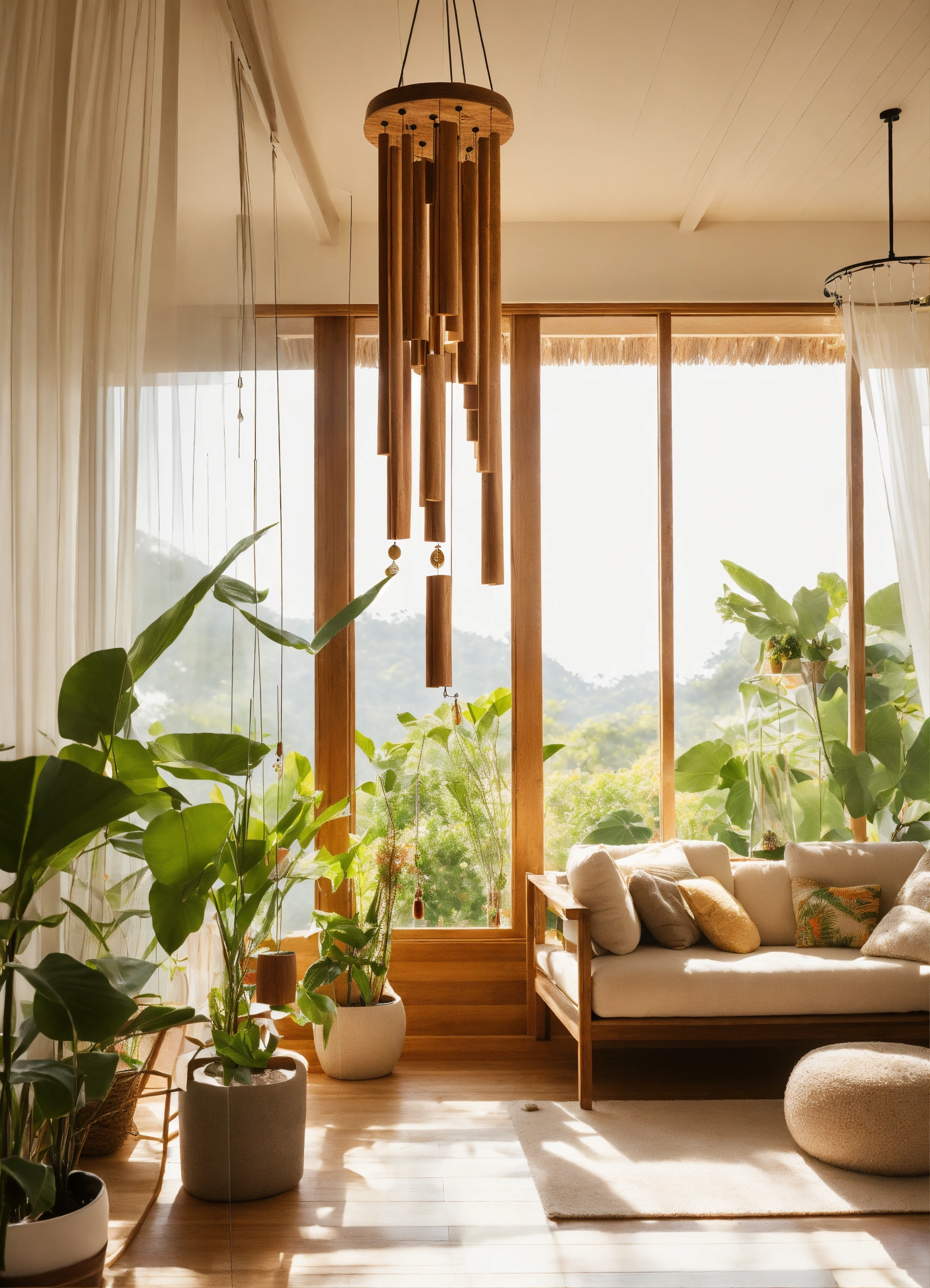 Wooden small wind chimes, living room, window, cozy room, wind, tropical plants, light colours, lots of light, garden view, peaceful sunlight coming in, minimalist, meditation, crystal stones, off white walls modern glazing, transparent curtain moving