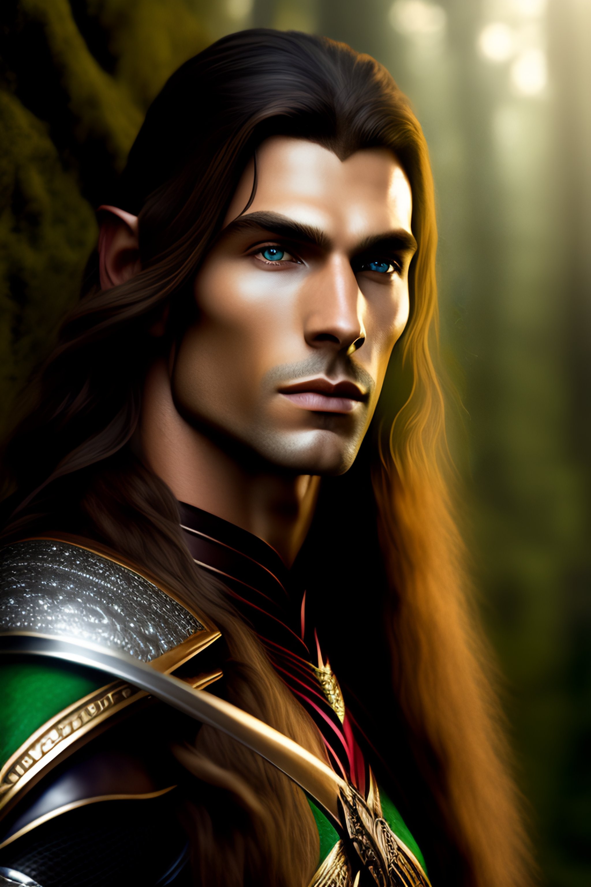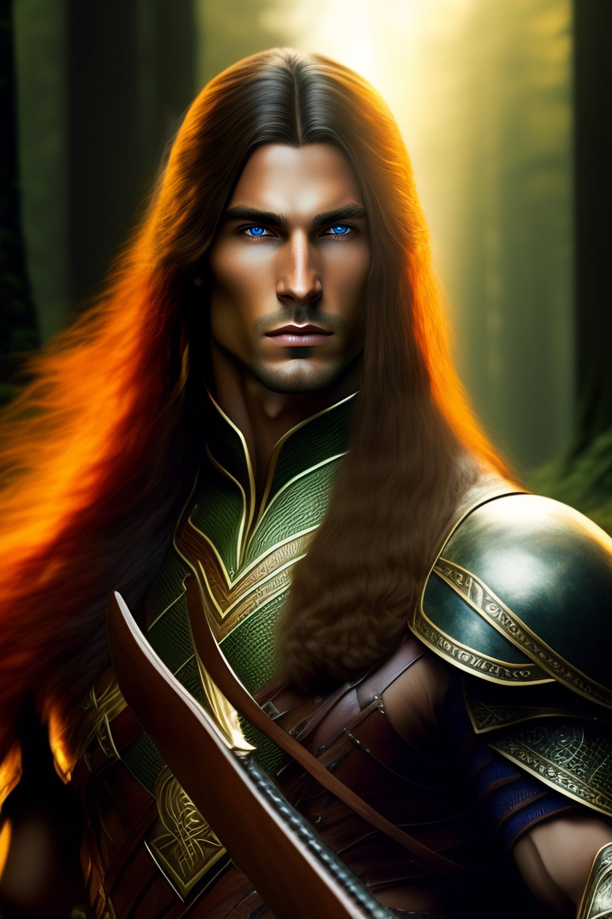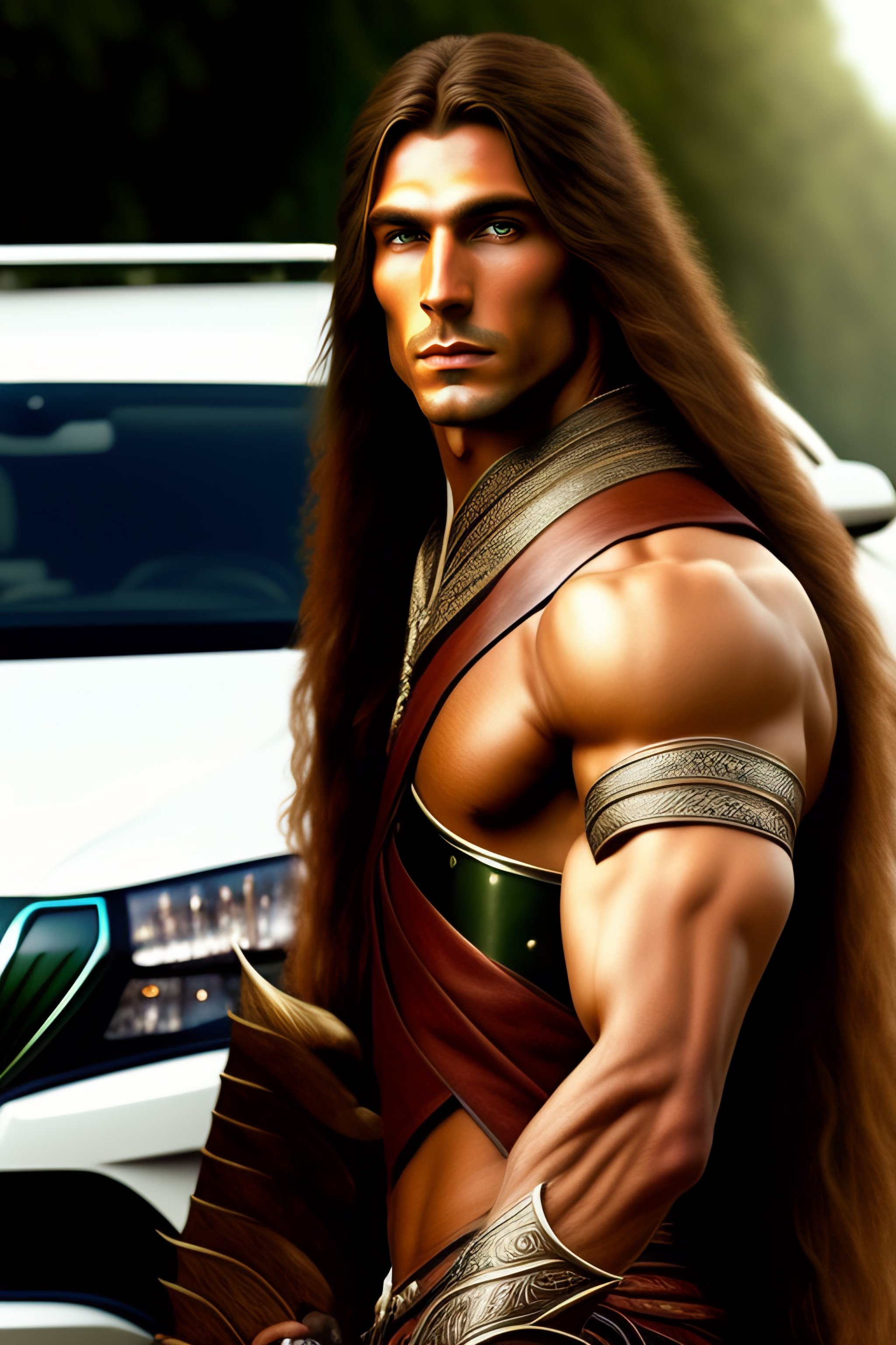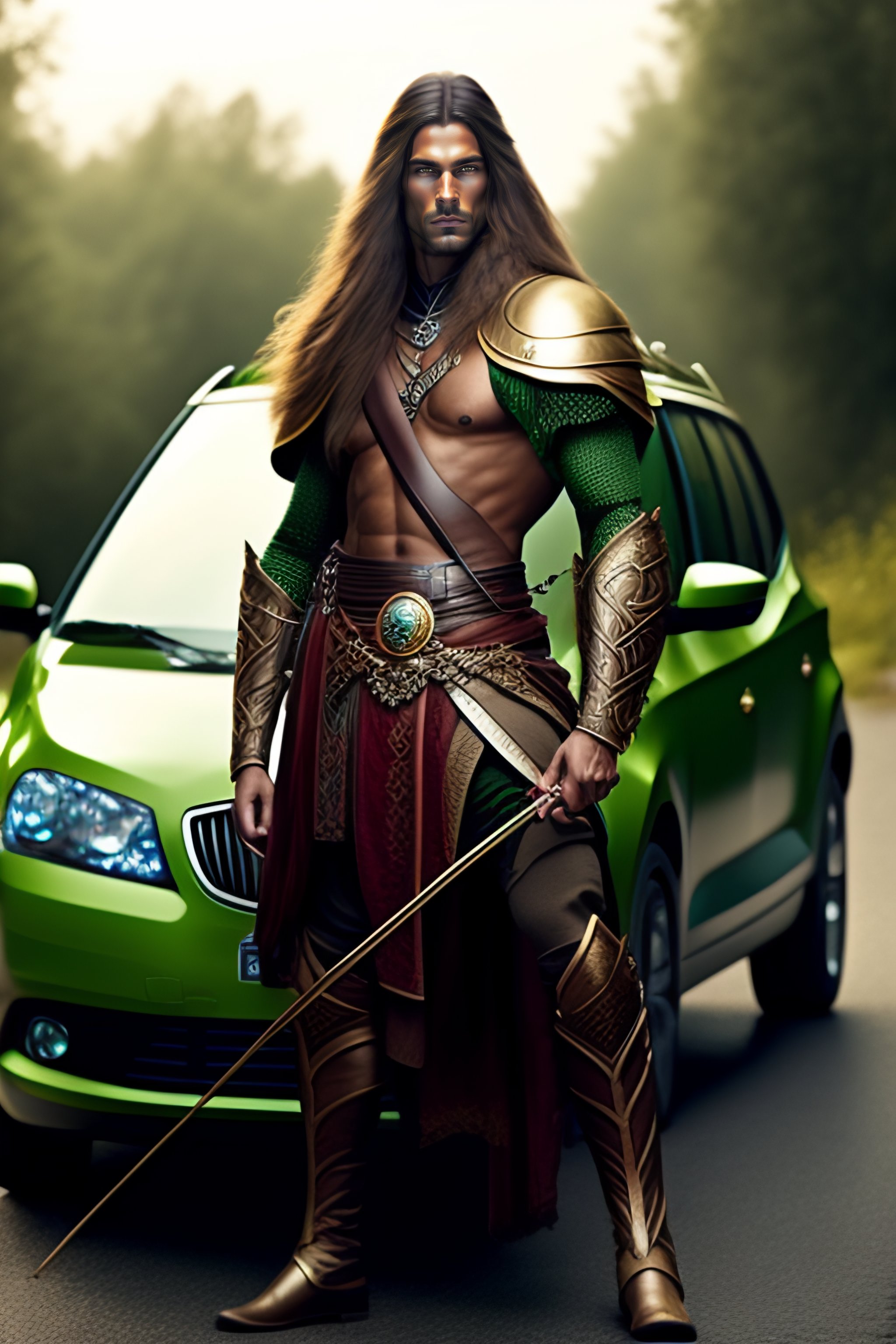 Male slender muscular elven ranger with long hair in front of a skoda fabia, holding a bow, leather armor