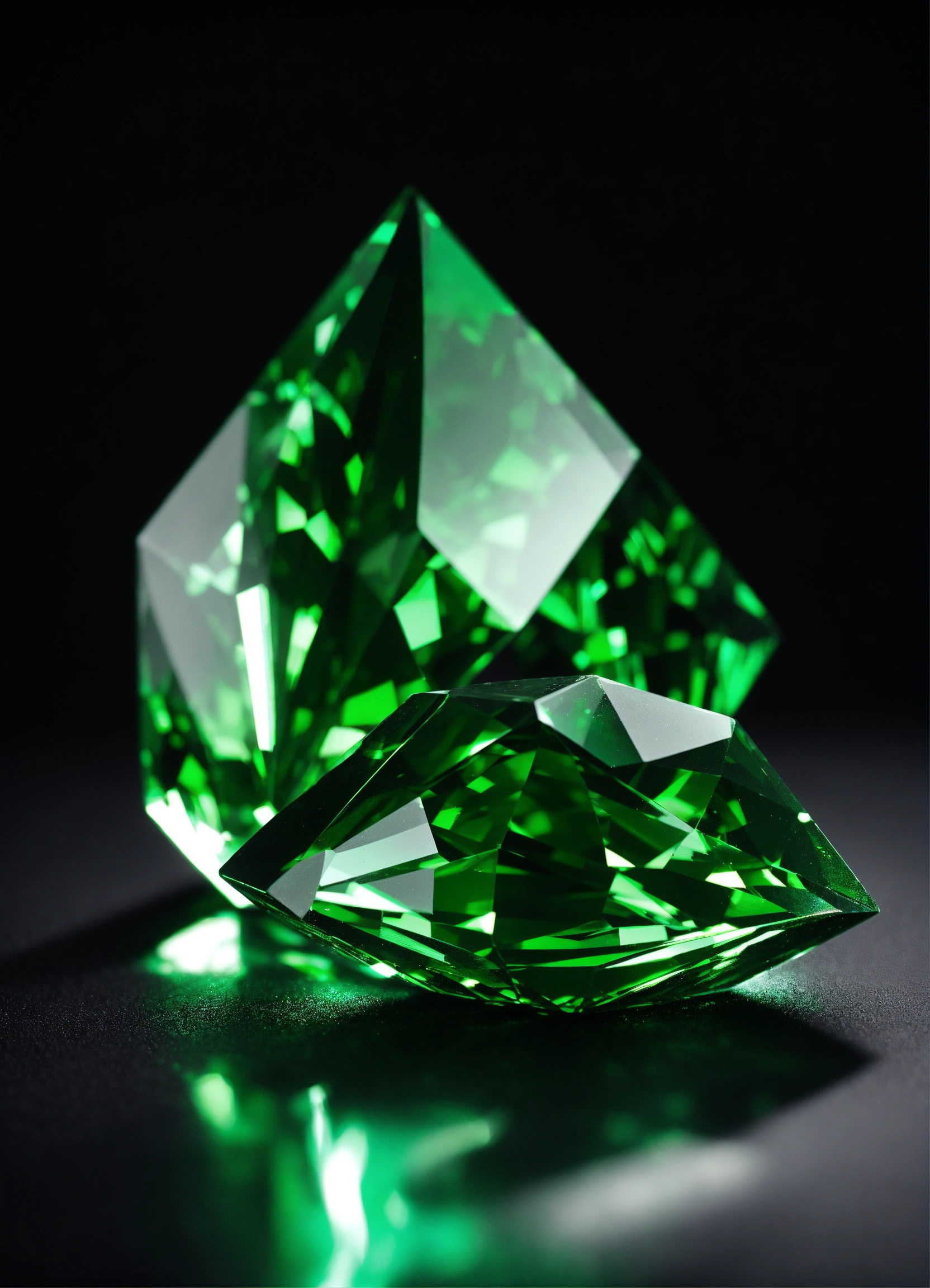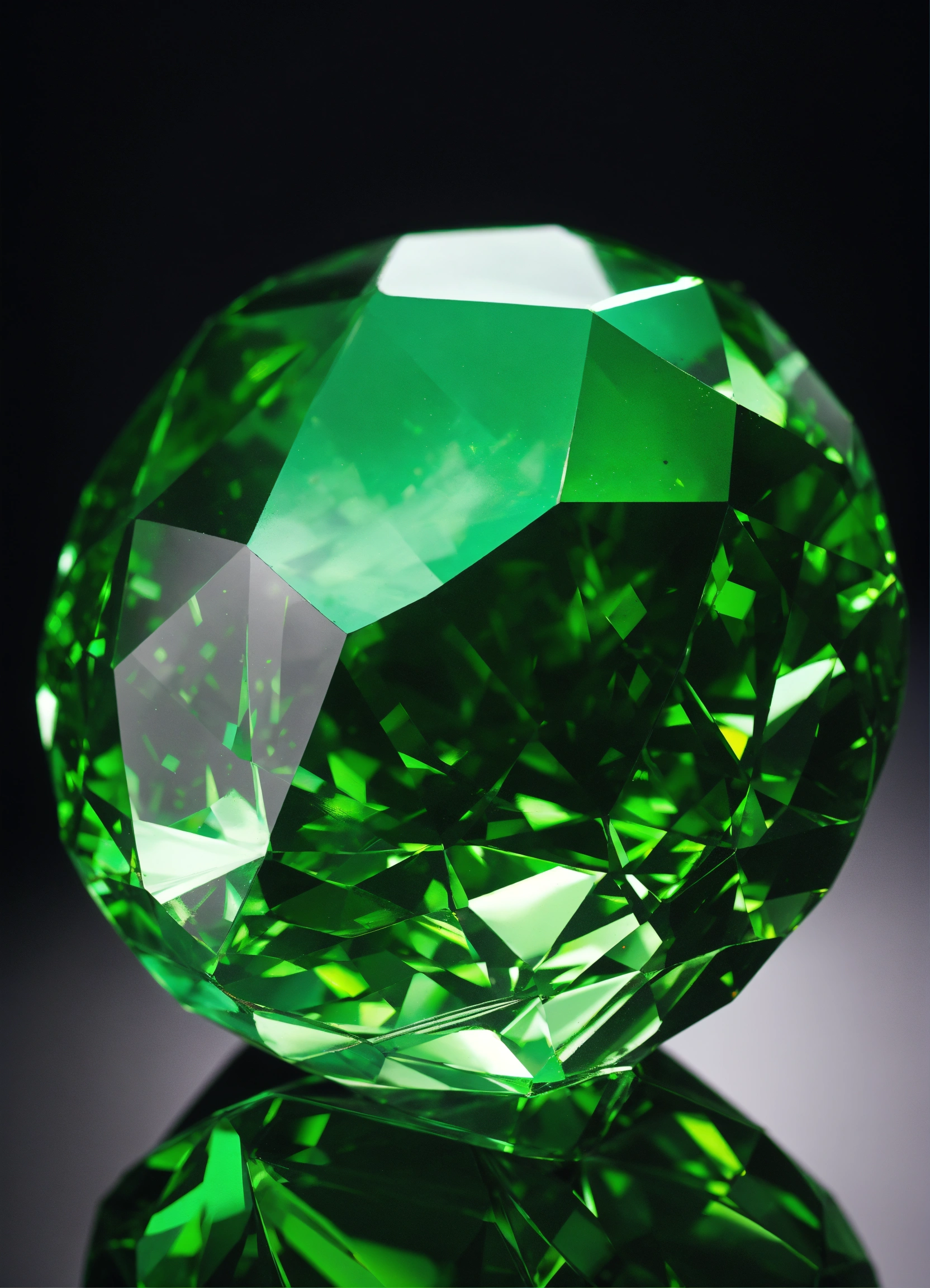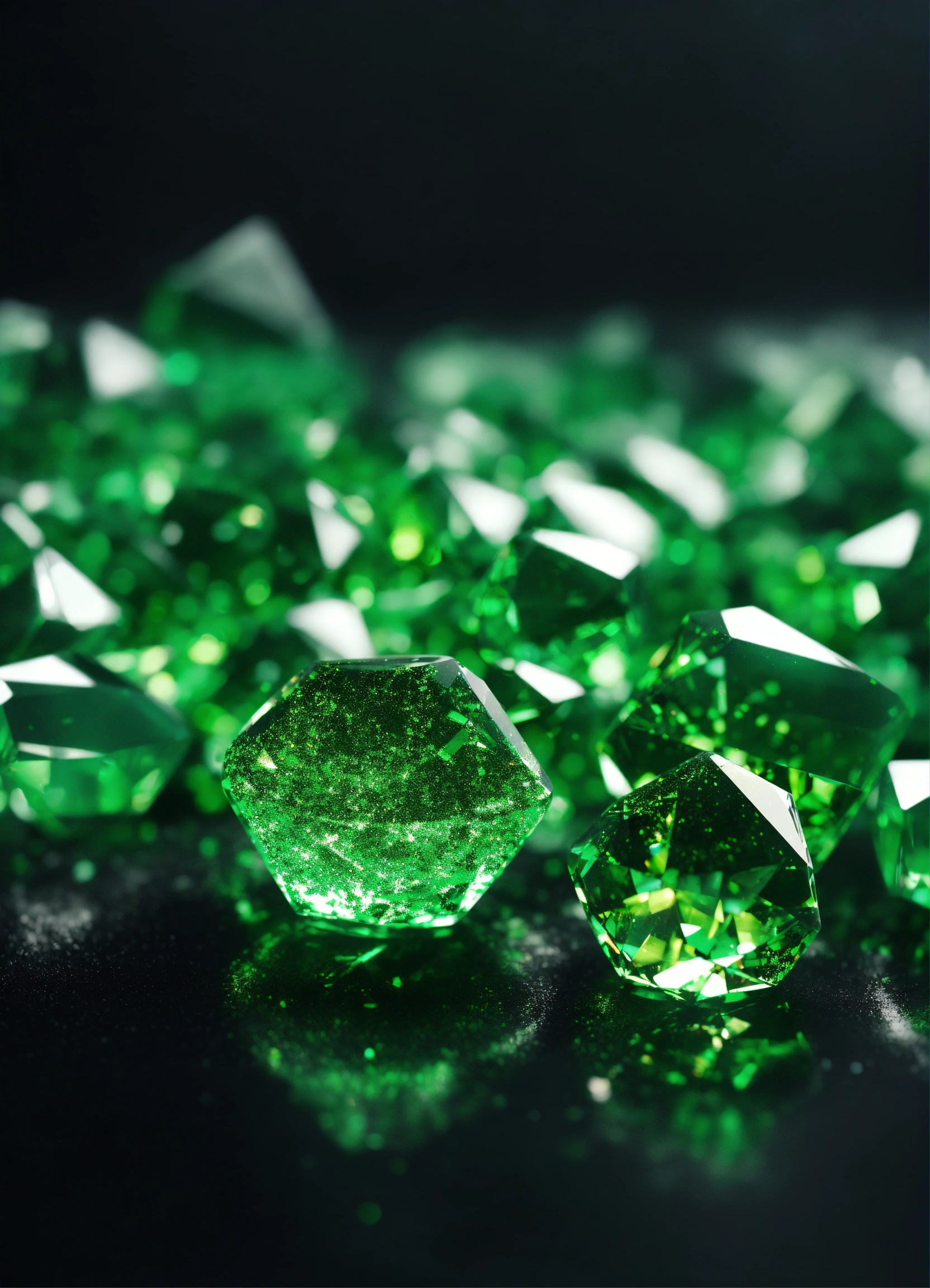 Hyper realistic green opaque sparkling crystals in air with light reflecting on water with black background minimalist