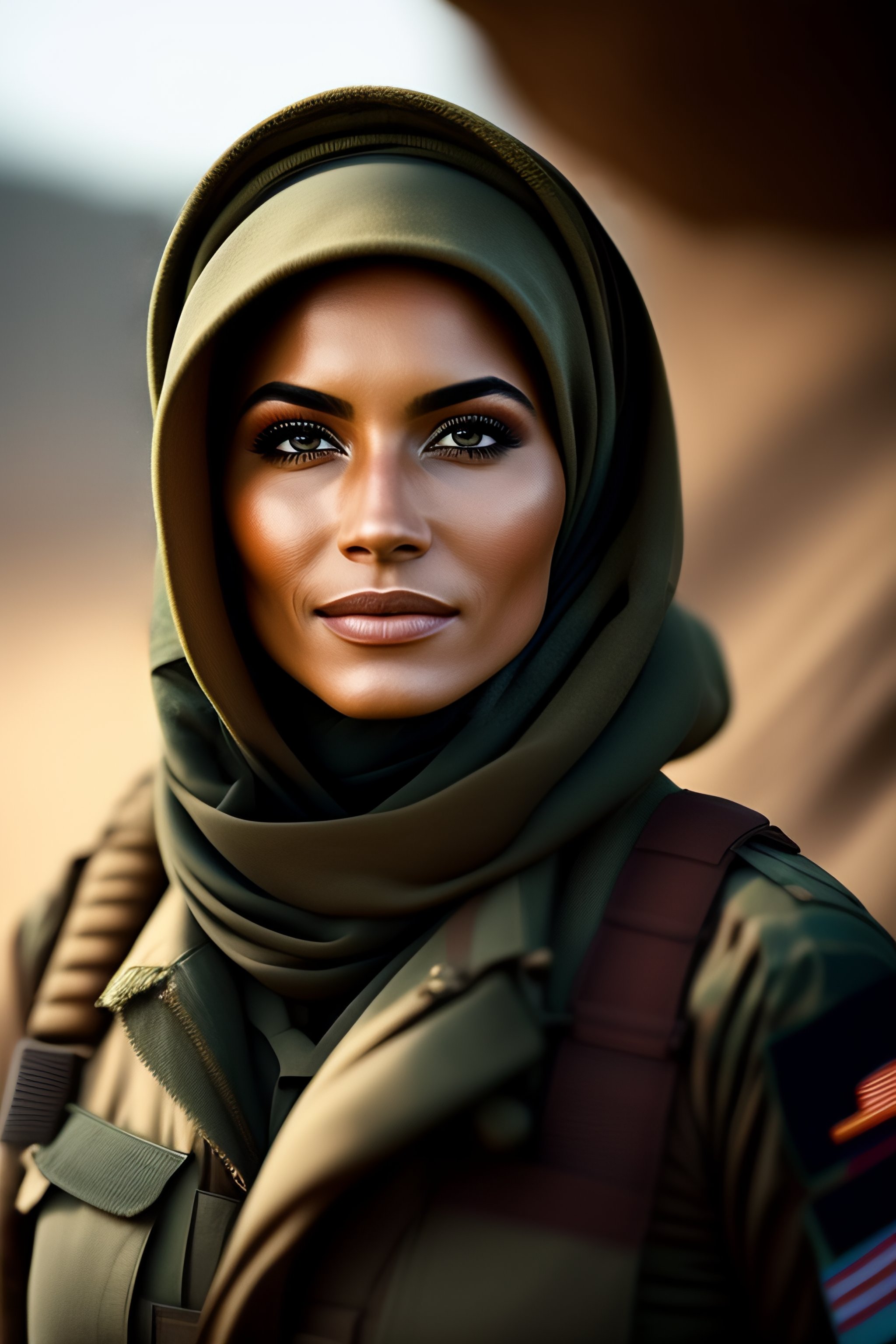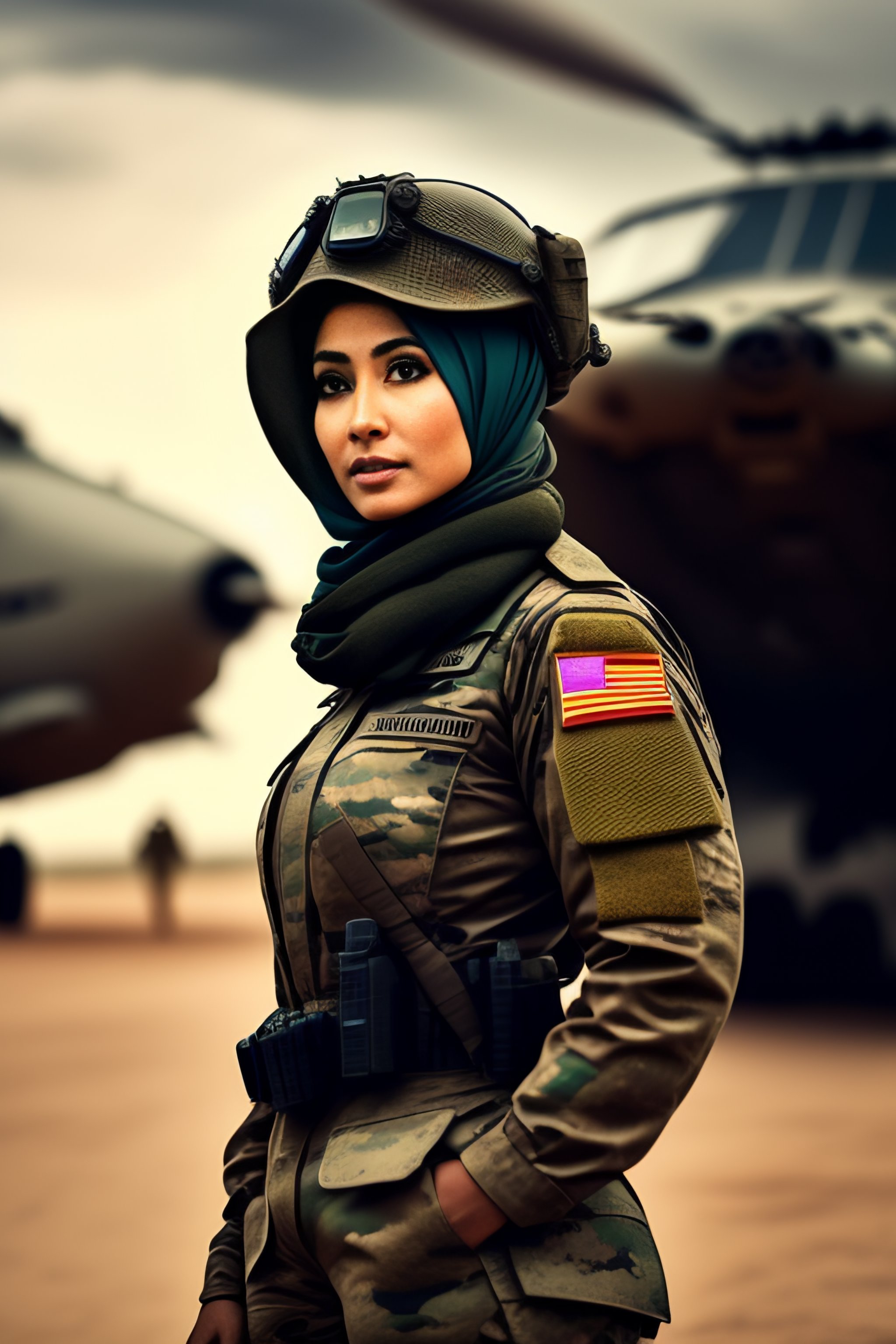 A beautiful military woman wearing hijab in war