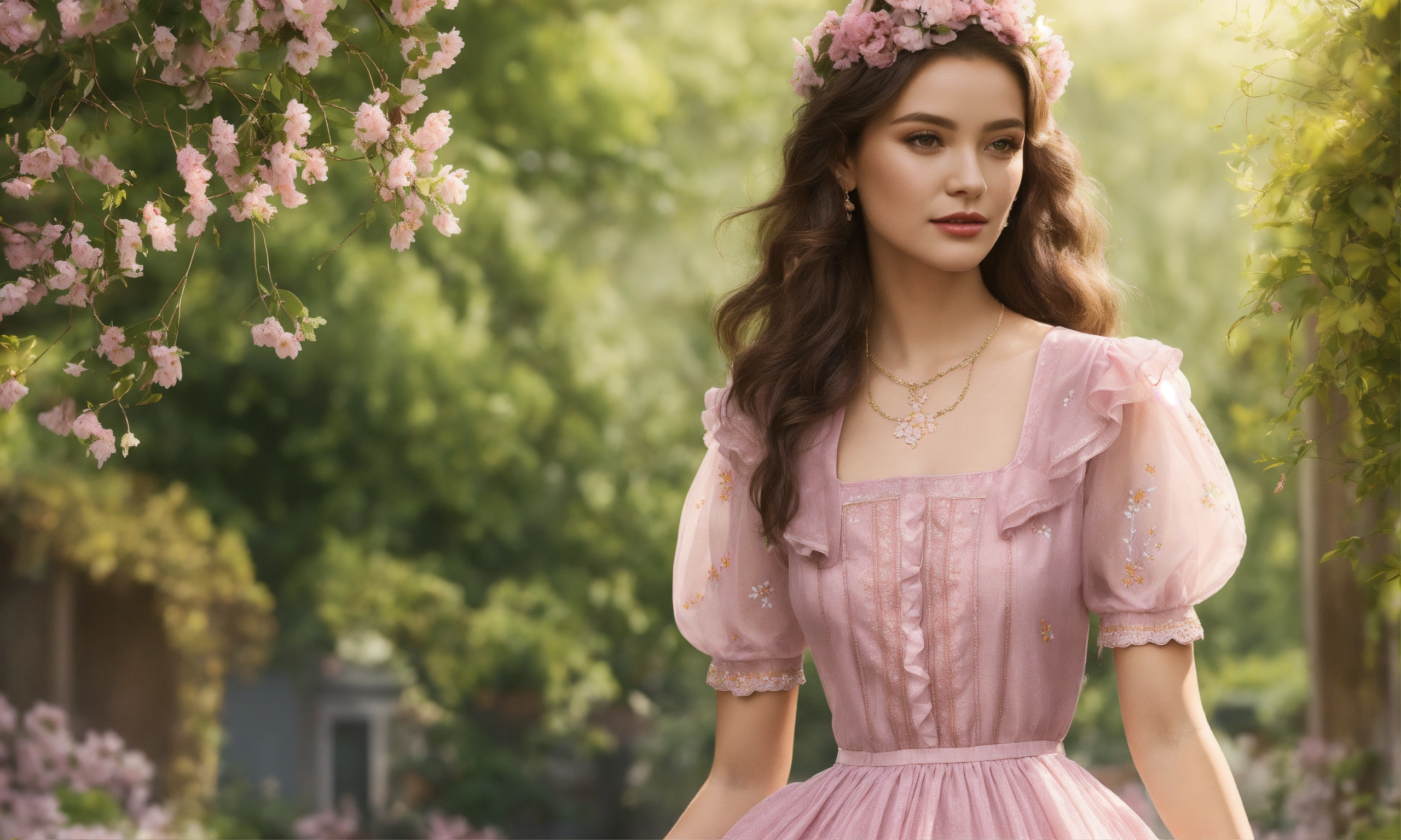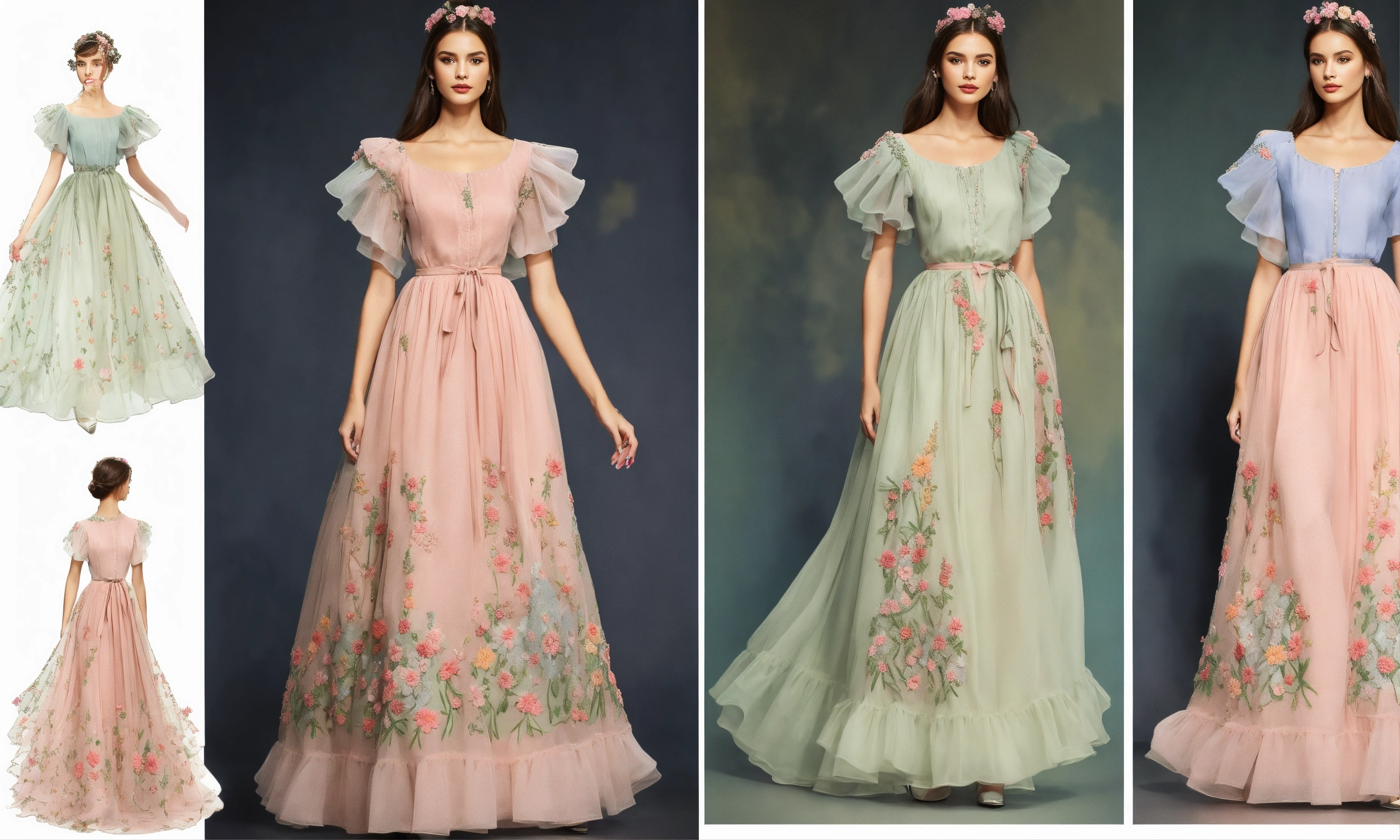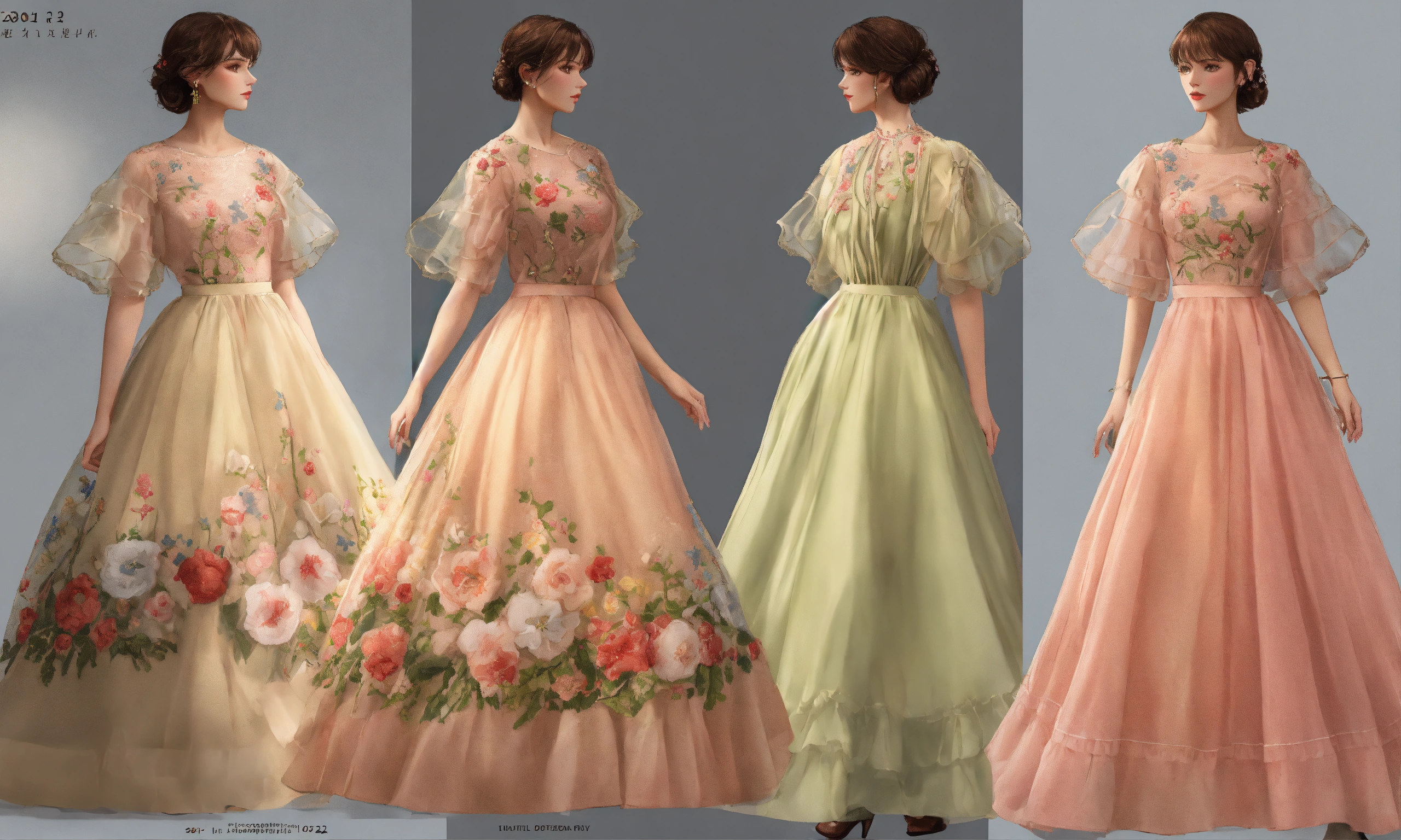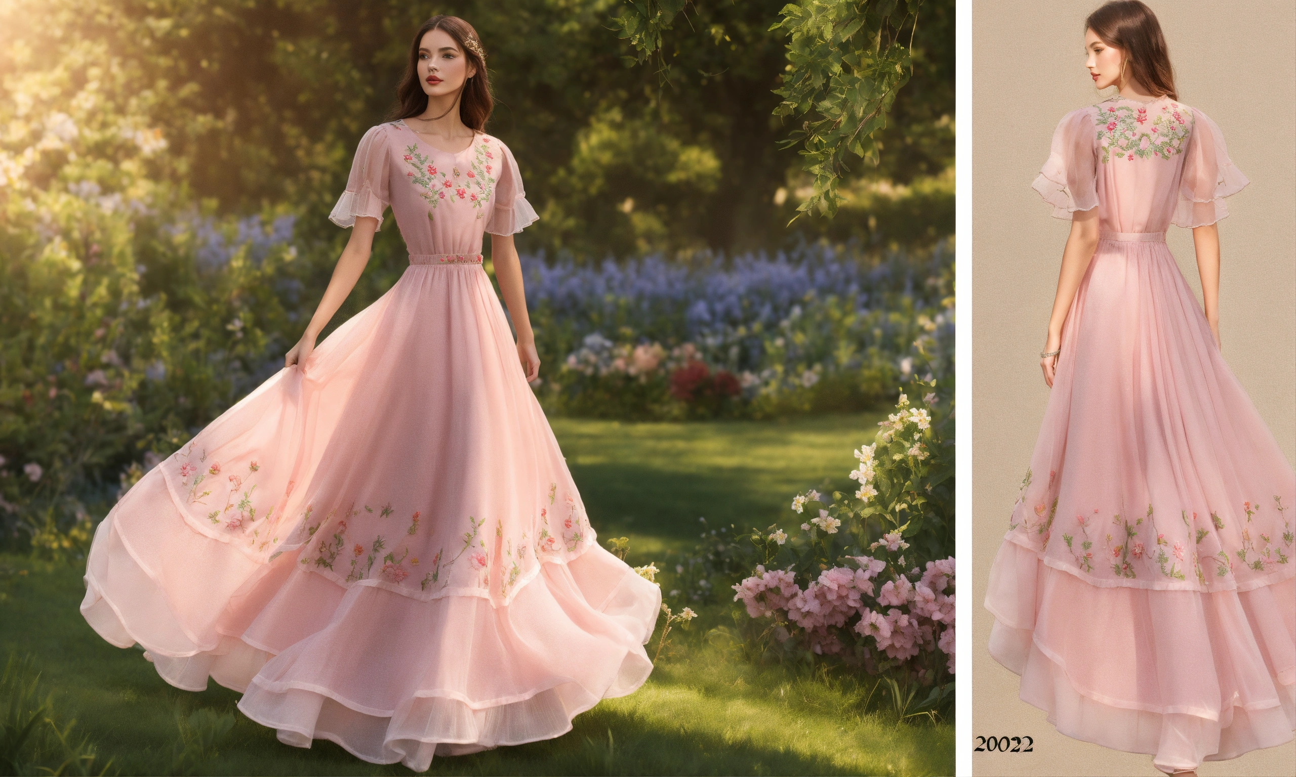 Illustrate a pretty spring dress with short embroidered sleeves and a flowy skirt. illustrate dress with organdy, embroidery, and ruffles. 2023 fashion. photorealistic full-length. fashion plate
