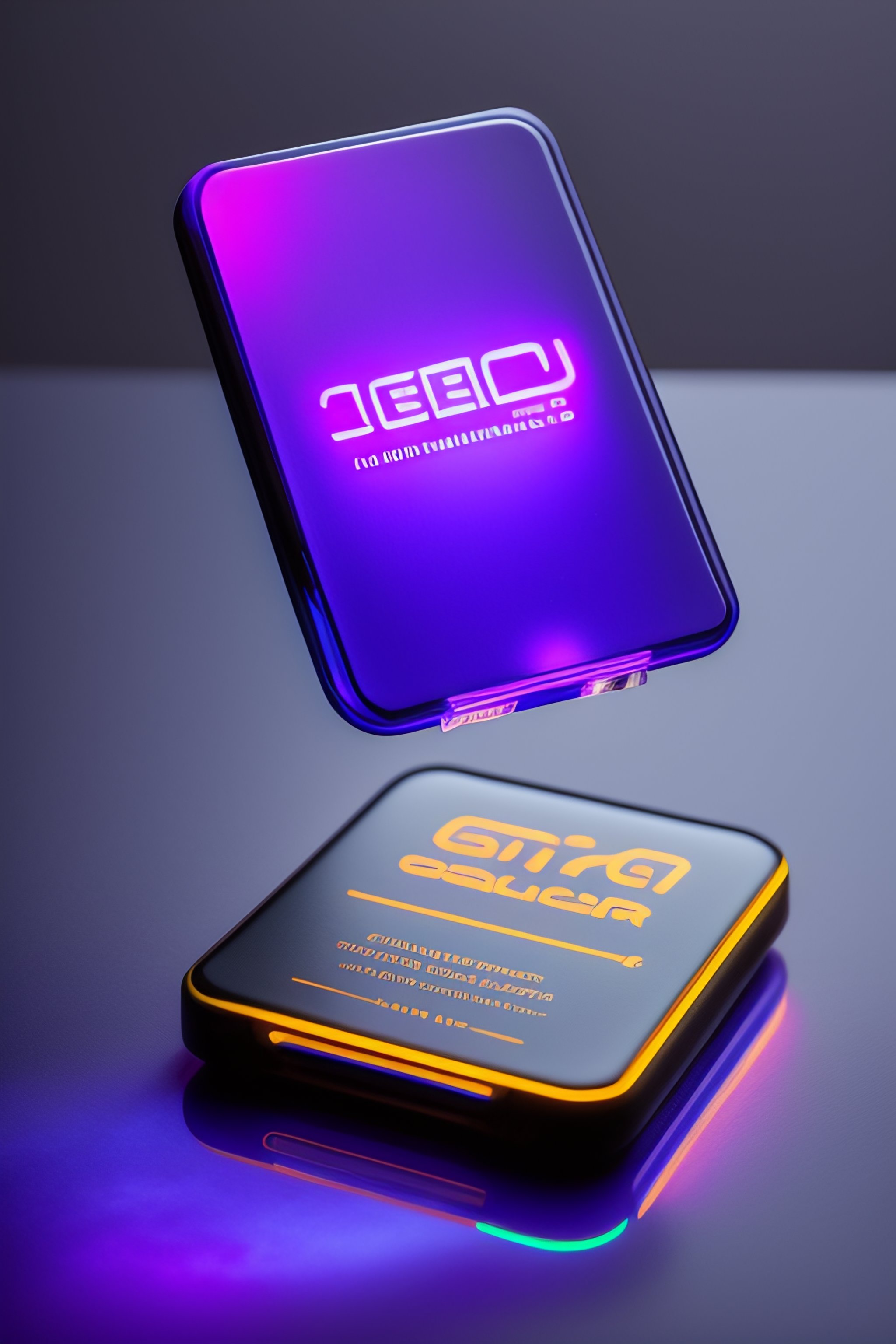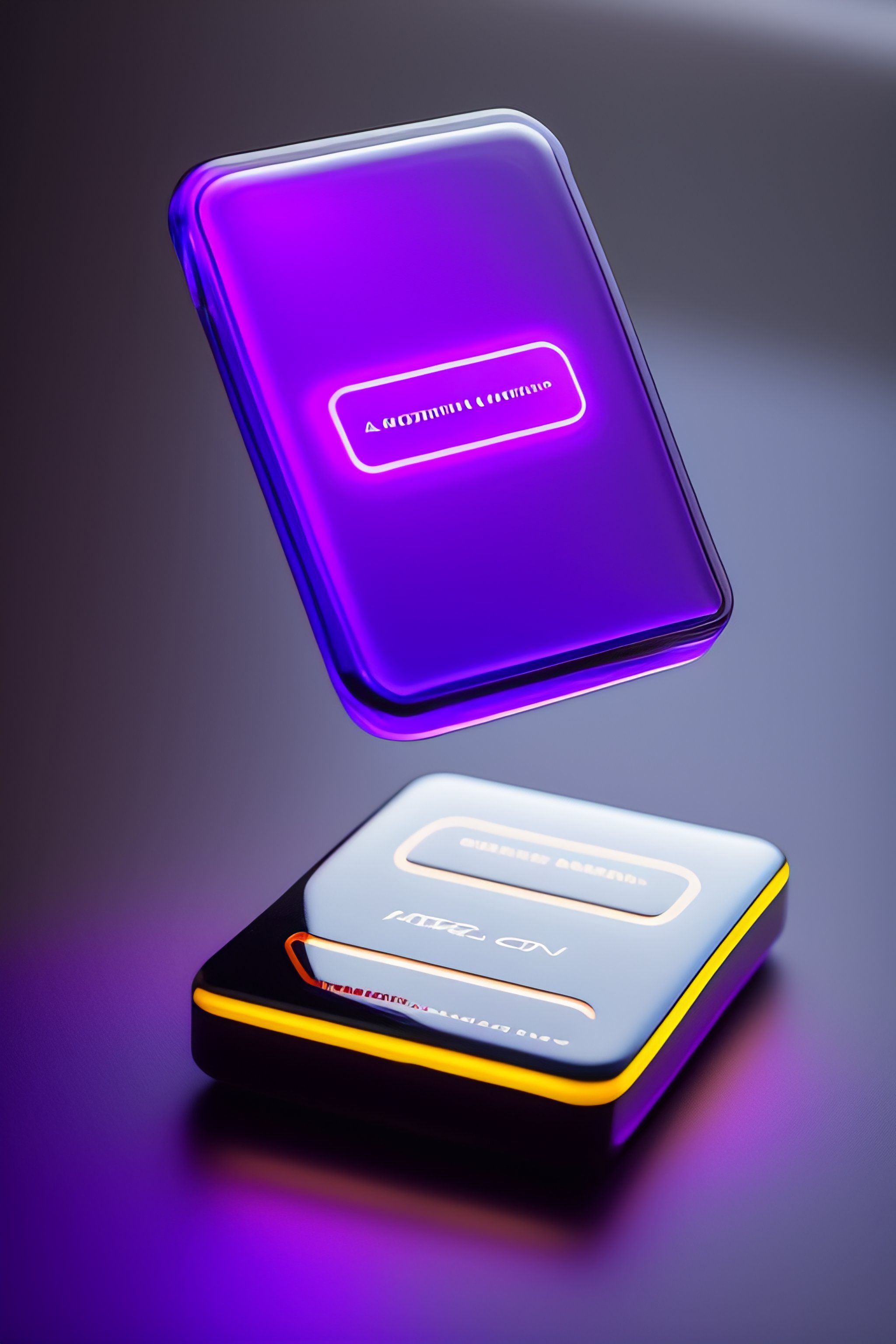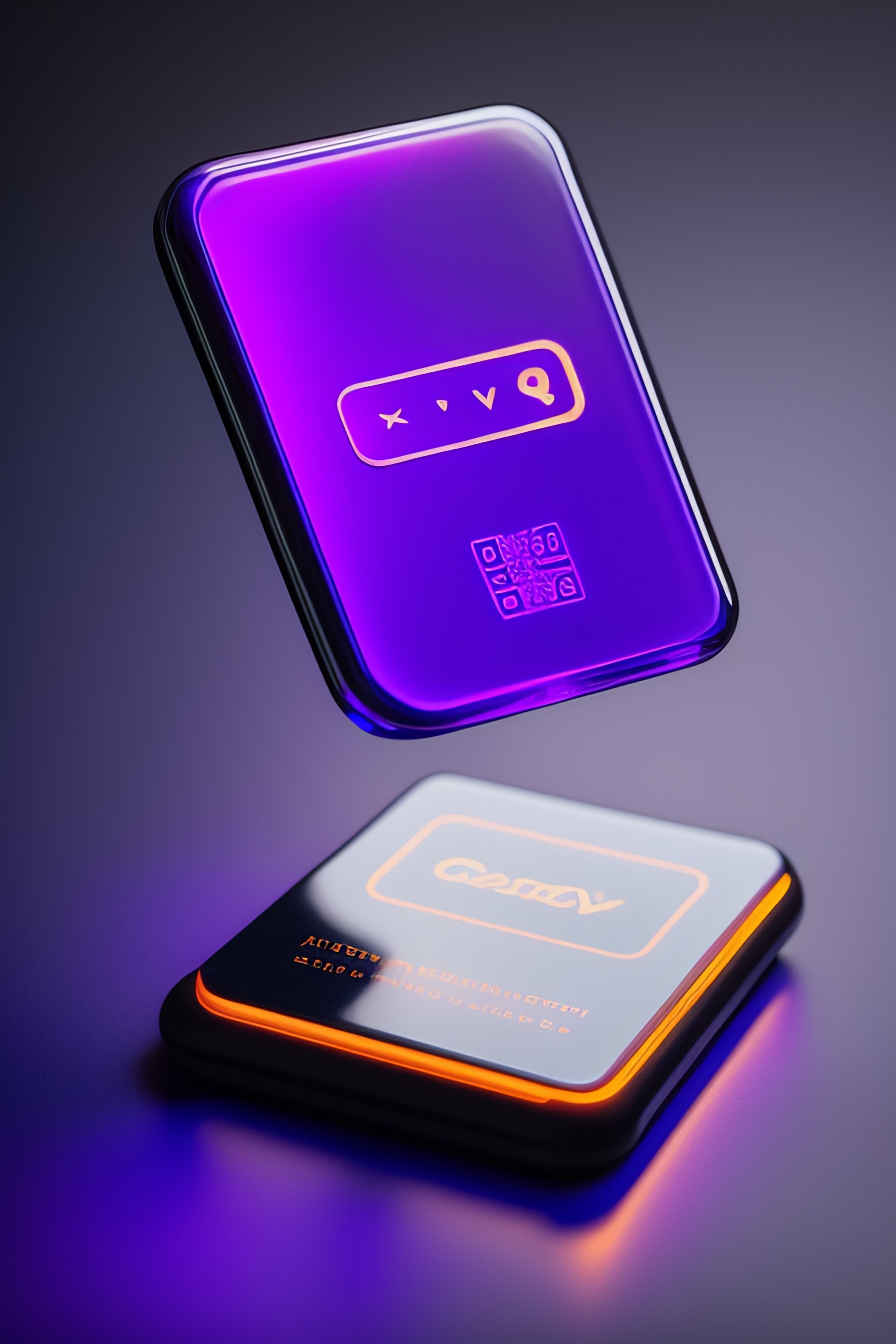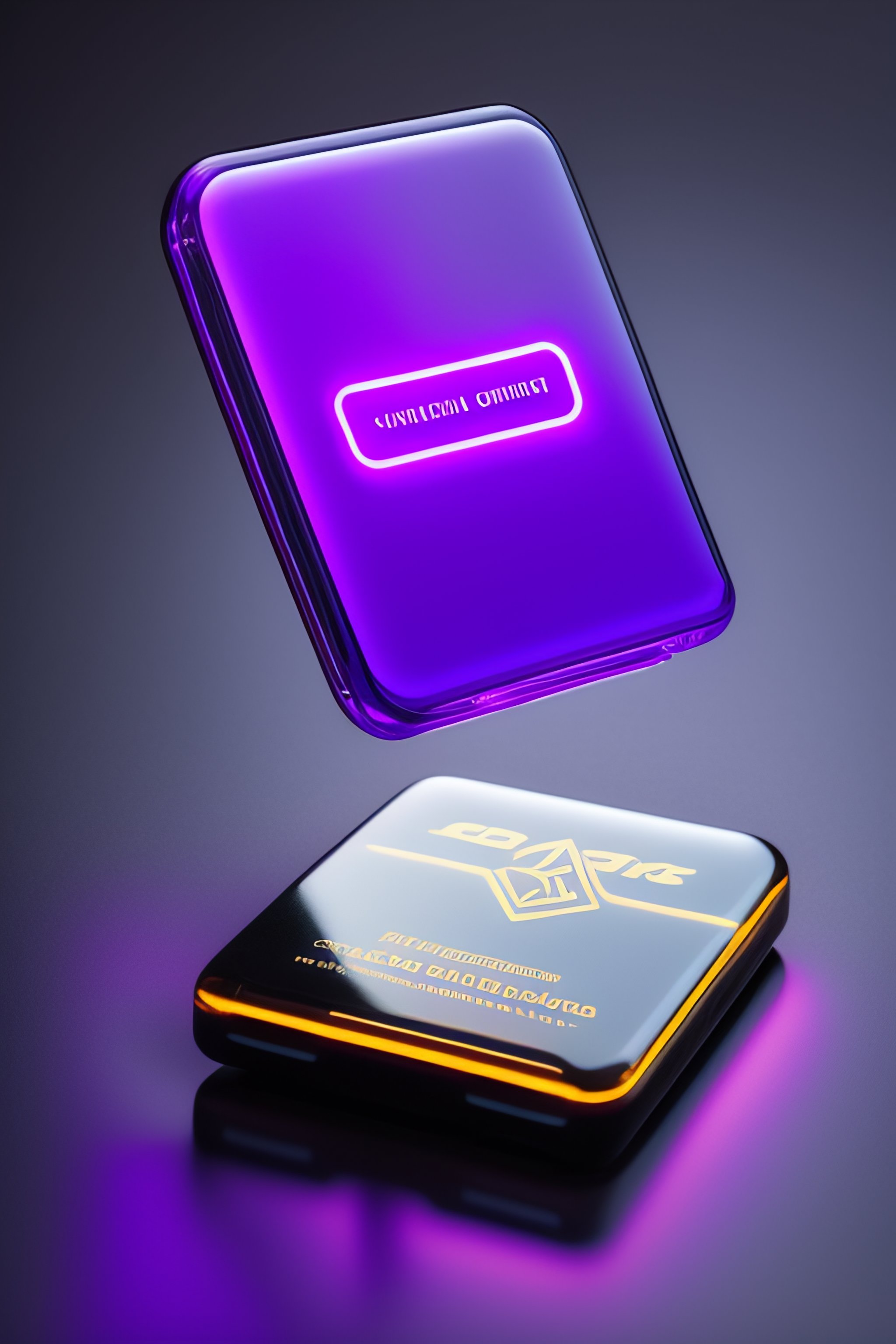 Floating and rotating access card made of neon purple glass floating with a dark cyberpunk background