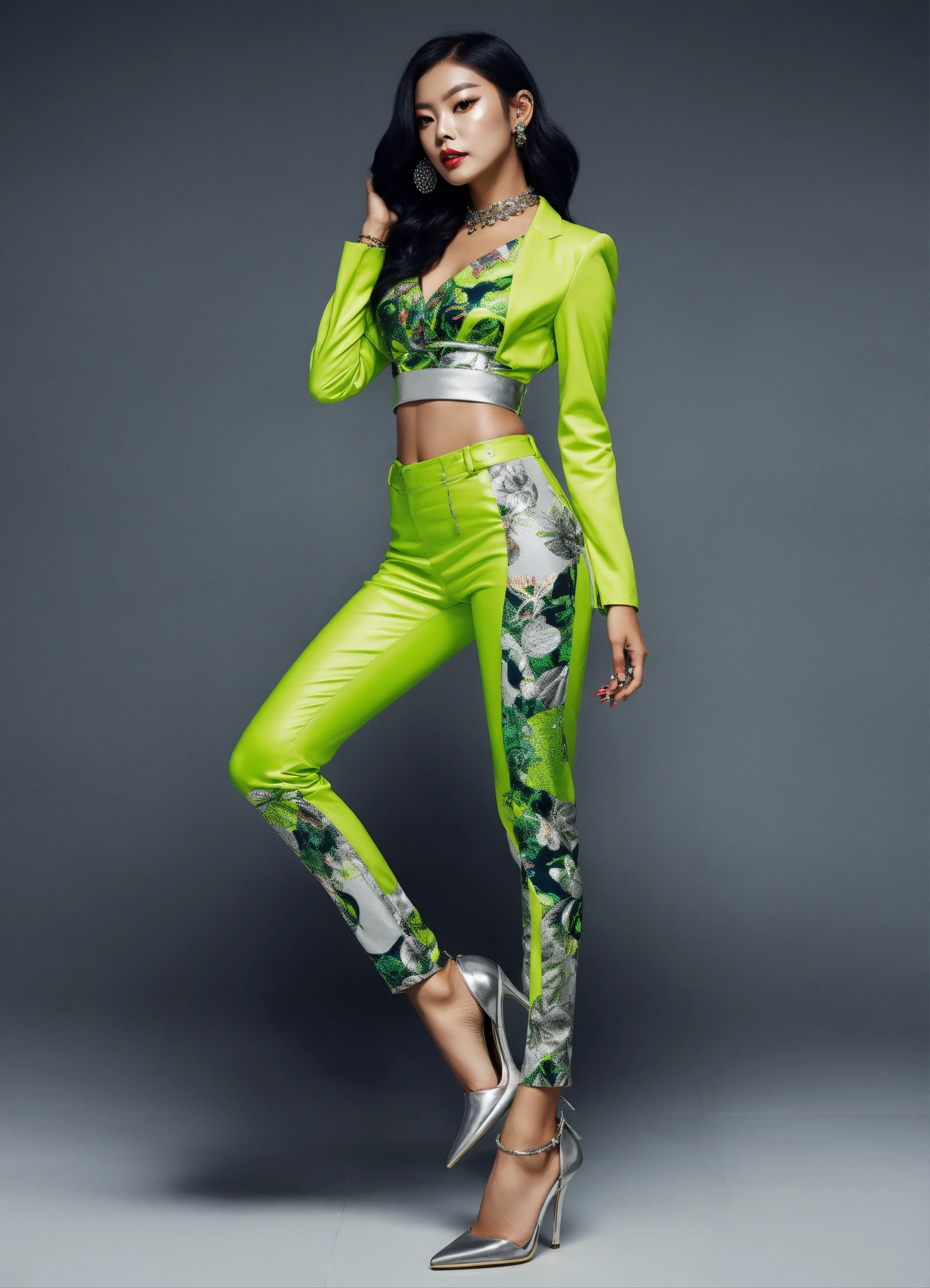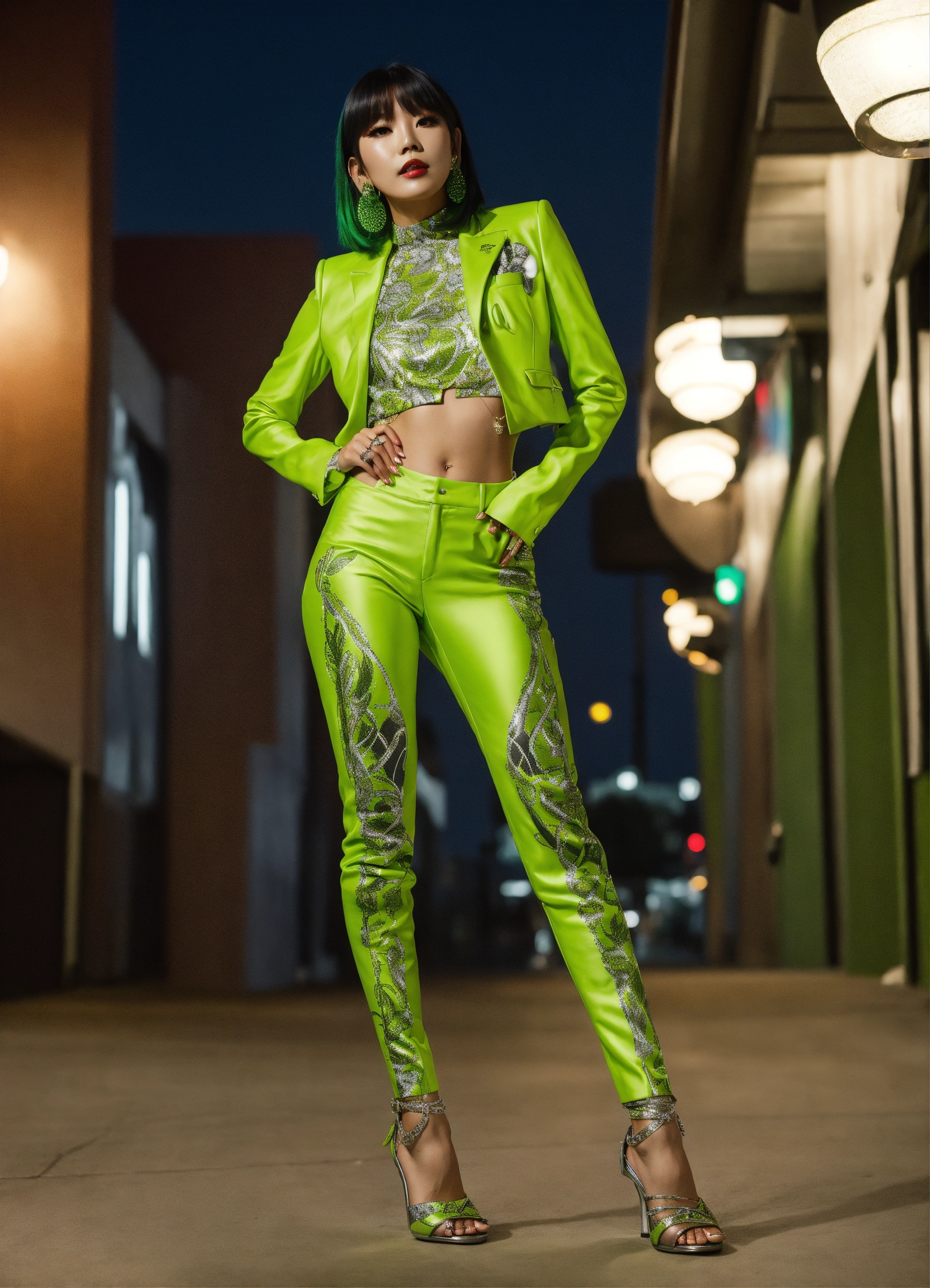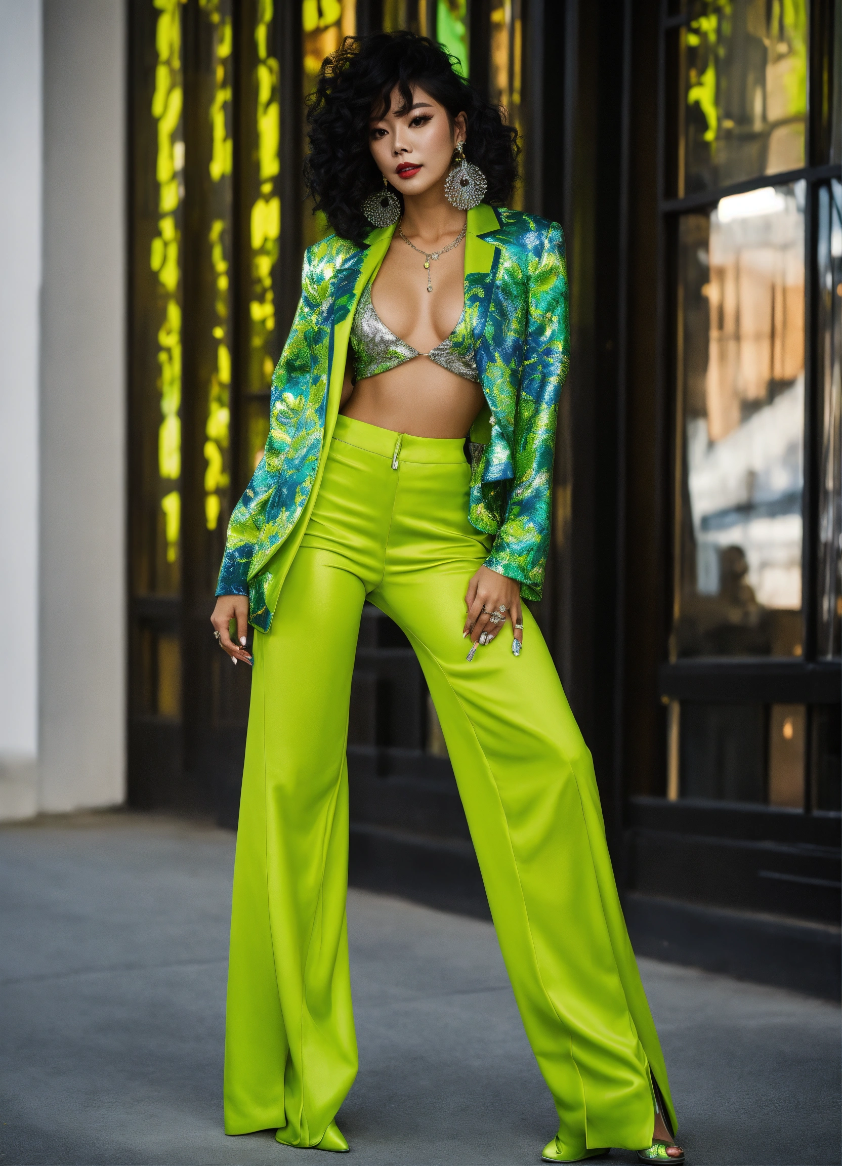 Dreamcatcher jiu glamorous lime green and silver outfit with funky prints, pants, high heels, and short dark hair