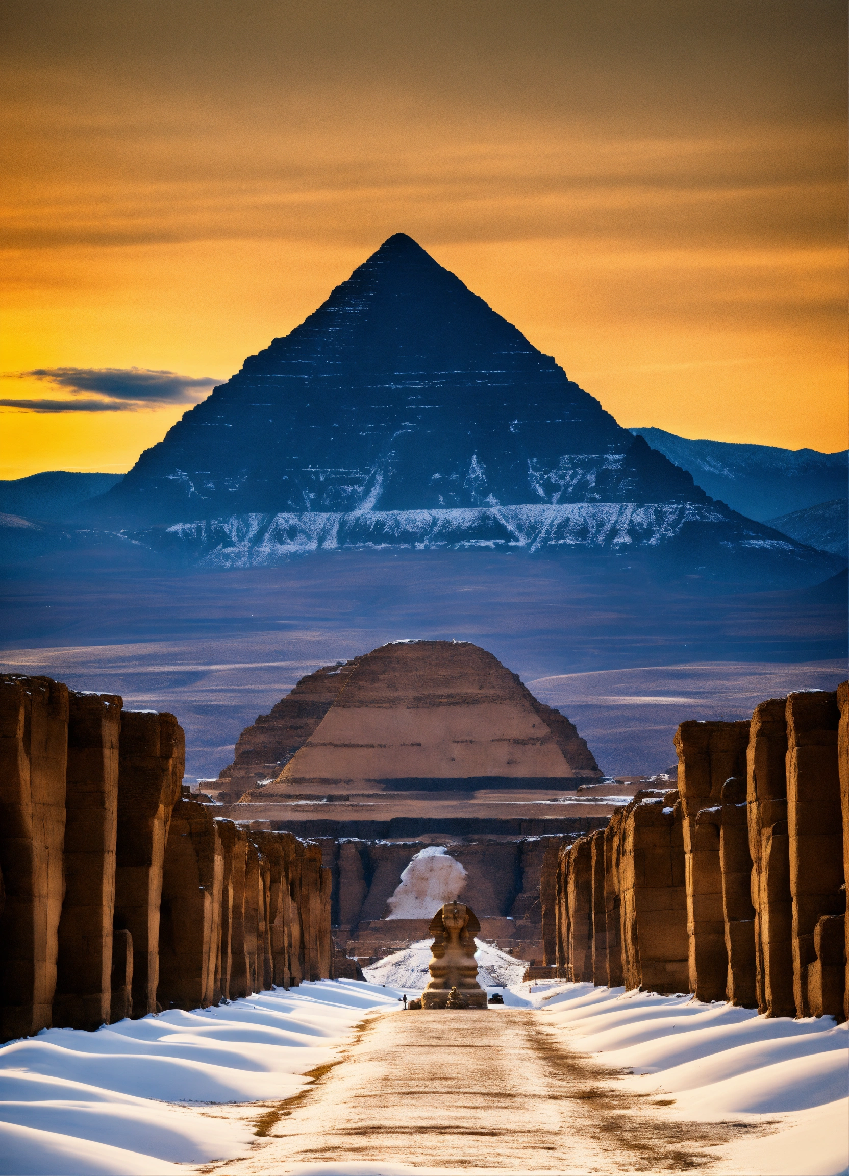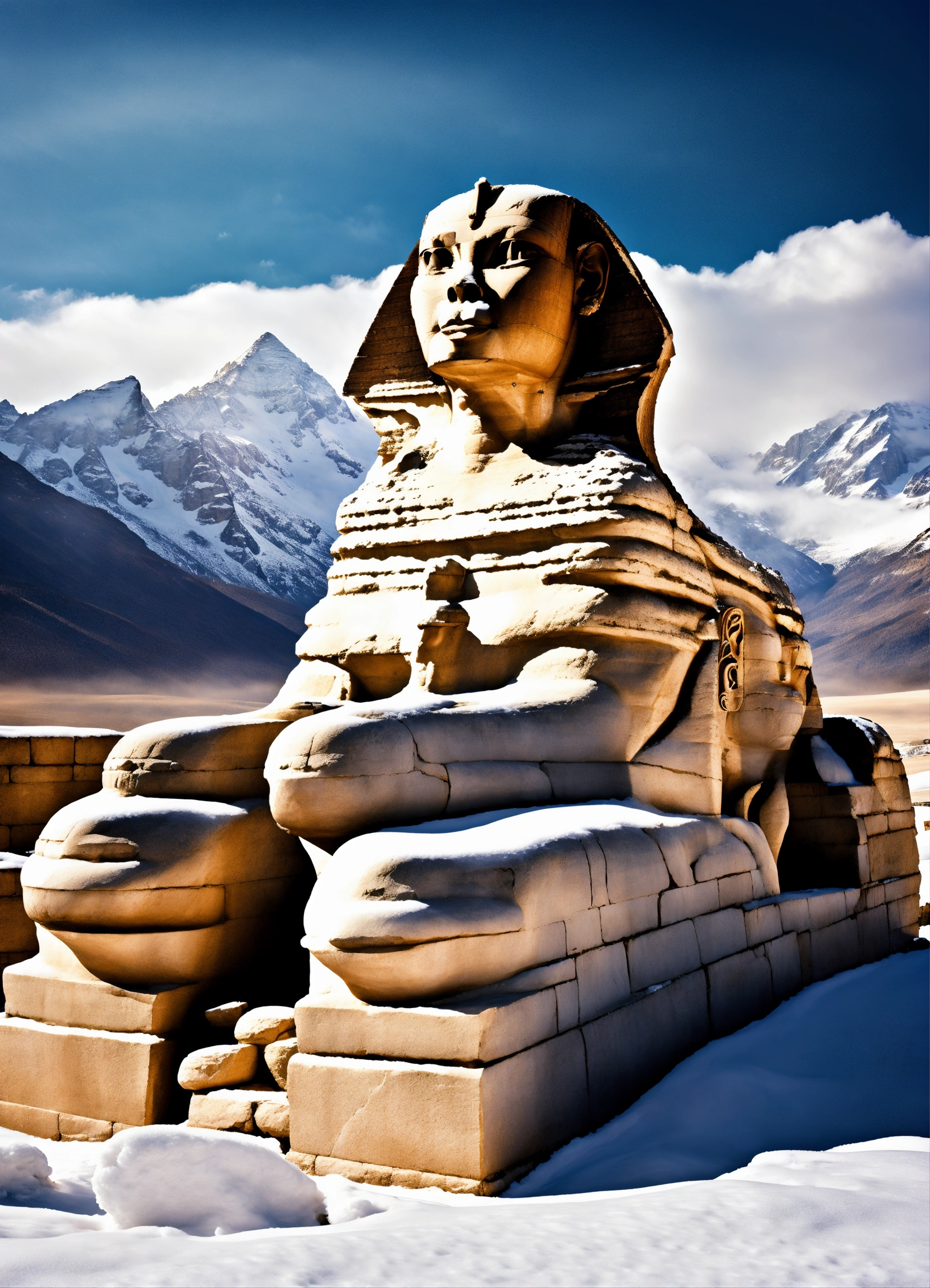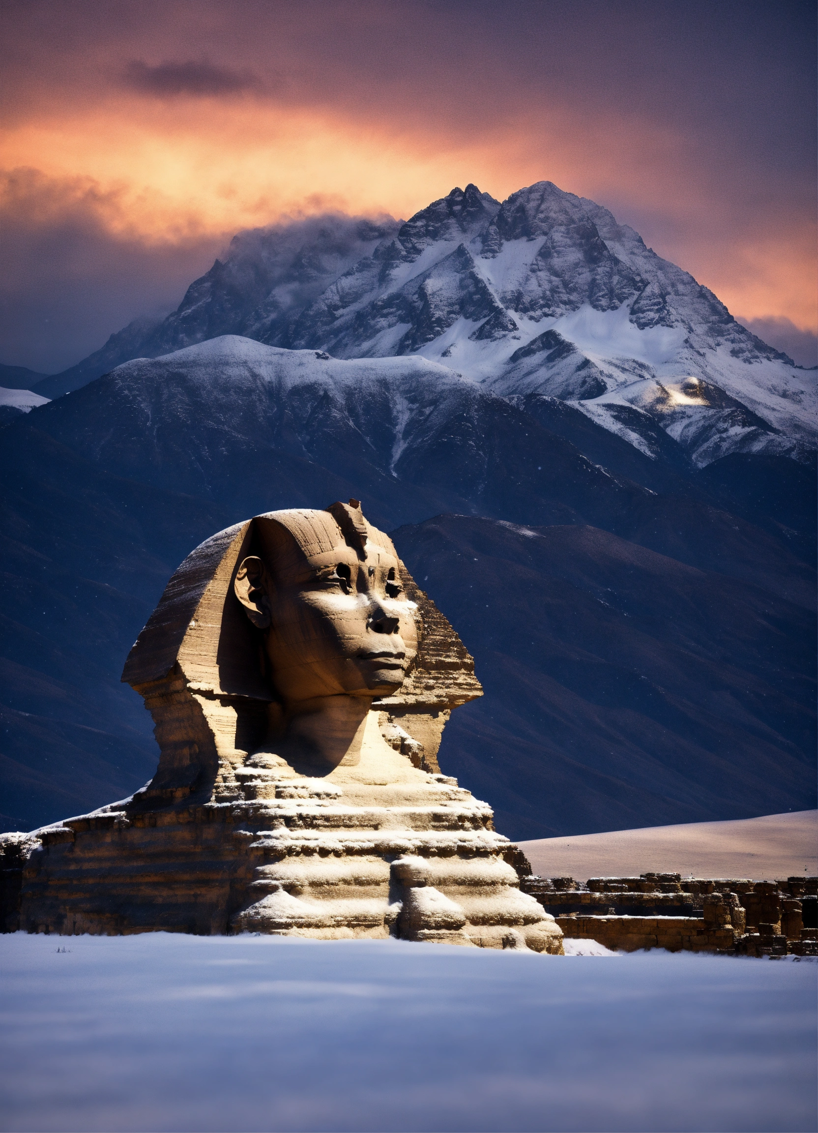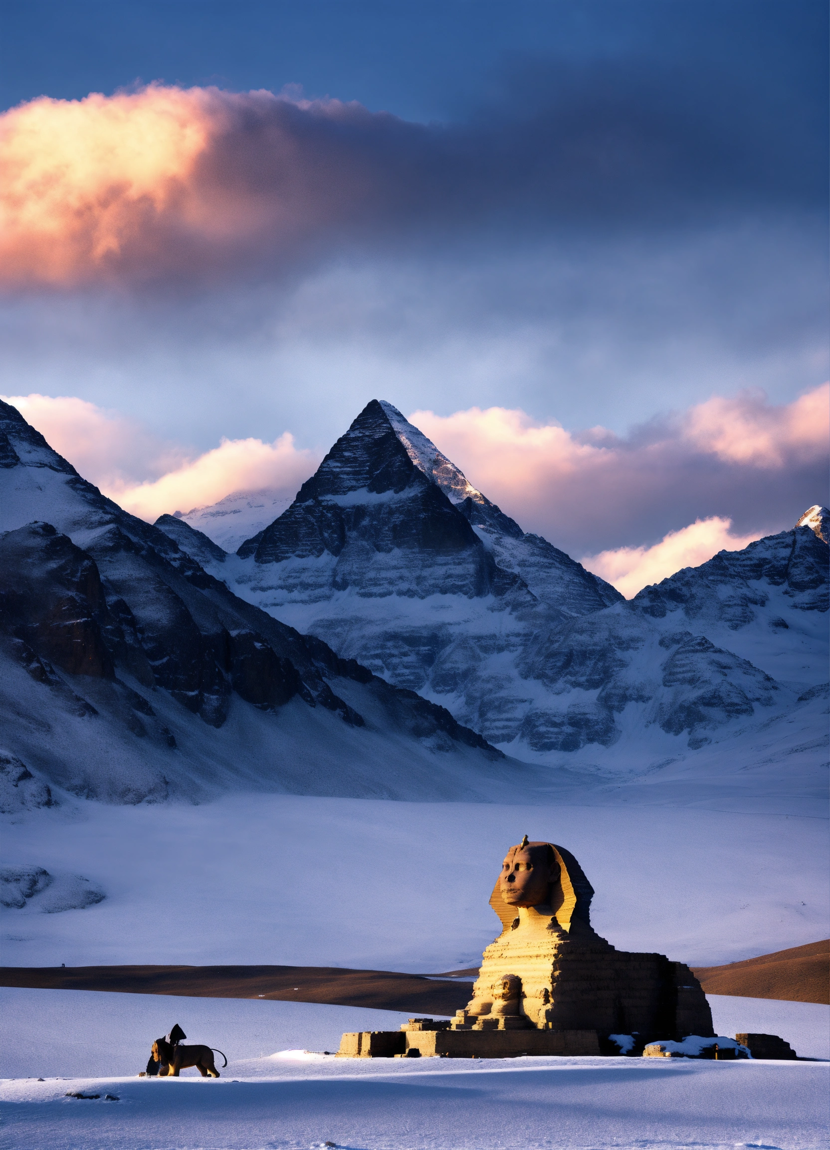 Sphinx evolves in the dreamscape among snow-capped mountains