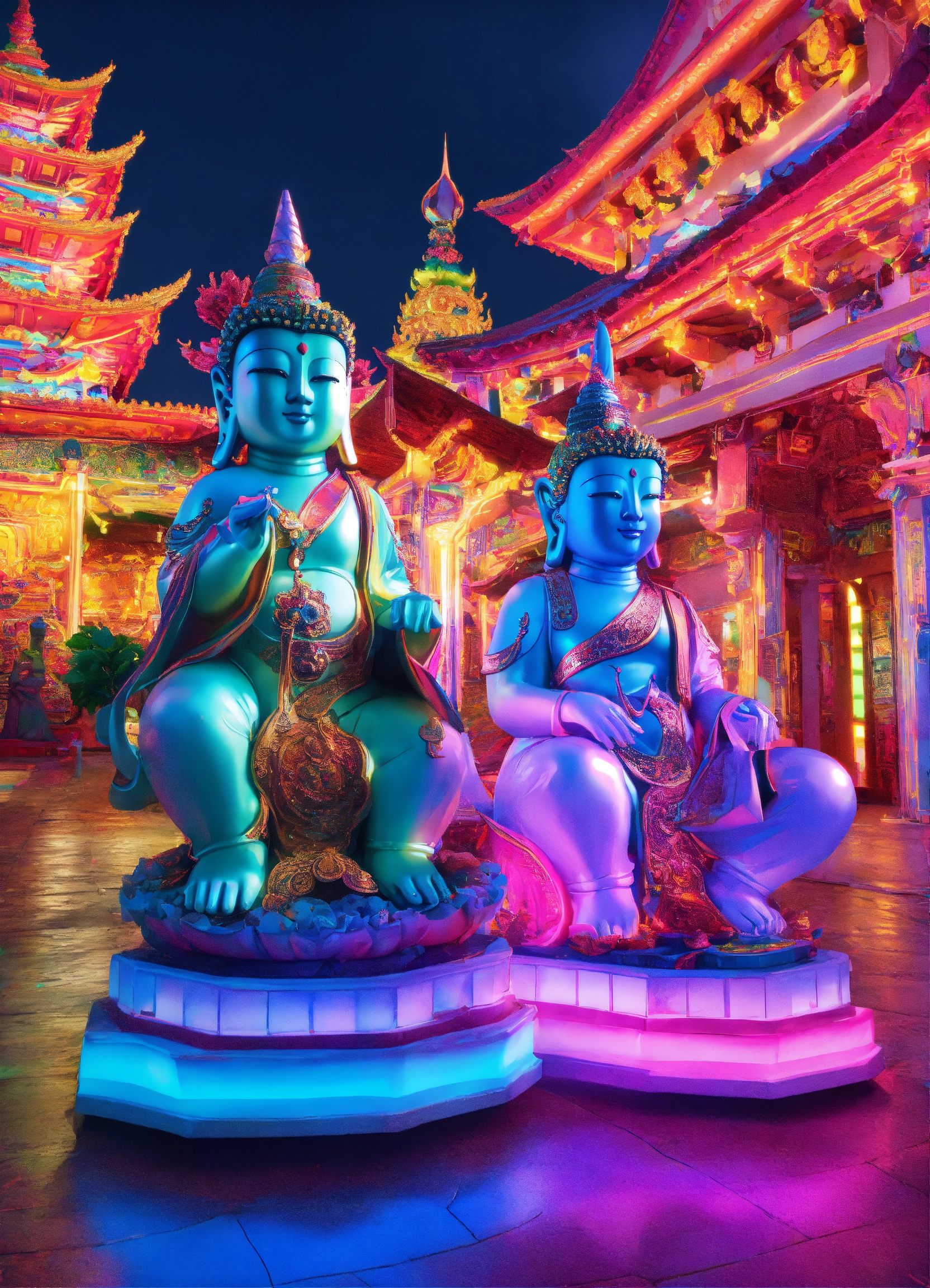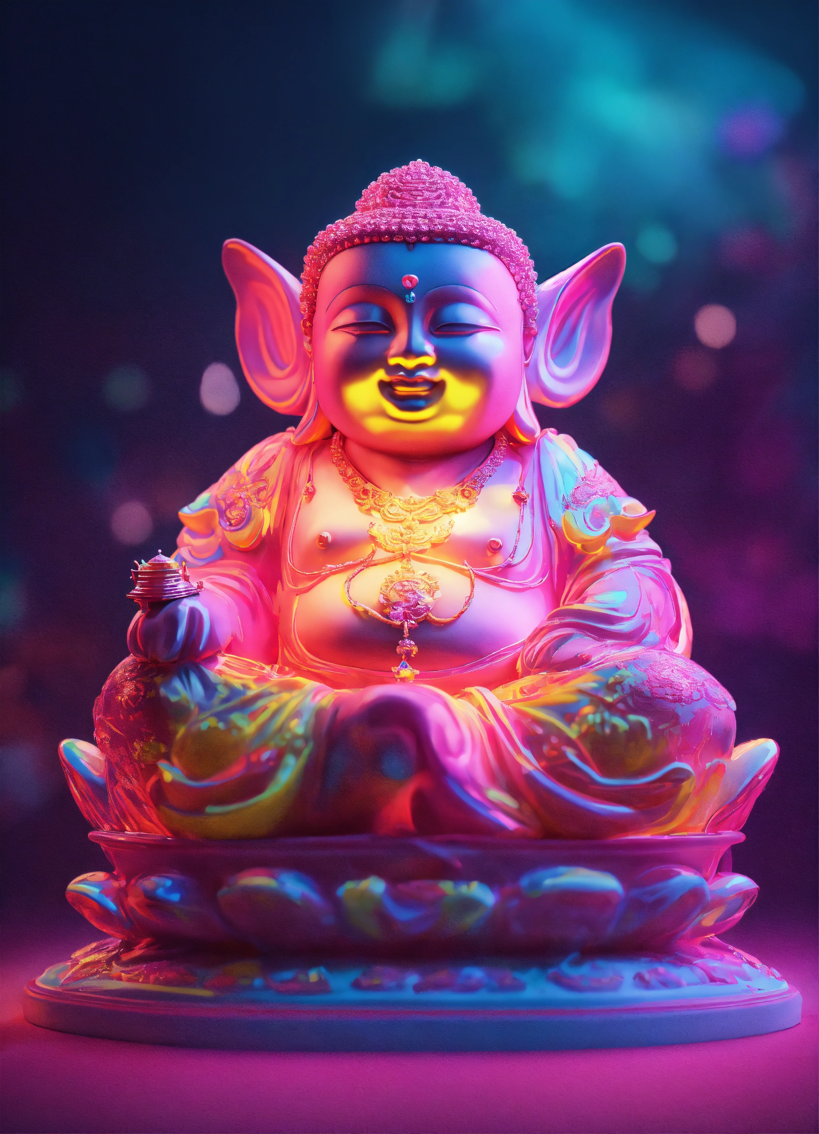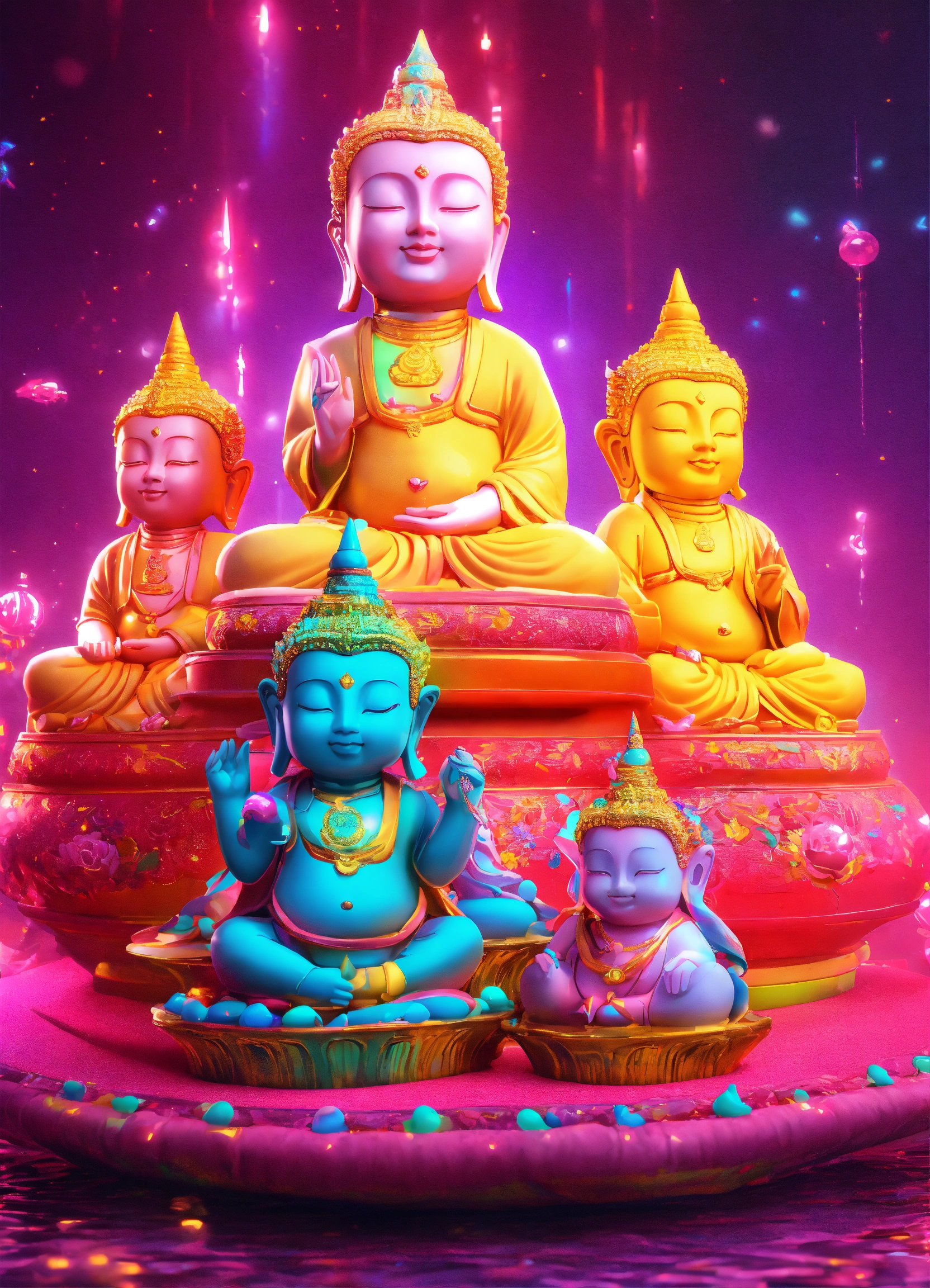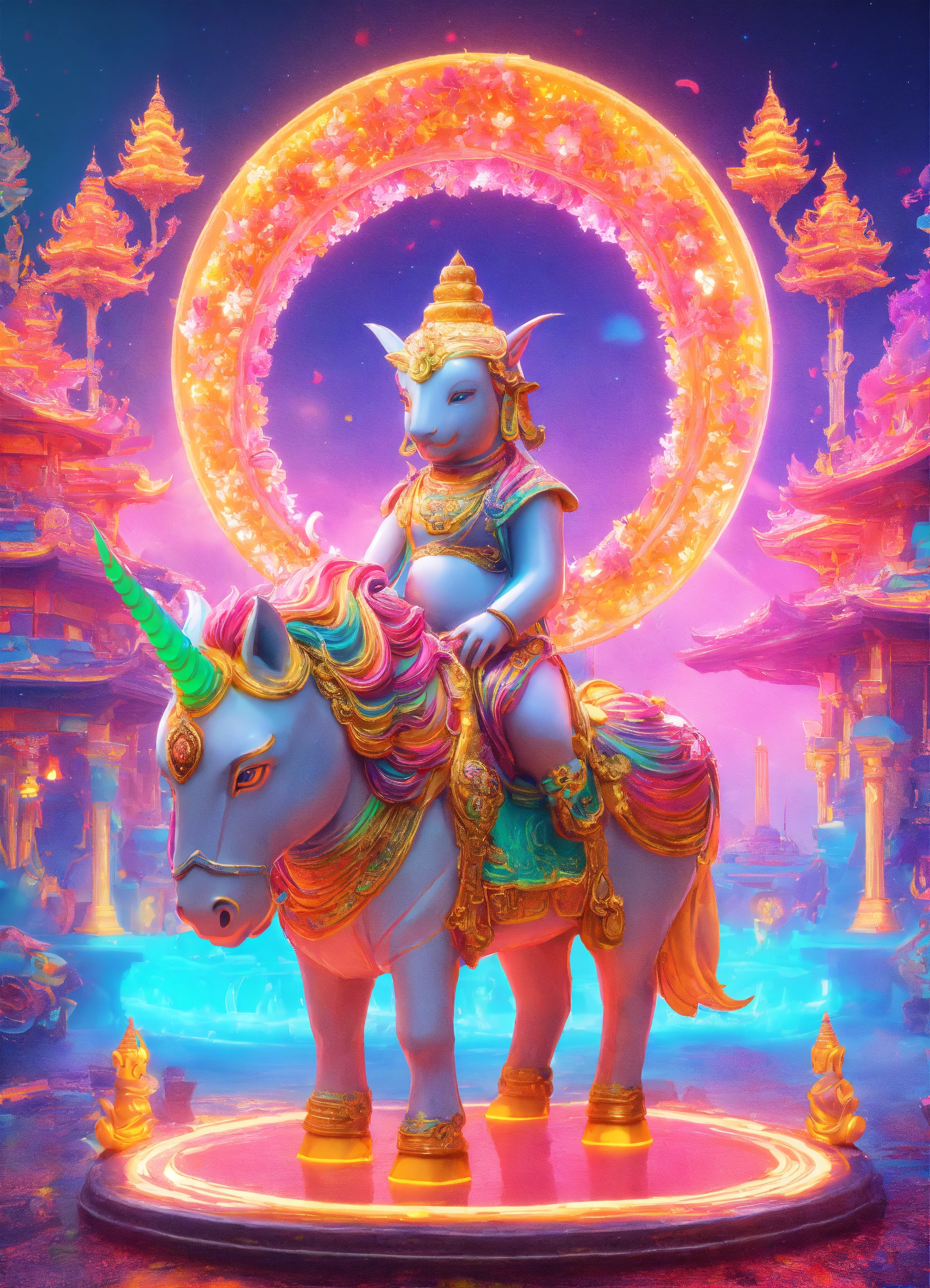 Gelly cute adorable buddhas riding unicorns, neon glow colours, highly intricate details, 3d, cgi, realistic light, facing camera, portrait, global illumination