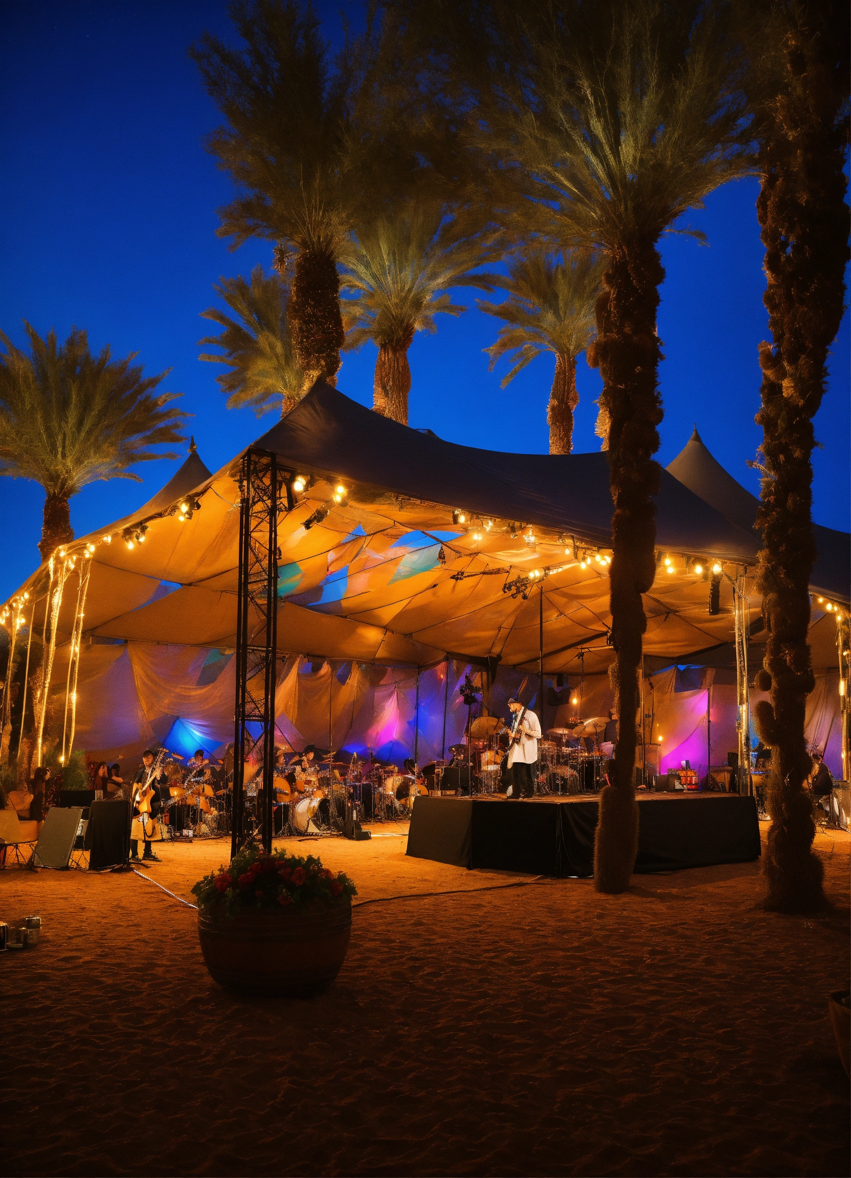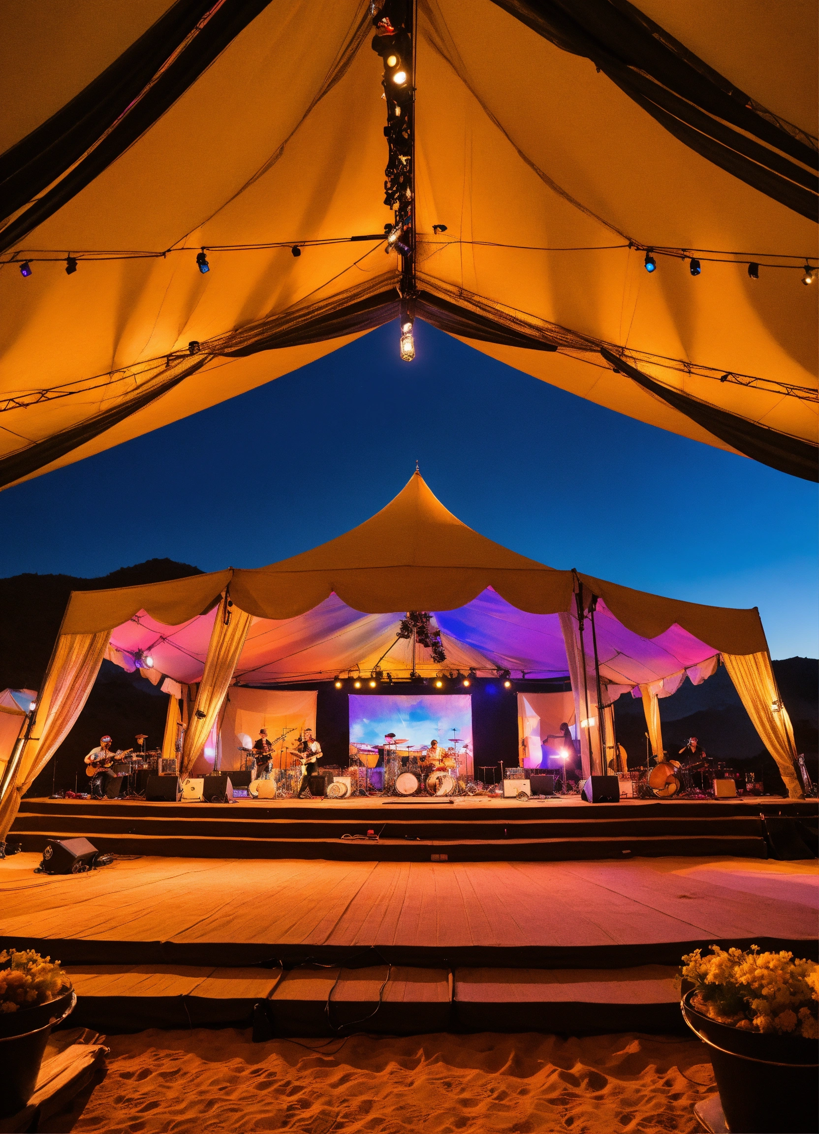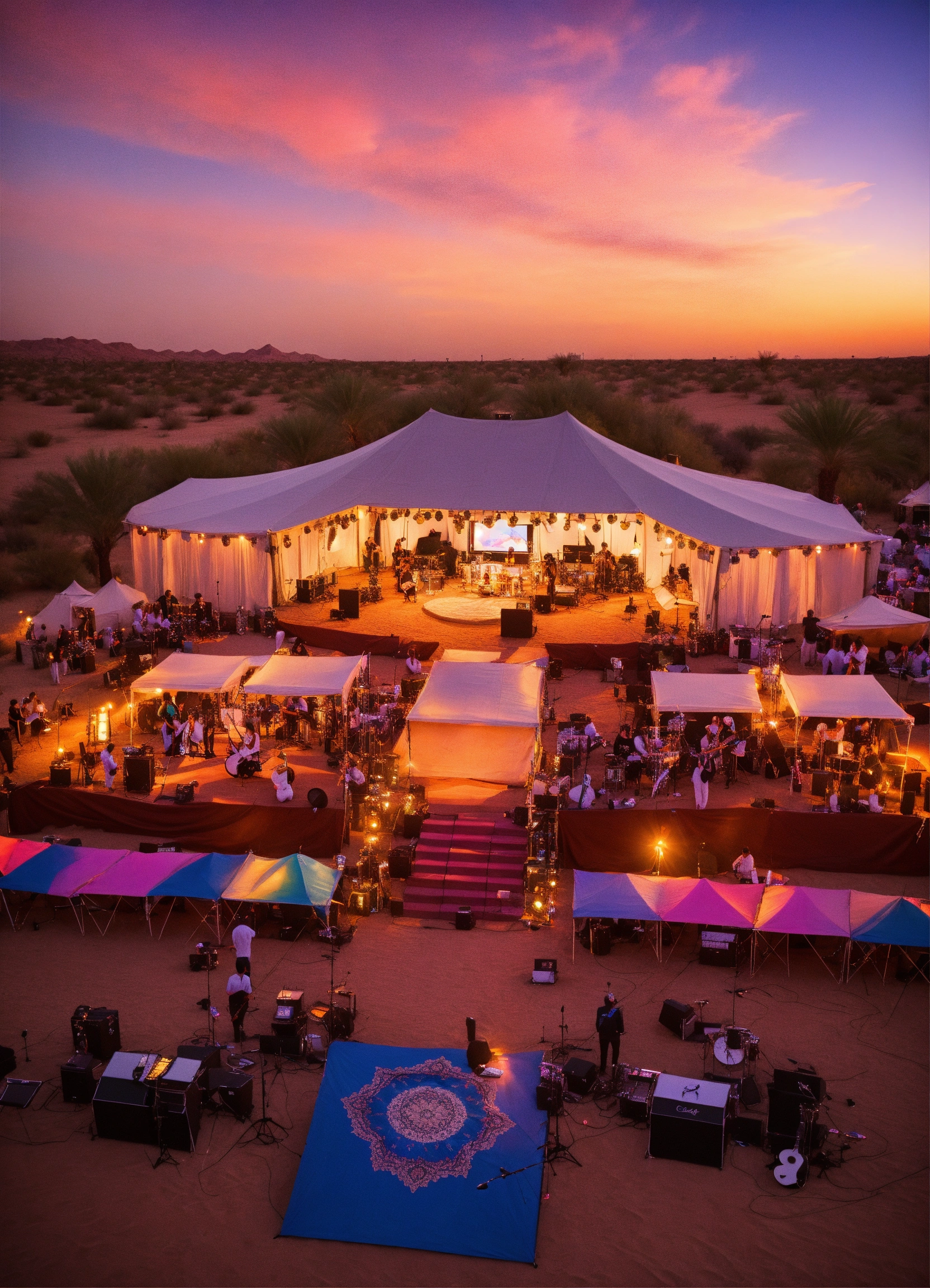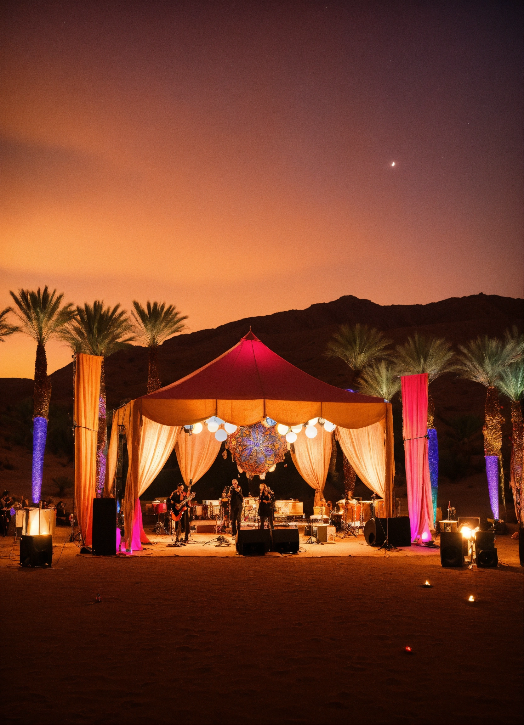 Elegant desert arabian tent themed outdoor concert stage with large screen with live music bands, colorful