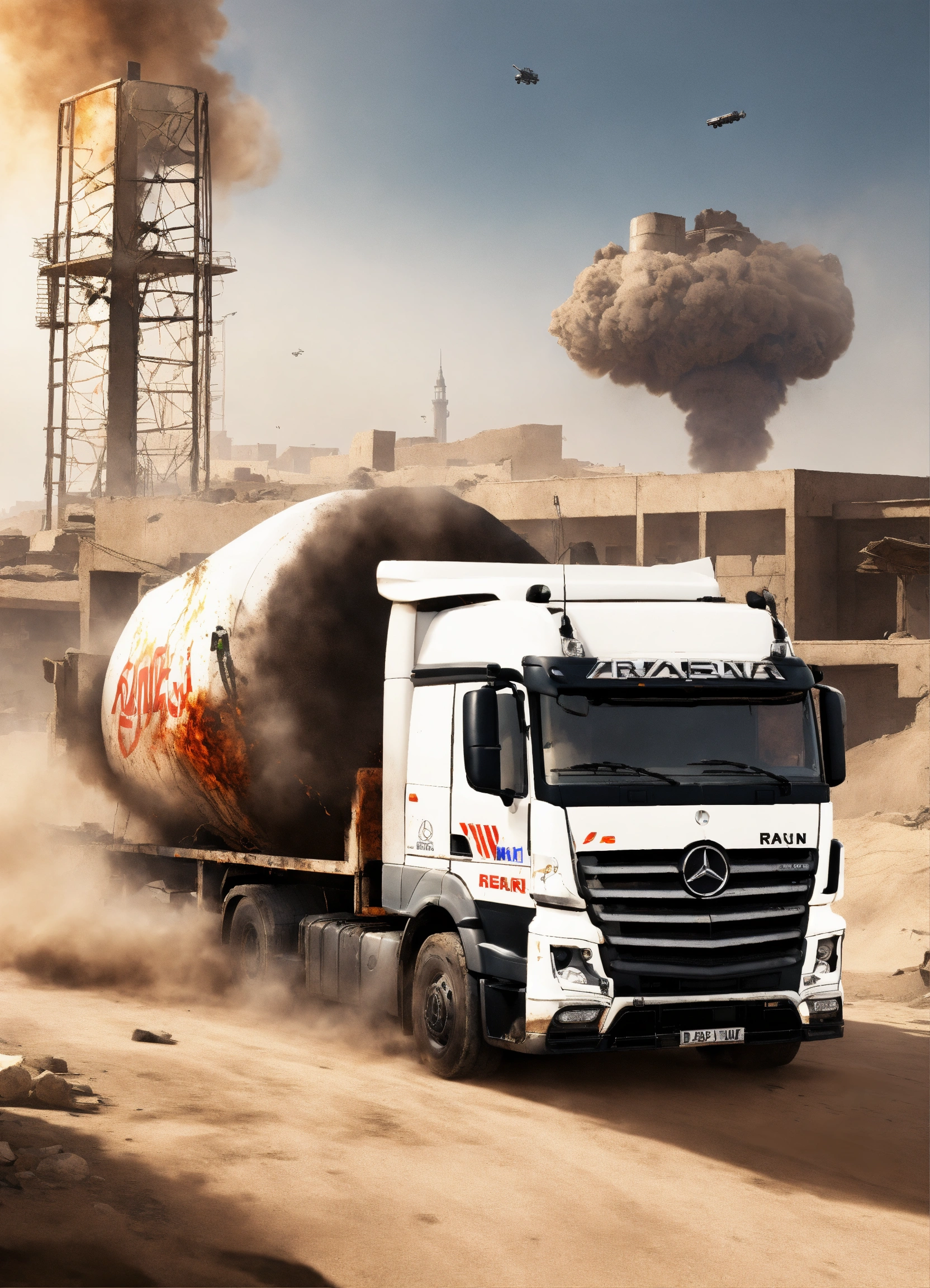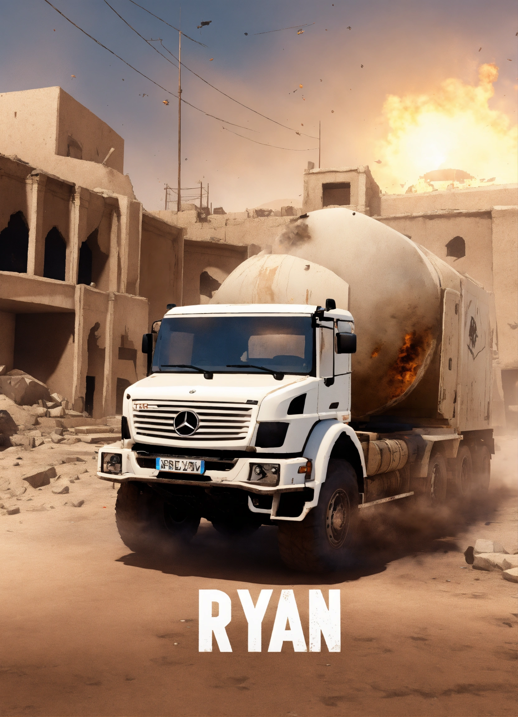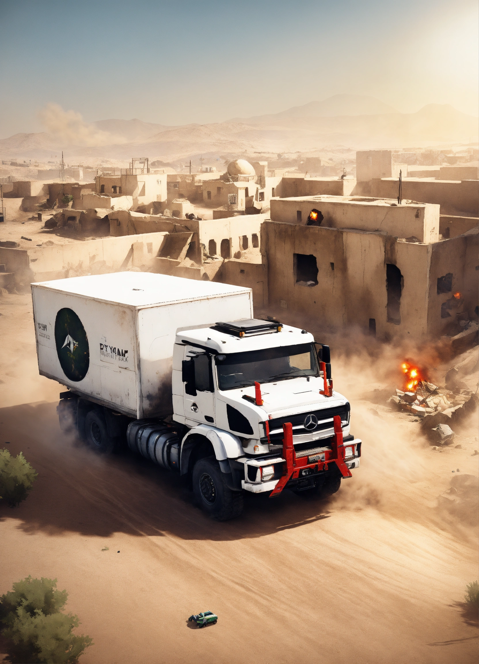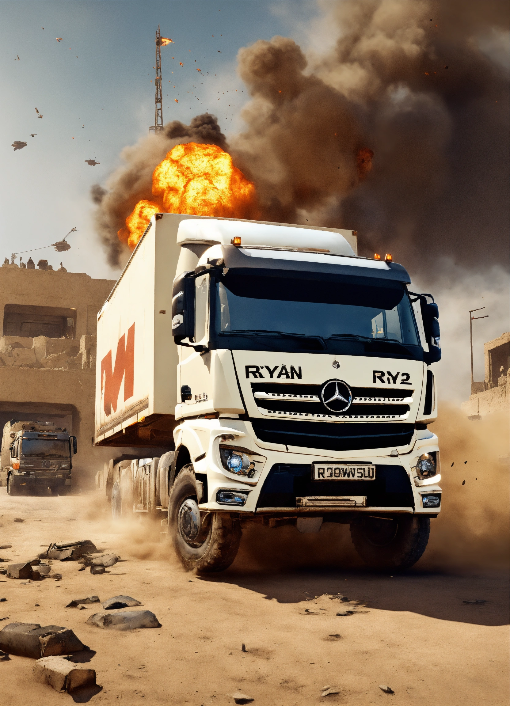 A large white mercedes hgv truck with the word ryan on the truck in the counter strike csgo map de_dust 2 with a bomb site explosion in the background