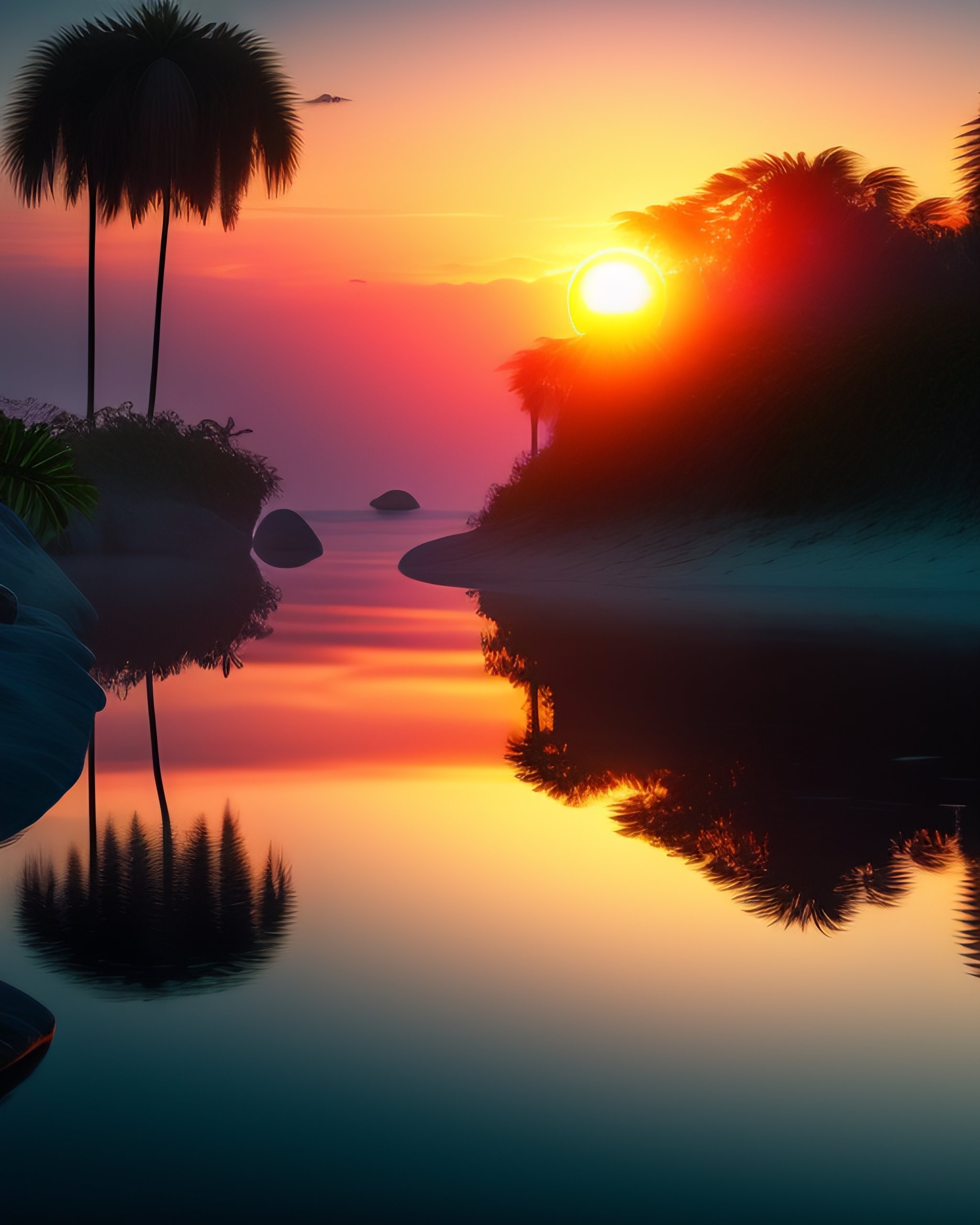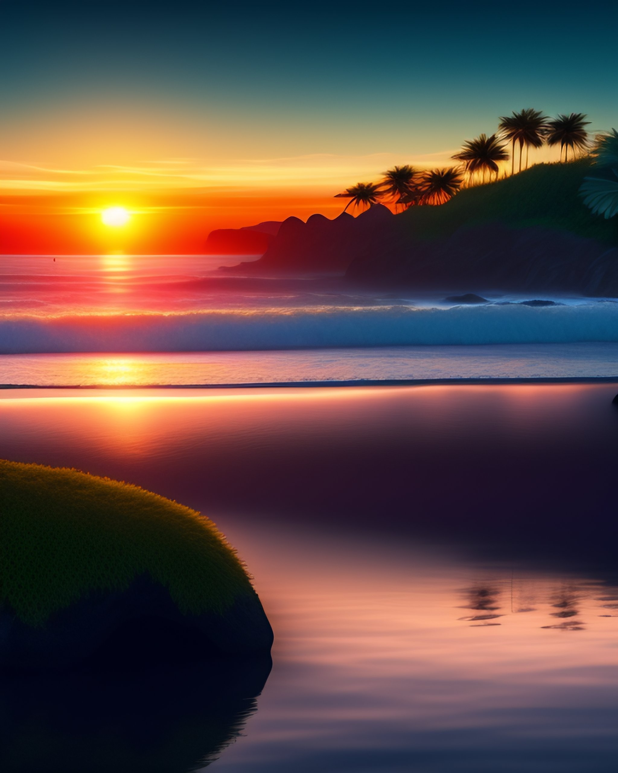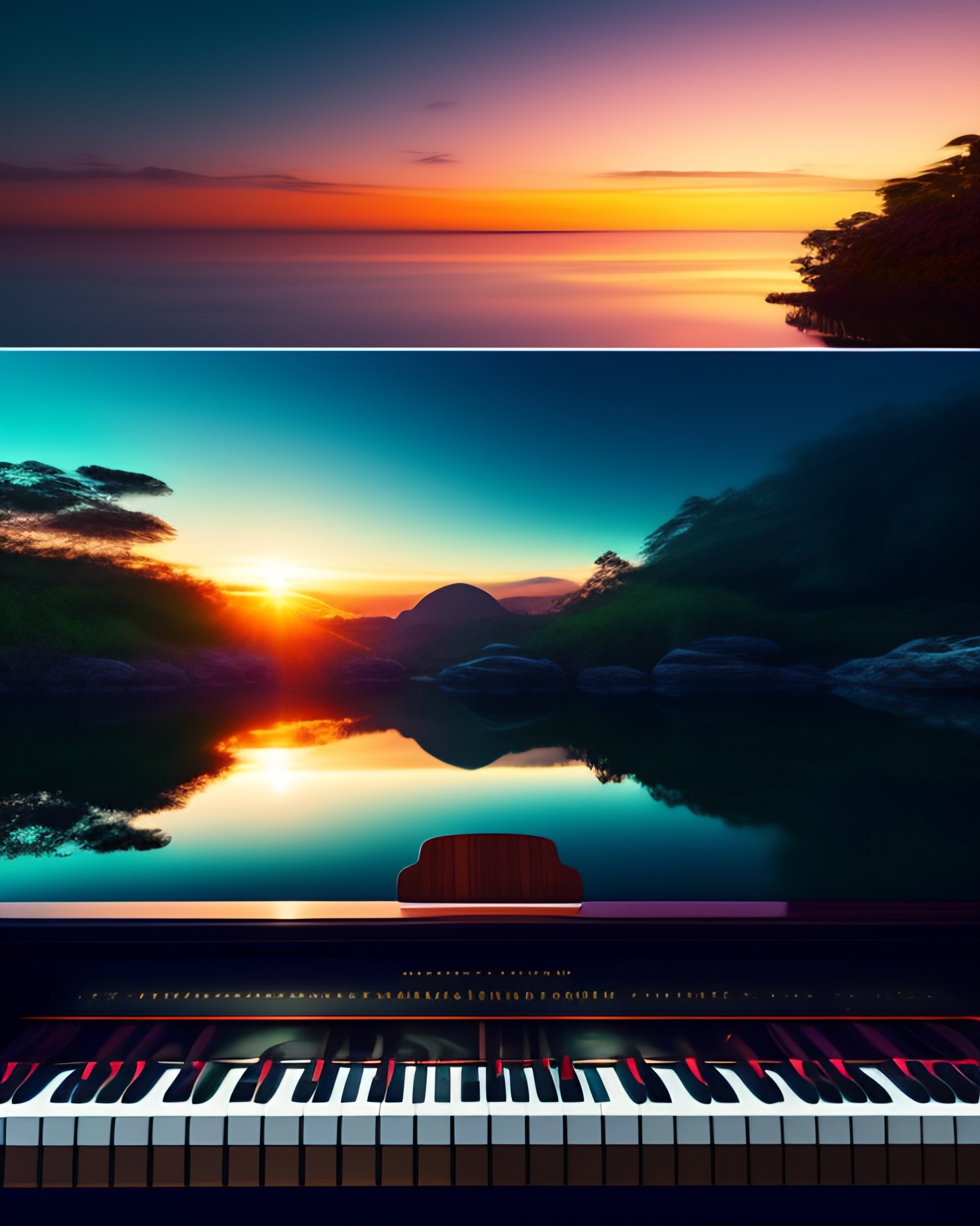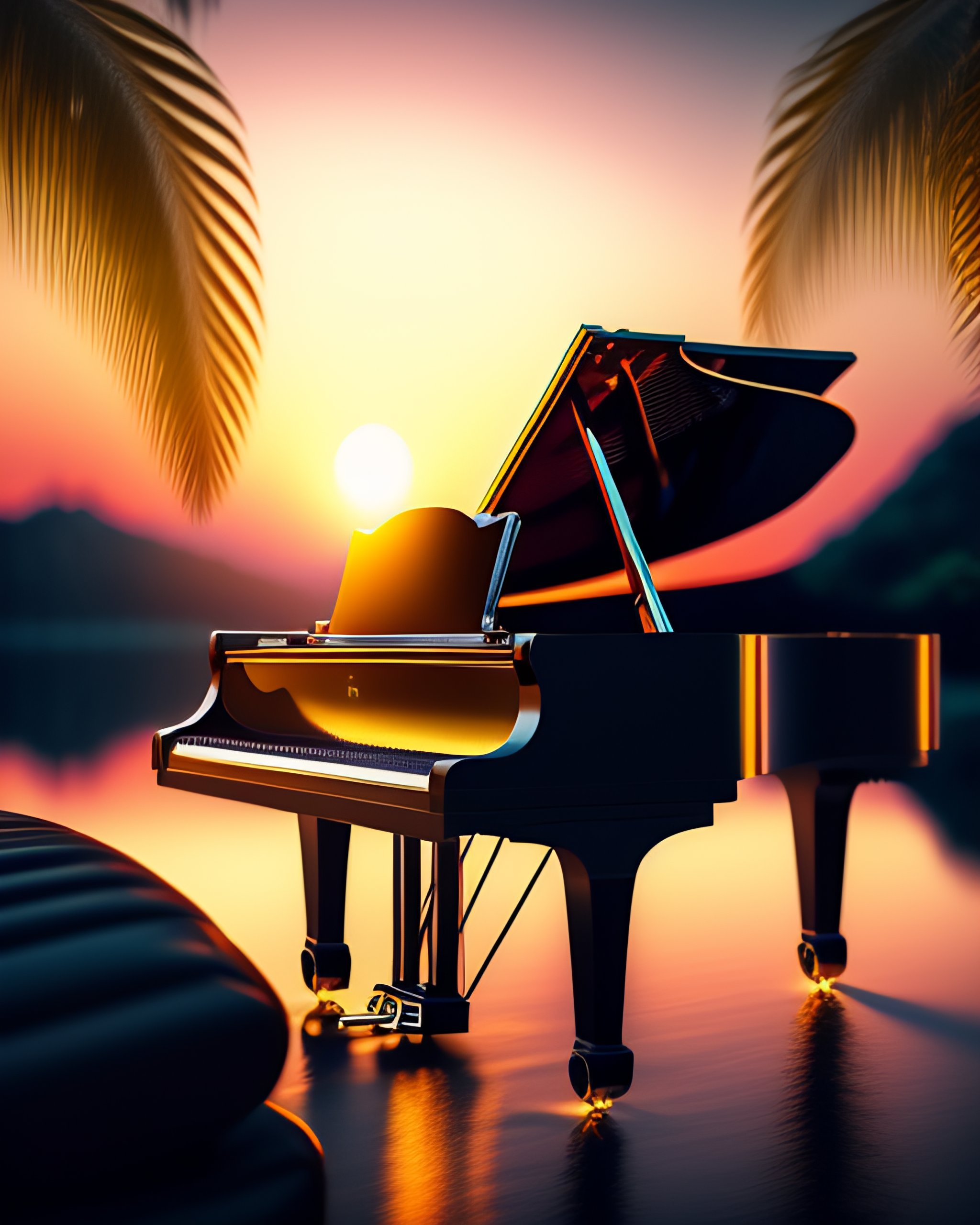 Playing piano, shining ocean reflections, in the tropical jungle, sunset, the sea in the distance, photorealistic, 8k, hyperdetailed