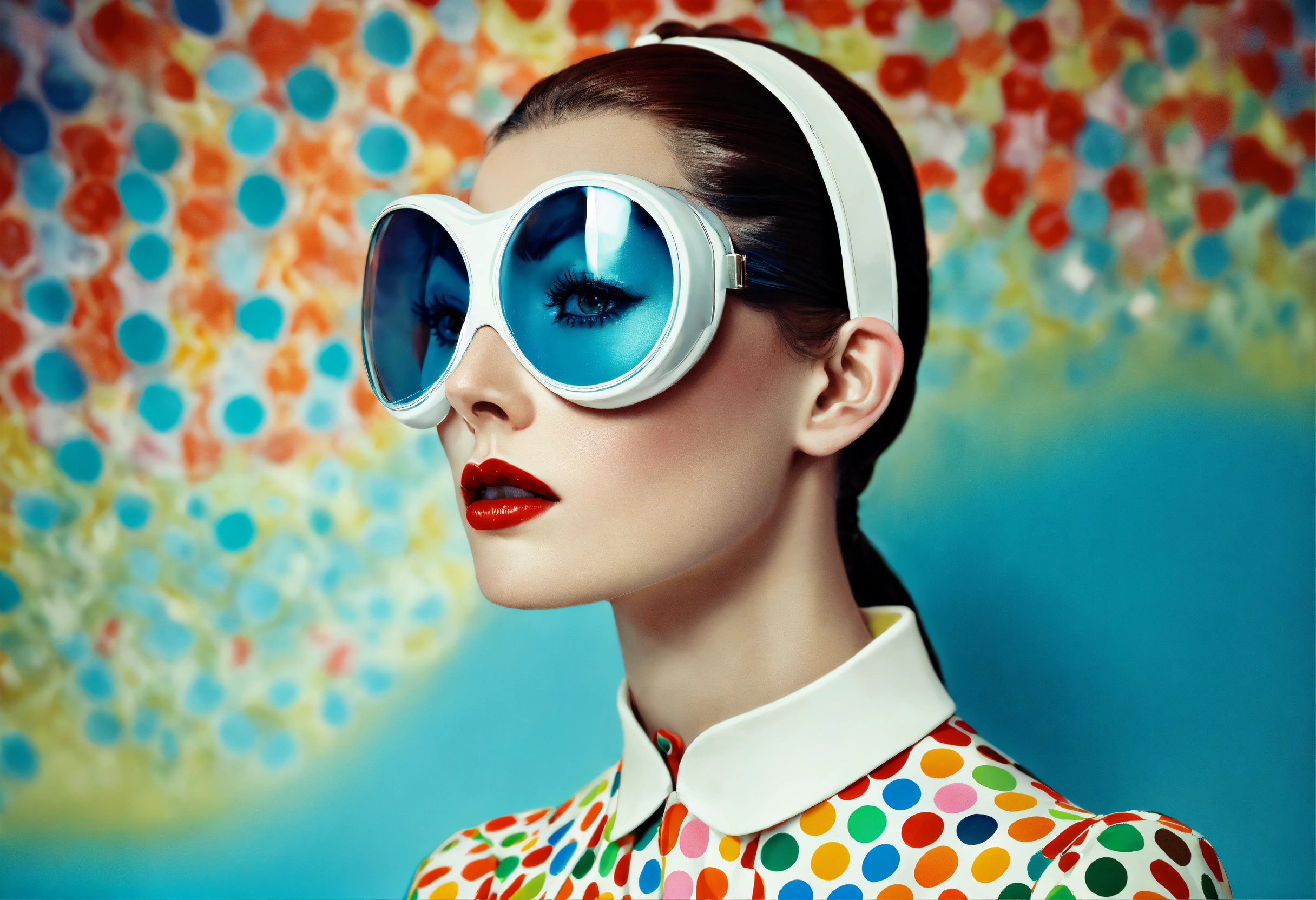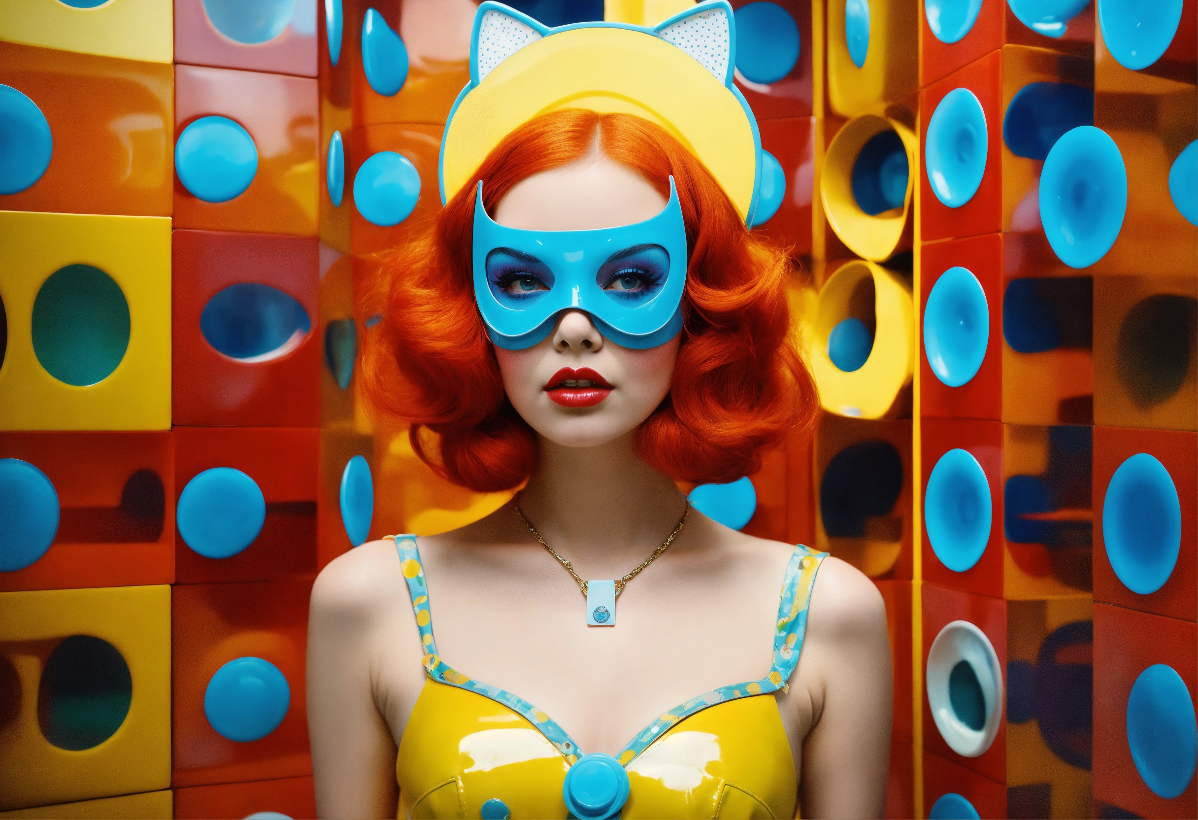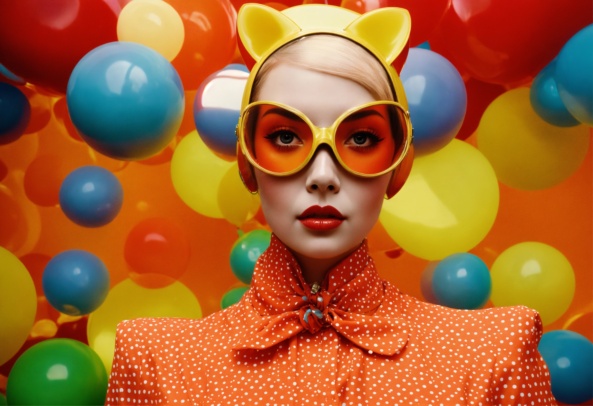 Retro 60s, imaginary skinny front portrait photography, transparent porcelain printed with multicolor pop polka dots, pop courreges air hostess cat woman mask, an attractive, 80 degree view, art by sergio lopez, natalie shau, james jean and salvador dali, fashion 60s exaggerations color year 2046