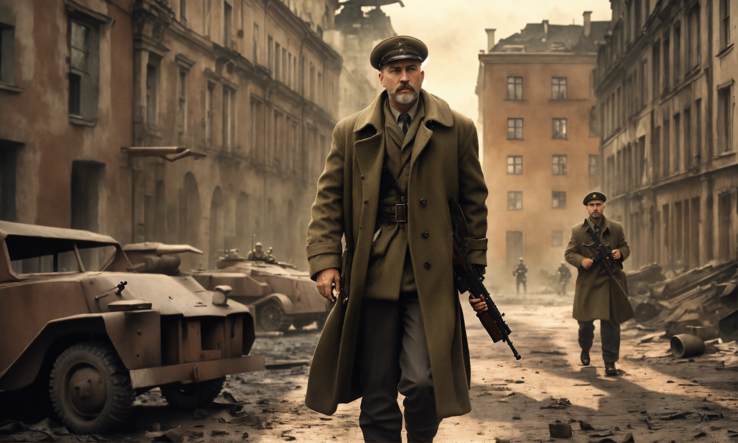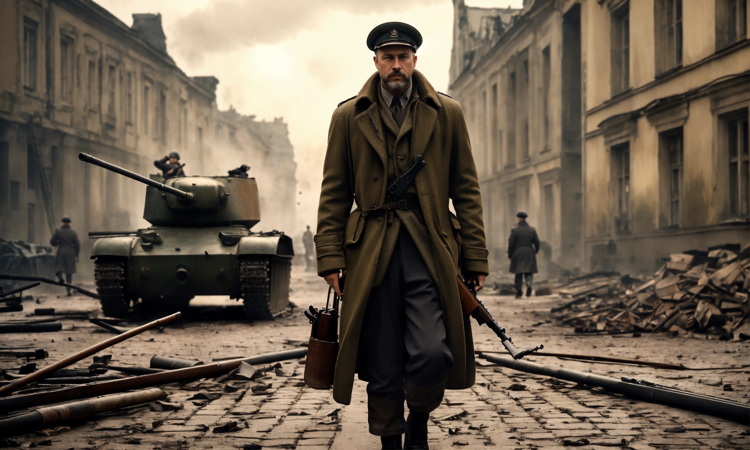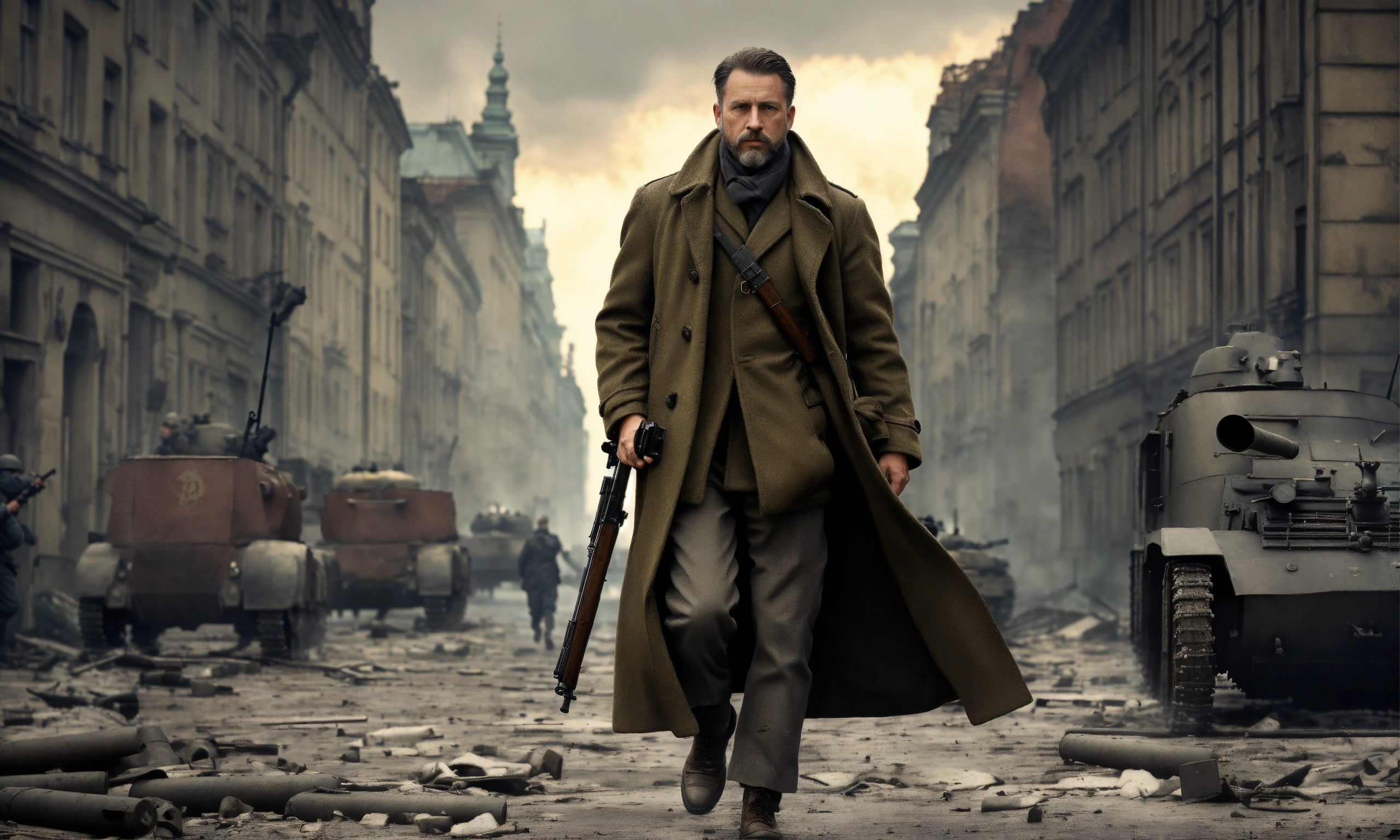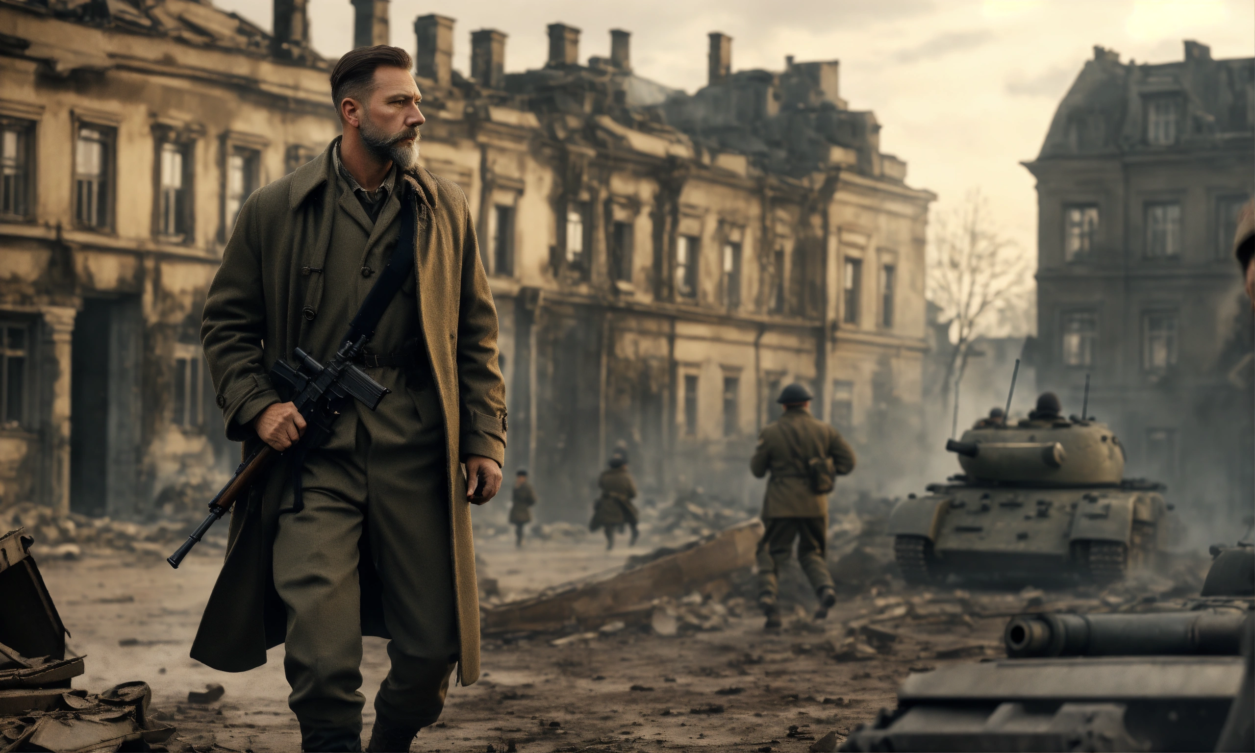 Cinematic wallpaper of a 1940s german man with an overcoat coat and cargo pants holding a rifle, 45 years old with a short hair and a beard, realistic body proportions, in ruined warsaw poland in 1944 during the uprising with resistance fighters running in the background and a tank, cinematic, ultra detailed, grimdark, realistic, hd