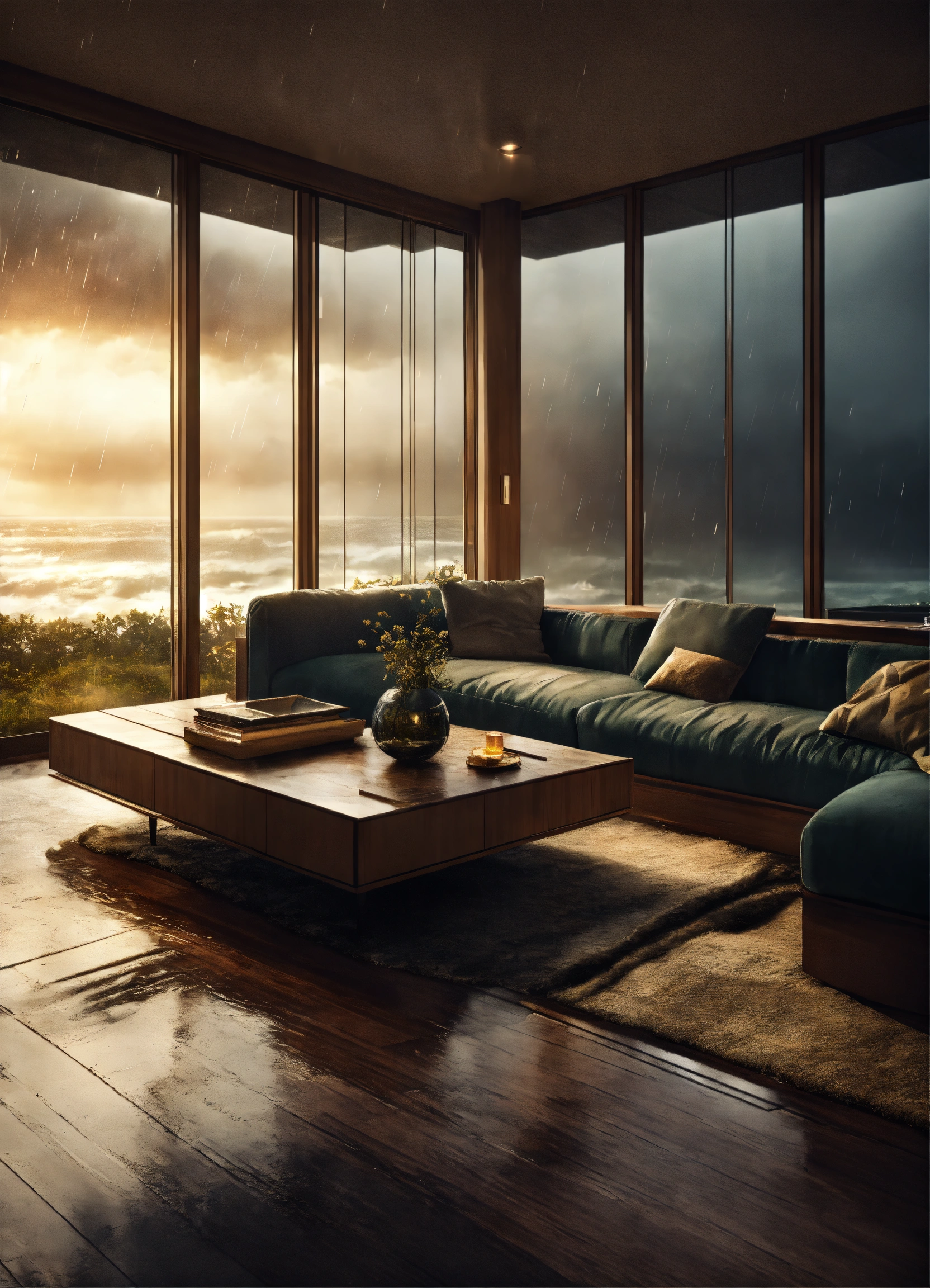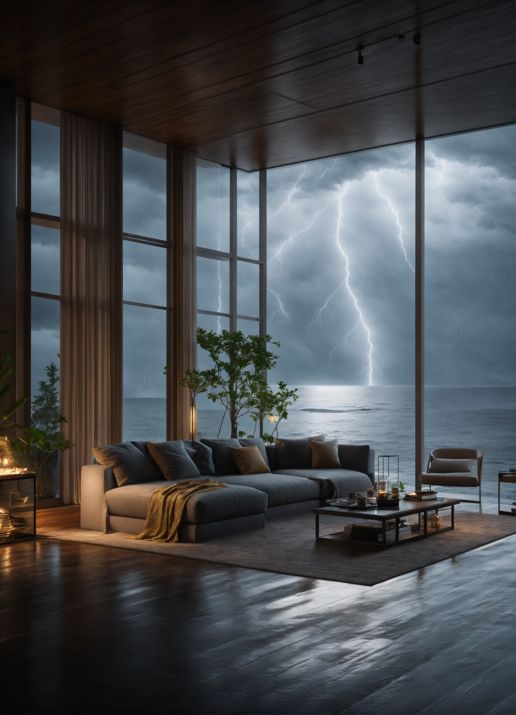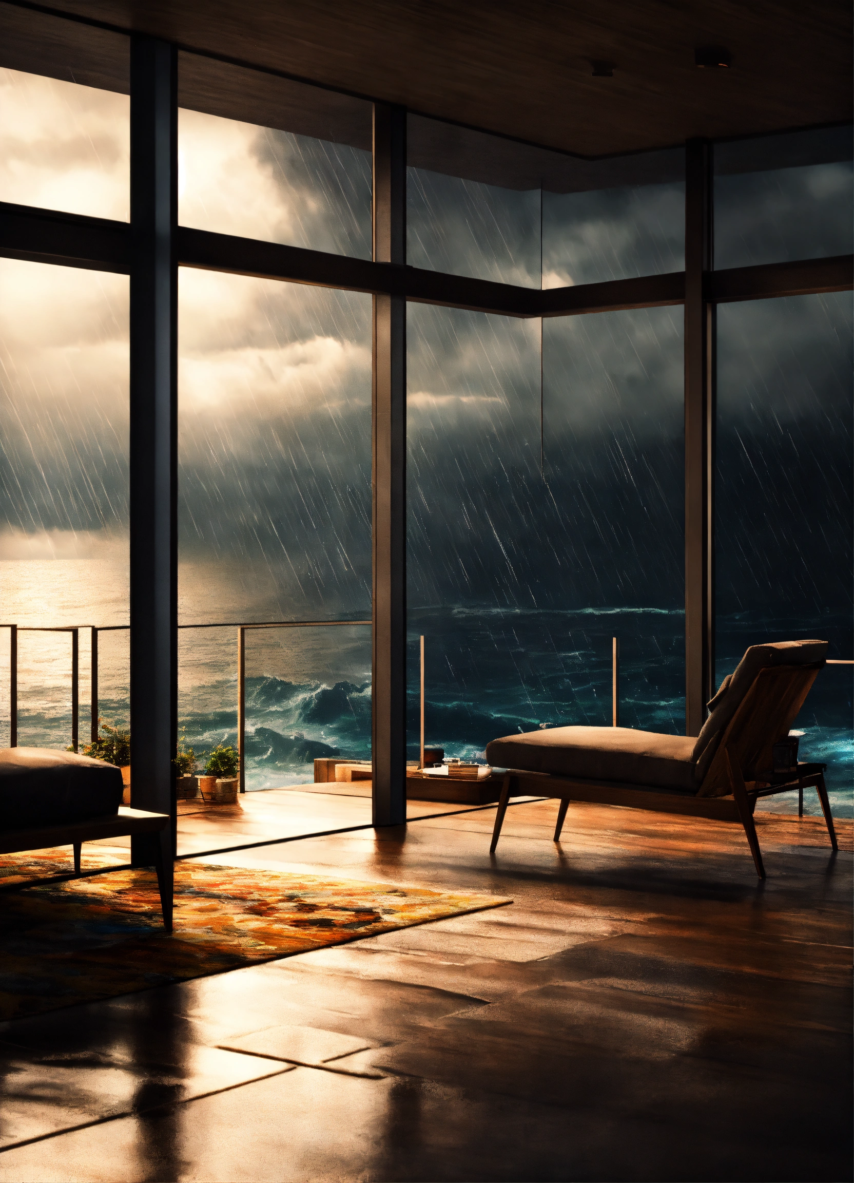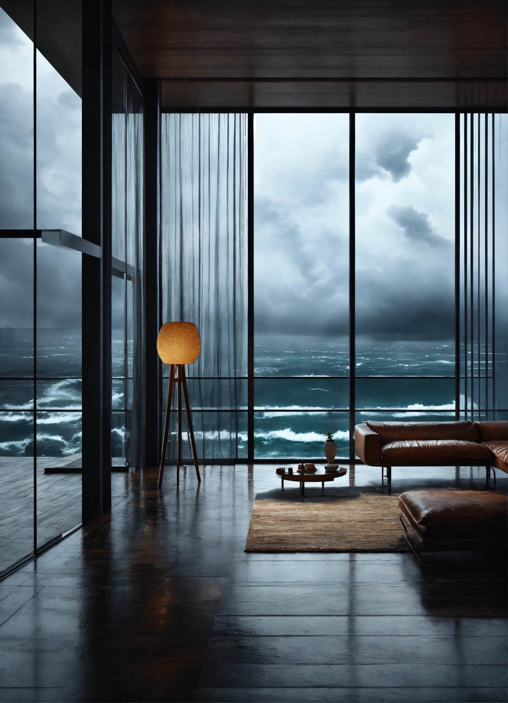 Interior architectural 8k render, beautiful interior living room with floor to ceiling glass windows overlooking the ocean, thunderstorm outside with torrential rain, detailed, high resolution, photorrealistic, dark, gloomy, moody