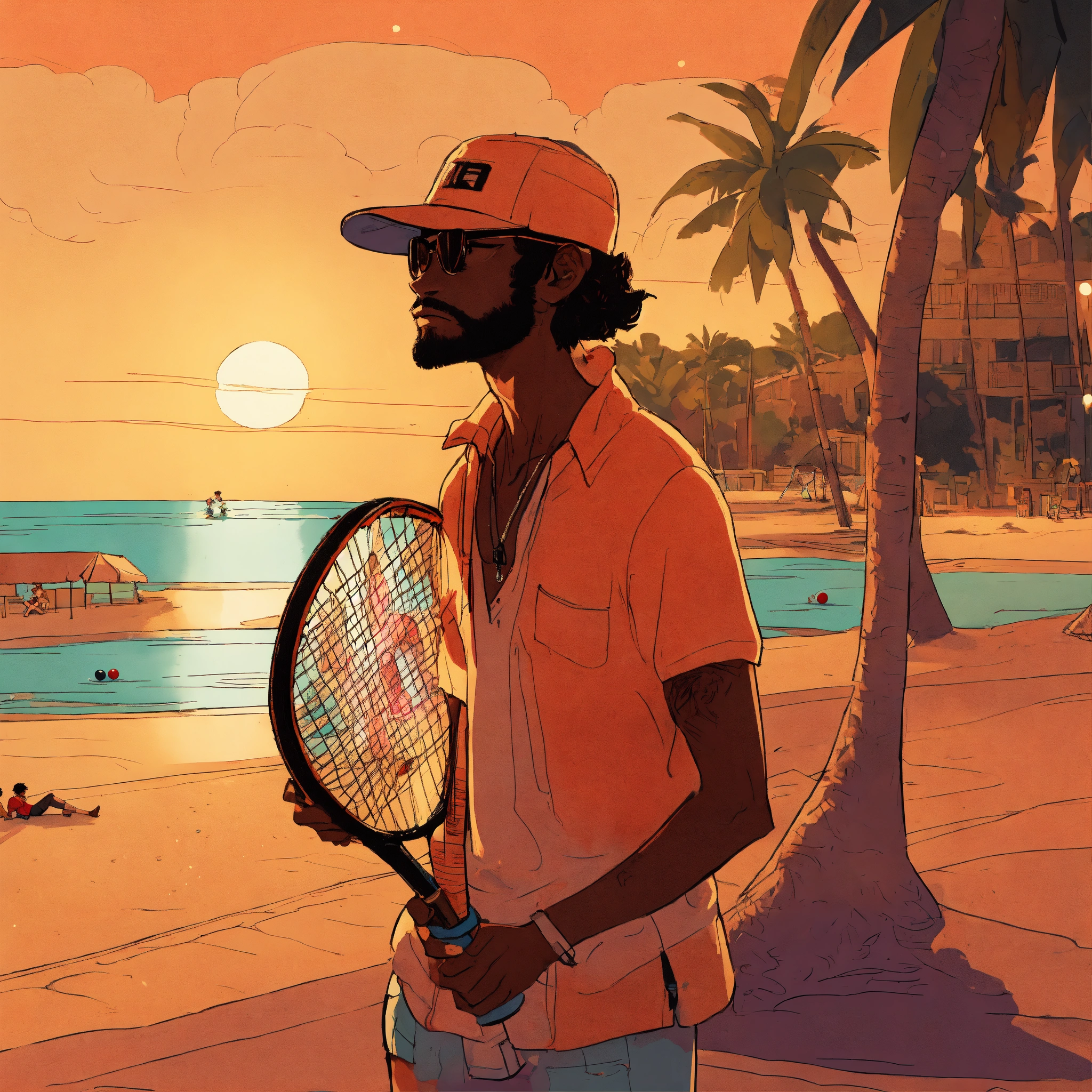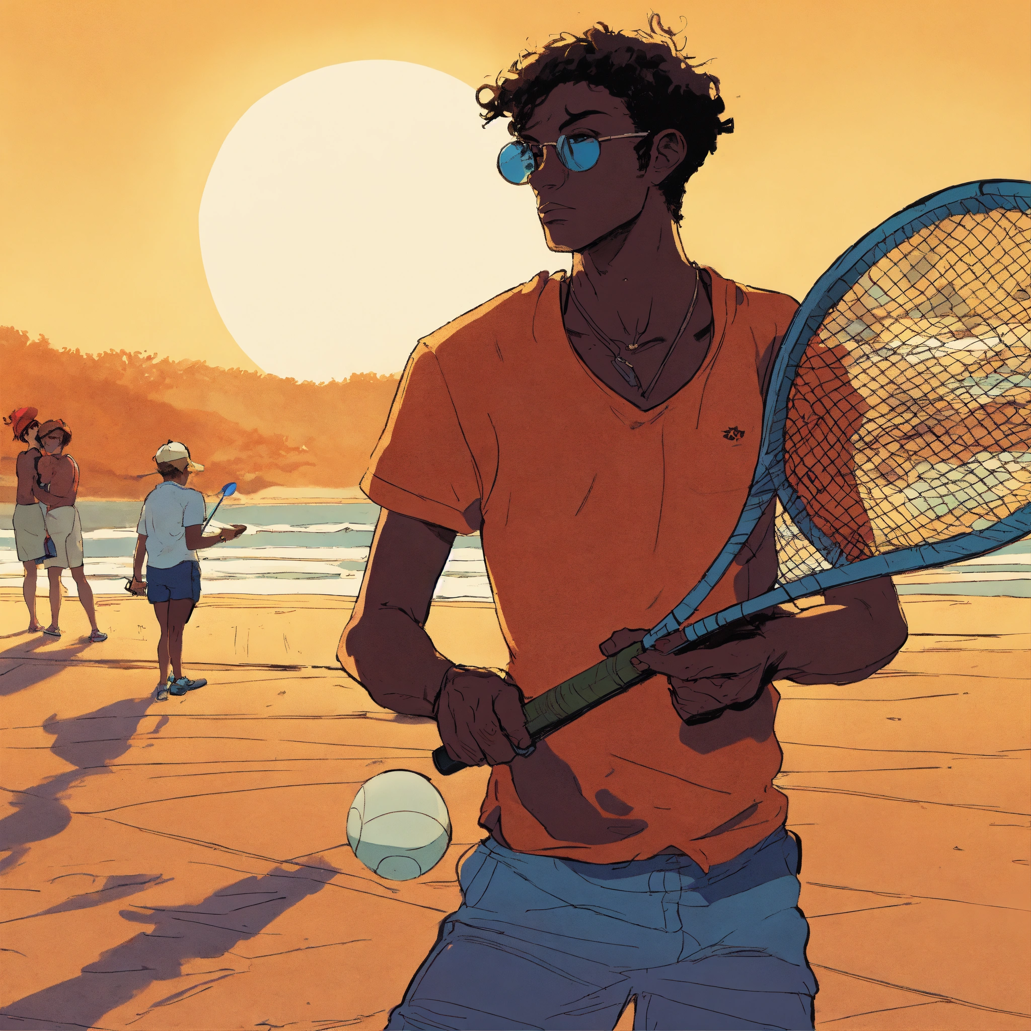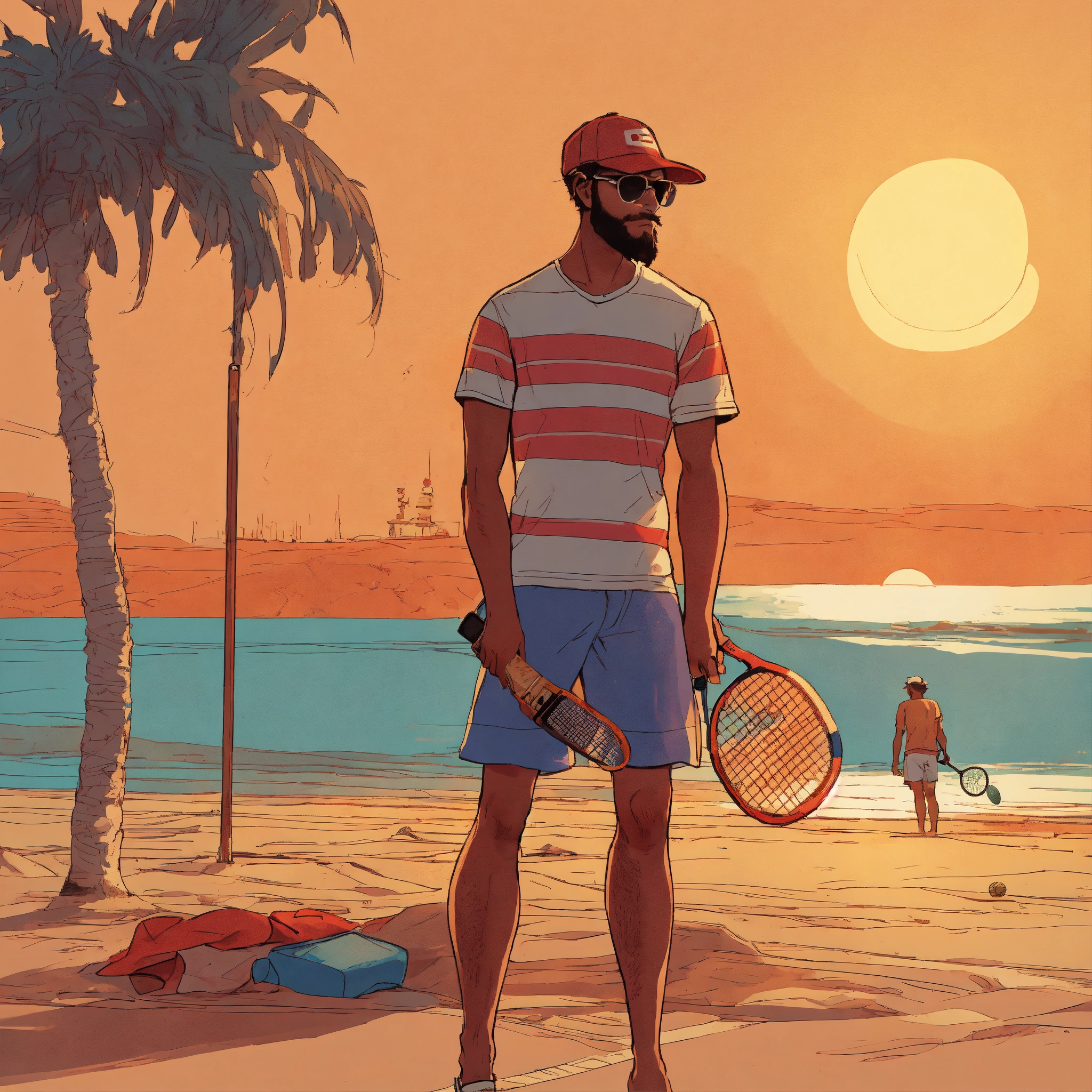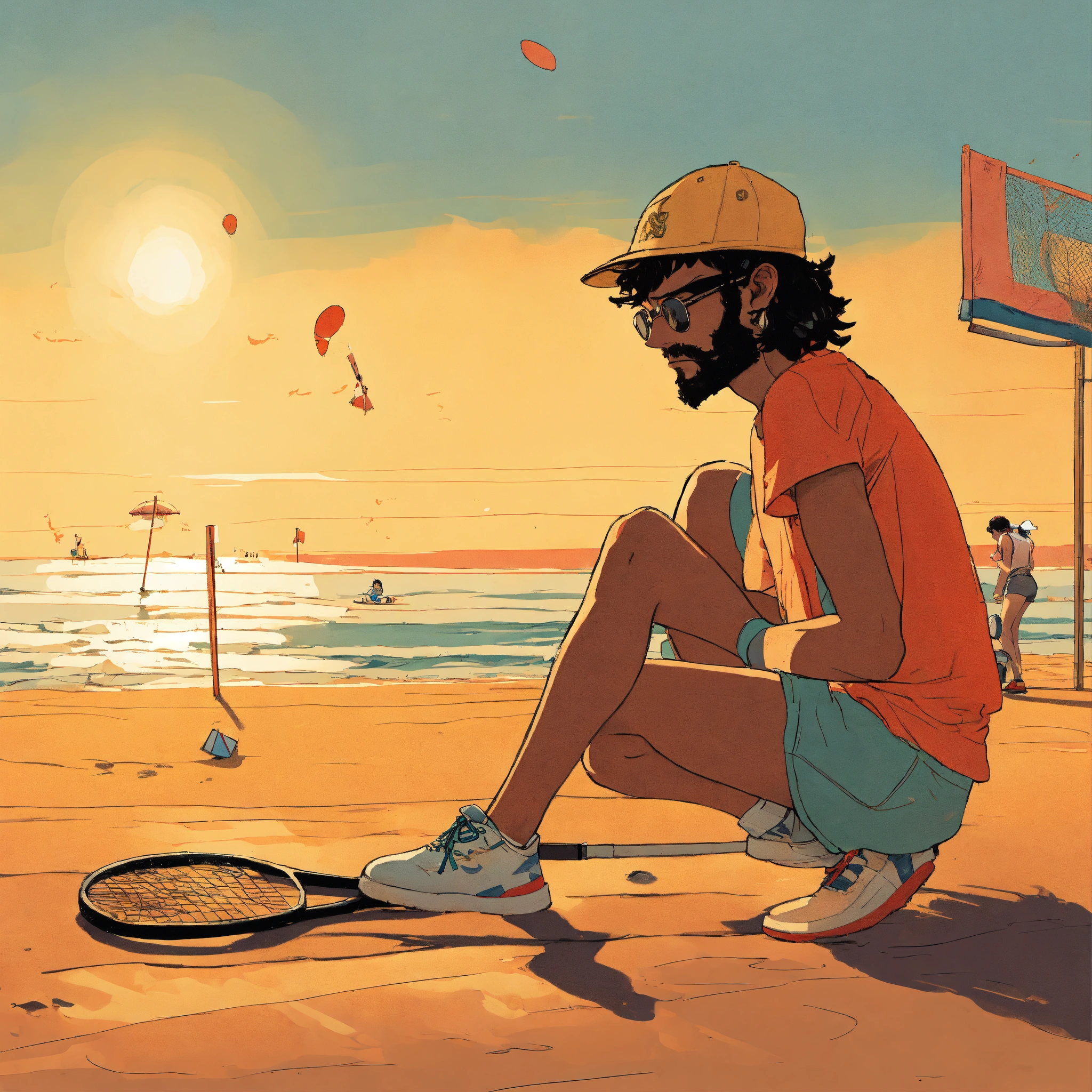 An illustration of jamie hewlett's style showing a beach tennis player inspecting a raquette closely, trying to discern its authenticity. warm color temperature. the player has a skeptical expression. soft lighting, relaxed beach atmosphere. --v 5 --stylize 1000