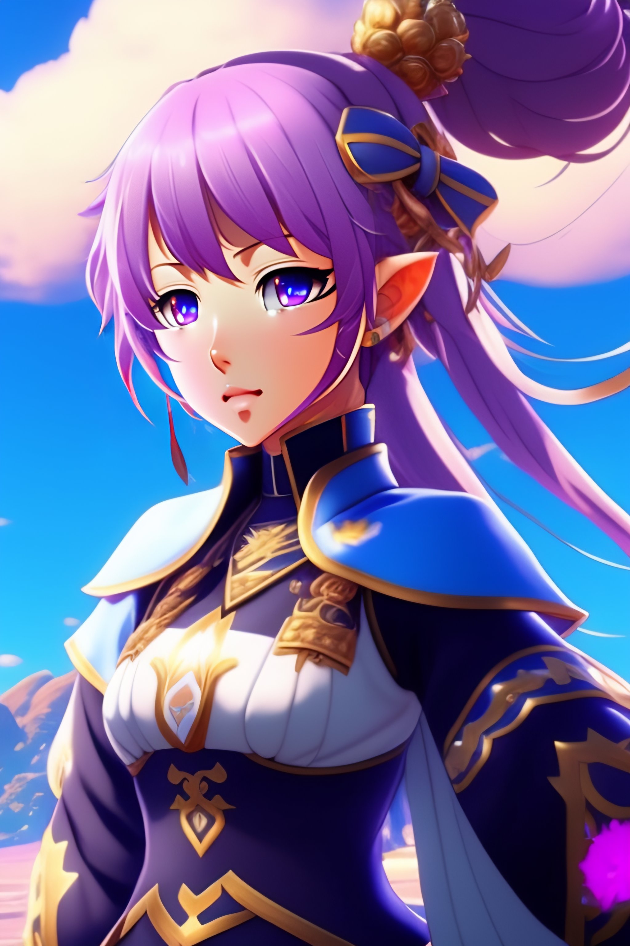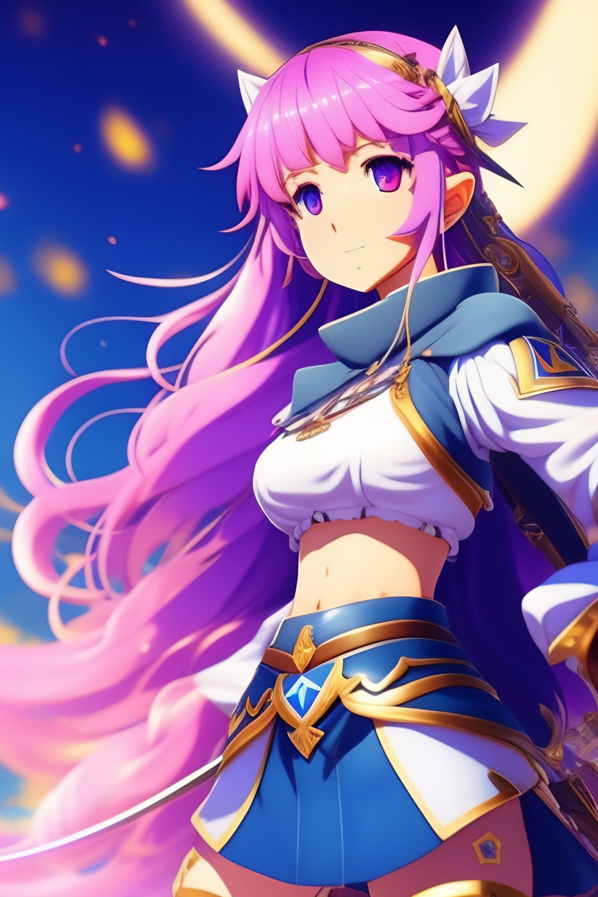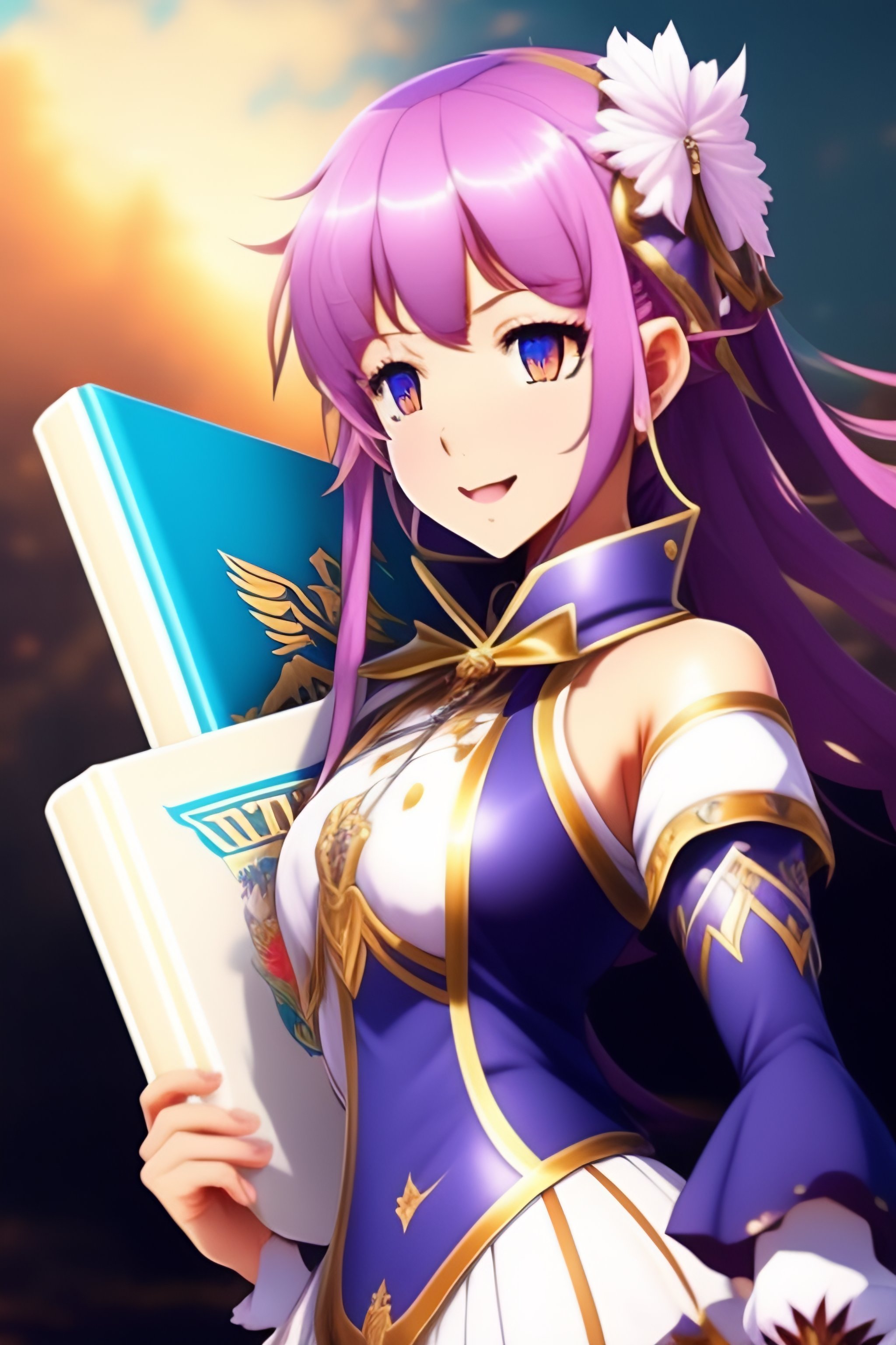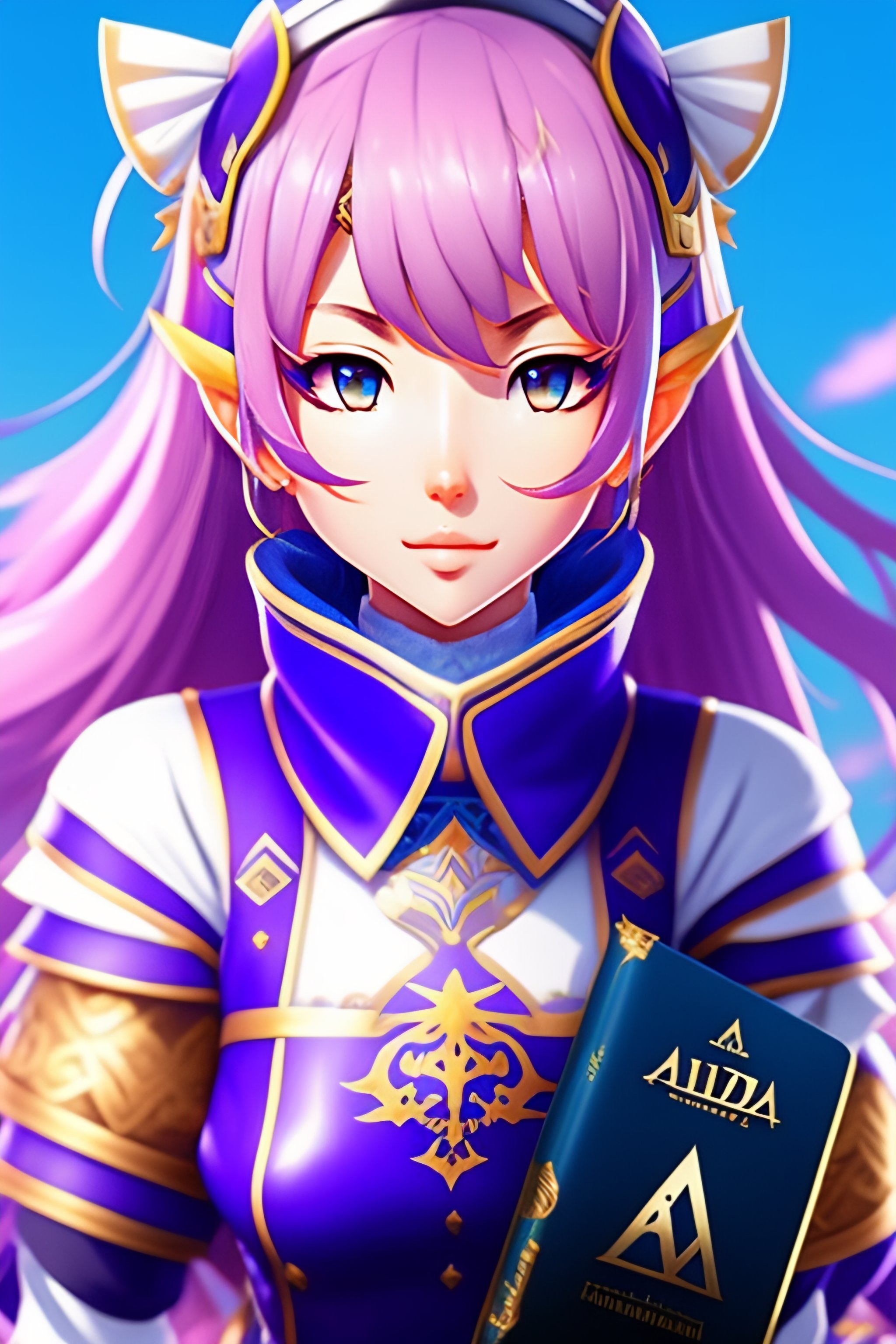 A full body picture of aimi hada vtuber as a genshin impact character, sexy pose, zelda breath of the wild background. light colors, light pink hair, green eyes, smiling, bows on each side of head, holding a book, blue queen clothes