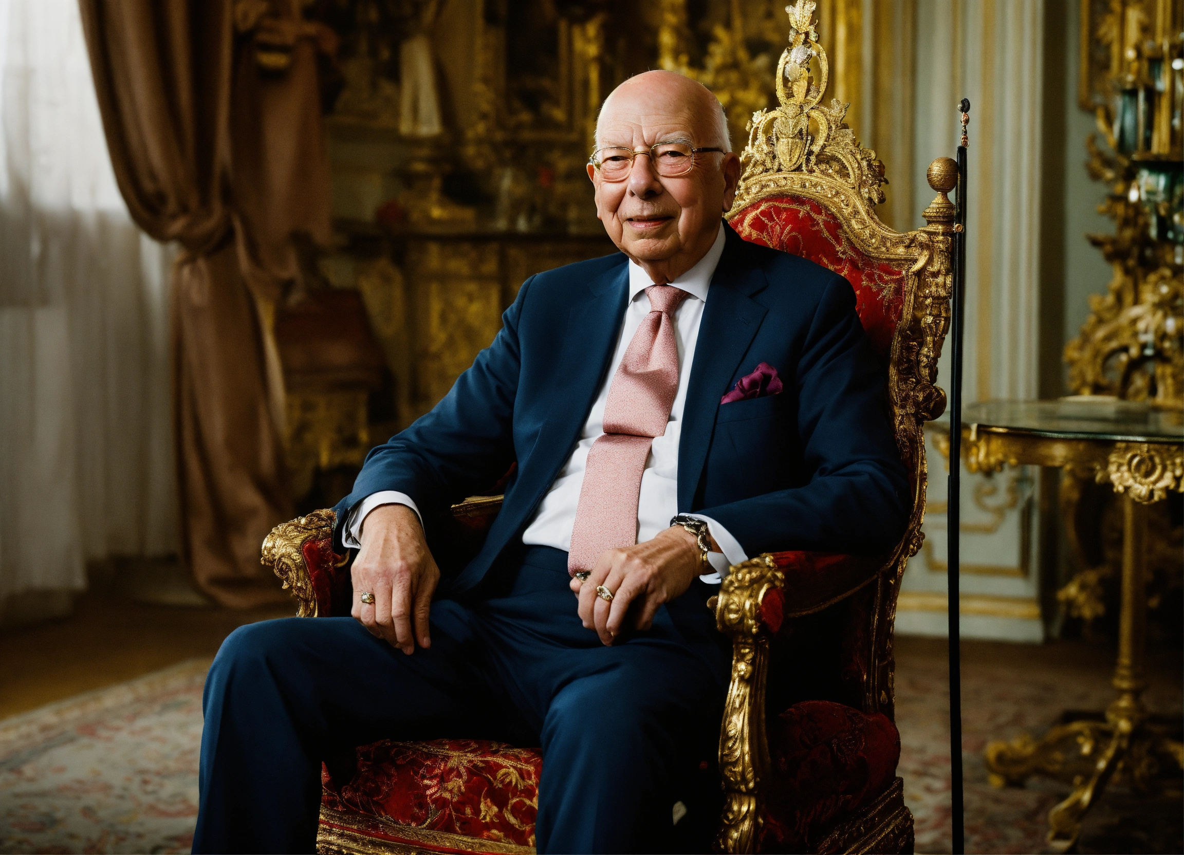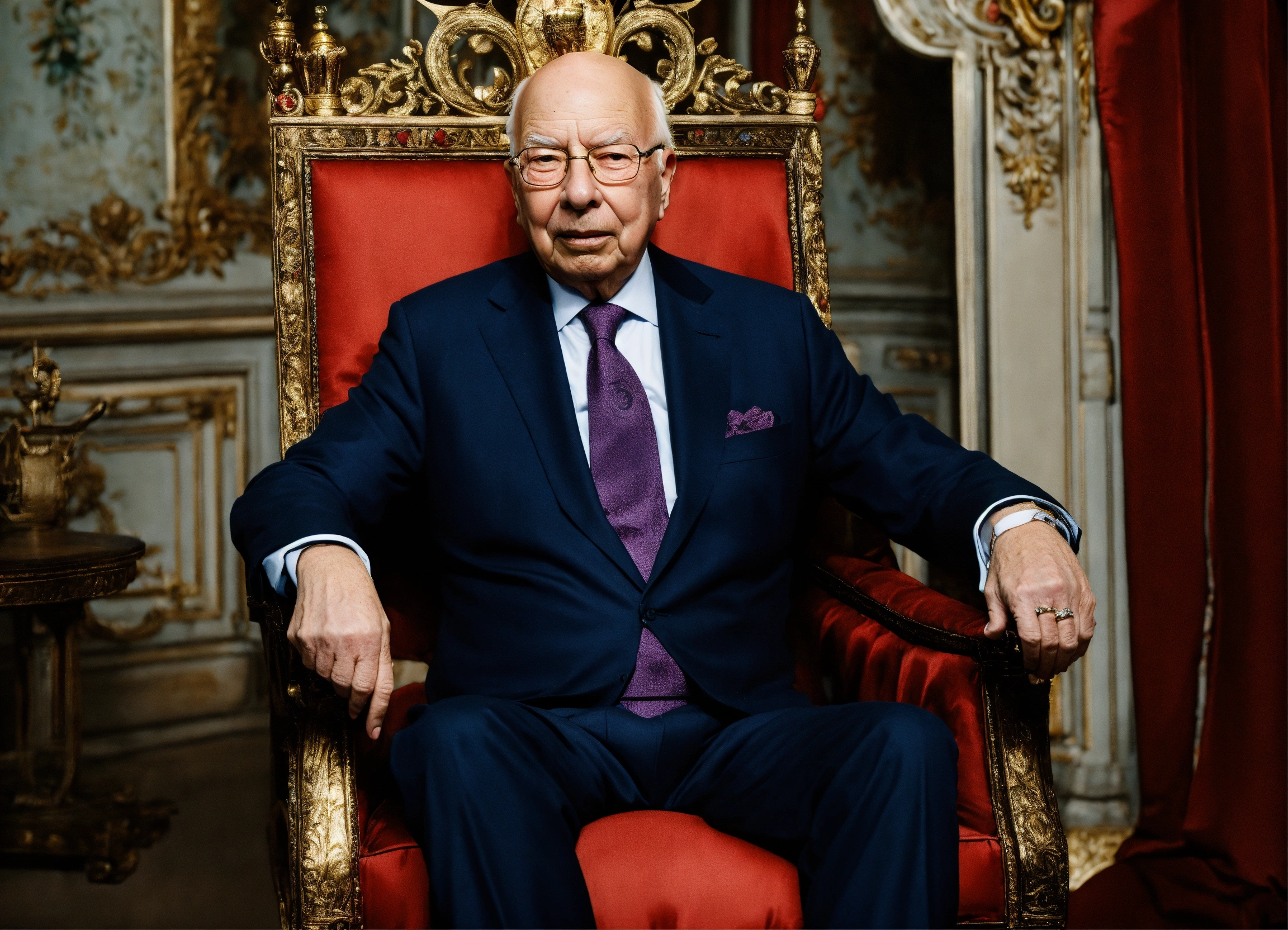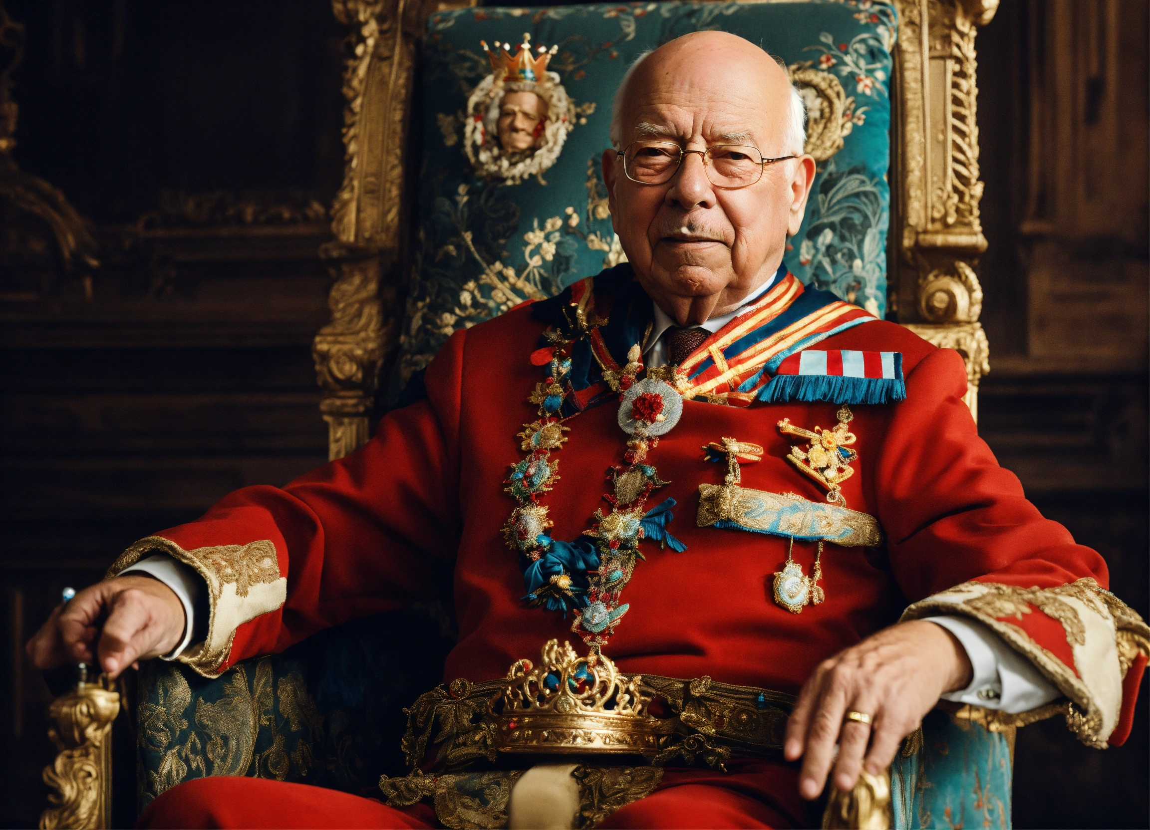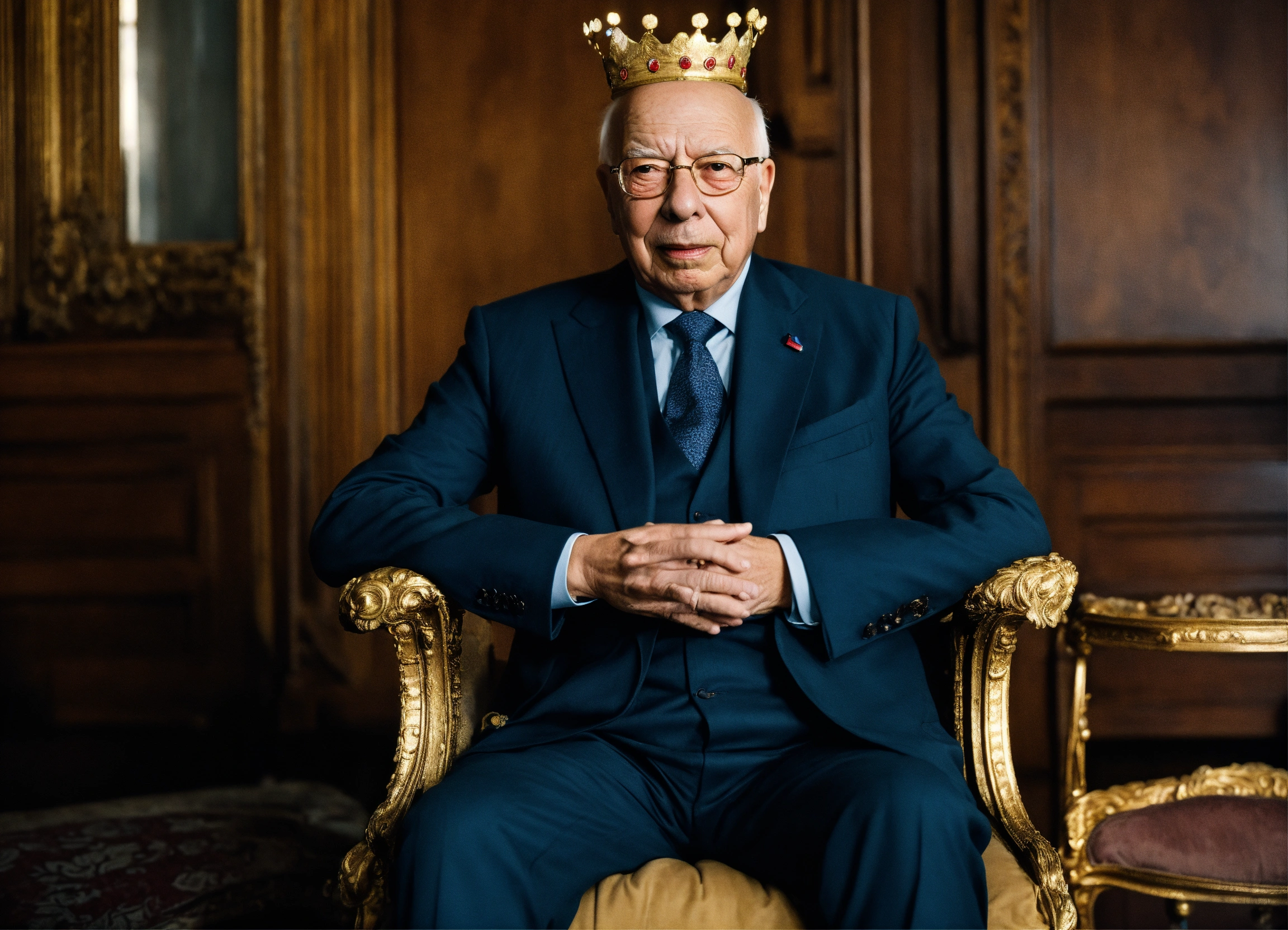 Very old klaus schwab sitting in a chair wearing a crown and holding marionette's