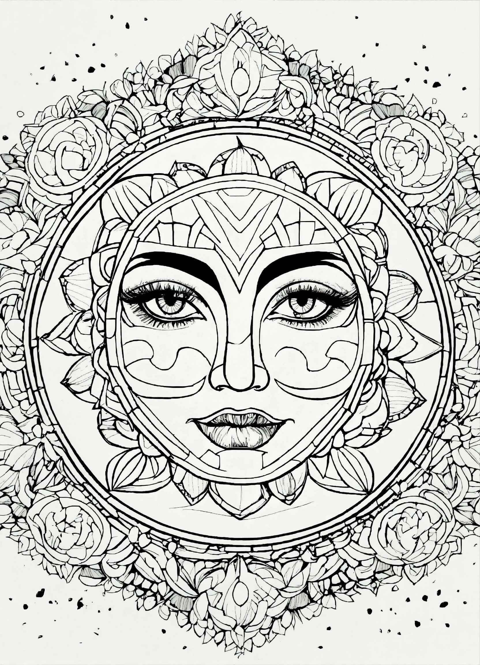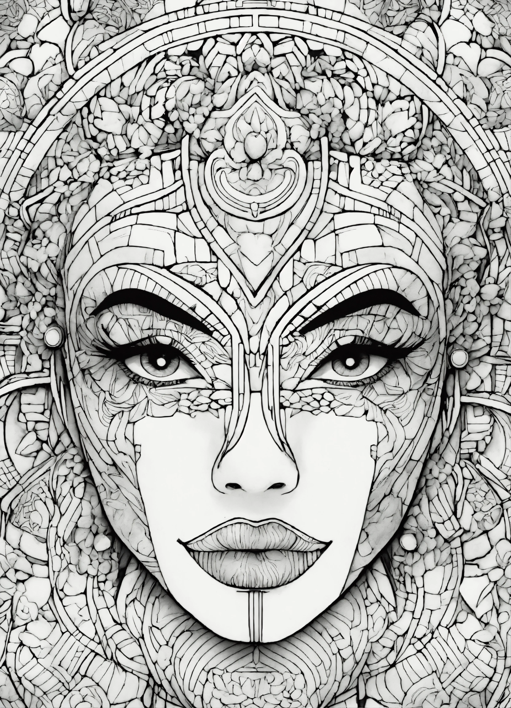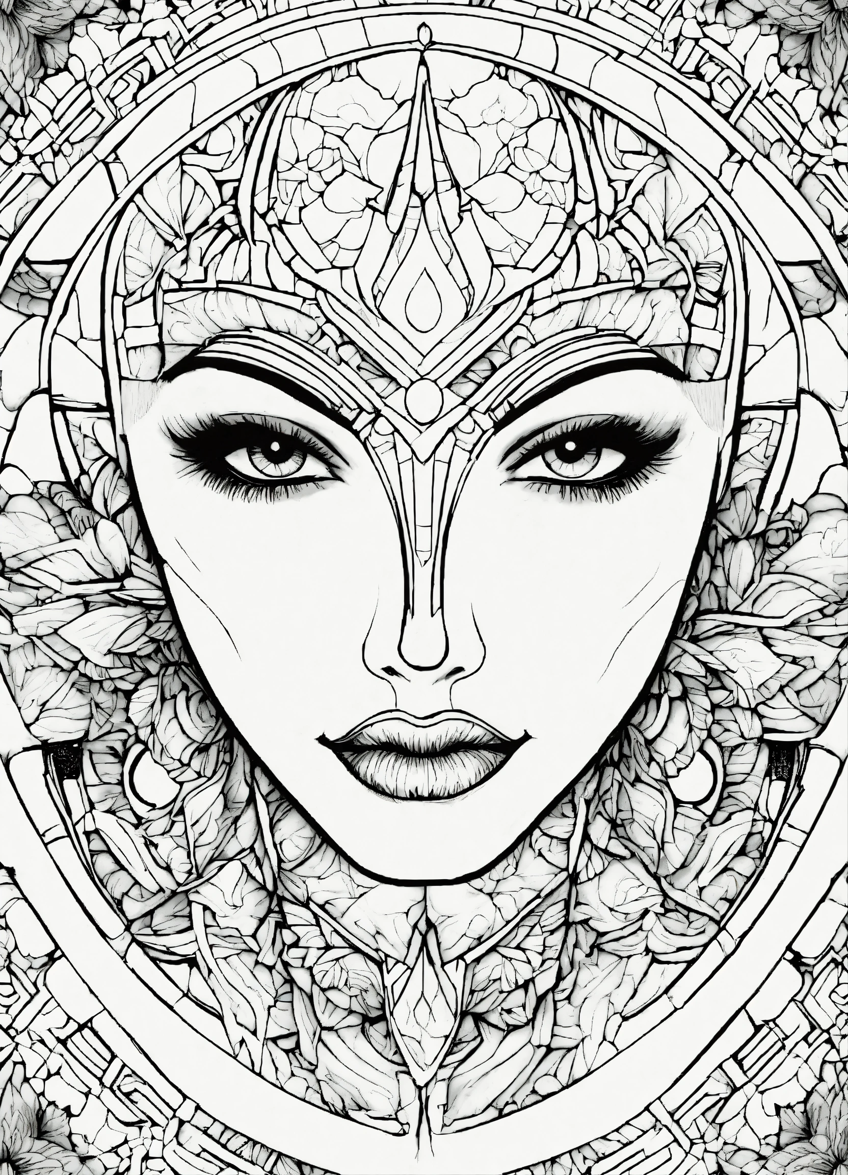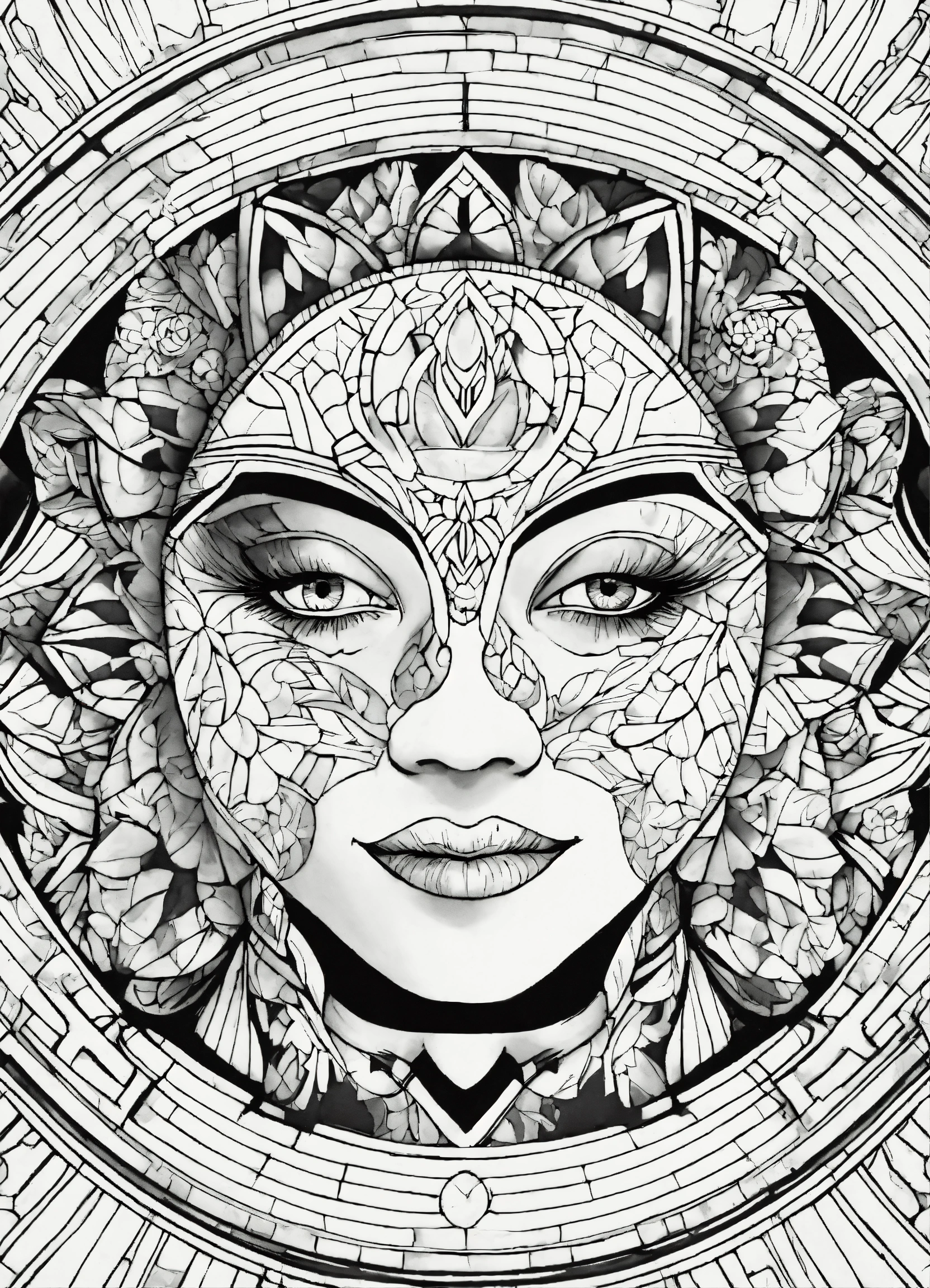 Coloring page for adults, bold lines, dark lines, mandala comic hero body, mandala comic hero face, mandala face, symmetrical, white background