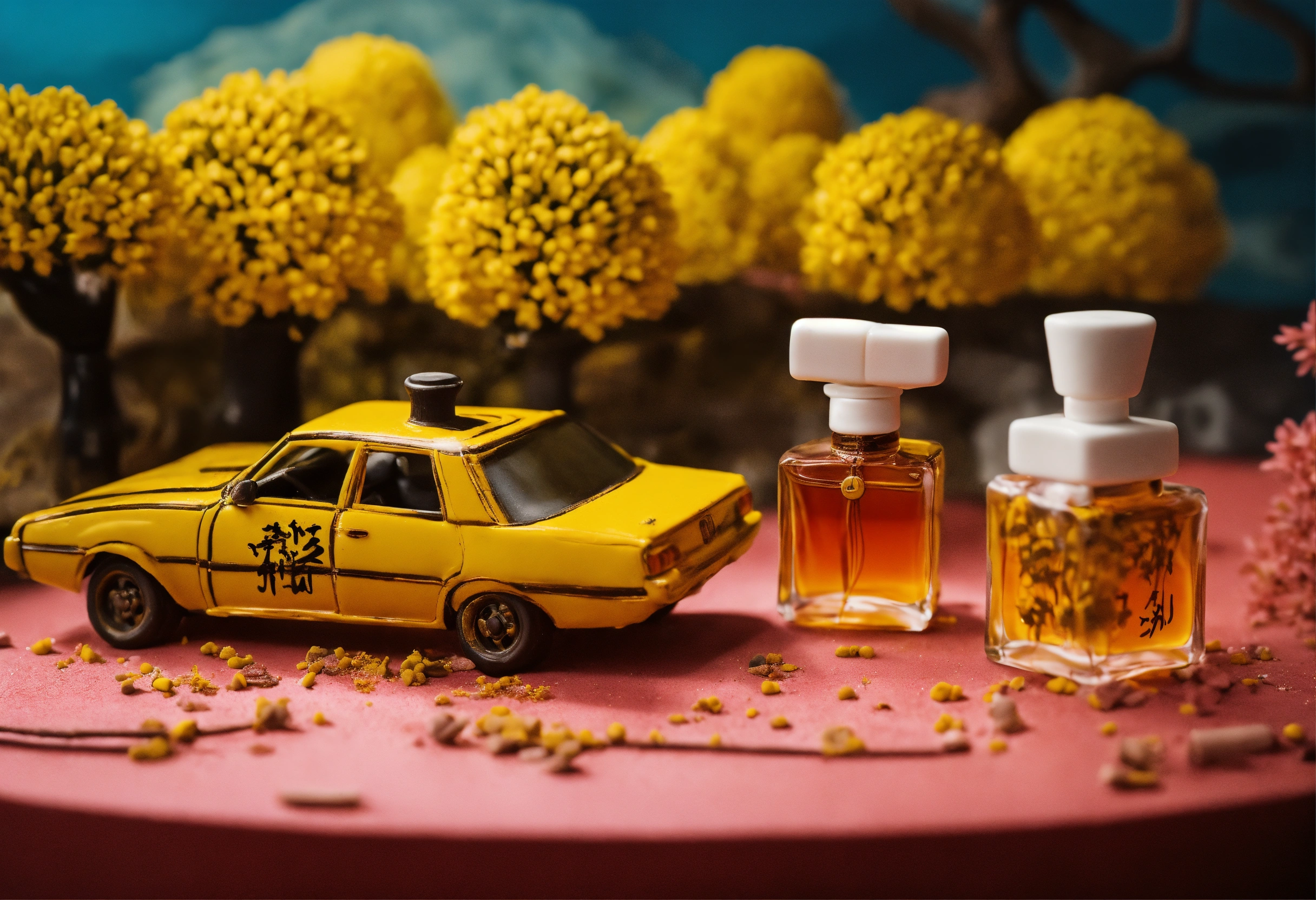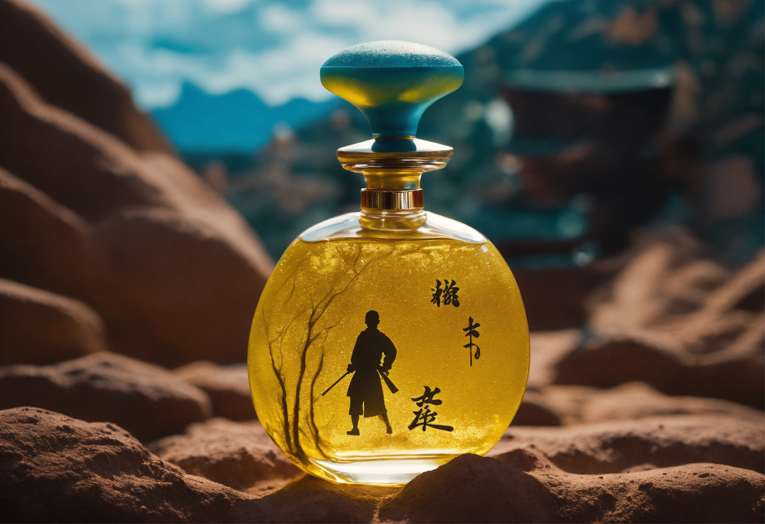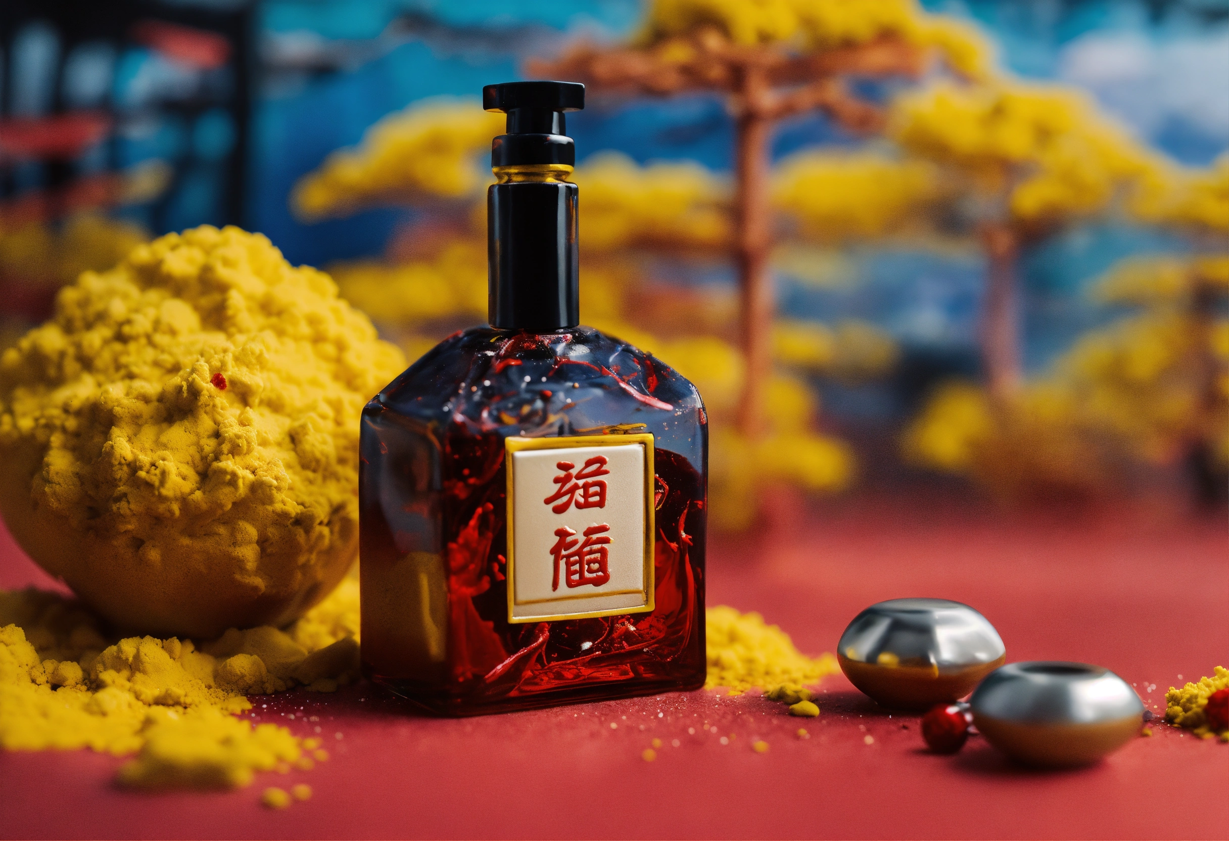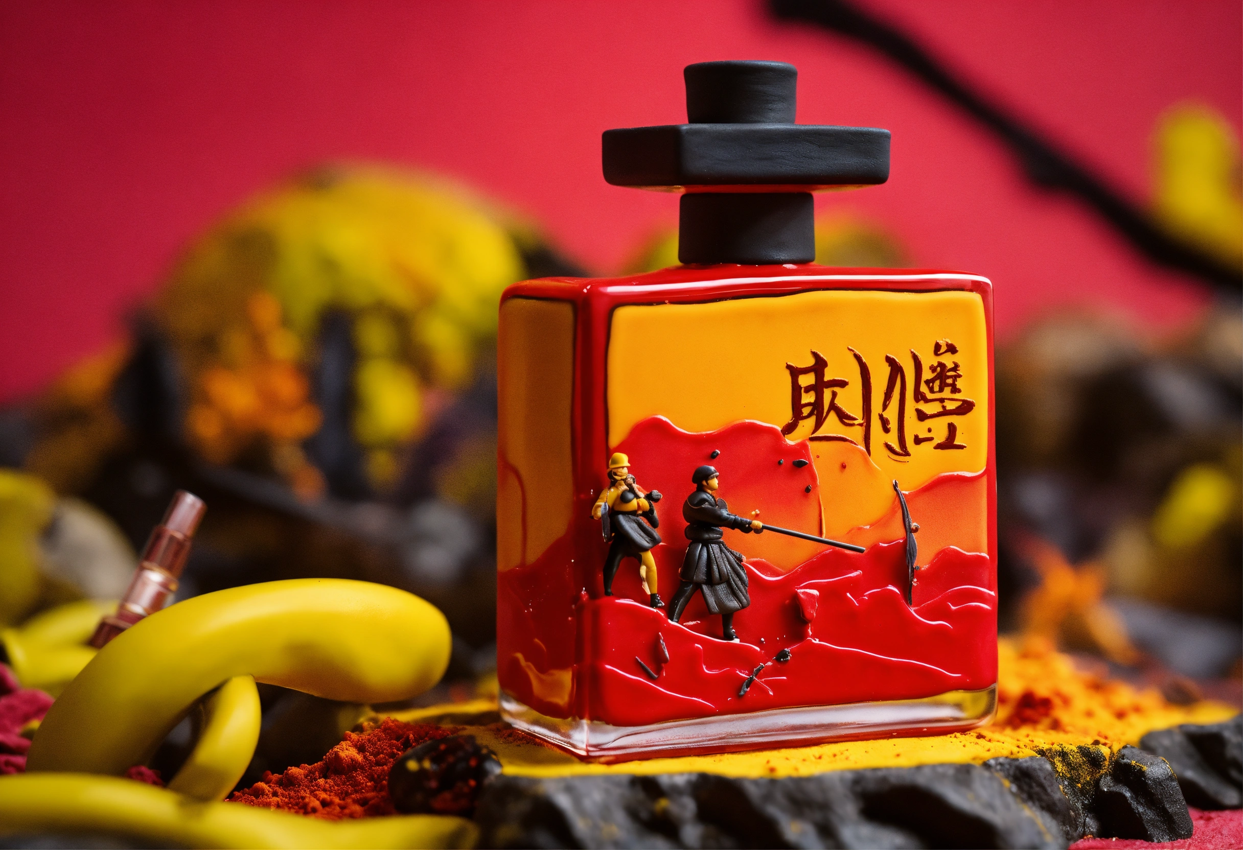 Hand-made modelling clay, stylized violence, pop aesthetics, homage to martial arts lanscape, close-up view of perfume bottle, kill bill universe, movie inspiration