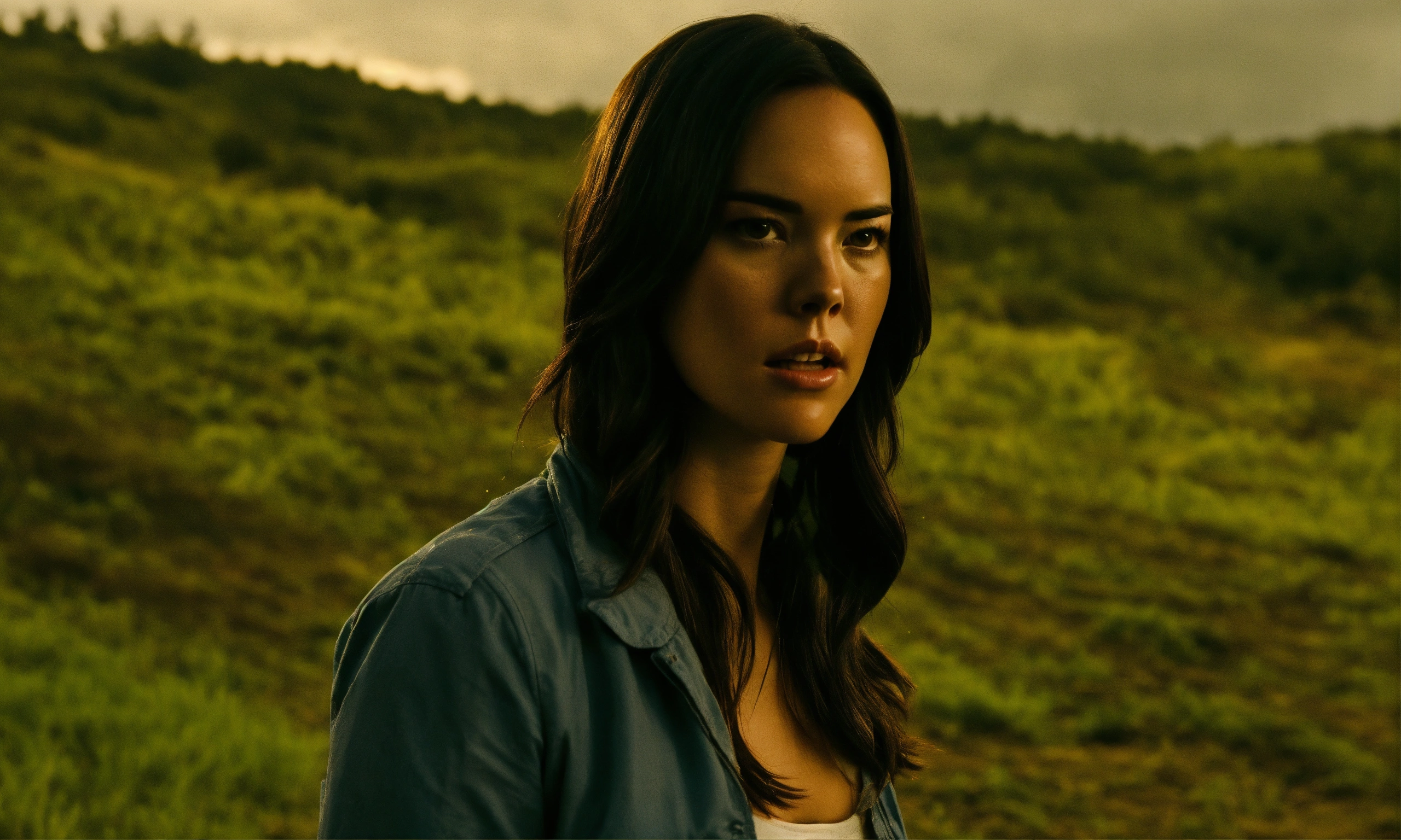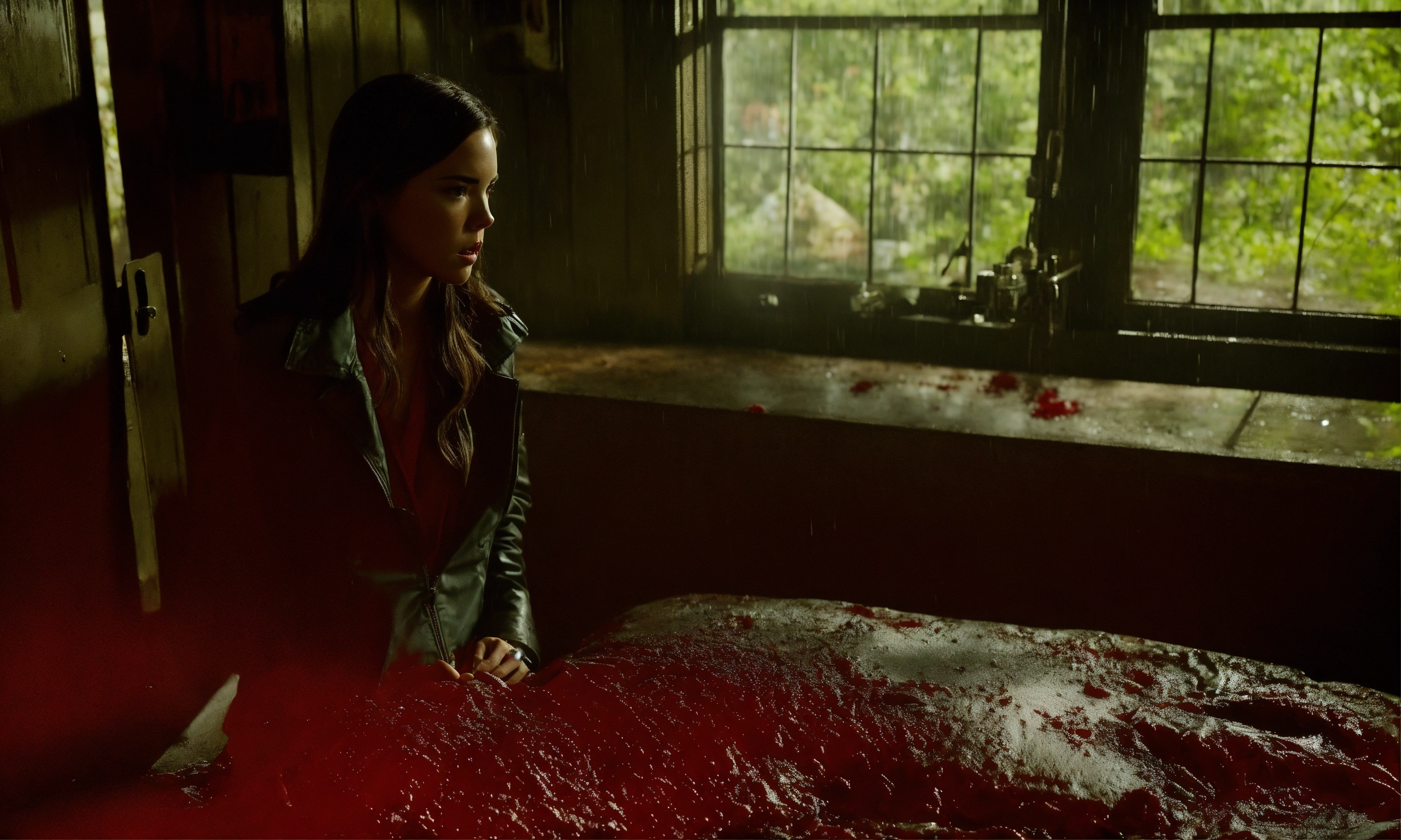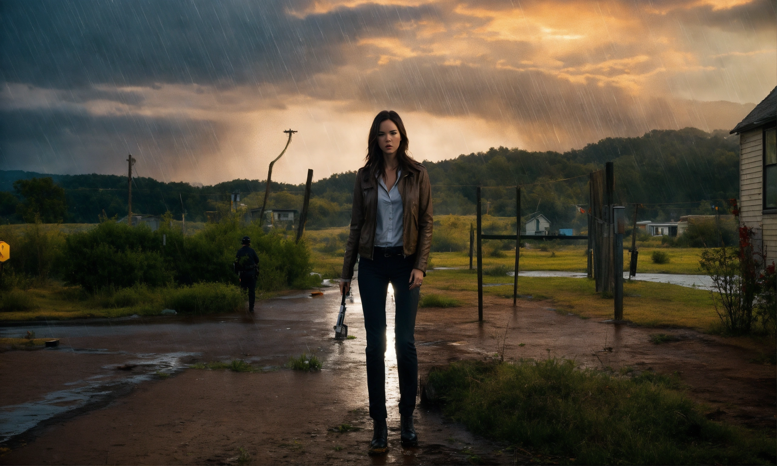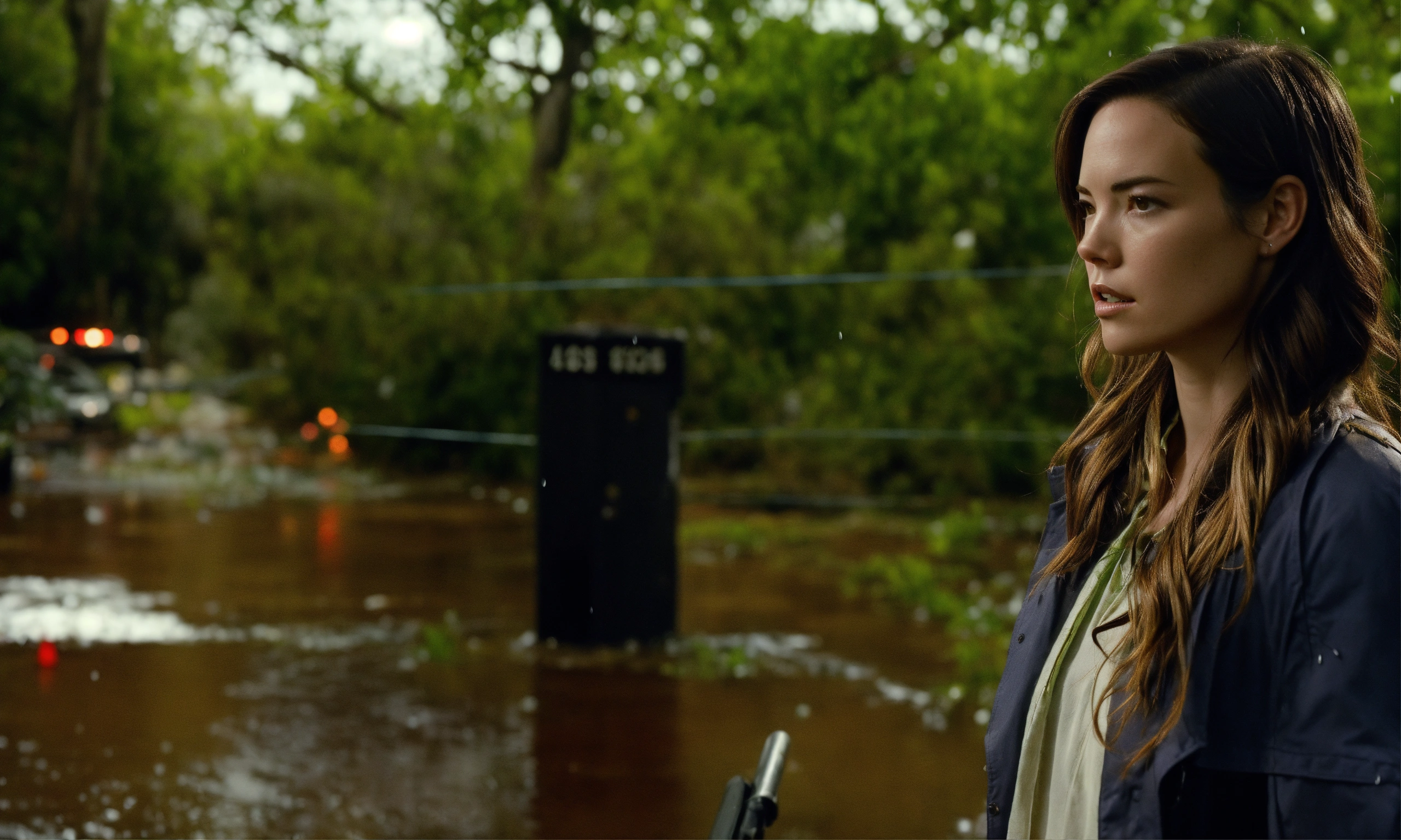 Beautiful 25 years old odette annable crime scene. serial killer hunt, thrilling, rain, dangerous situation.
