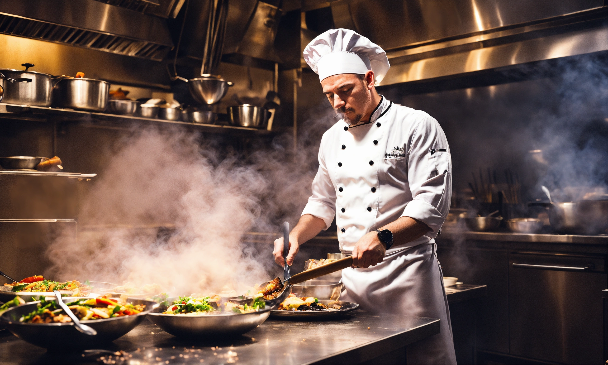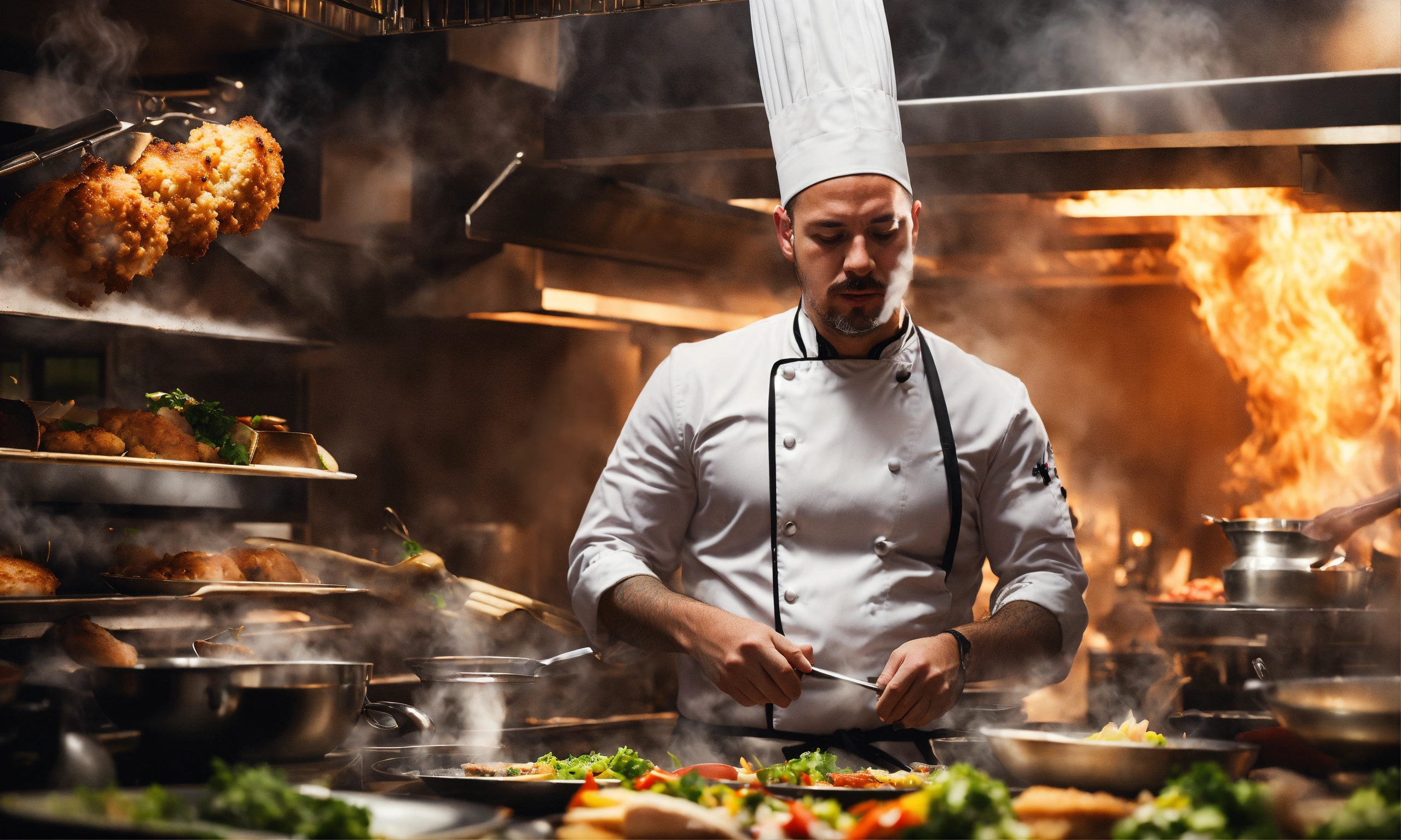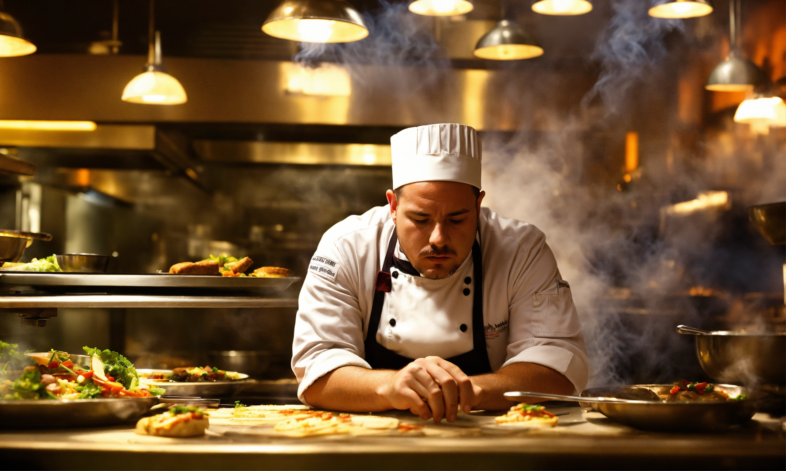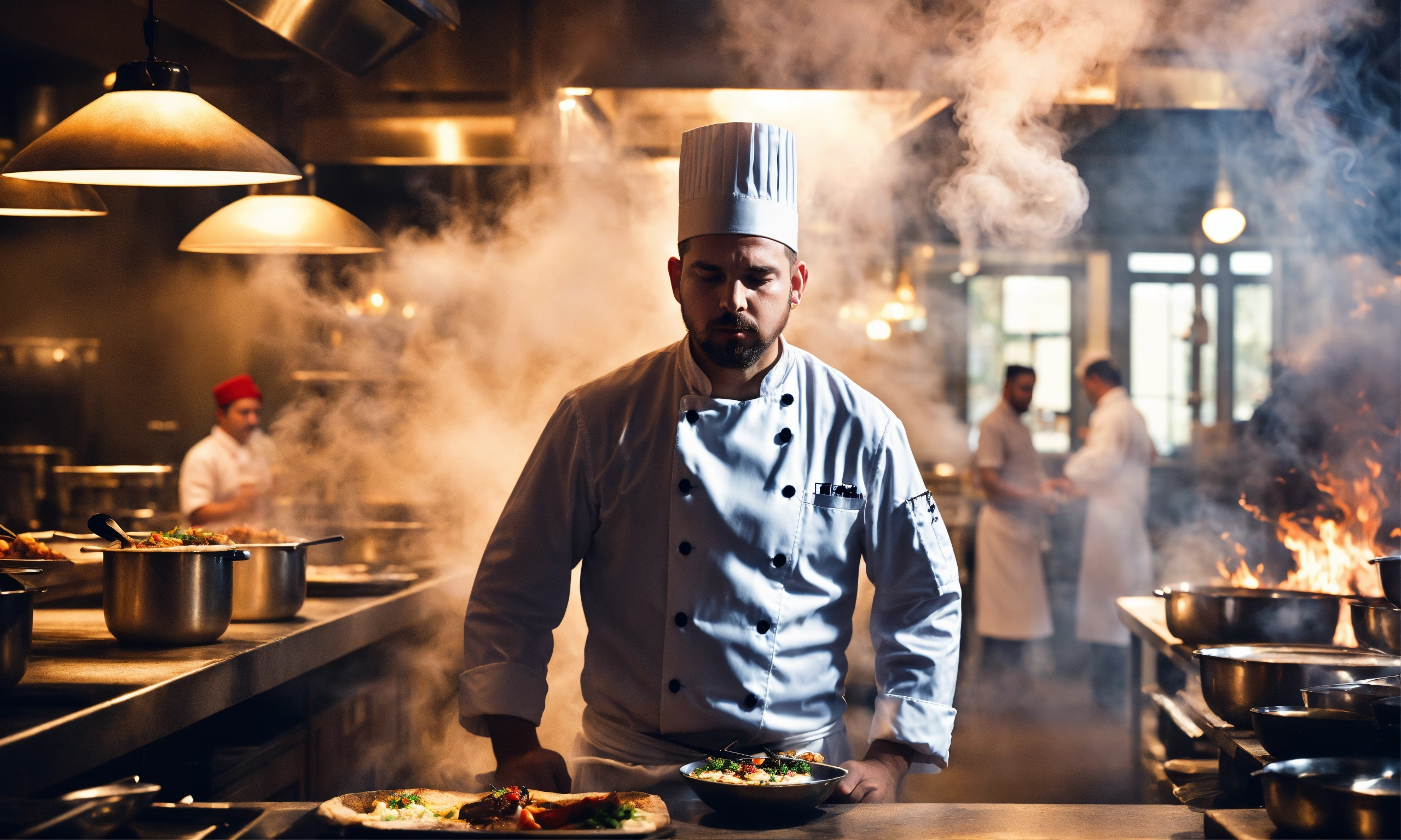 An artistic photo realistic picture of an stressed out chef at a very busy restaurant, hazy smoke in the background