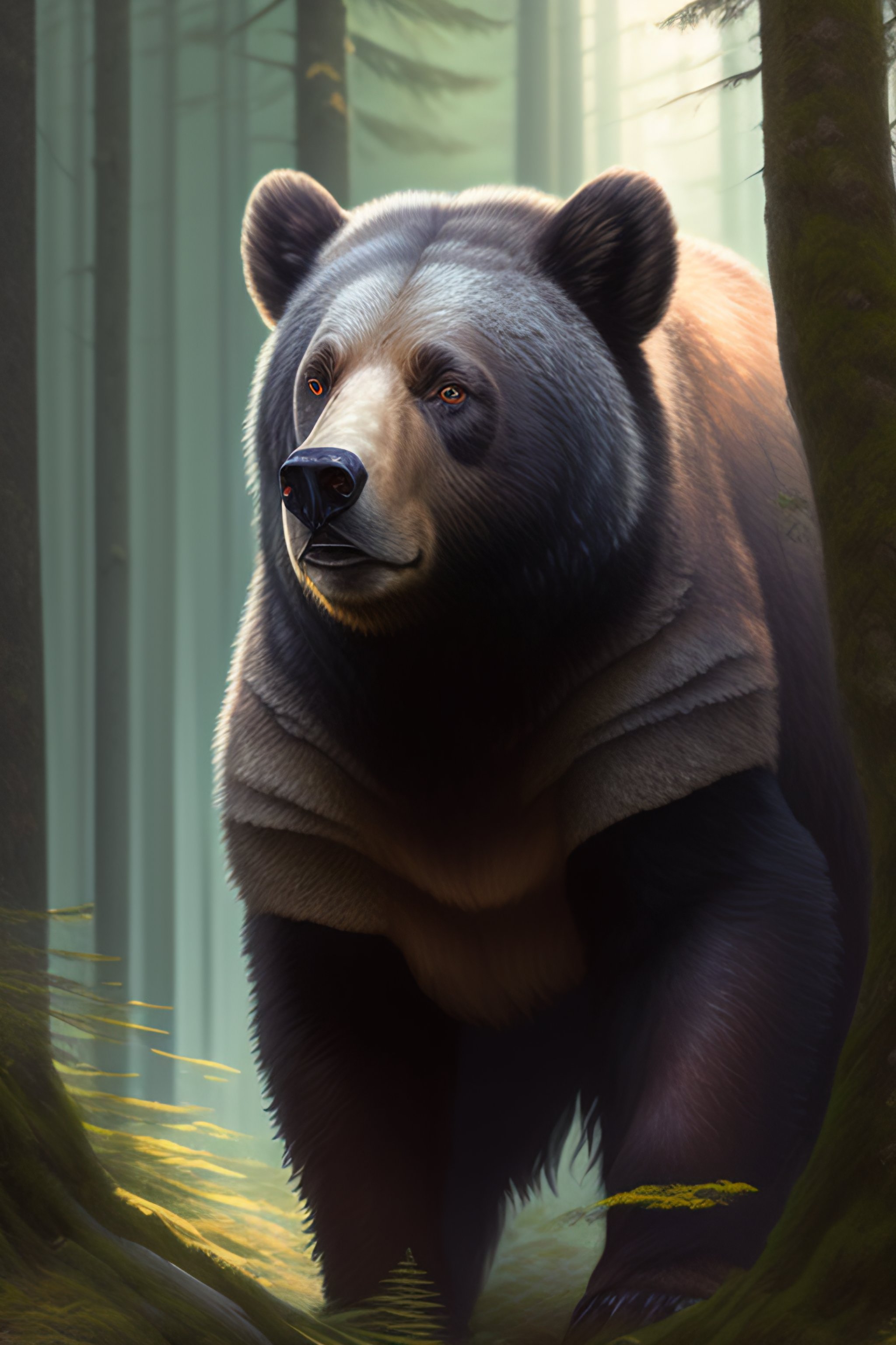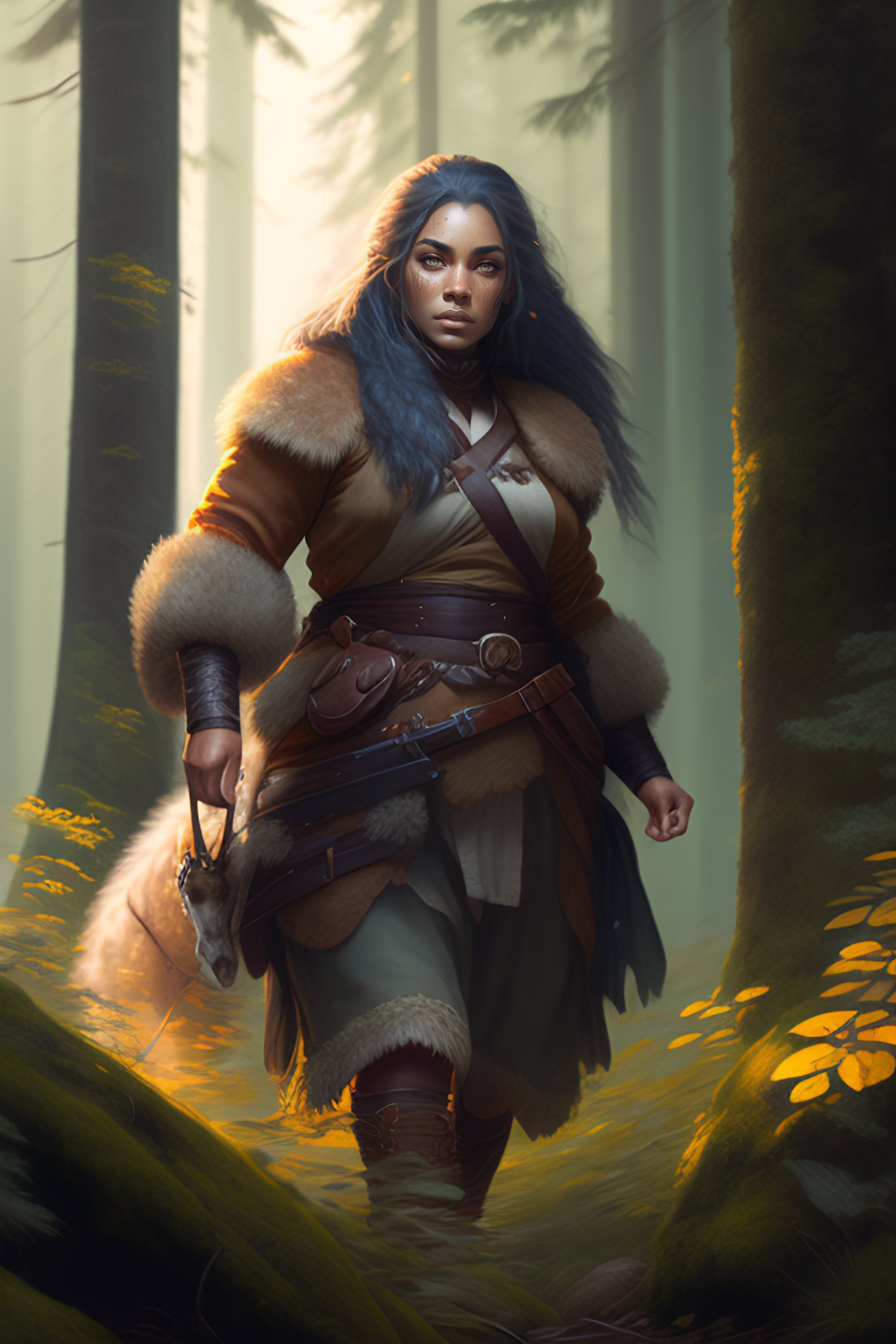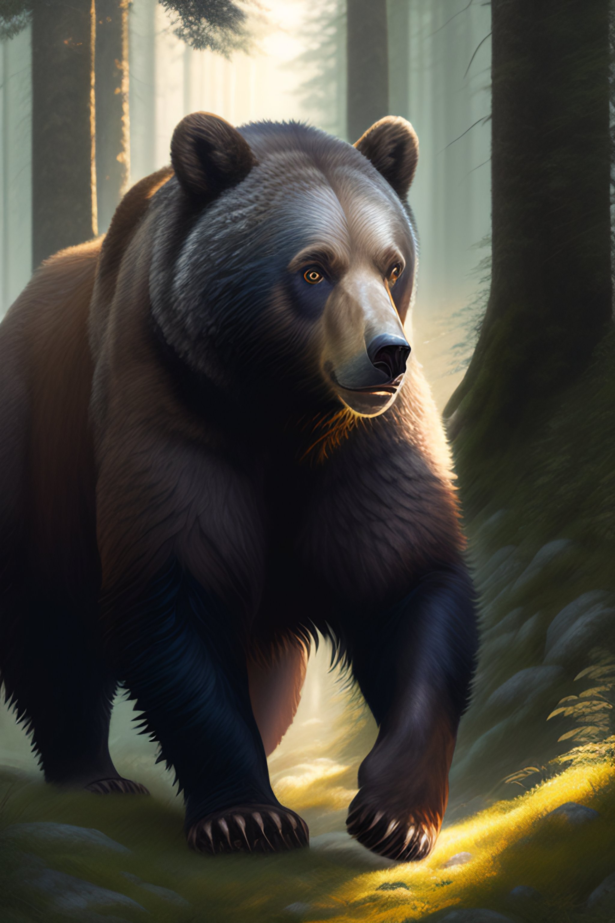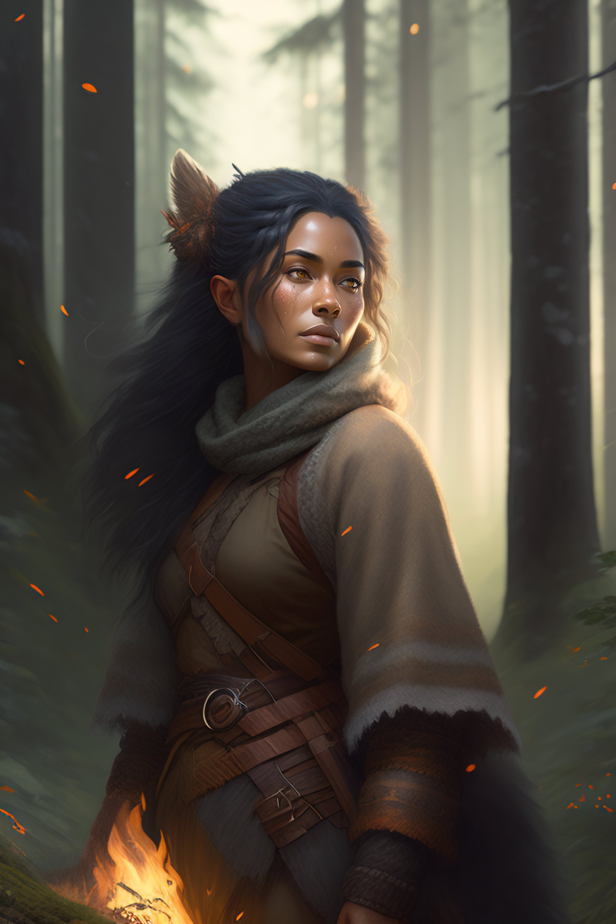 A short female, dwarf, druid, gray hair, face scars, brown skin, summer forest, realistic, intricat, concept art, fighting a bear, by greg rutkowski