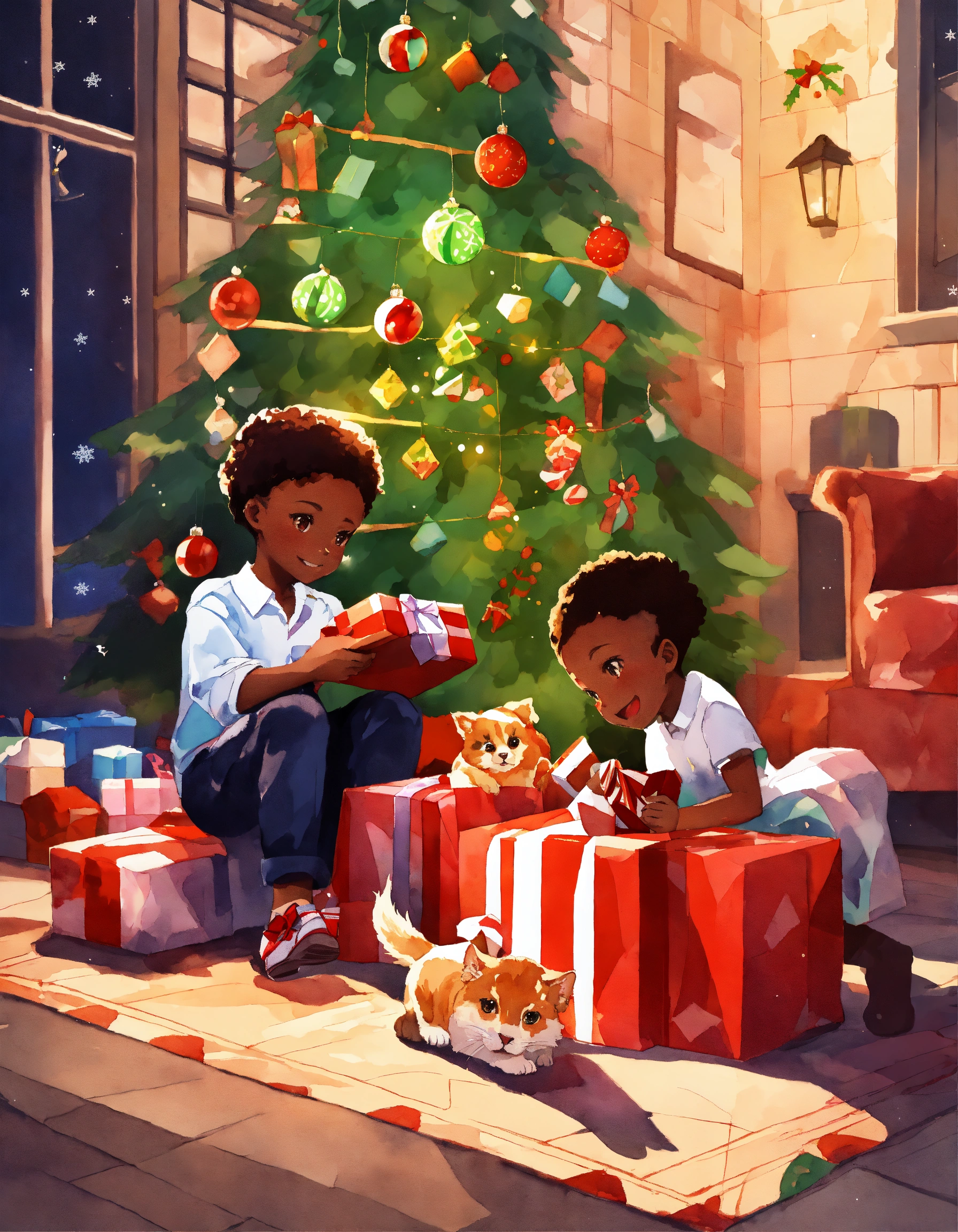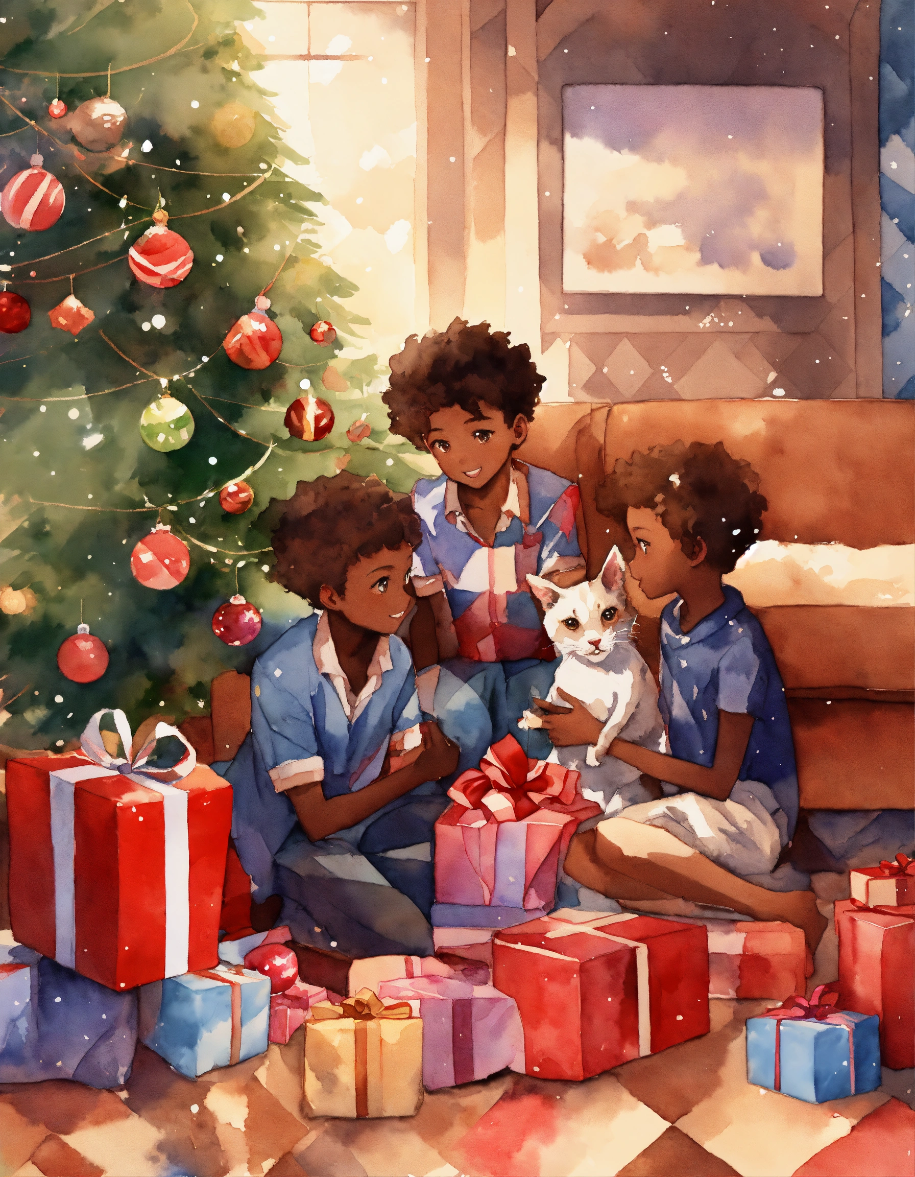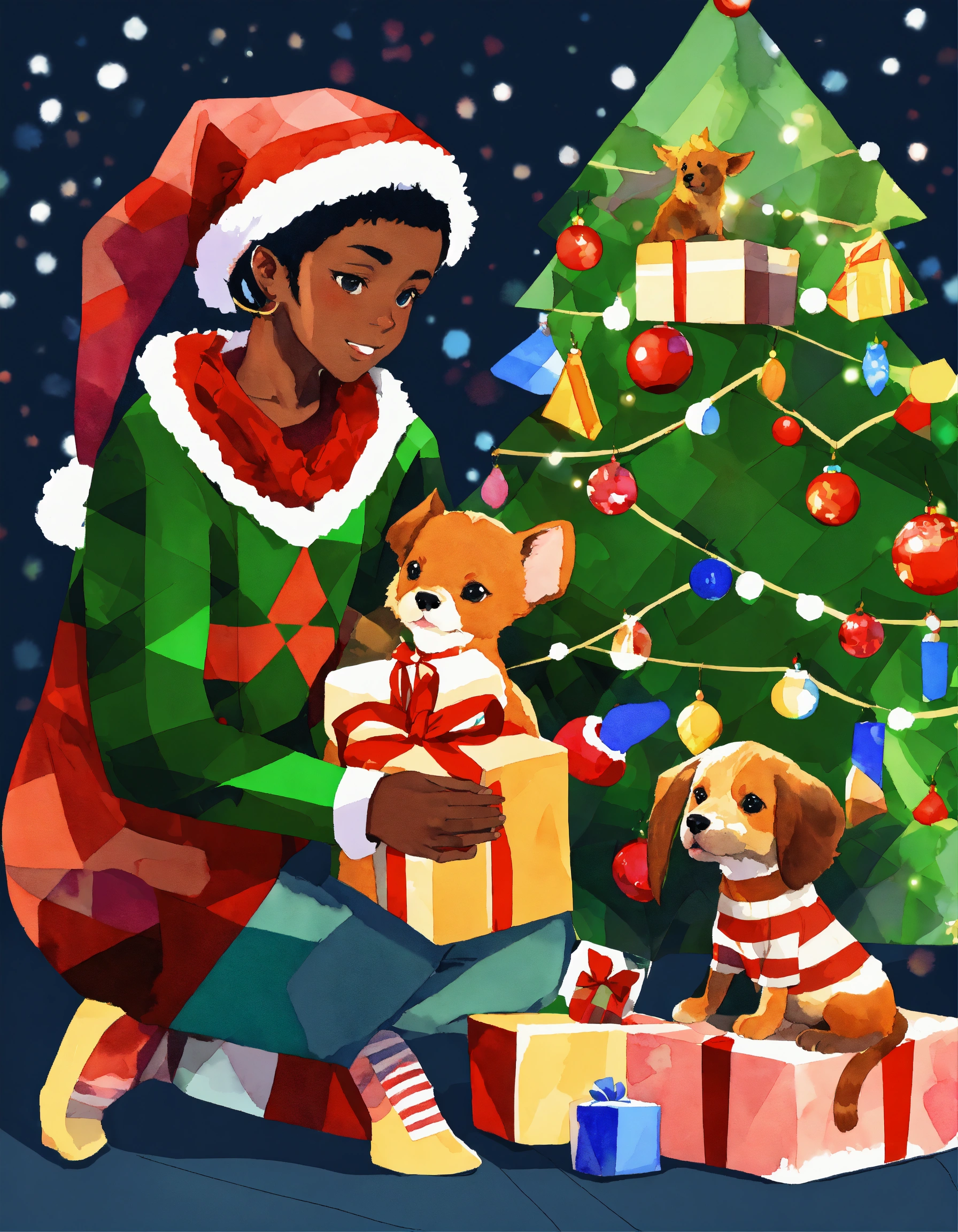 Moe stylized anime, pets and african american dark complexion children playing with presents and ornaments under a christmas tree, background a watercolor argyle pattern, rule of thirds, low poly argyle background