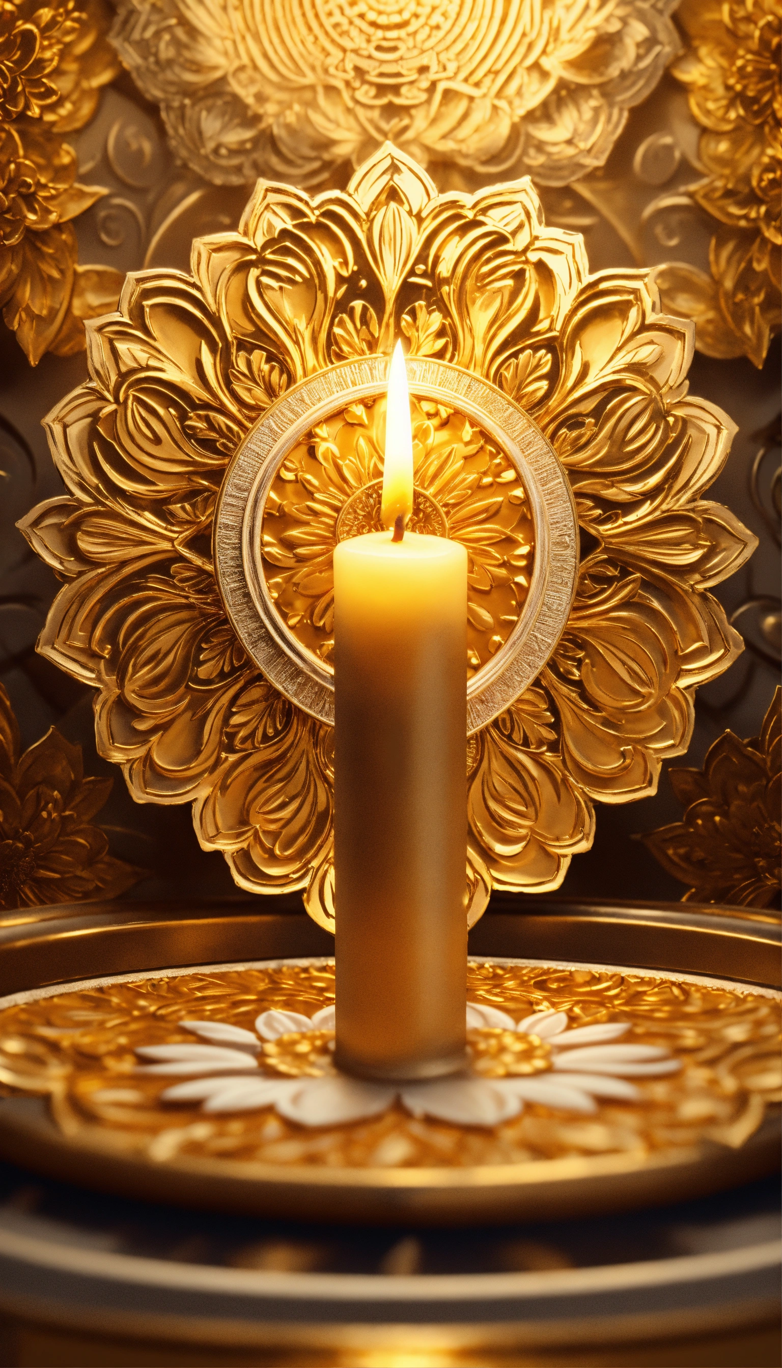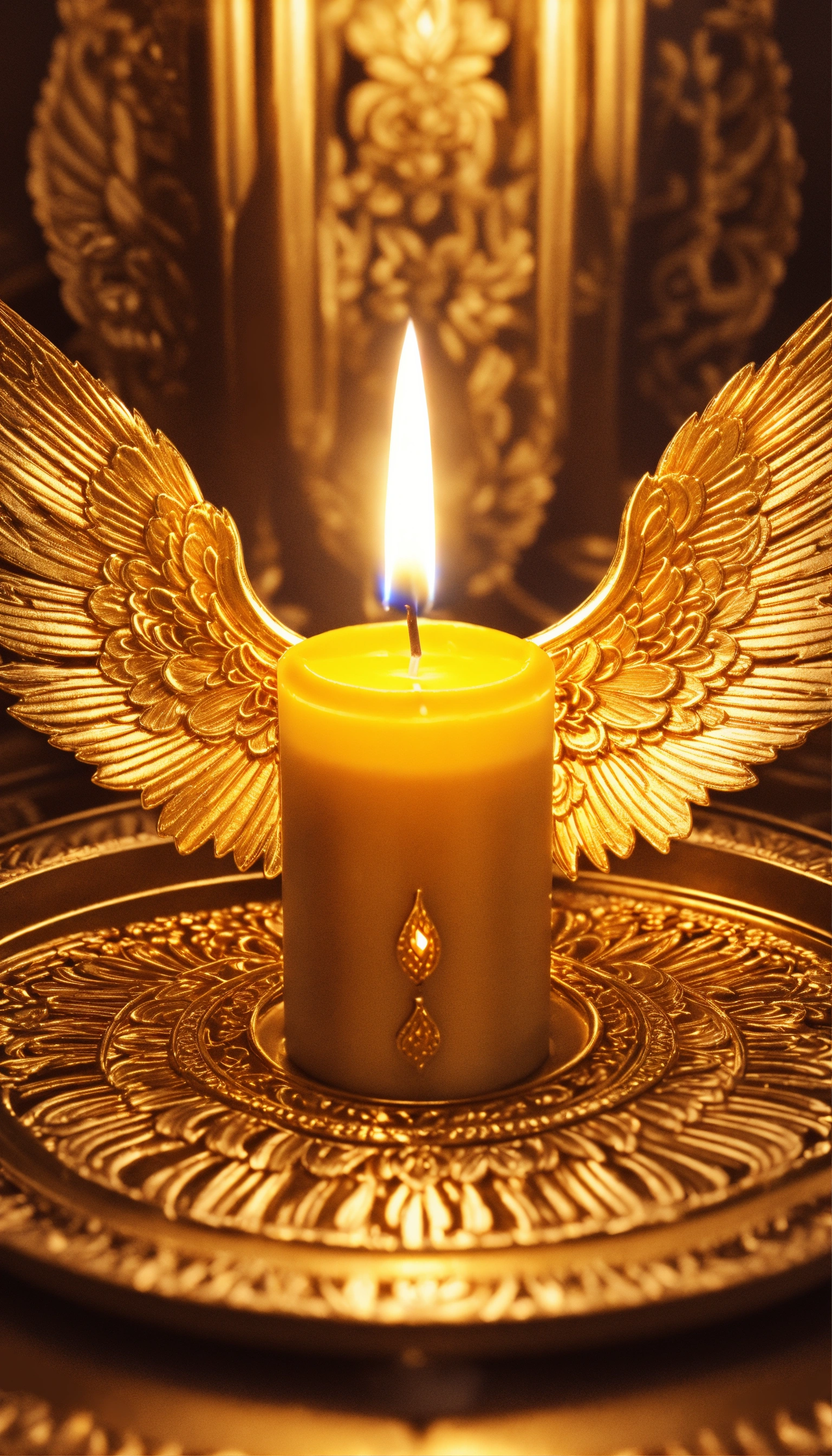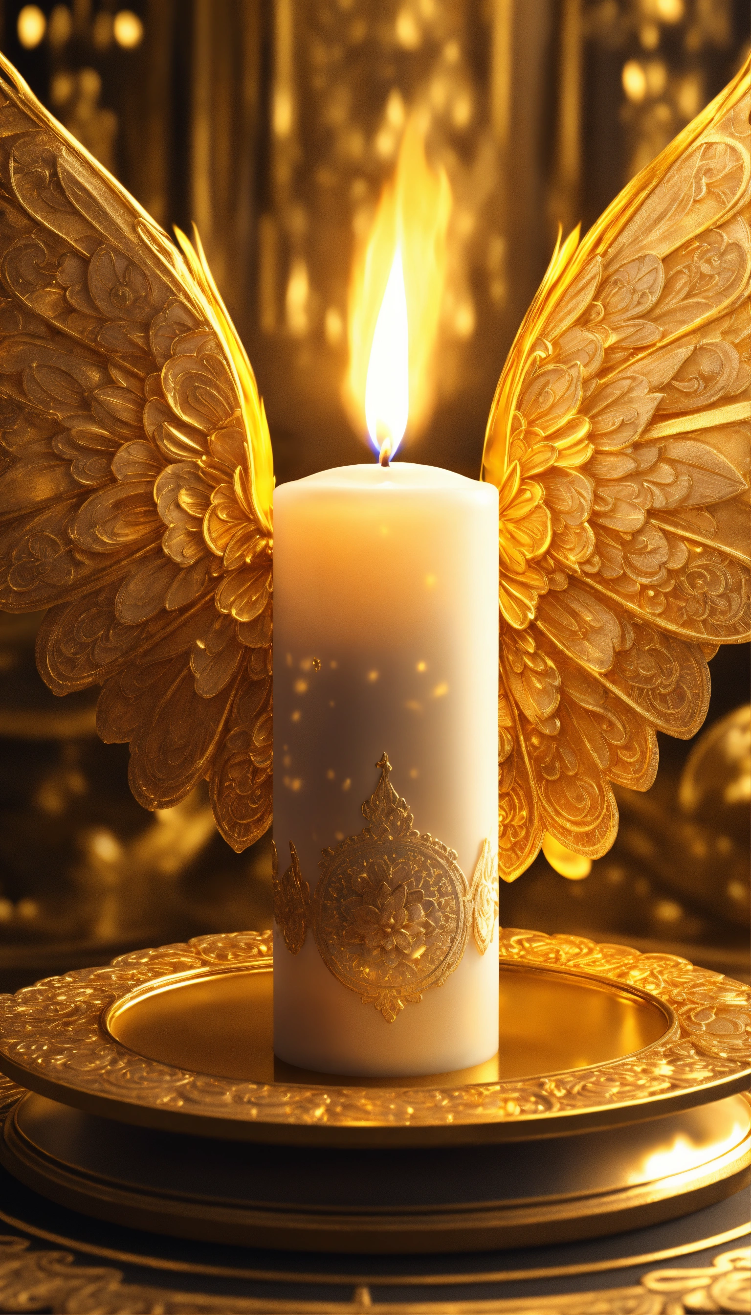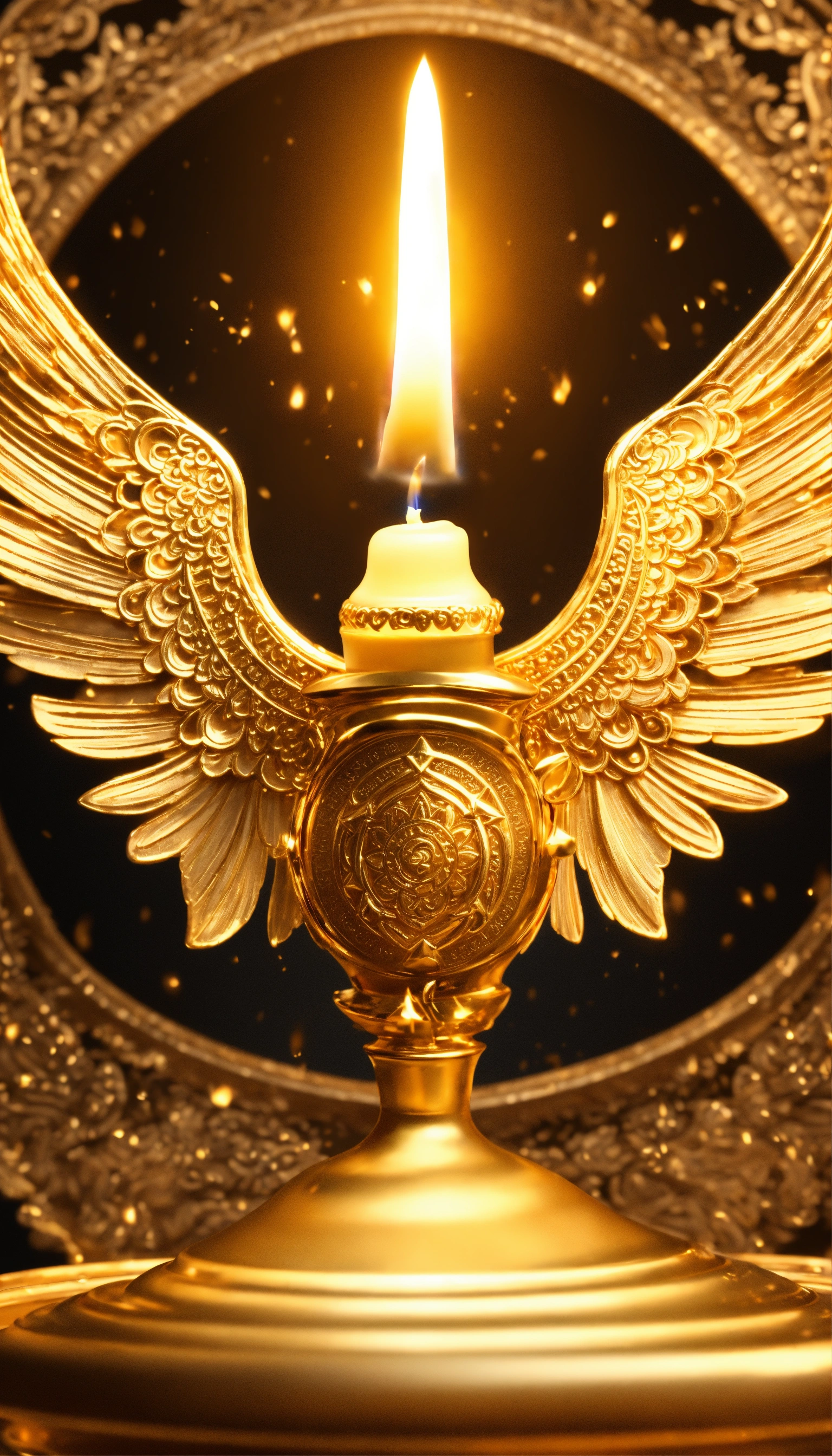 Powerful, detailed candle, digital illustration, real, 3d, golden colored candle with a yellow flame with white and golden details, on each side of the candle there are detailed and large wings, luminous golden mandala shape background, sharp focus, illustration cinematic, 8k, hyperrealistic digital painting, hd, high quality and resolution.