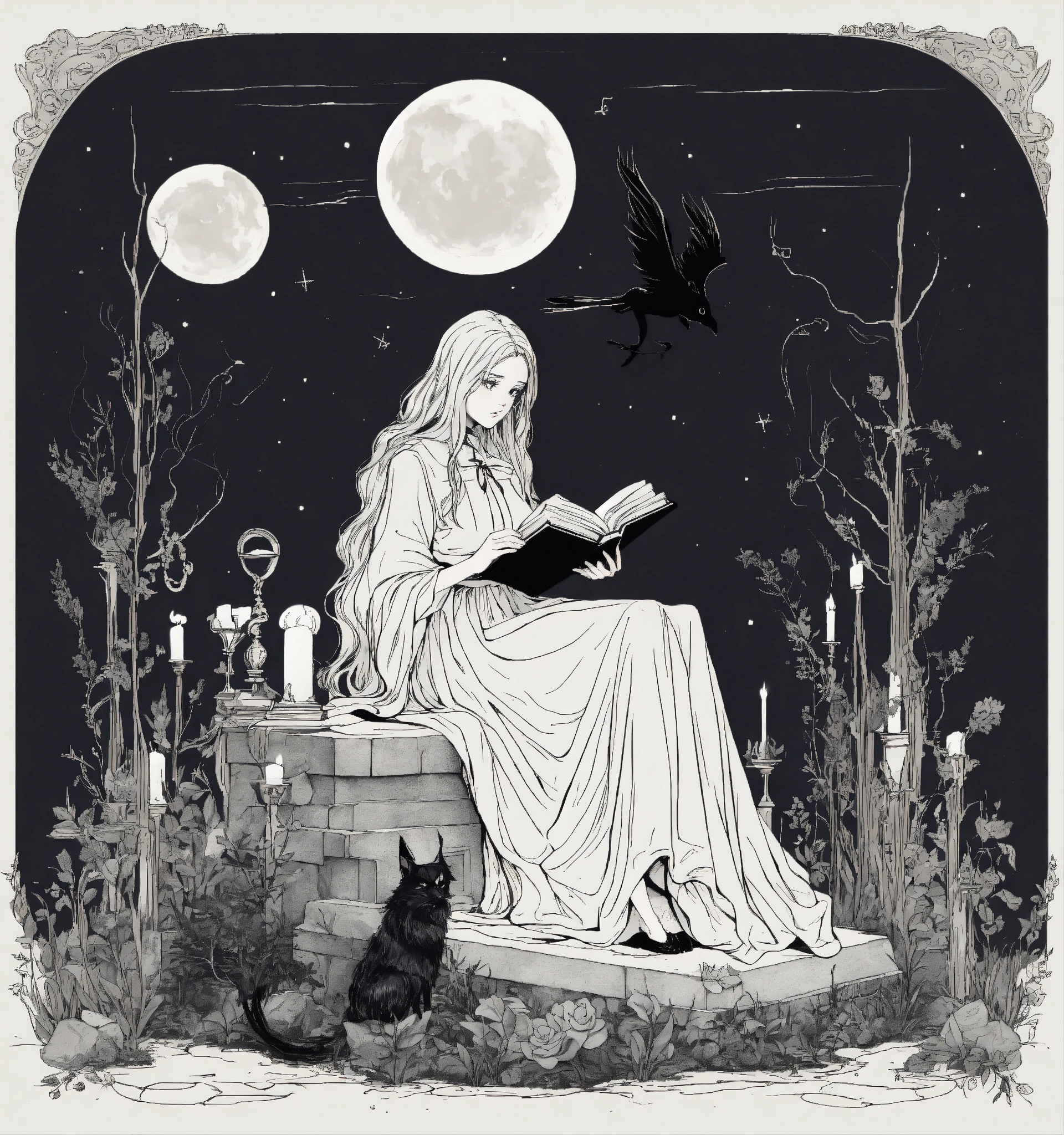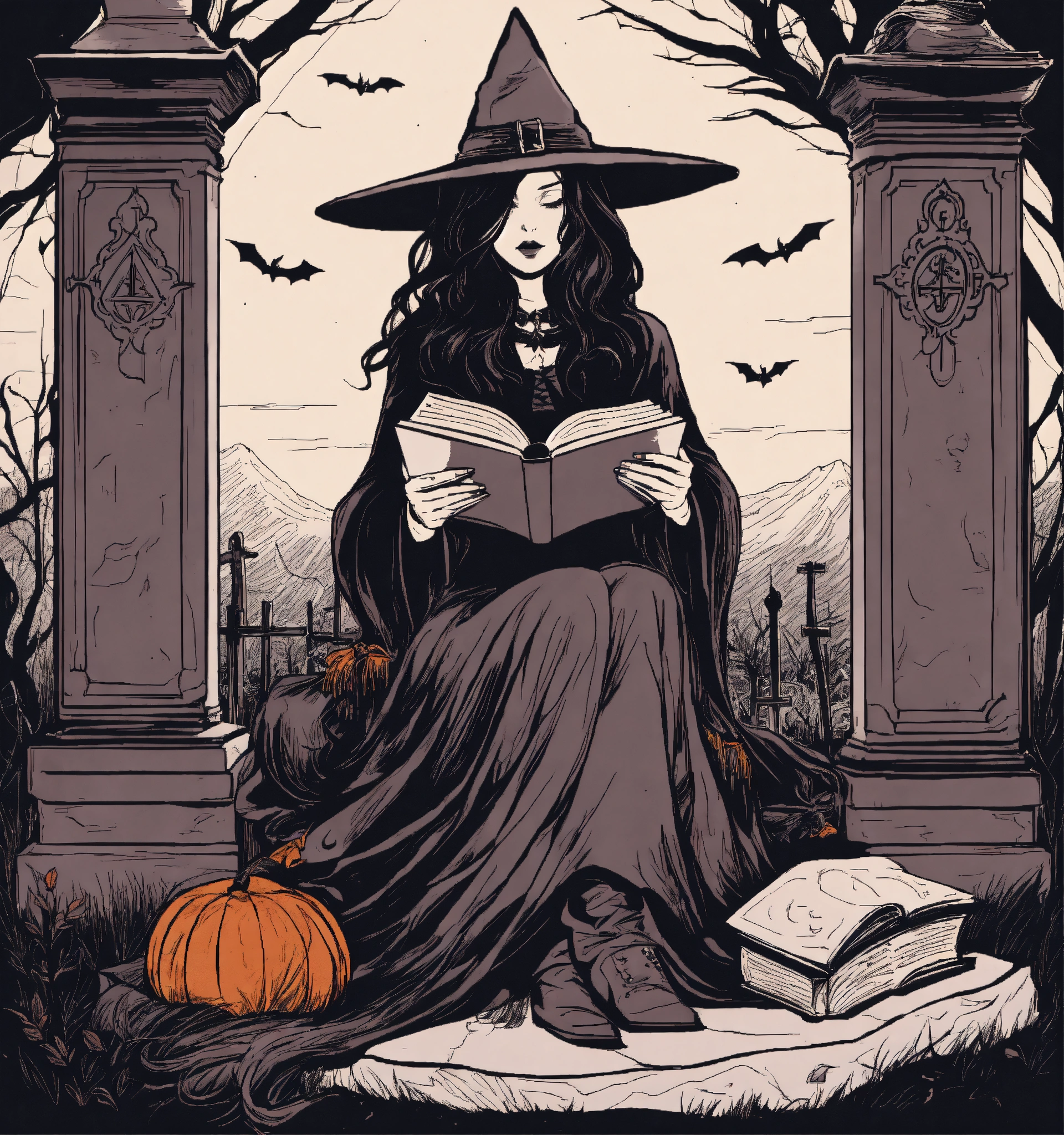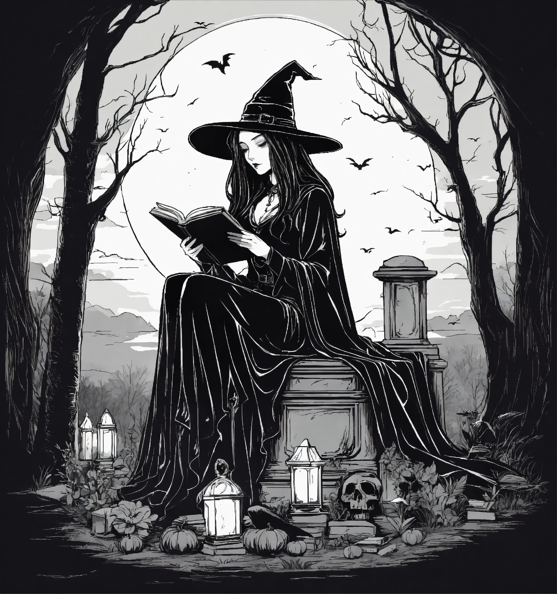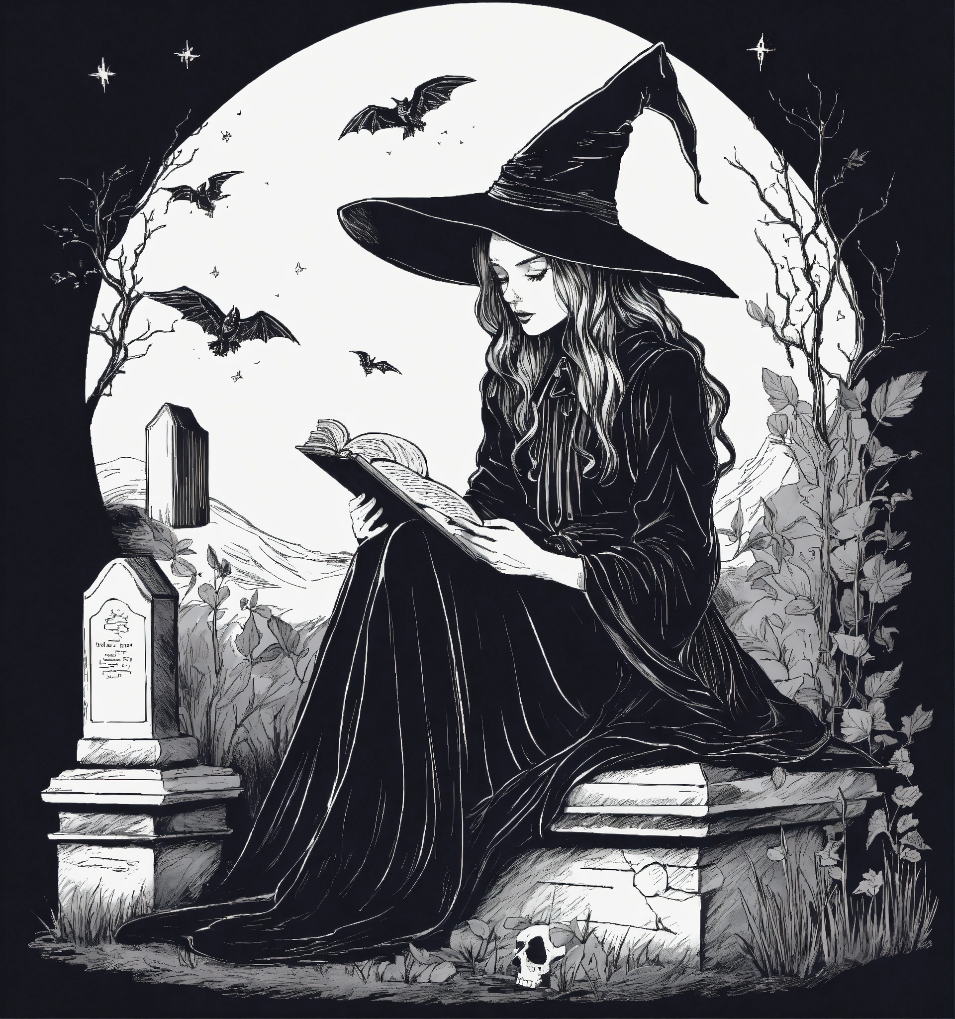 Witch sitting on a grave reading a book, vintage gothic dark academia aesthetic occult goth witchcraft witchy, line art