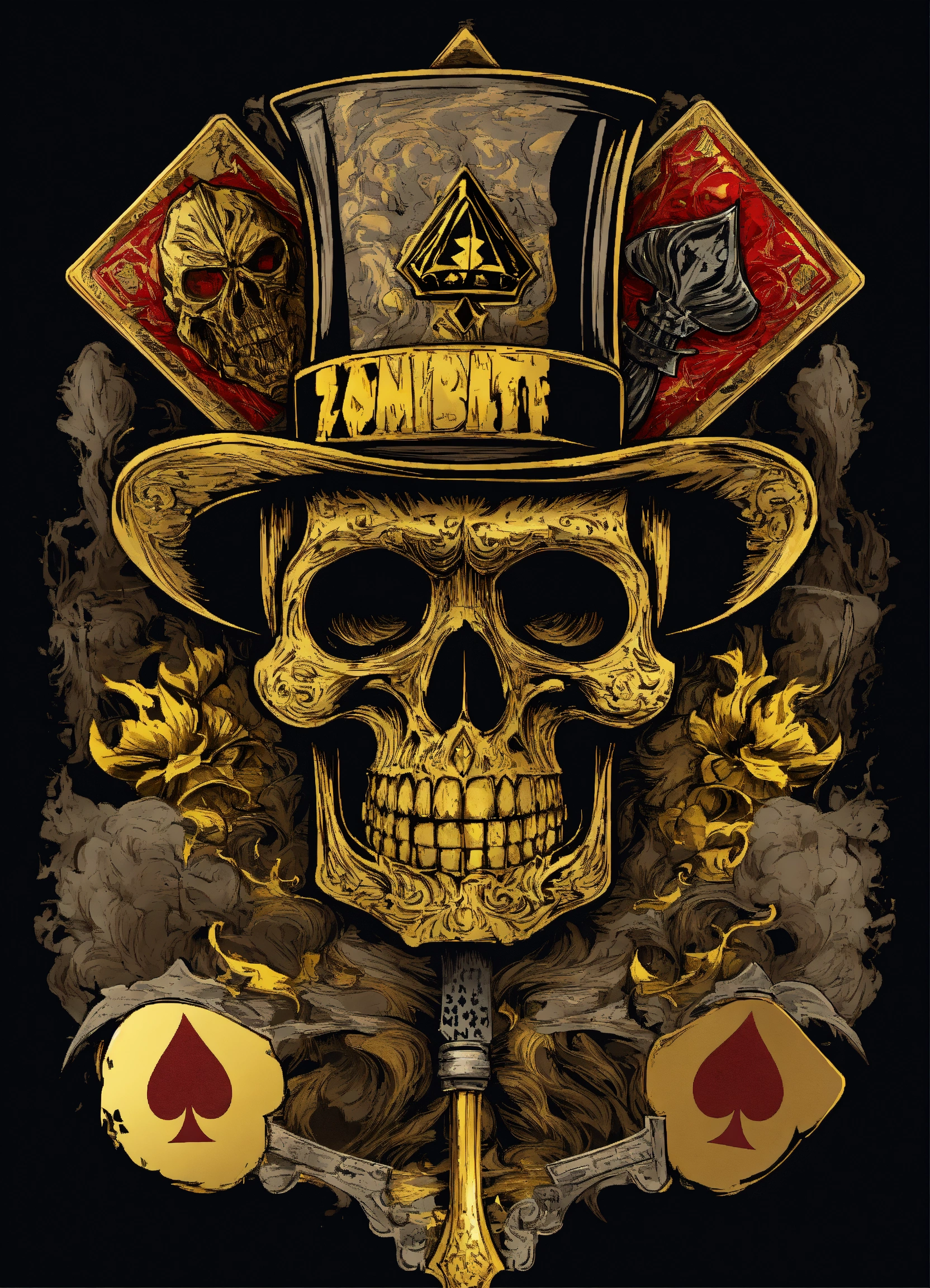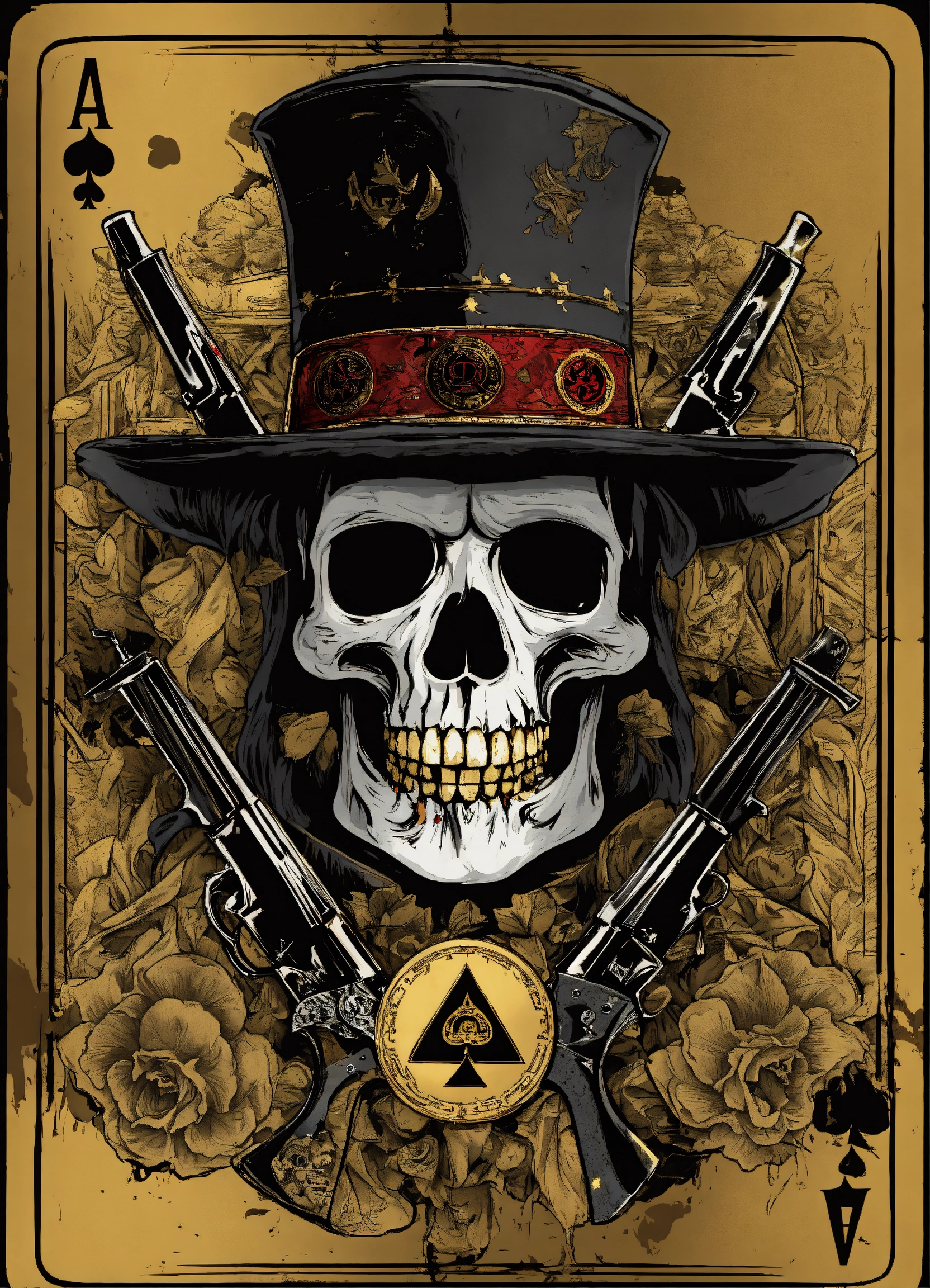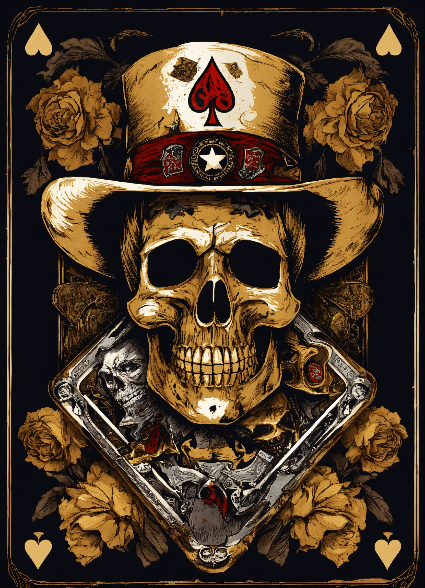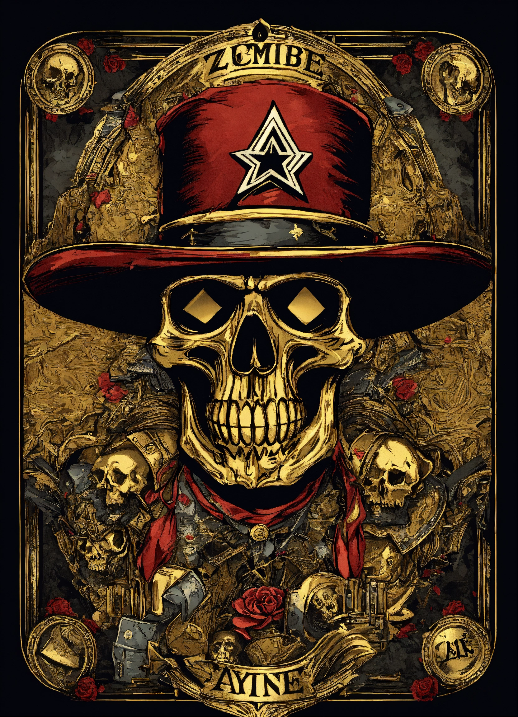 Zombie ace of spades with confederate hat on his head and colt guns around, zombie face view, symmetrical view, wild wild west, poker playing cards, tshirt design, vector design, highly detailed, black background, black, white, and gold colors