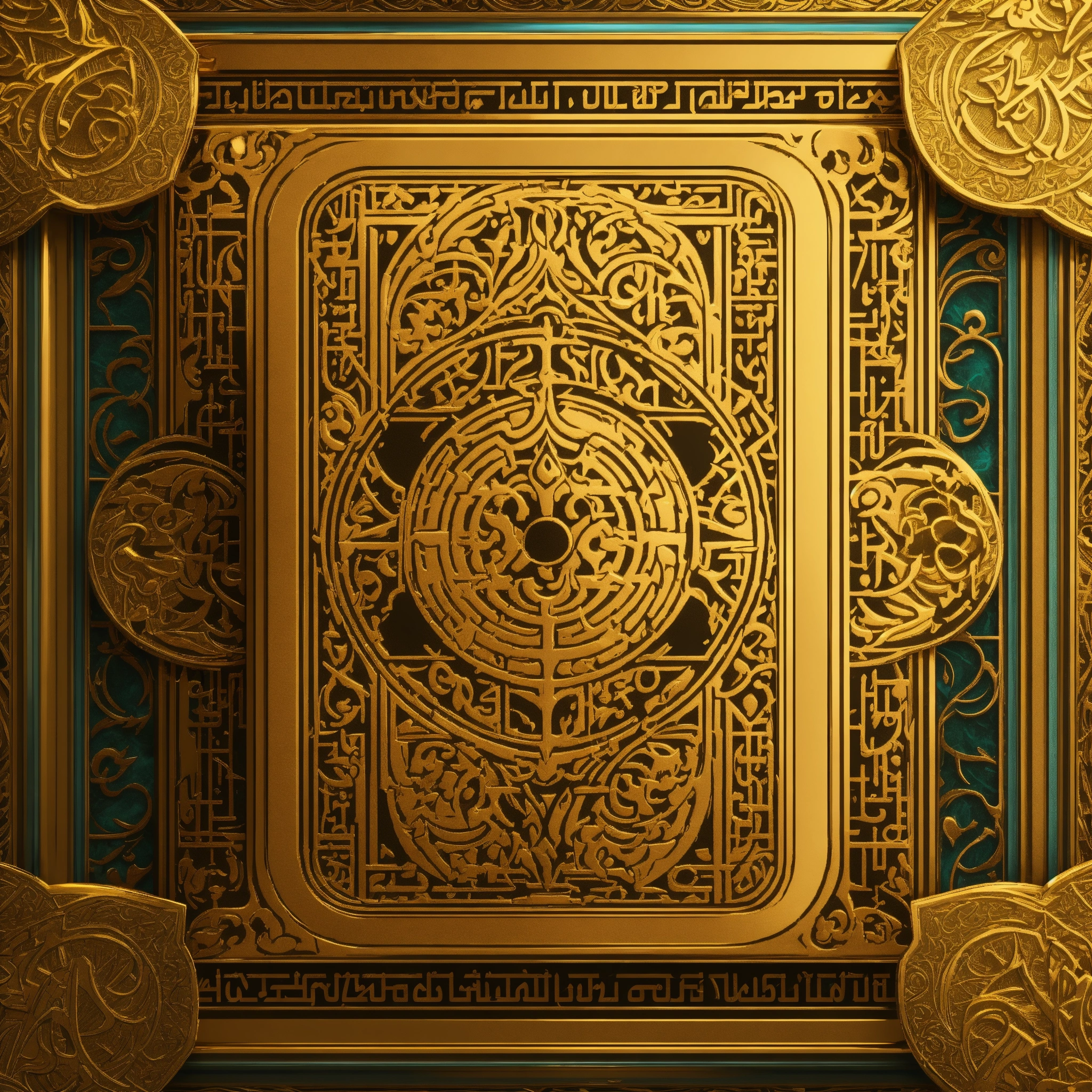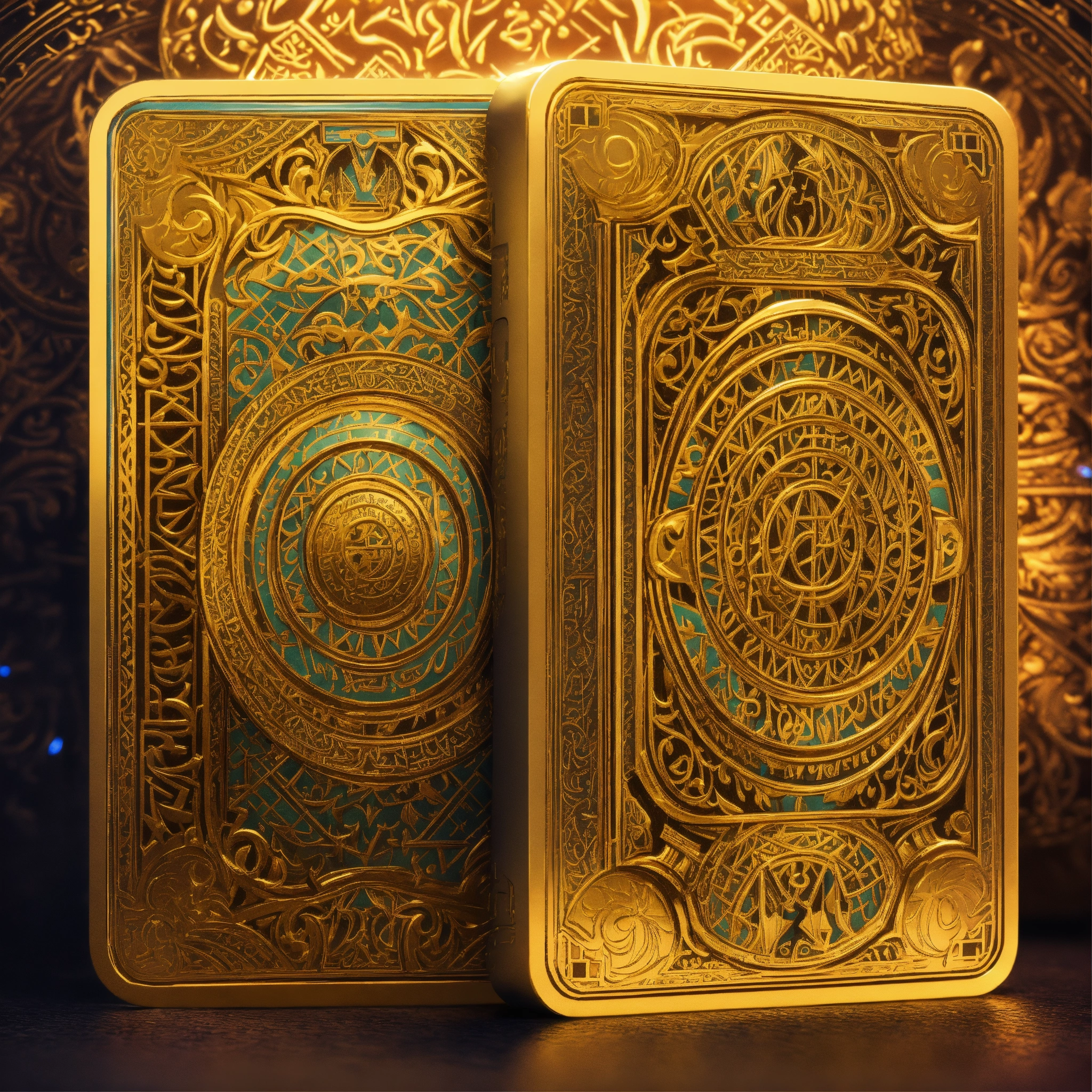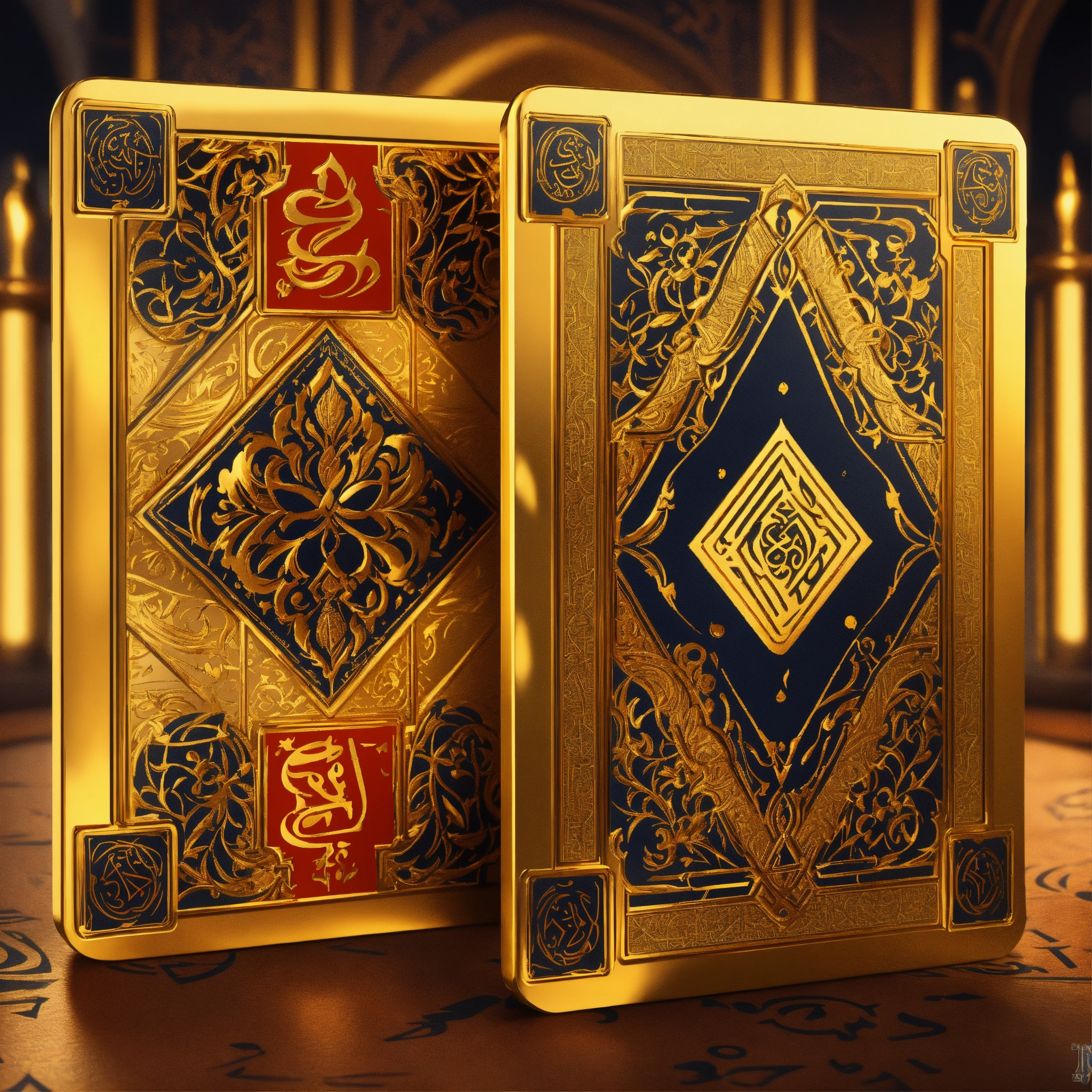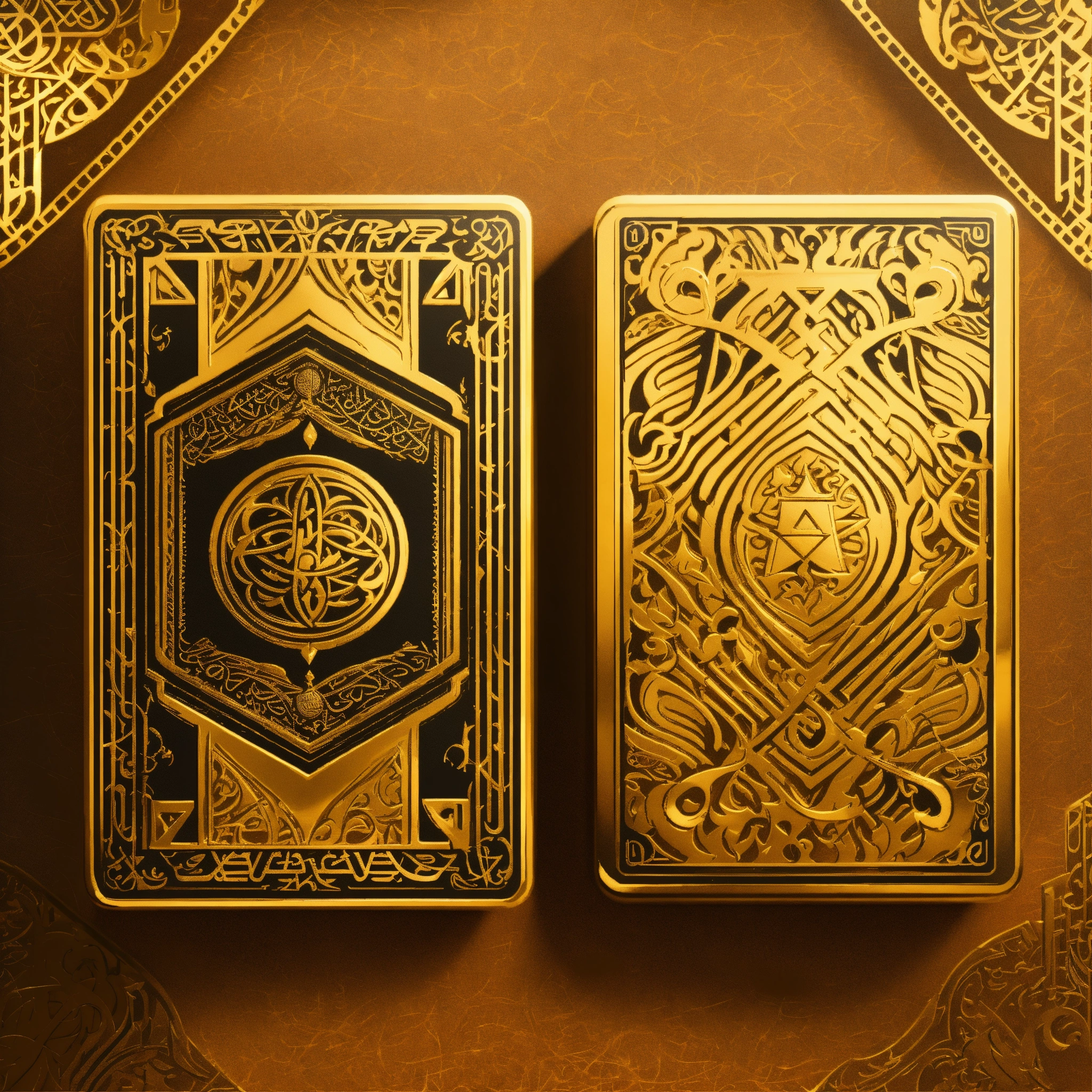 Two gold playing cards face down with an arabic pattern (pixar art style)++ highly detailed digital painting, art stations, concept art, game art, 3d, cartoon, colorful, magical, mysterious