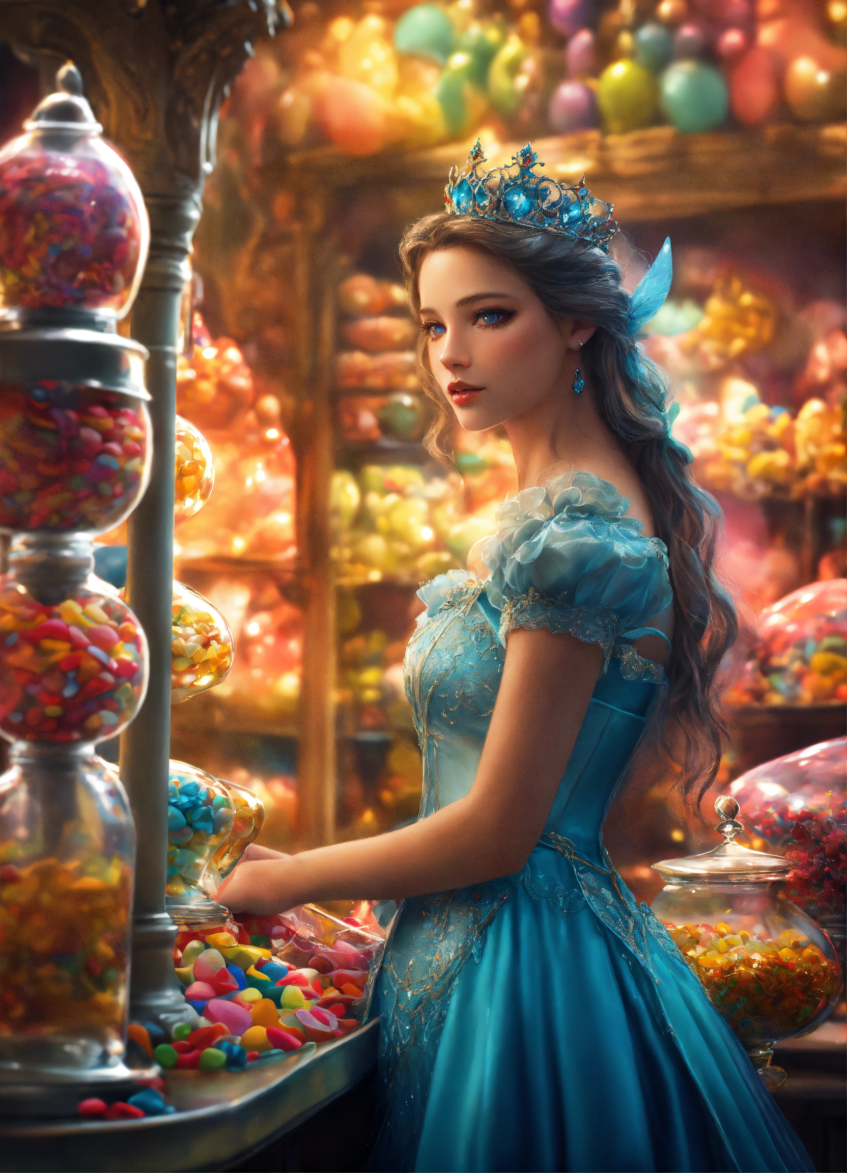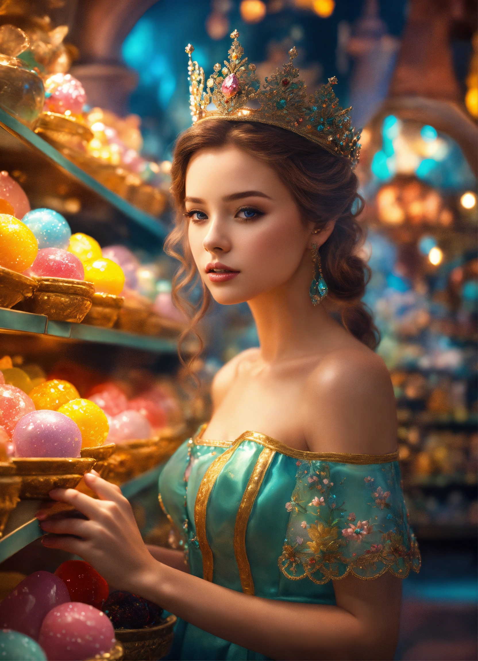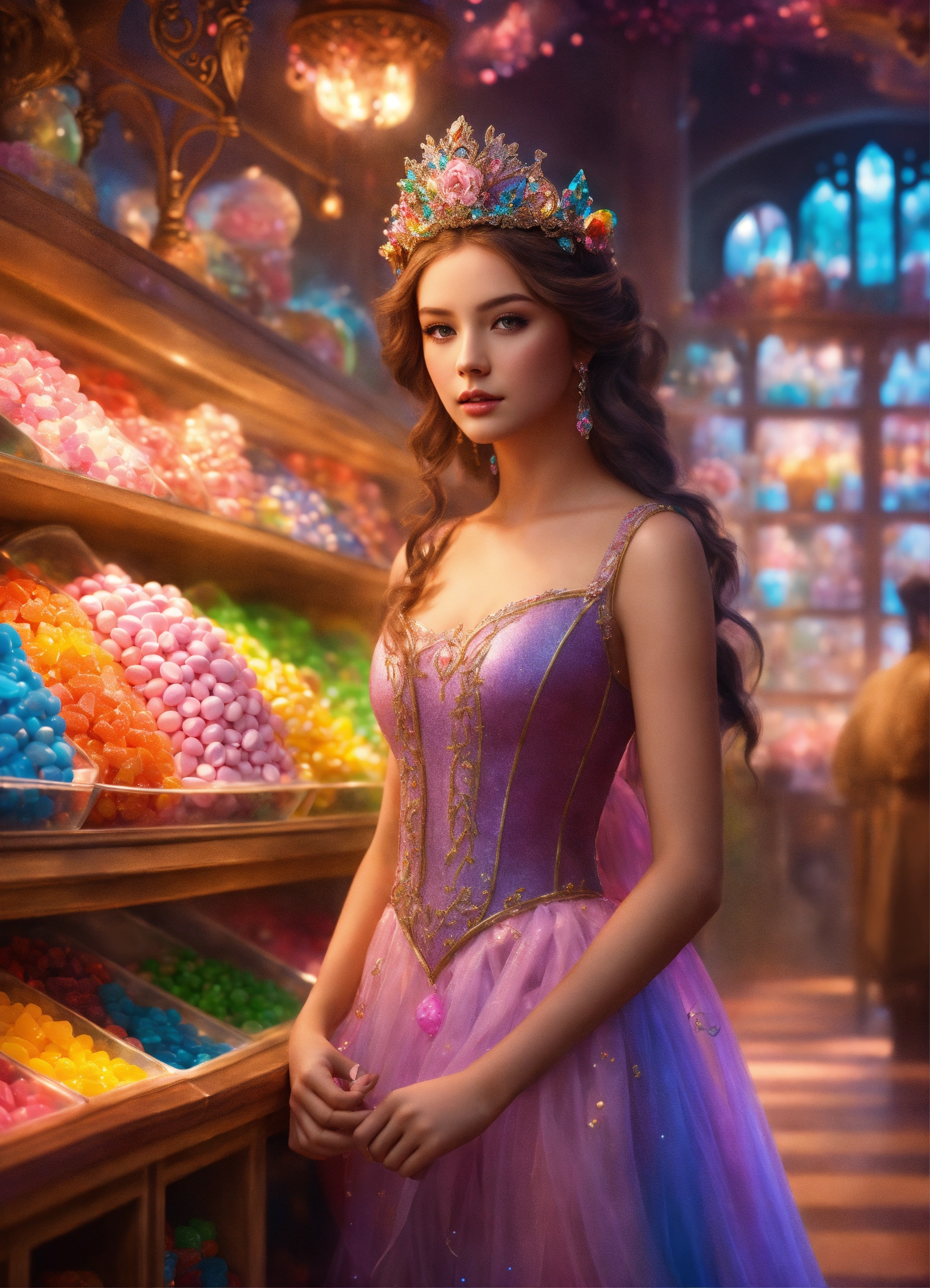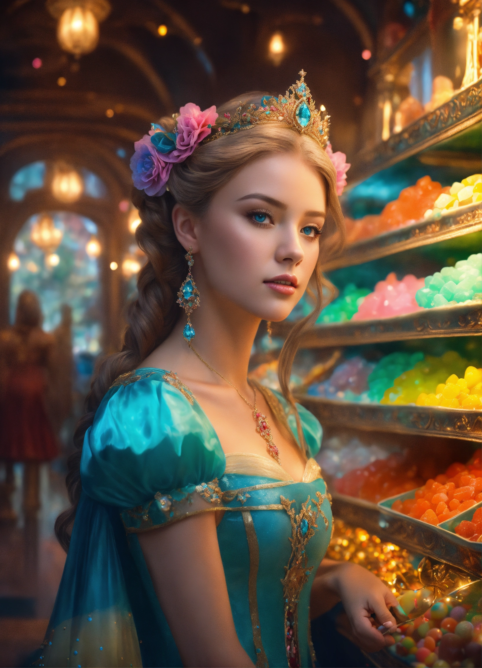 Beautiful princess in fairy tale candy store, fantasy, mystic, realistic photography, high detail, digital painting, cinematic, stunning, hyperrealistic, sharp focus, high resolution 8k, insane detailing