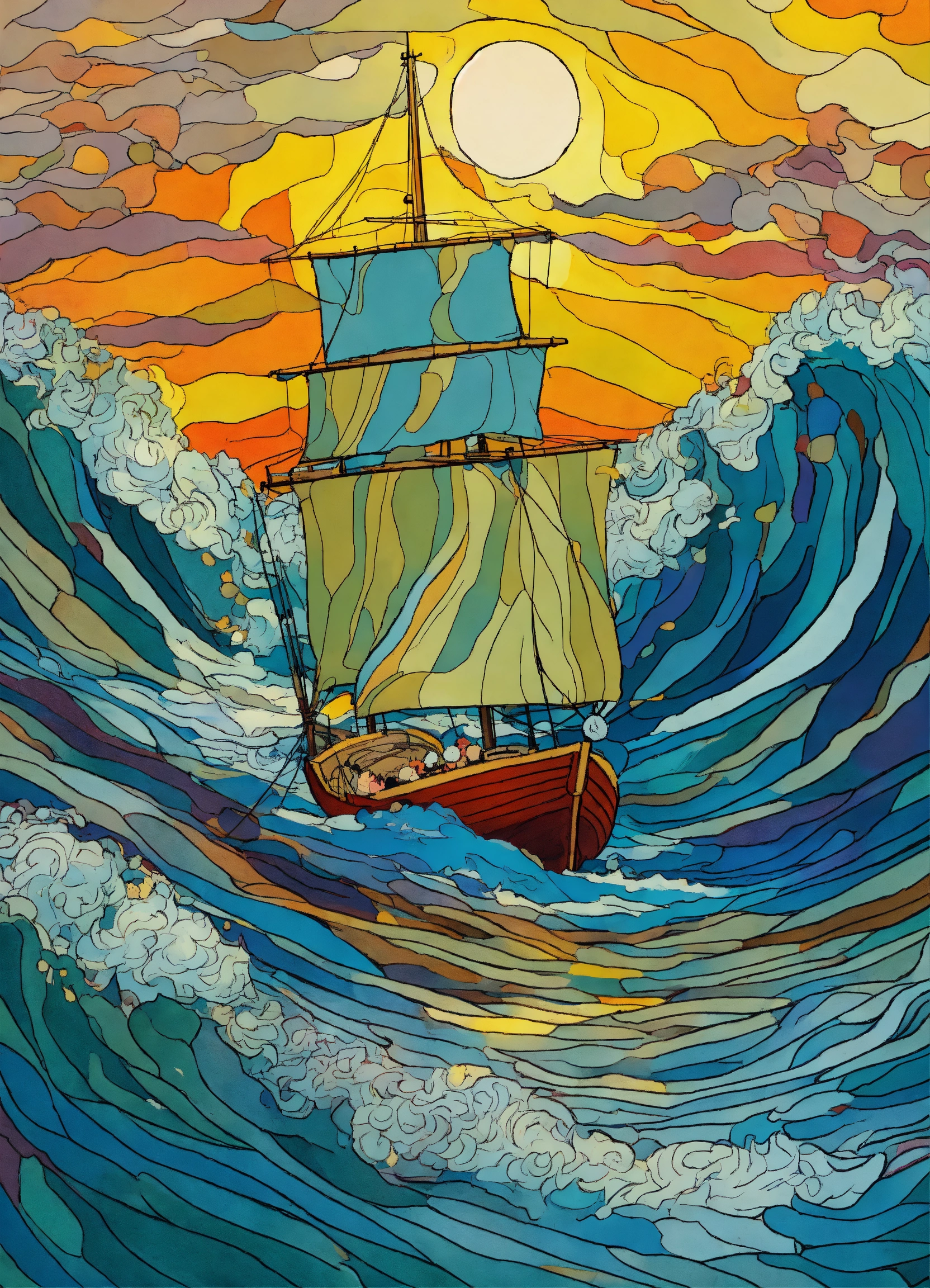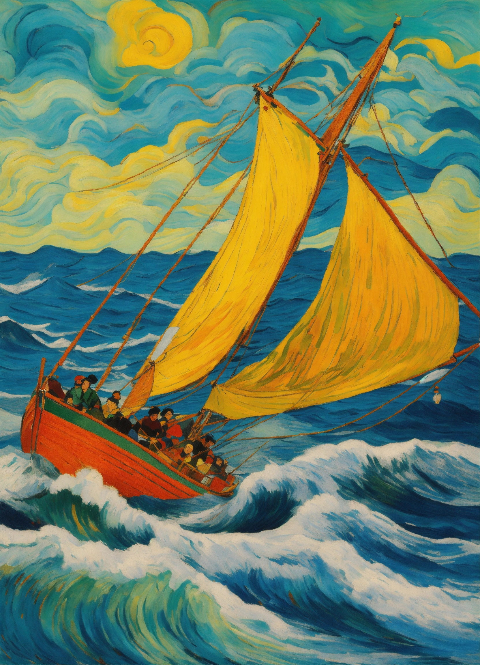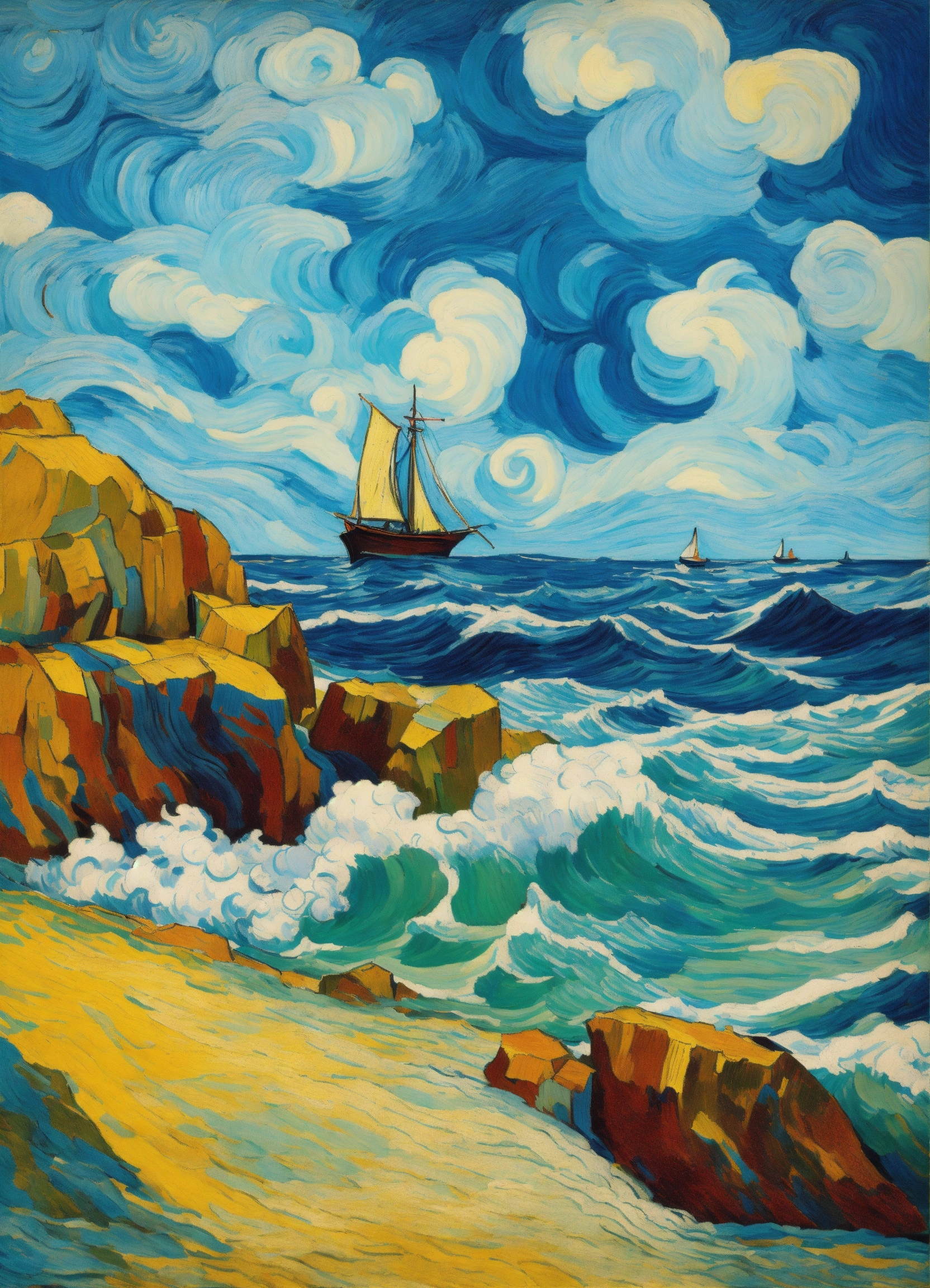 Drawing of voilier dans la mer avec des grosse vagues all colors, van gogh style, modigliani, paul gauguin