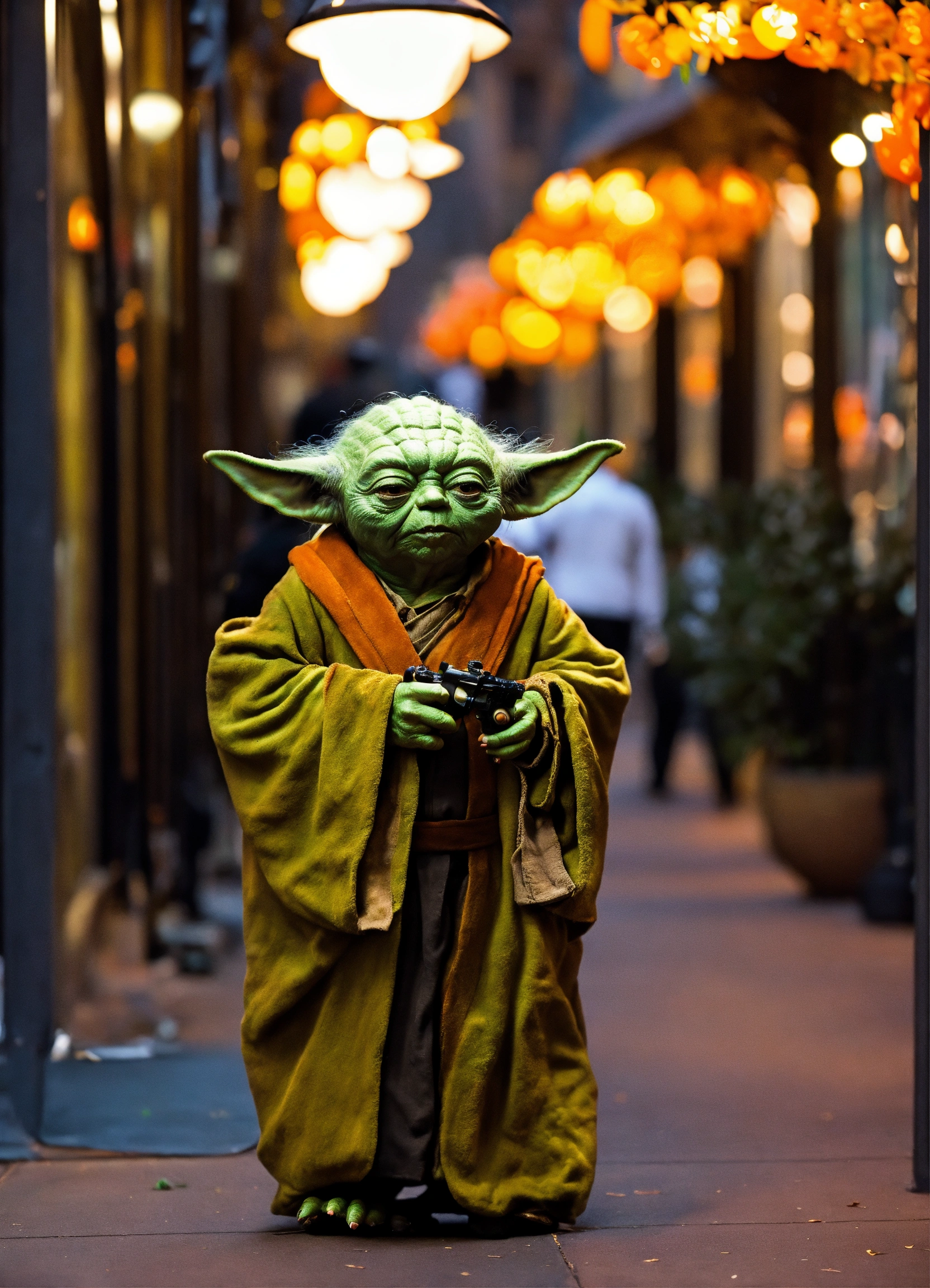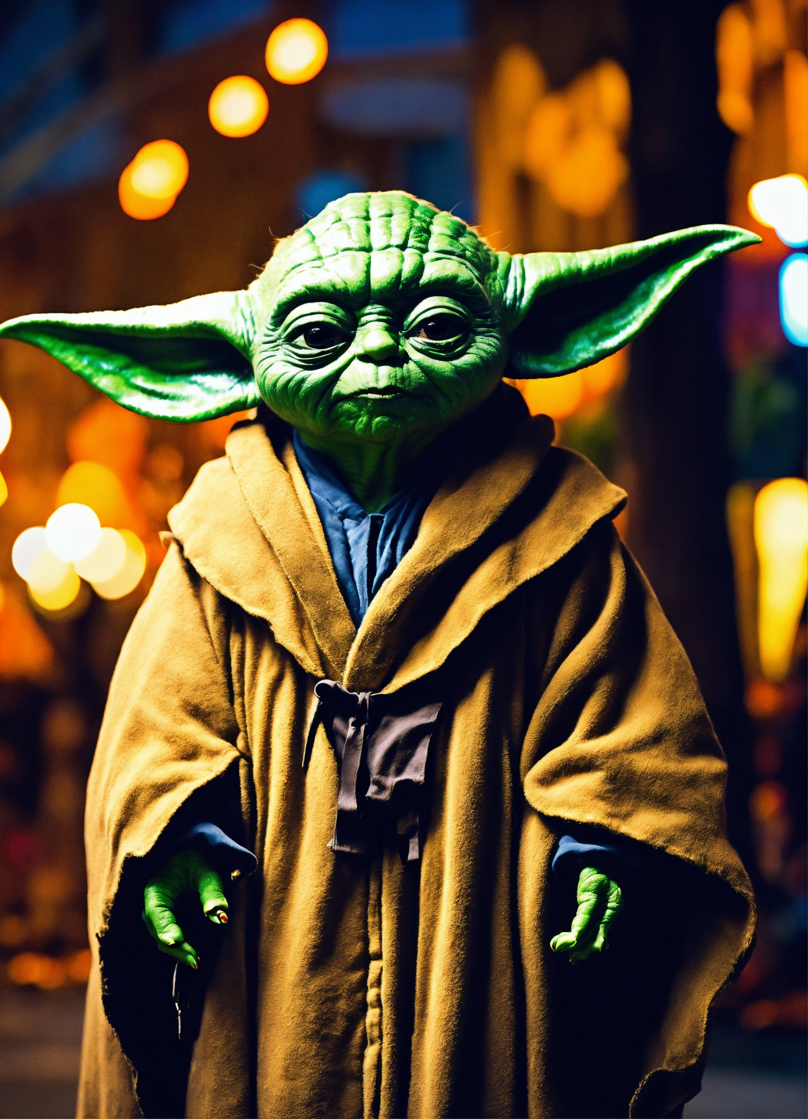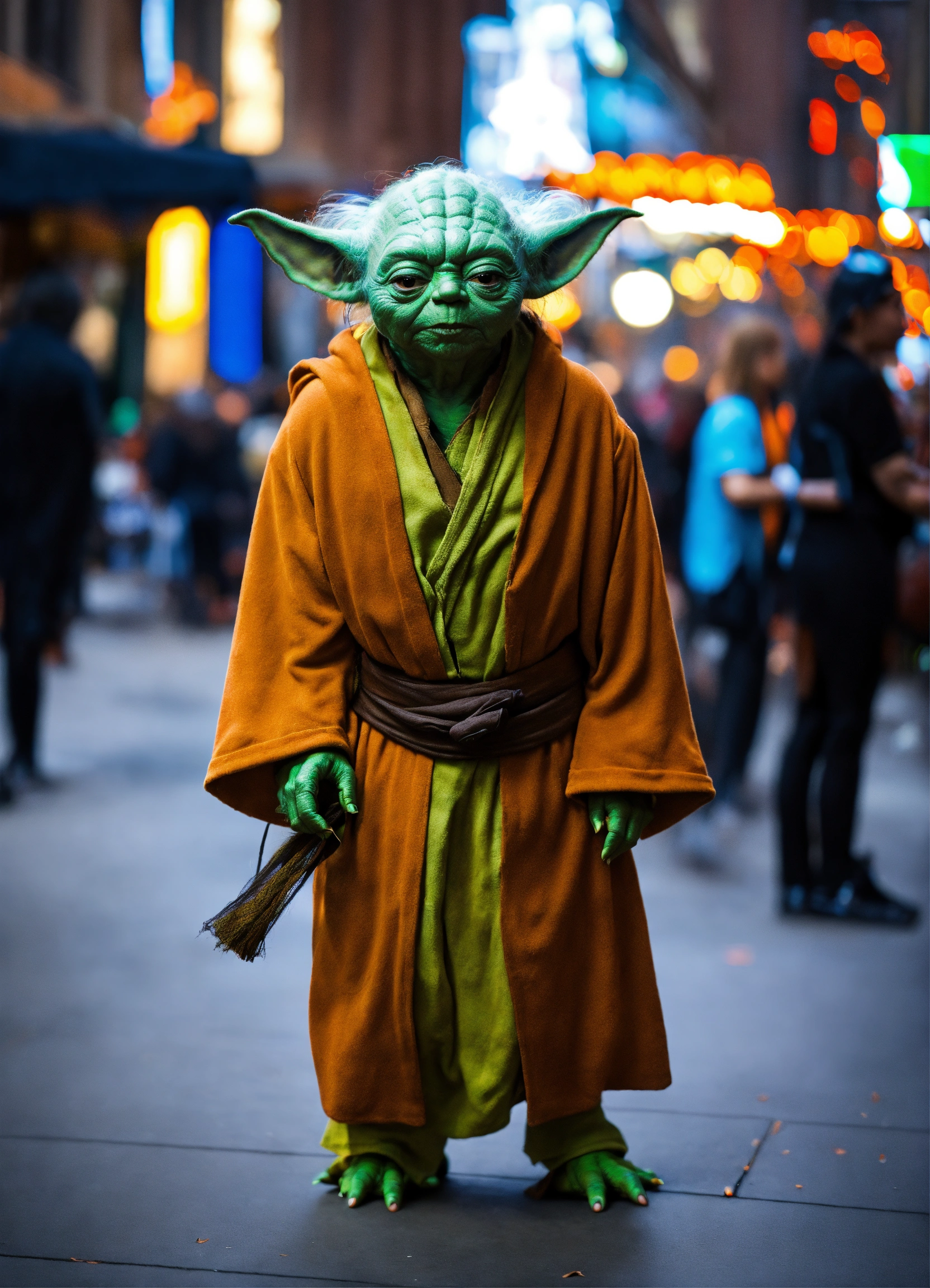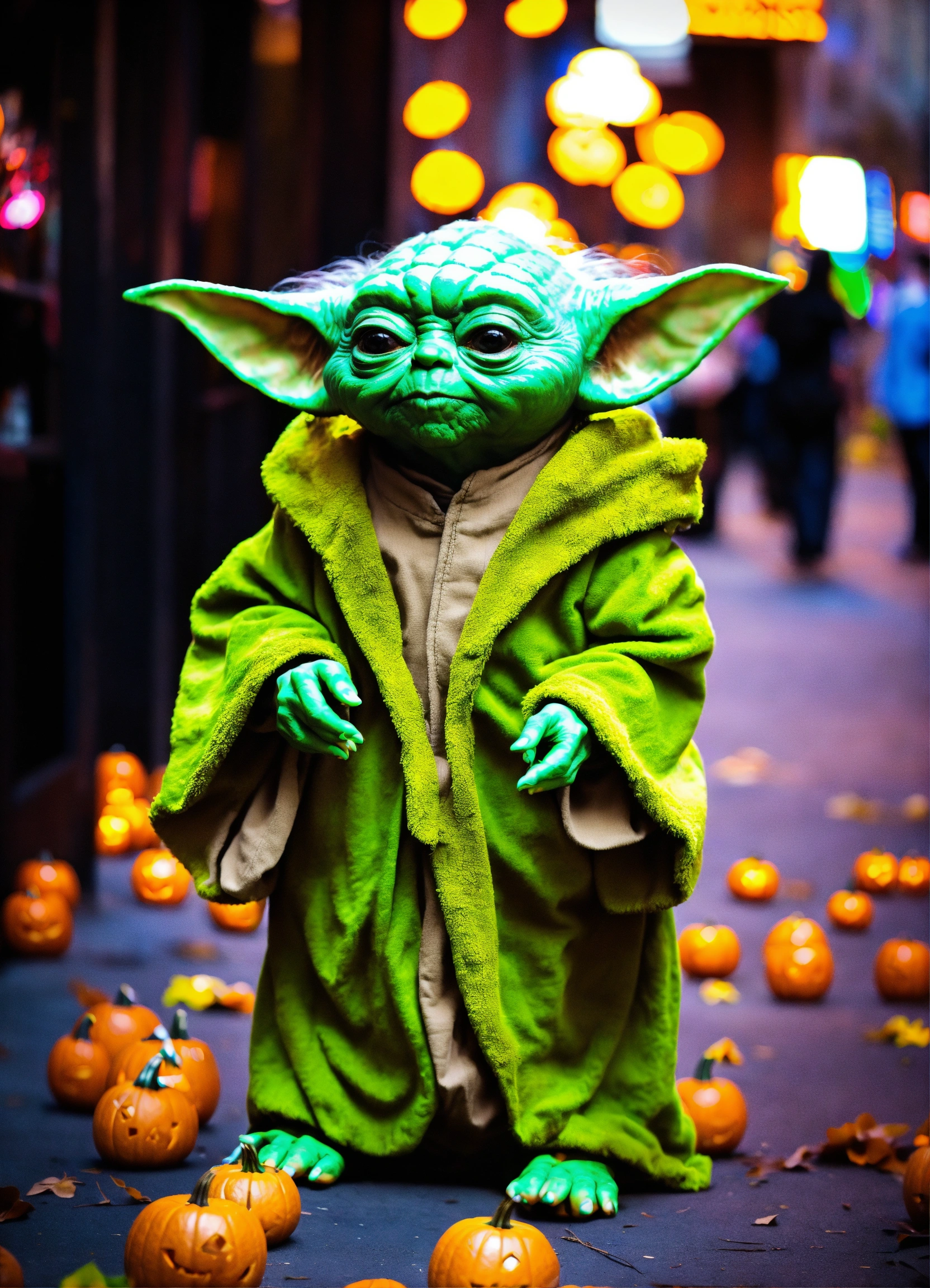 Ultra realistic yoda ith a halloween costume on halloween in a city decorated for halloween perfect clarity photorealistic high definition perfect resolution