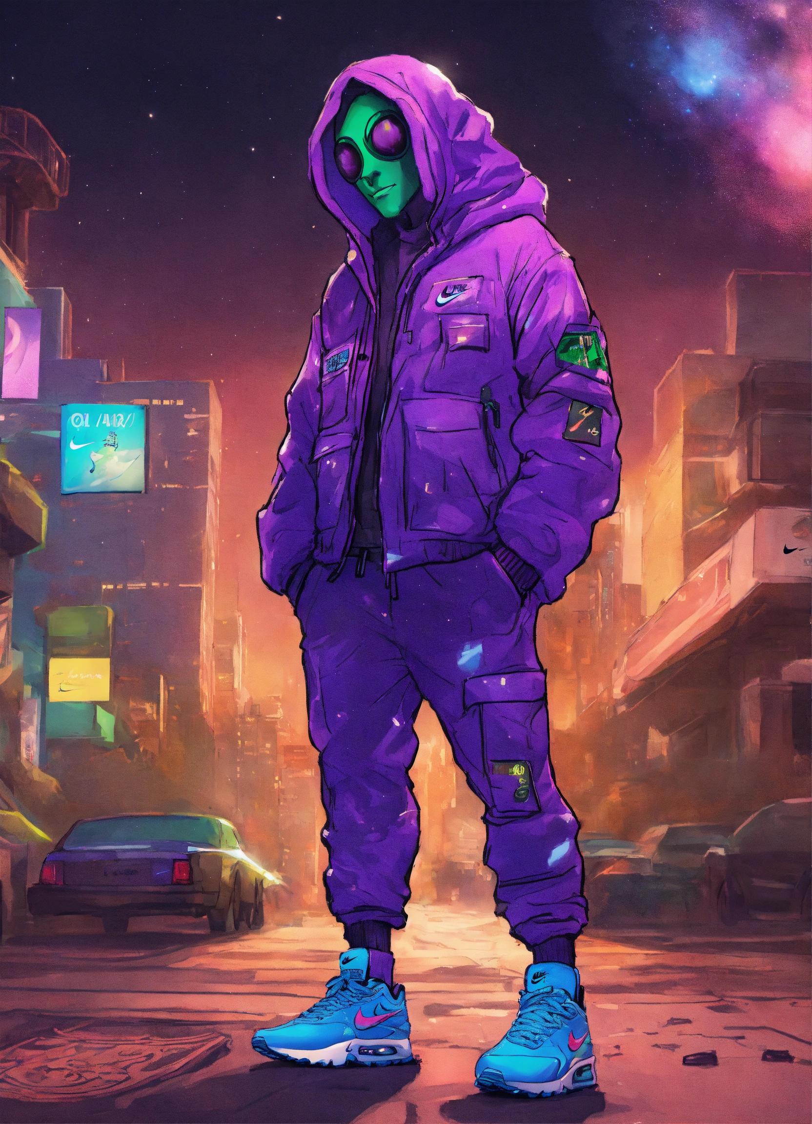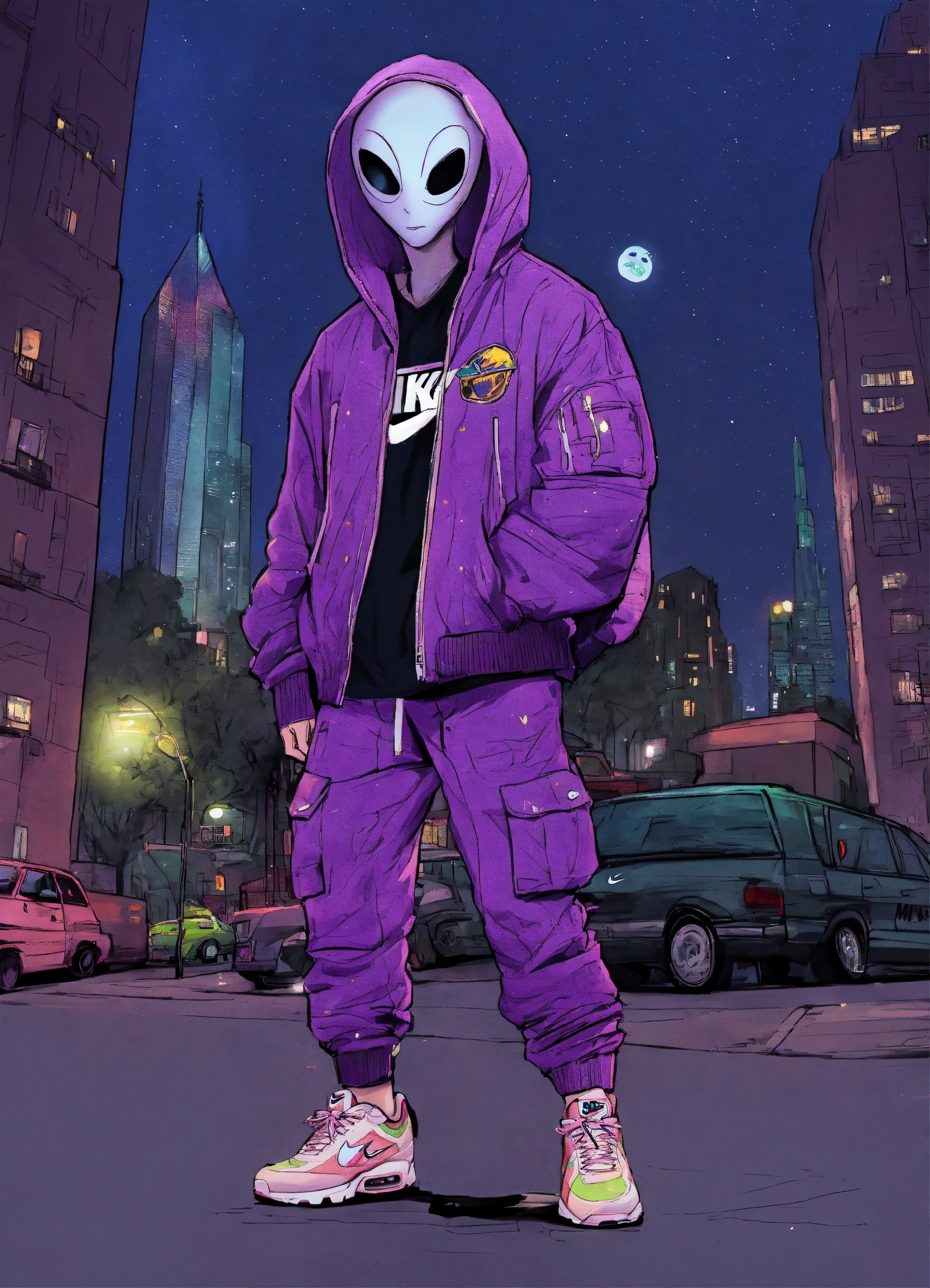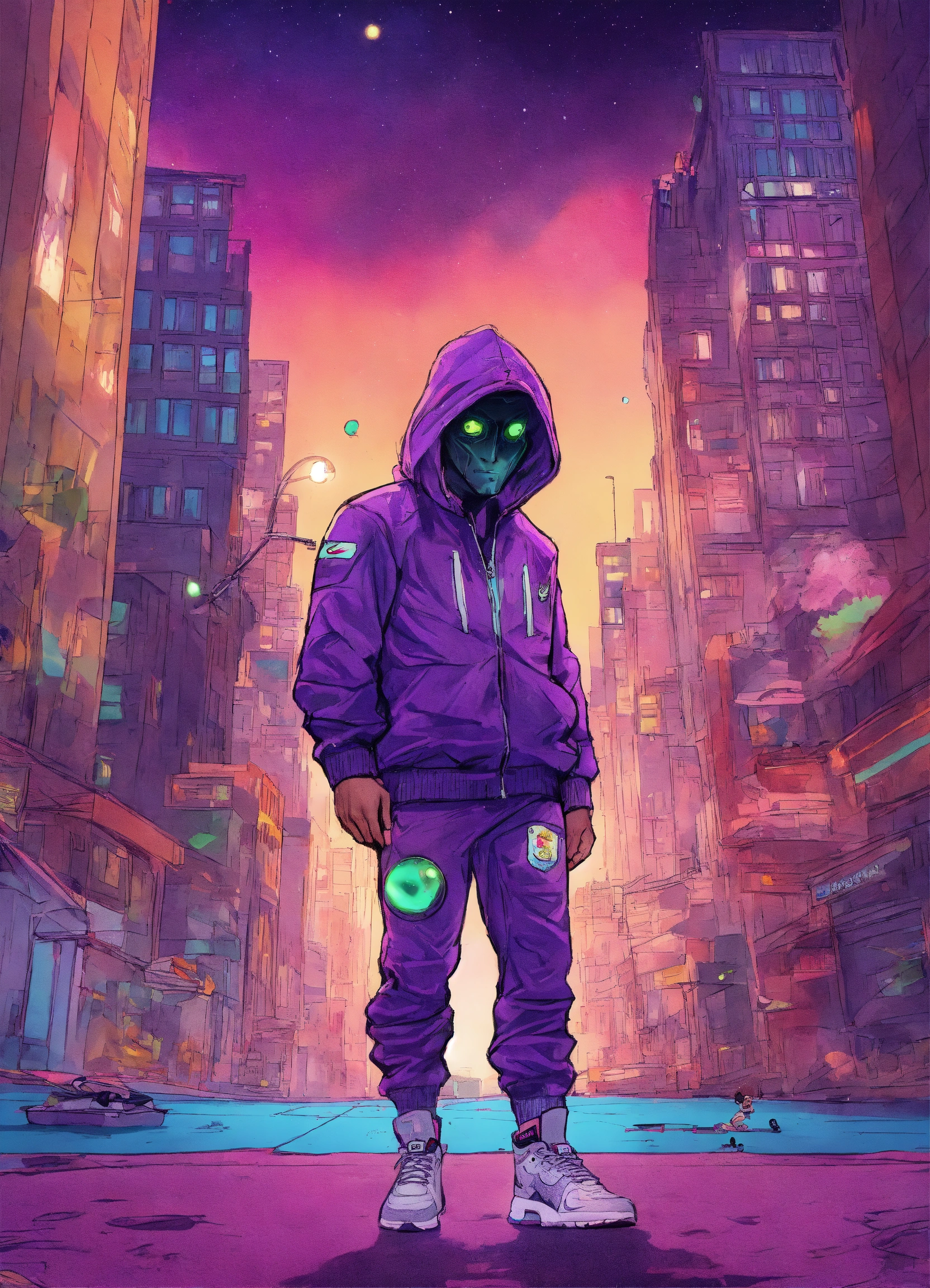 Criminal, alien face, jogging pants, nike airmax plus, pistol, drawing, art, 4k, cartoon style, bundles of dollar shines, city, galaxy purple