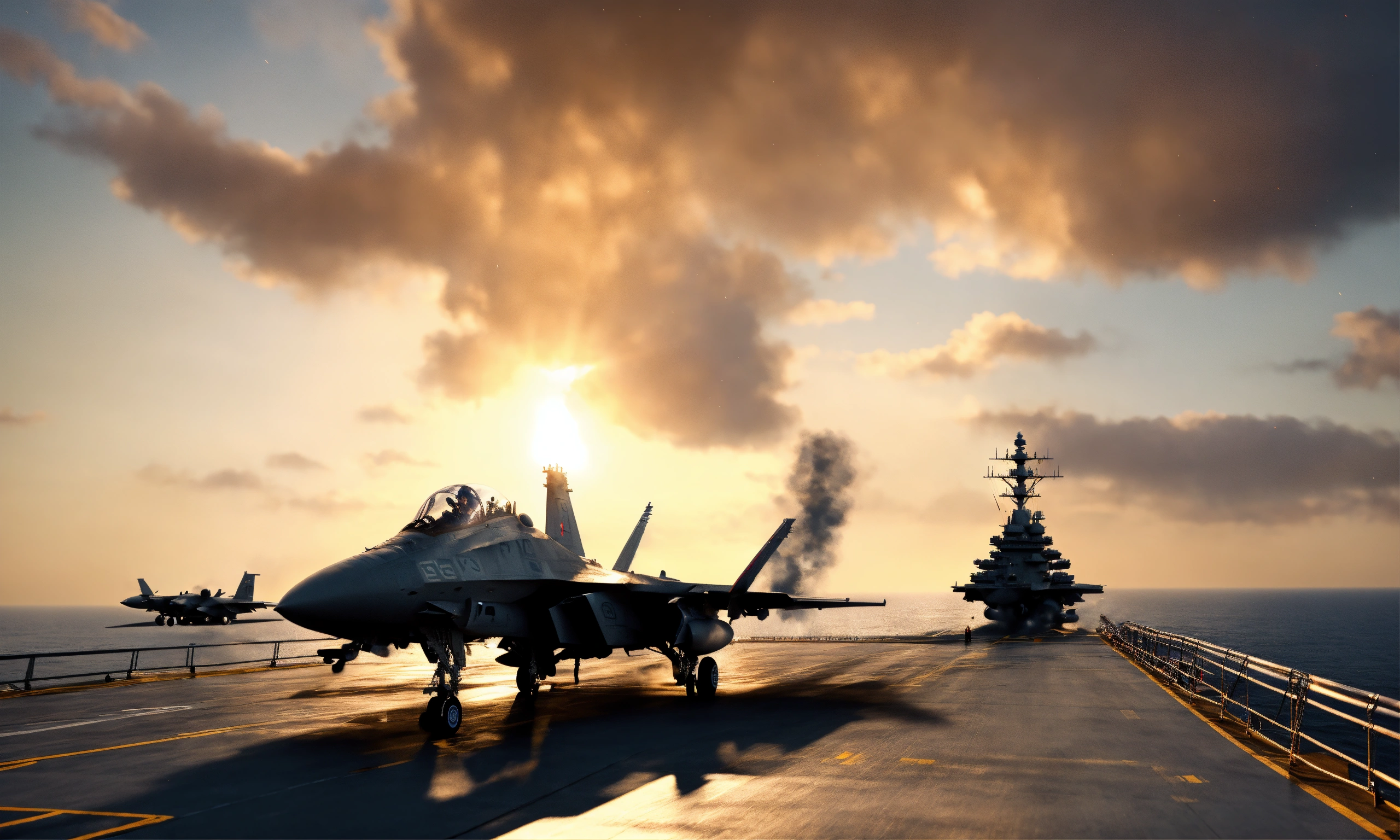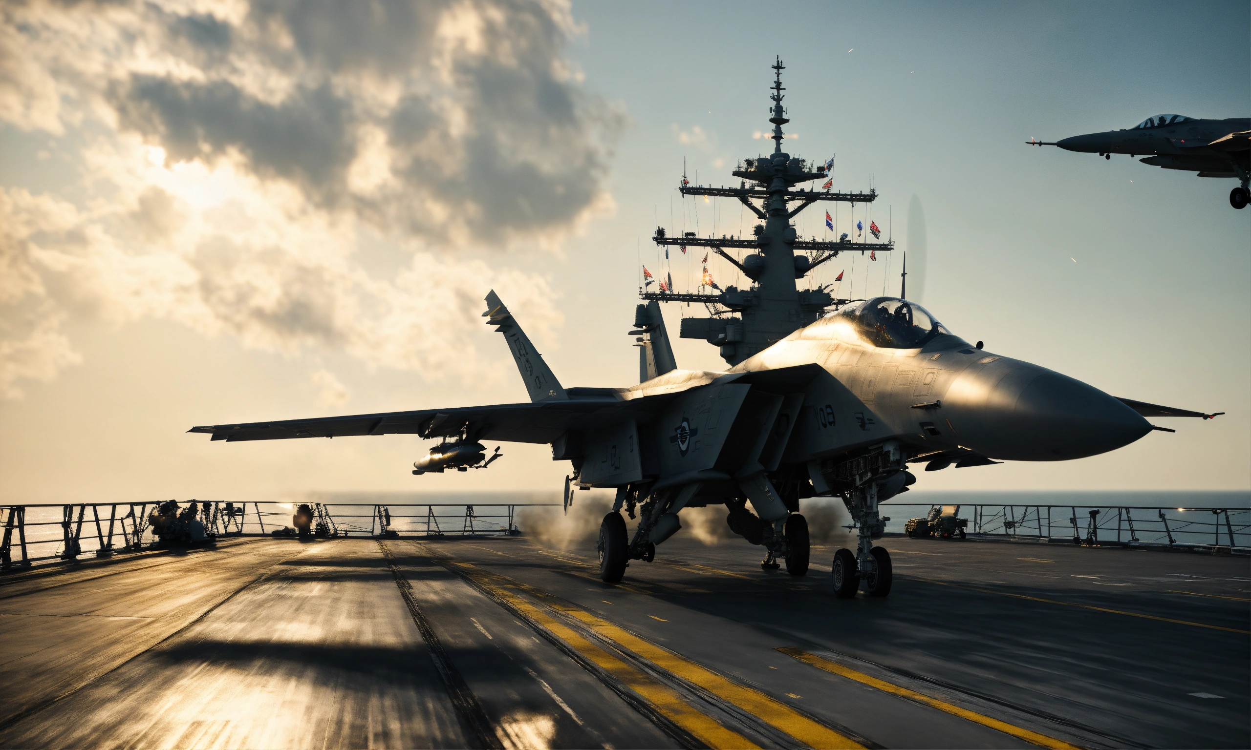 Aircraft carrier with a military fighter aircraft taking off from the deck. octane render, trending on artstation, highly detailed, lighting, professional, realistic, sharp focus, 4k, 8k, high resolution, candid, personal, –testp, bright lighting, ultra-detailed, bright lighting, photo, high quality photo, cinematic shot, volumetric light, imax