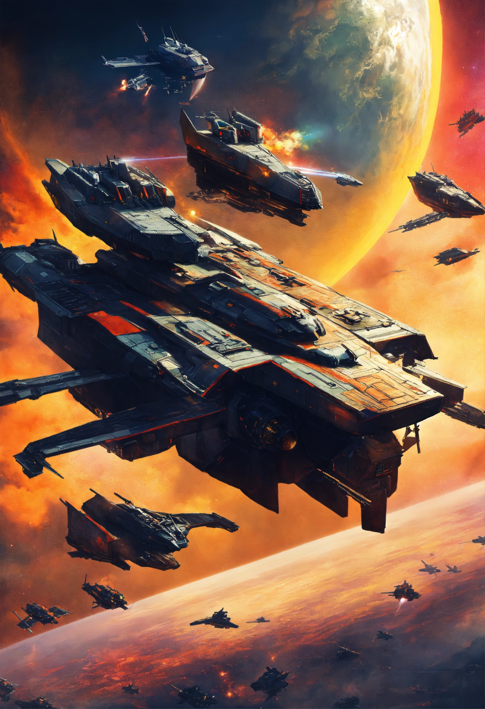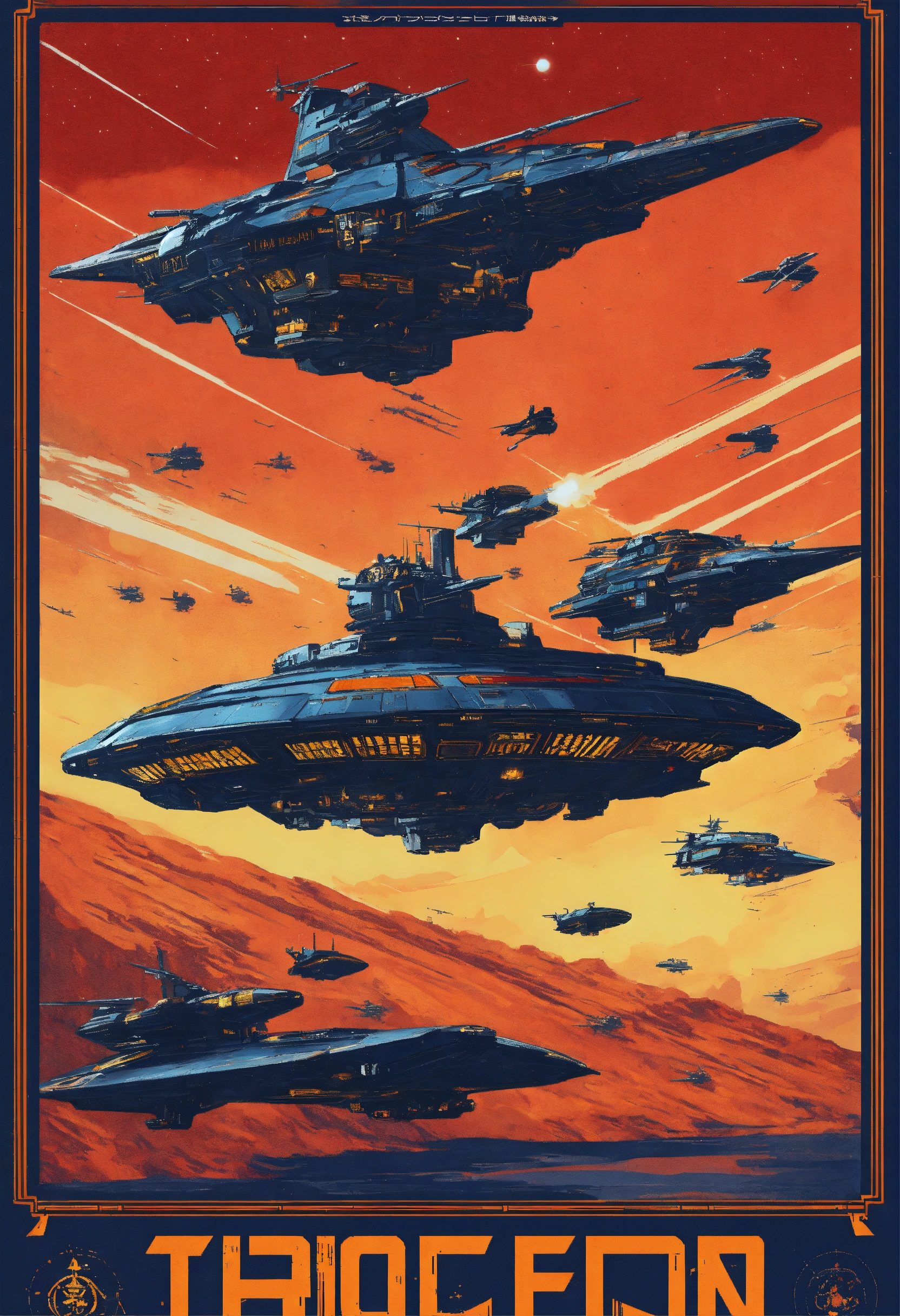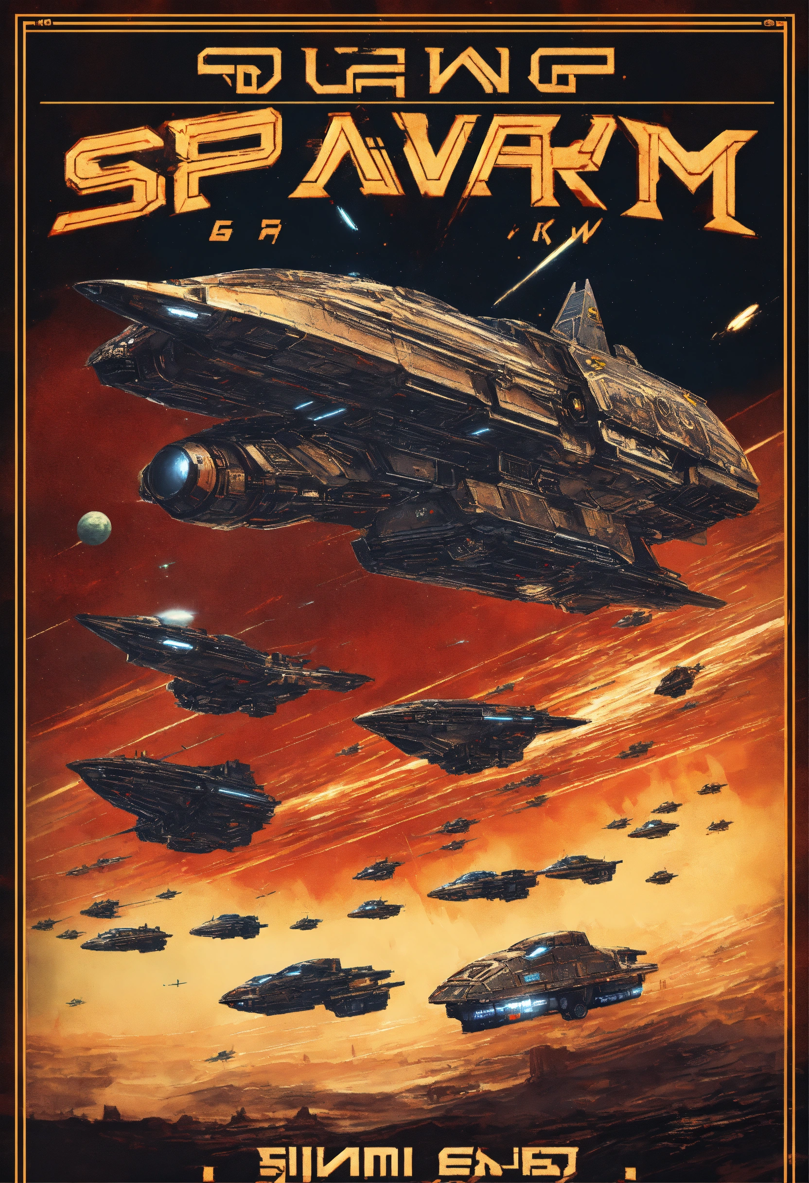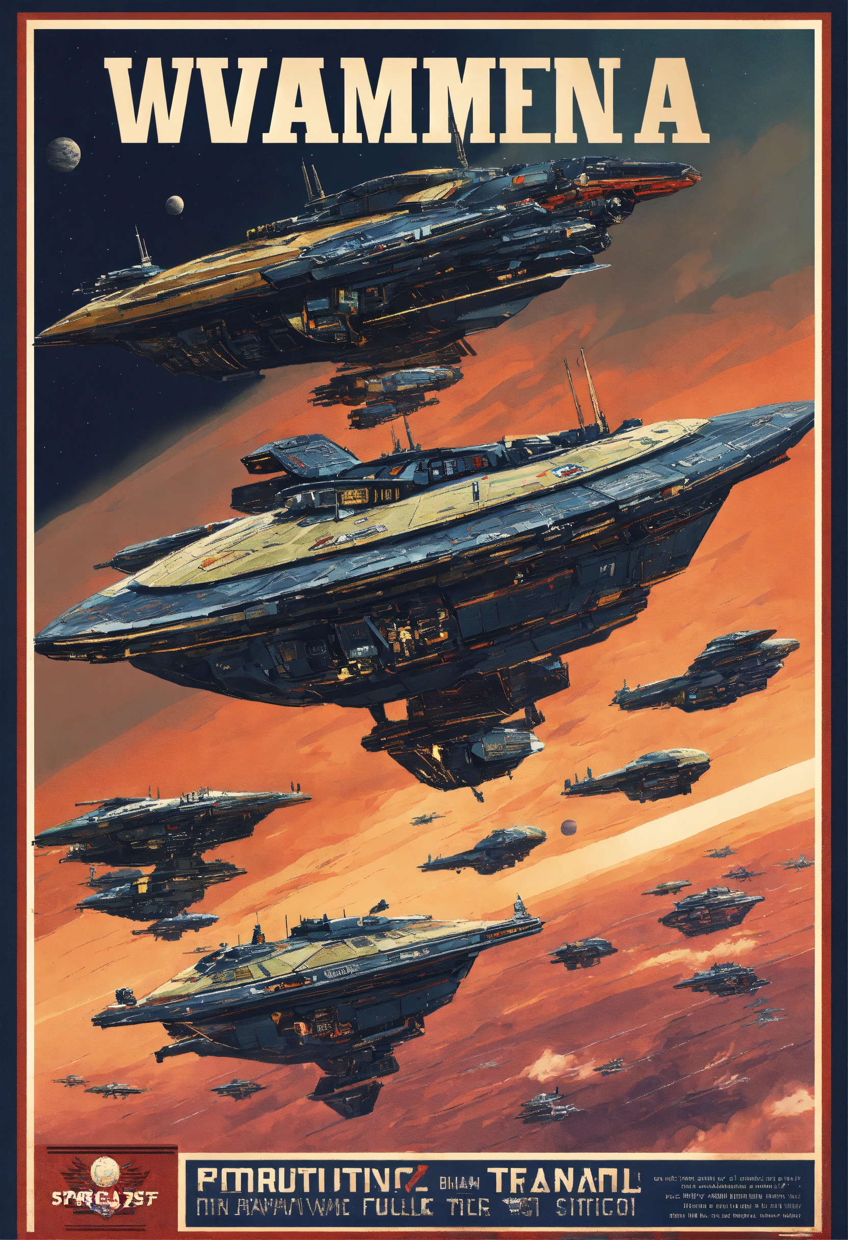 Futuristic military propaganda poster of futuristic spacewarships inspired by warhammer 40k they all look the same flying in space with text propaganda art
